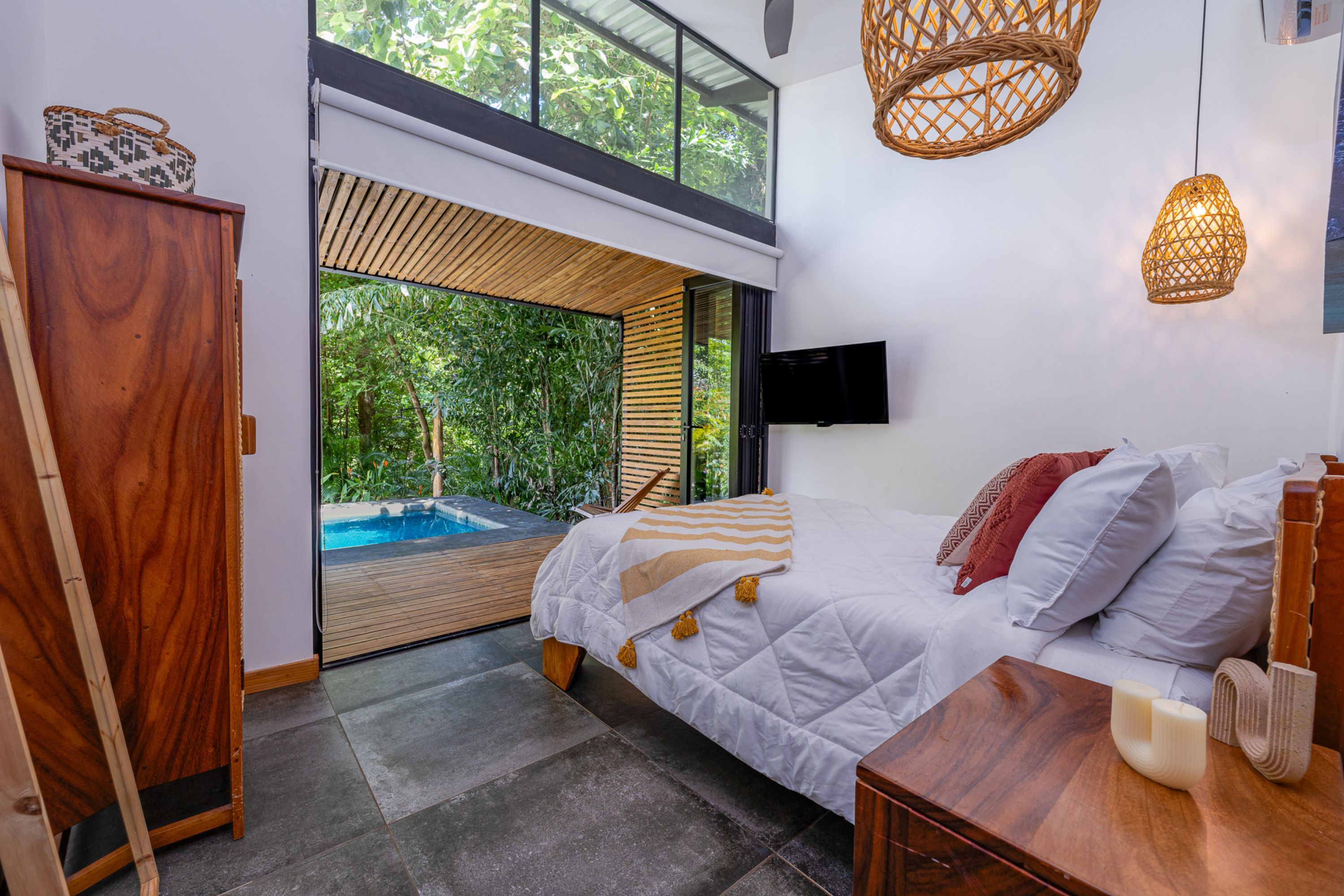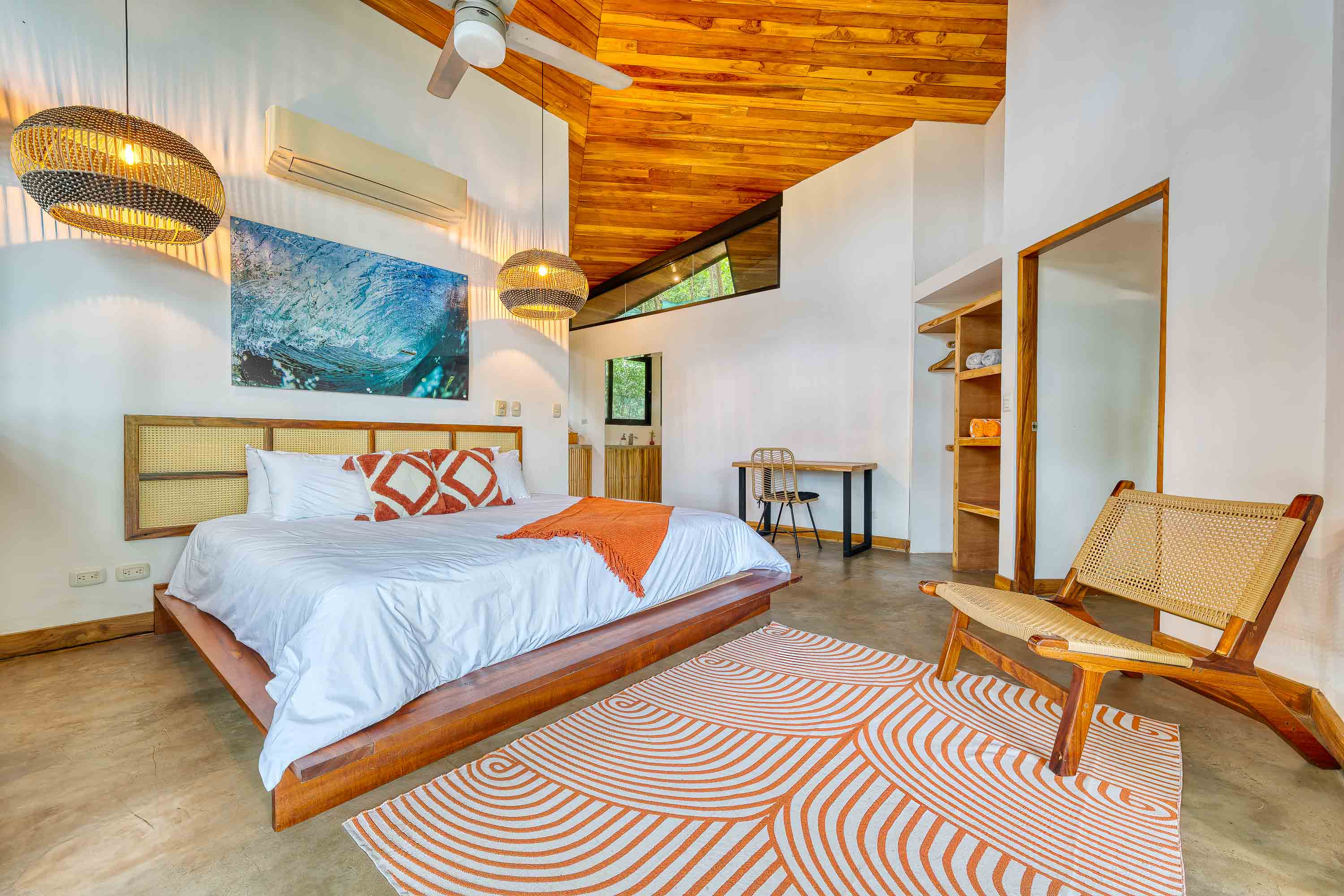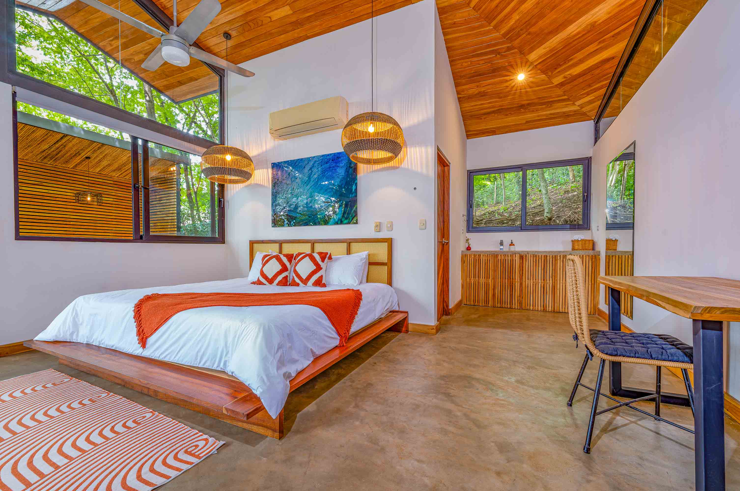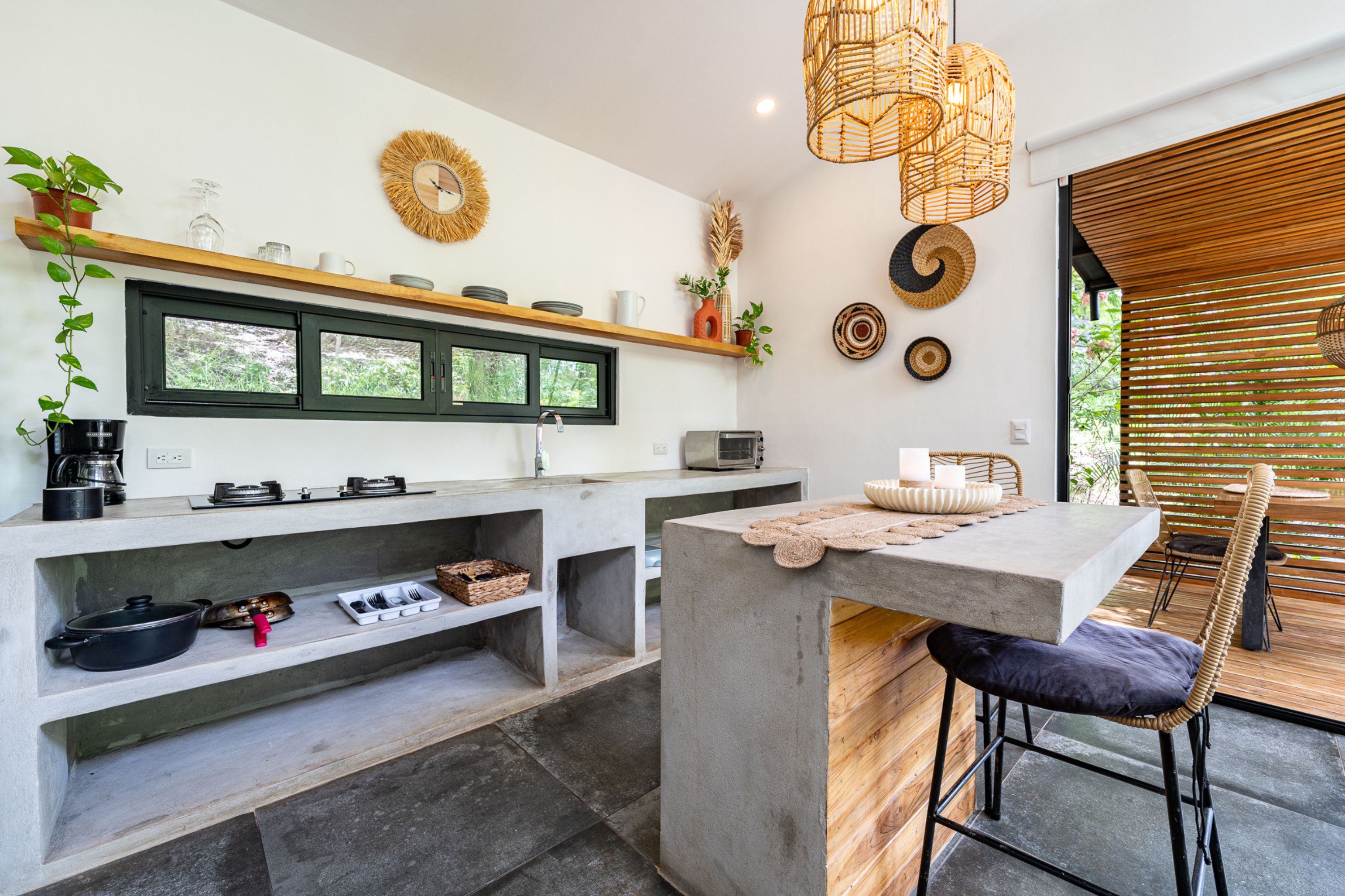 The main residence, a stunning 2-bedroom Balinese-inspired home, was originally built in 2018 and beautifully renovated in 2024. Each bedroom includes an en-suite bathroom with indoor/outdoor showers, immersing you in the tropical experience. The open-concept kitchen and living area flow seamlessly onto a spacious wooden deck that overlooks lush greenery — and during the dry season, offers peekaboo ocean views. A deep plunge pool with a seating area completes the space, perfect for relaxing after a day of sun and surf.