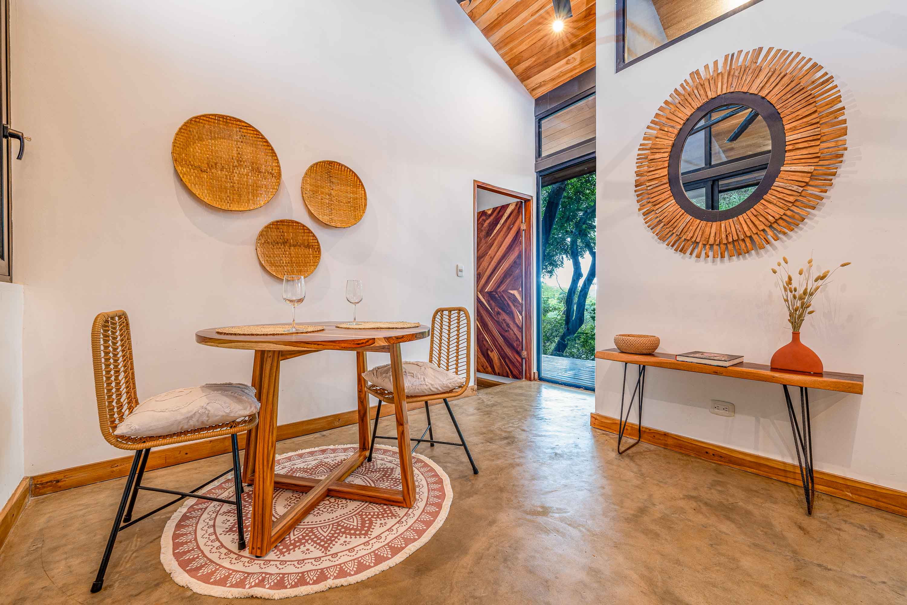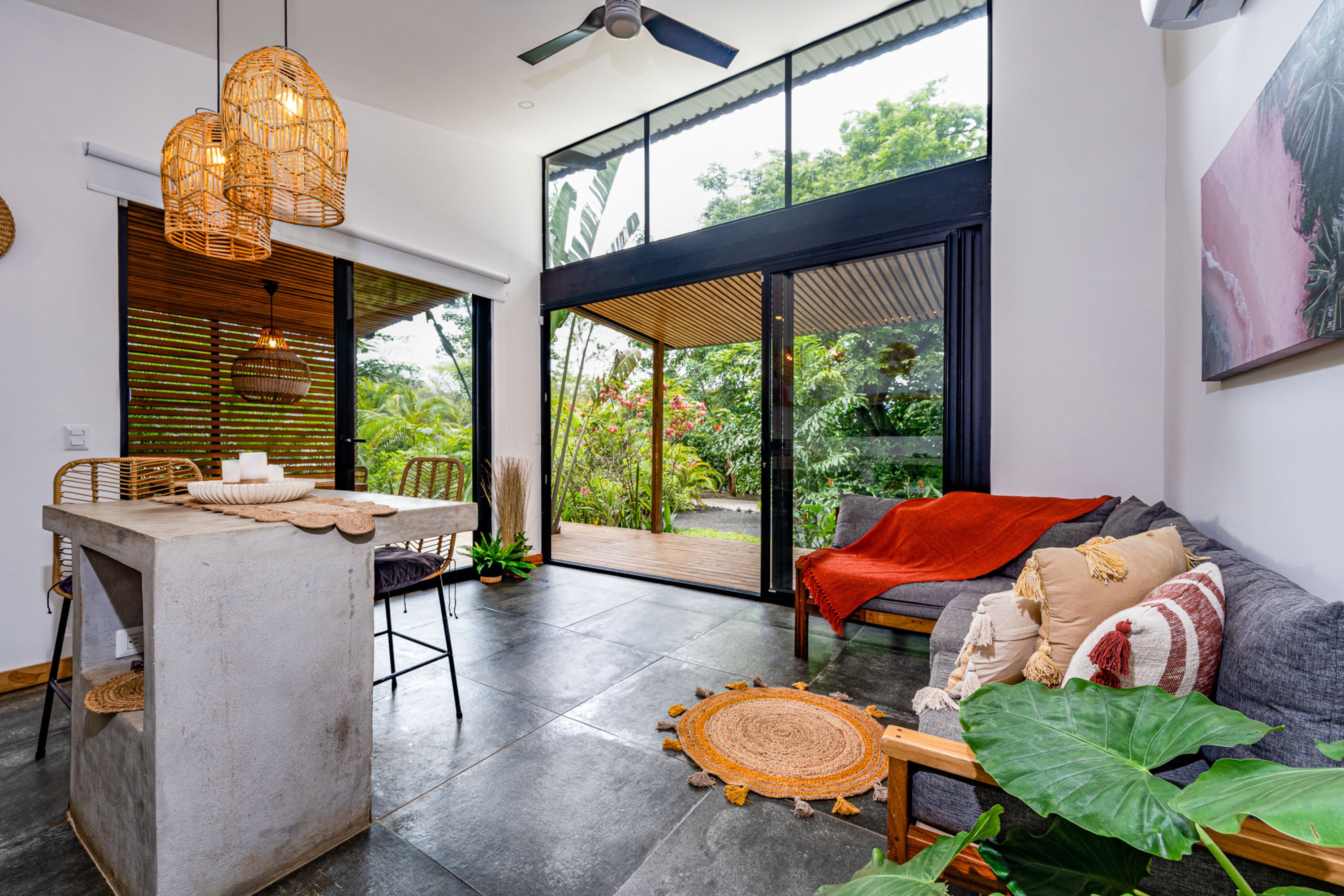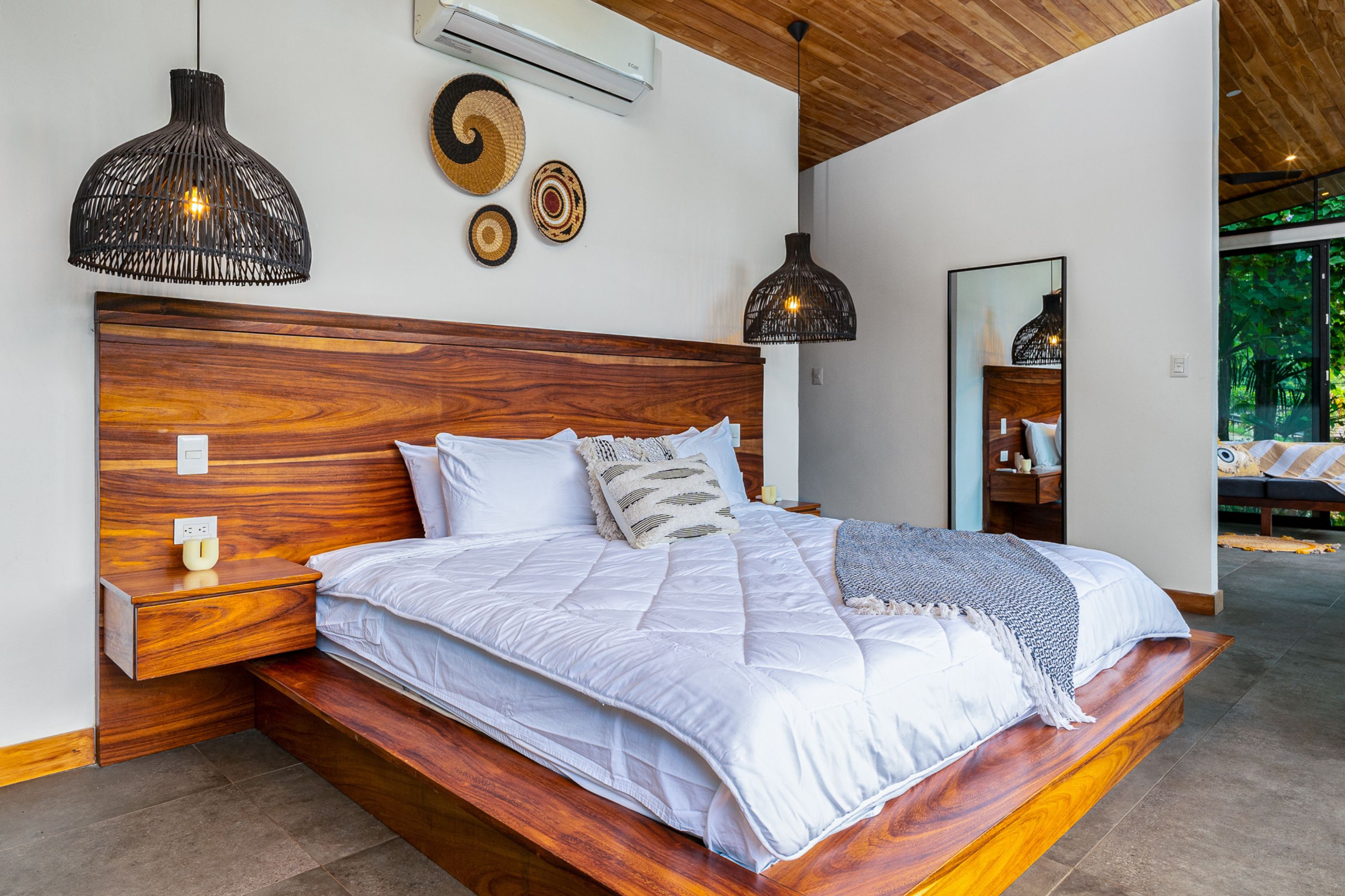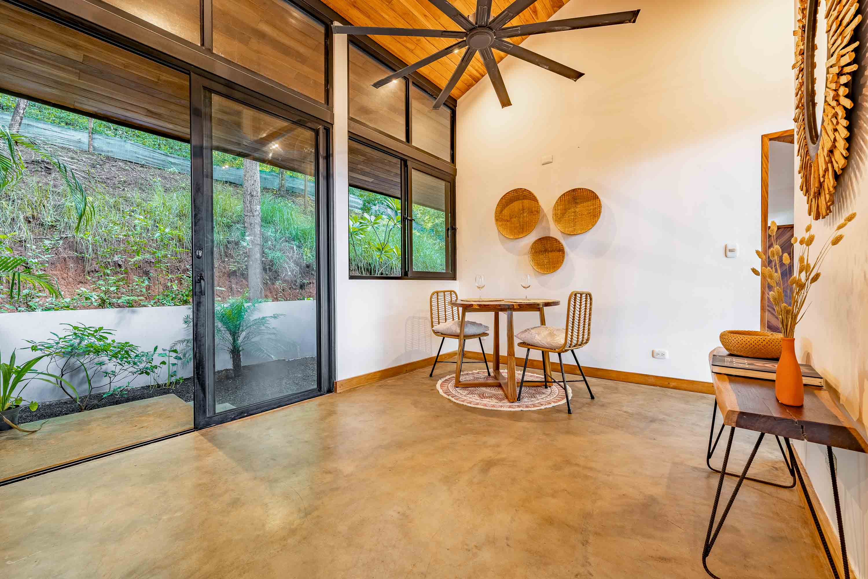 The main residence, a stunning 2-bedroom Balinese-inspired home, was originally built in 2018 and beautifully renovated in 2024. Each bedroom includes an en-suite bathroom with indoor/outdoor showers, immersing you in the tropical experience. The open-concept kitchen and living area flow seamlessly onto a spacious wooden deck that overlooks lush greenery — and during the dry season, offers peekaboo ocean views. A deep plunge pool with a seating area completes the space, perfect for relaxing after a day of sun and surf.