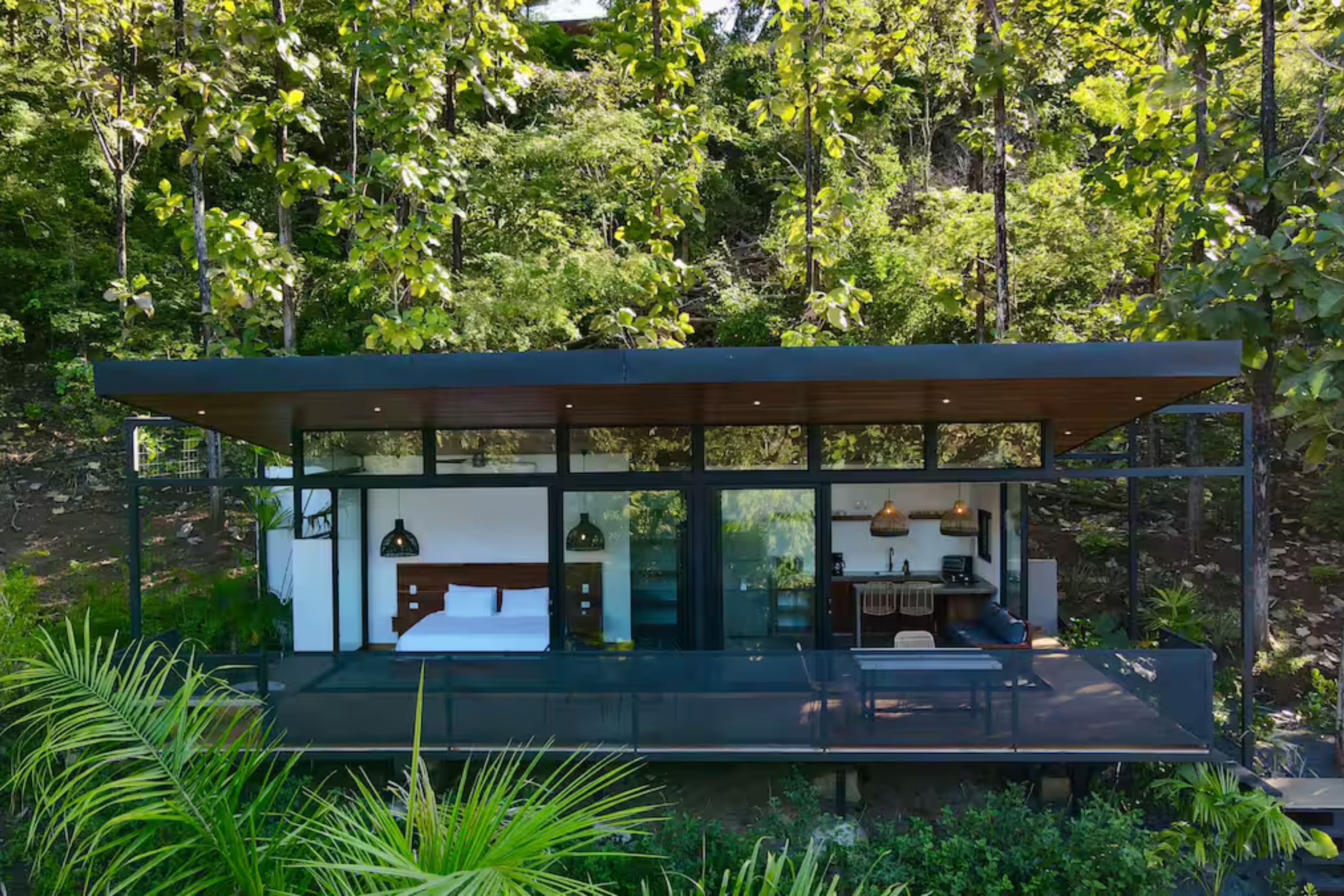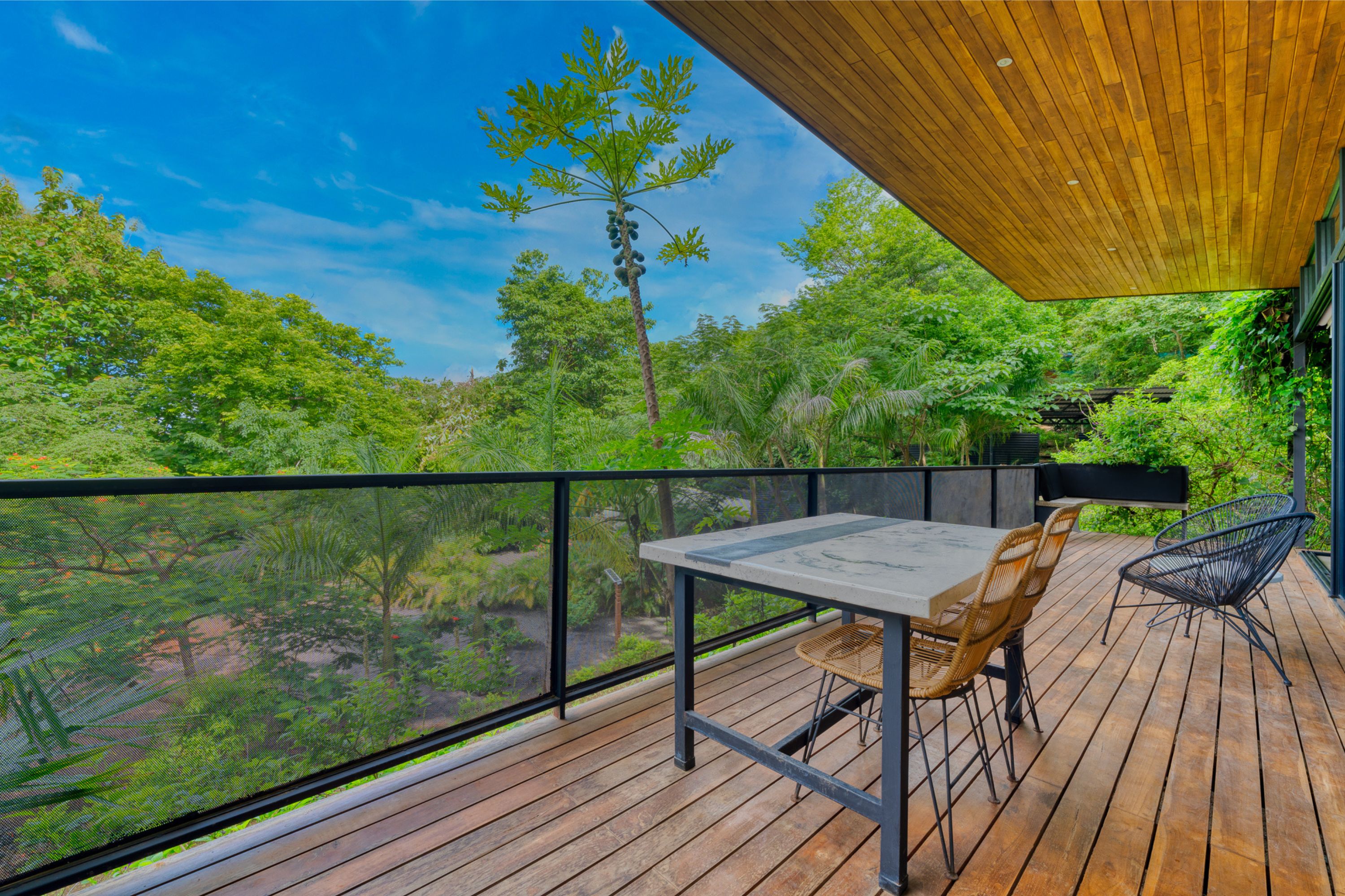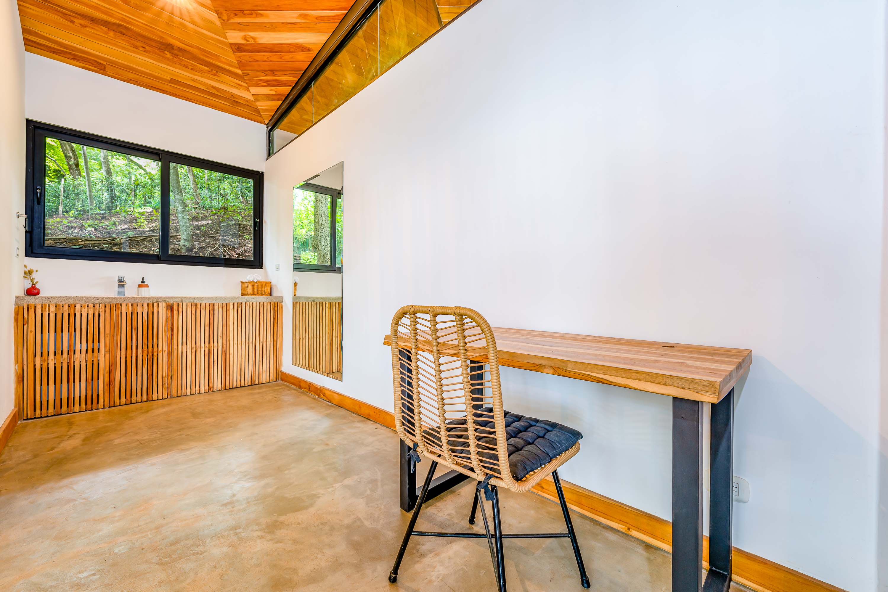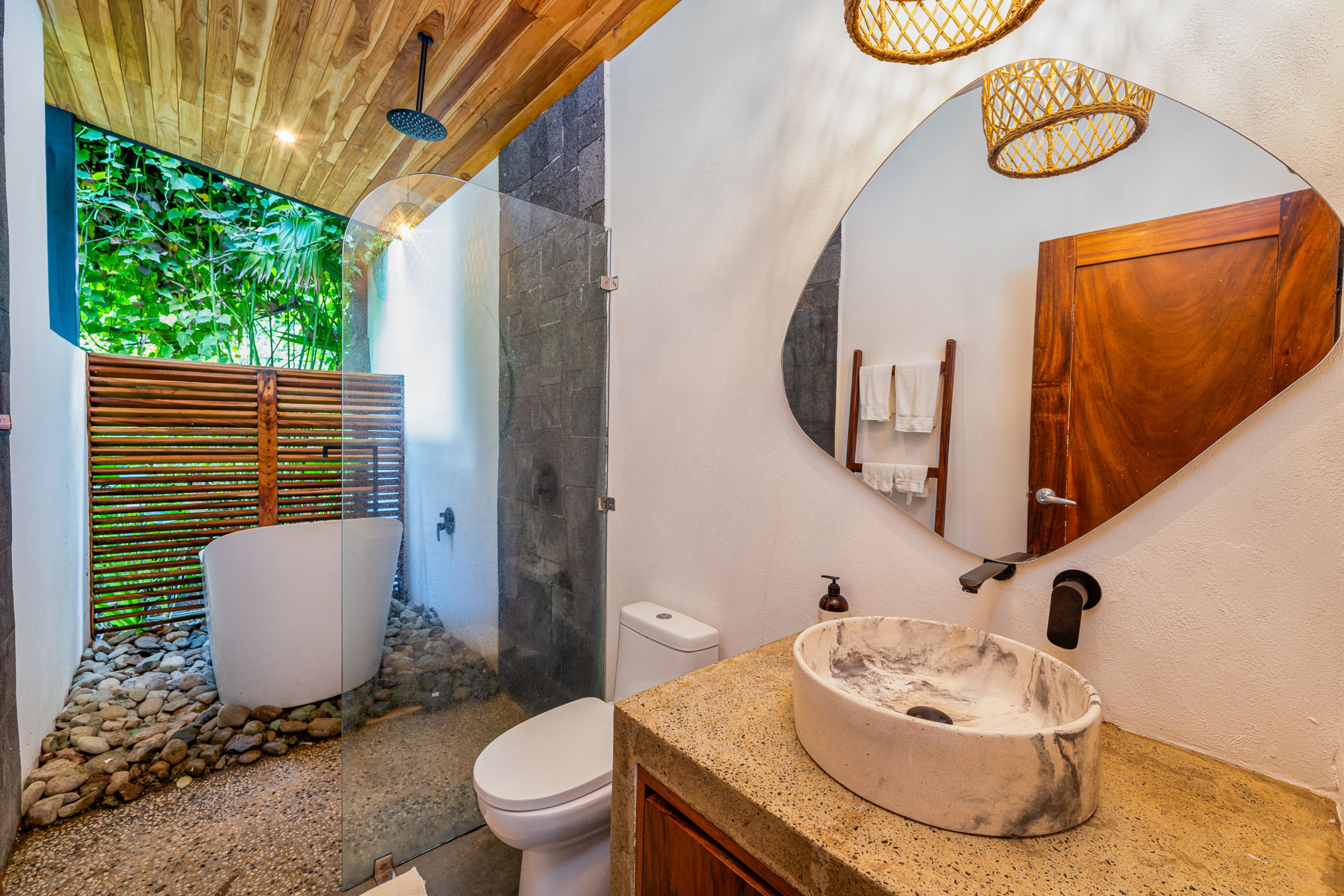 The third unit, a cozy 1-bedroom home, is tucked away among the trees and features a wide balcony with views of the surrounding jungle. The bathroom includes a serene outdoor bathtub with natural fencing for added seclusion.