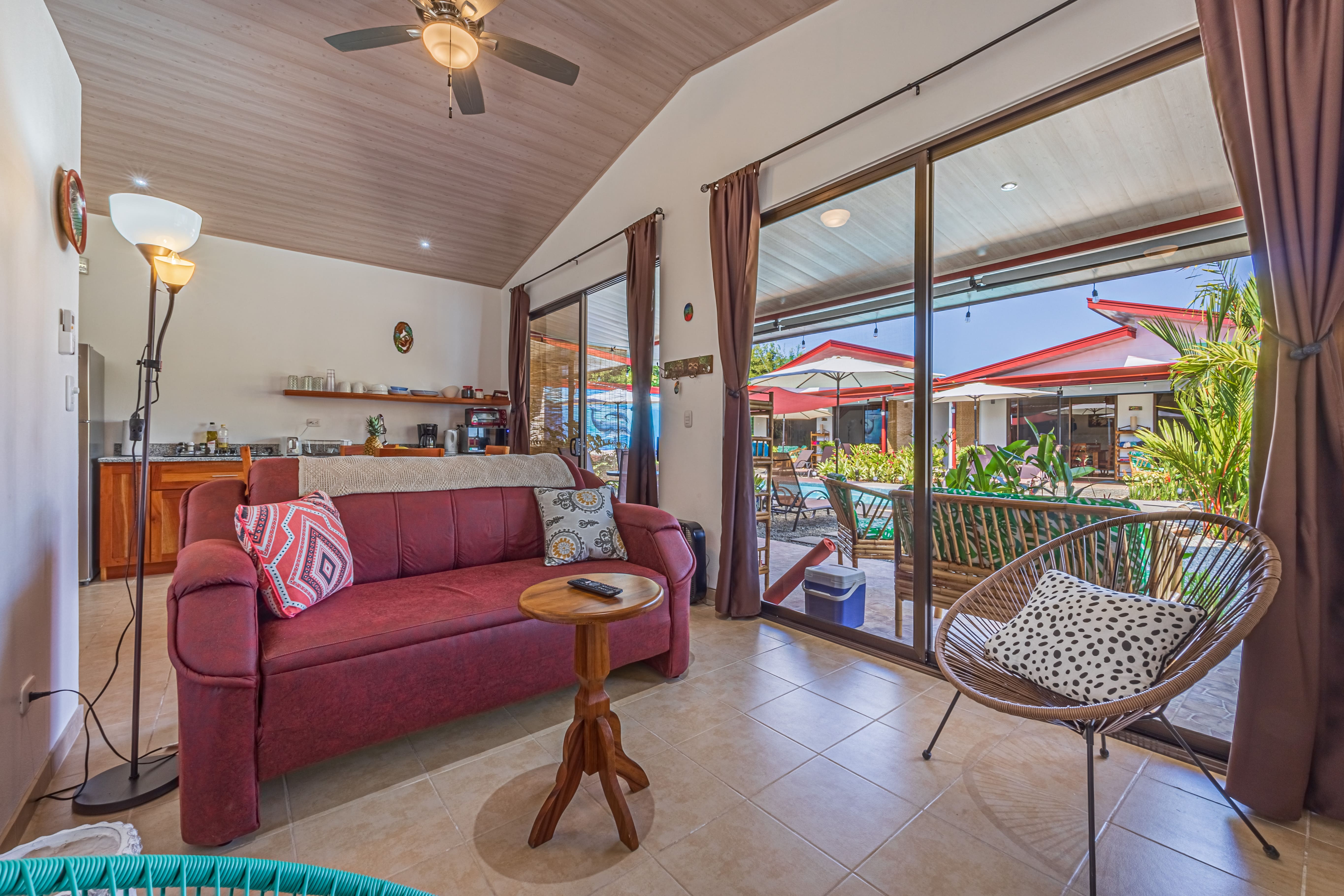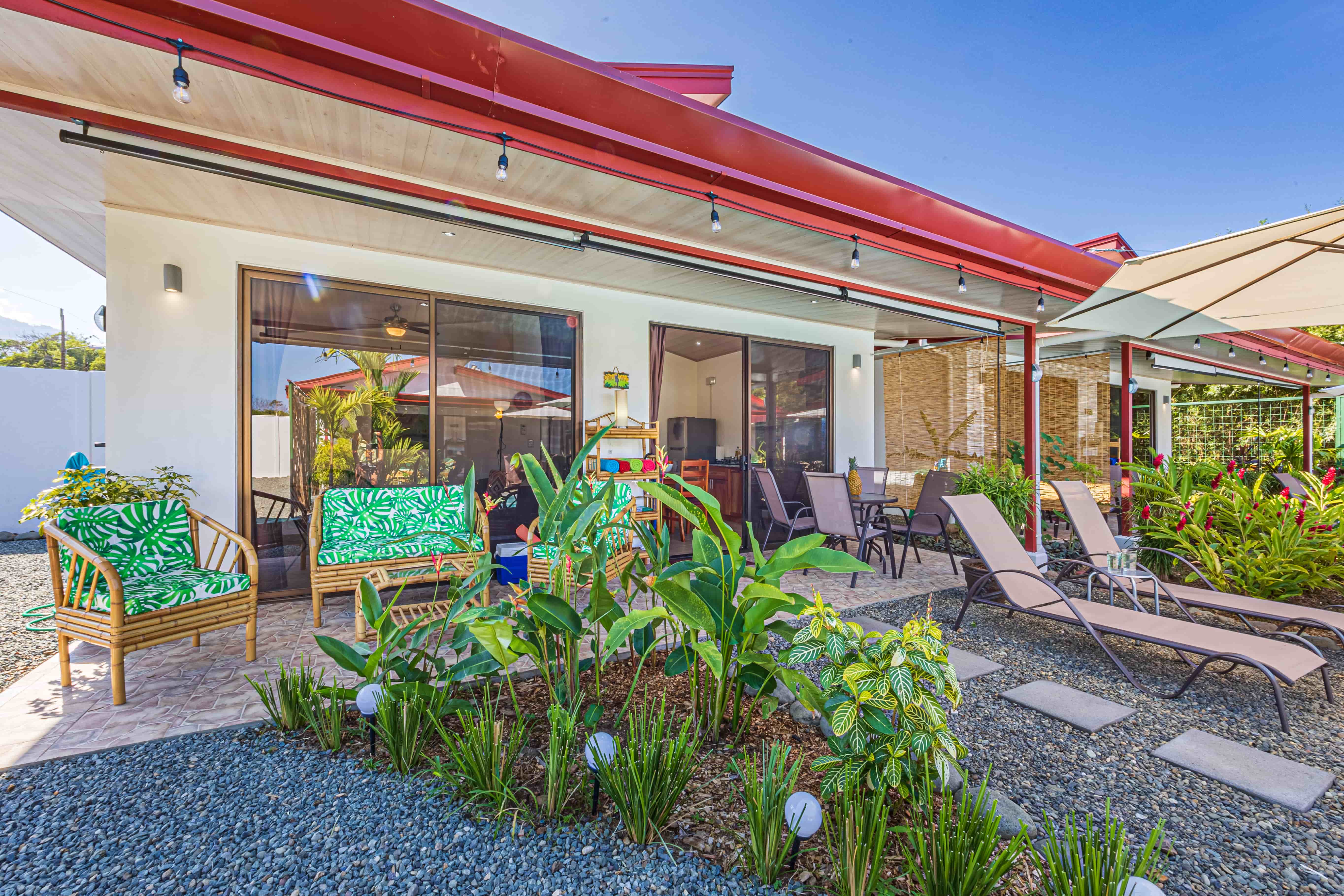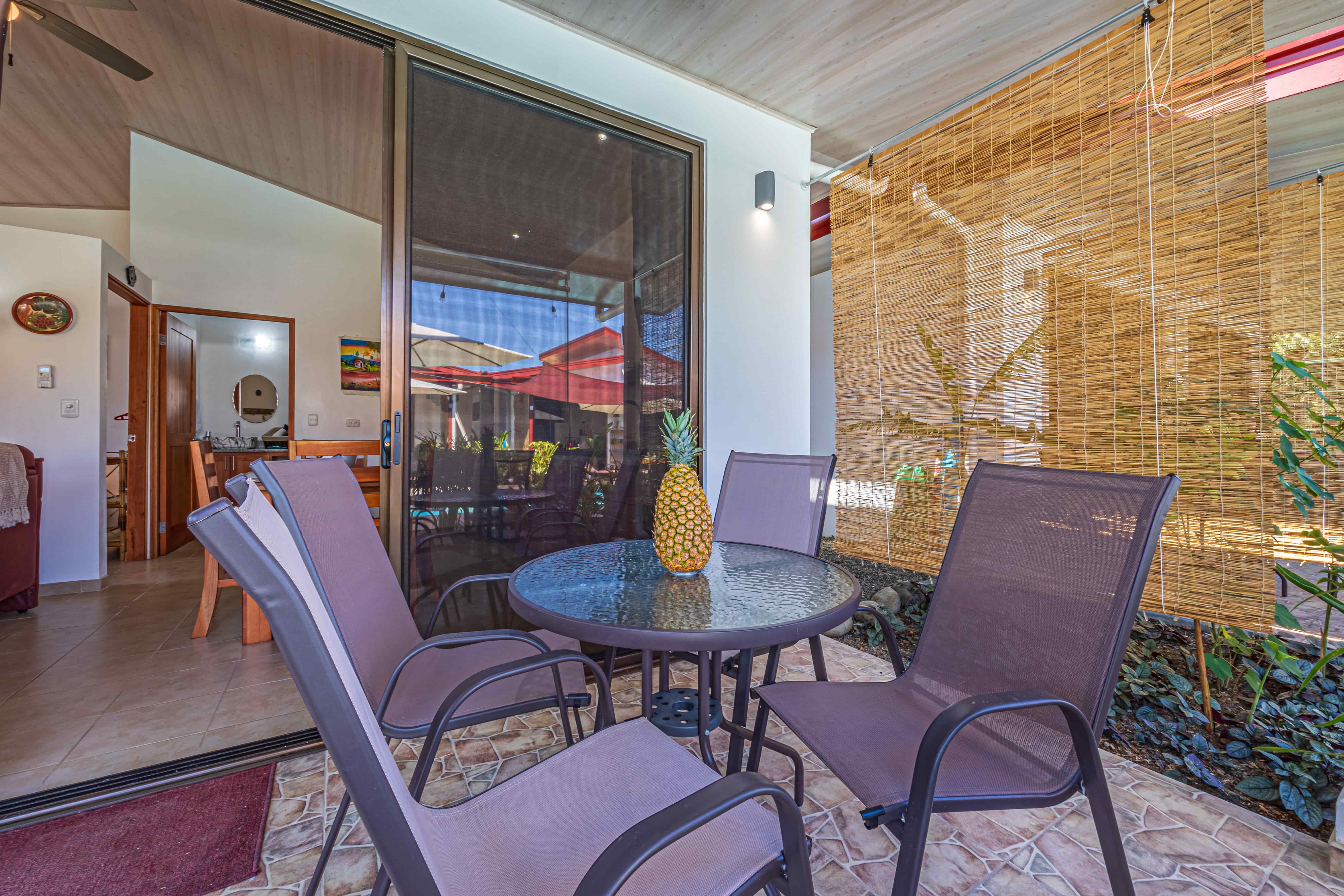 The property comprises four meticulously designed, fully equipped, and furnished villas, each spanning 56 m². Each villa boasts a comfortable bedroom with a queen-size bed, a modern bathroom, and an open-concept kitchen that seamlessly flows into a dining and sitting area featuring a 50-inch TV. Large sliding glass doors lead to a private terrace with bamboo furniture, creating the perfect spot for outdoor dining with seating for four. Encircled by lush tropical gardens, the villas provide exceptional privacy for guests.