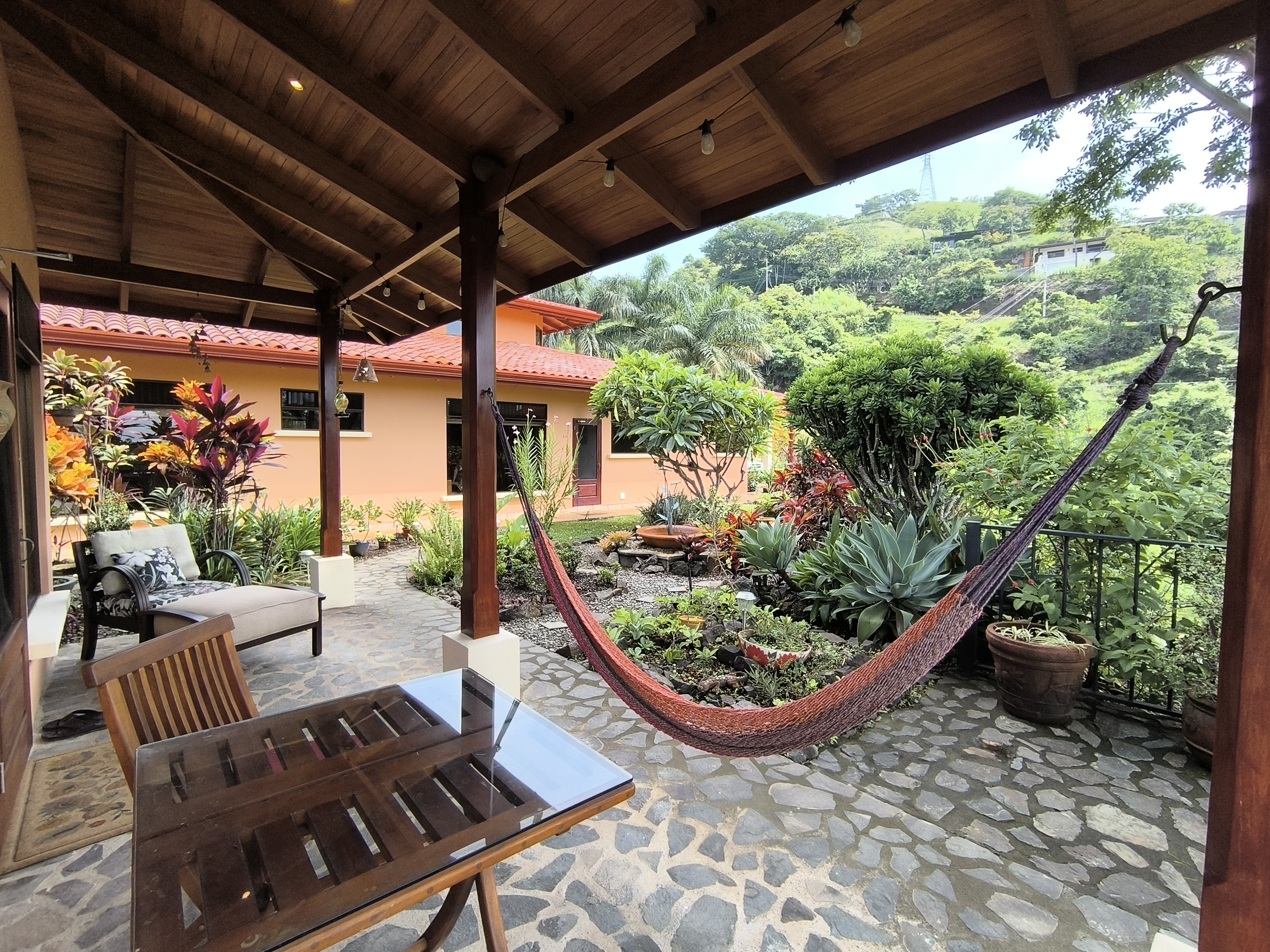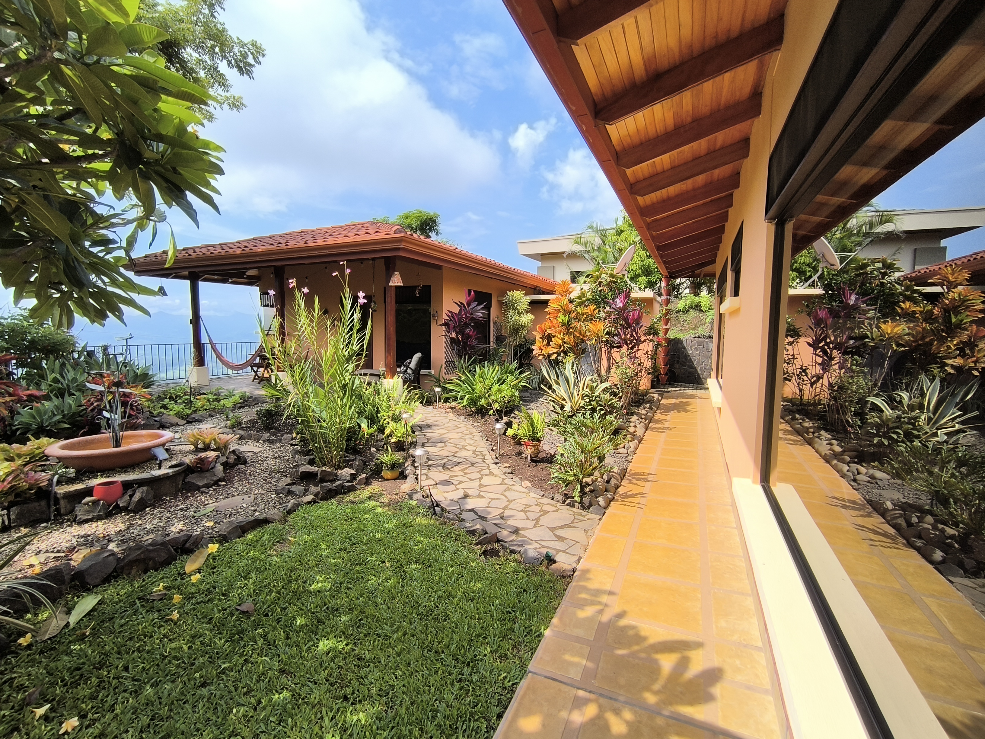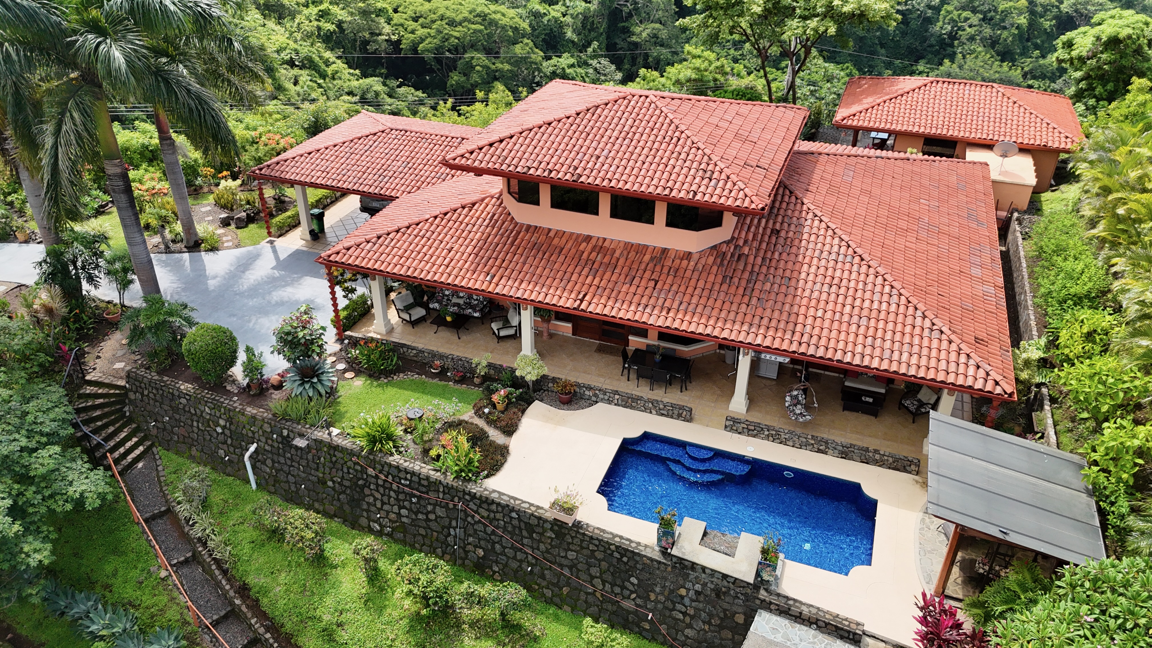 Impeccably maintained gardens adorned with mature plantings envelop the property, while a meandering walking path leads down to the lower area of the 2.25-acre lot, adorned with fruit trees such as avocado, lime, water apple, grapefruit, and jocote.