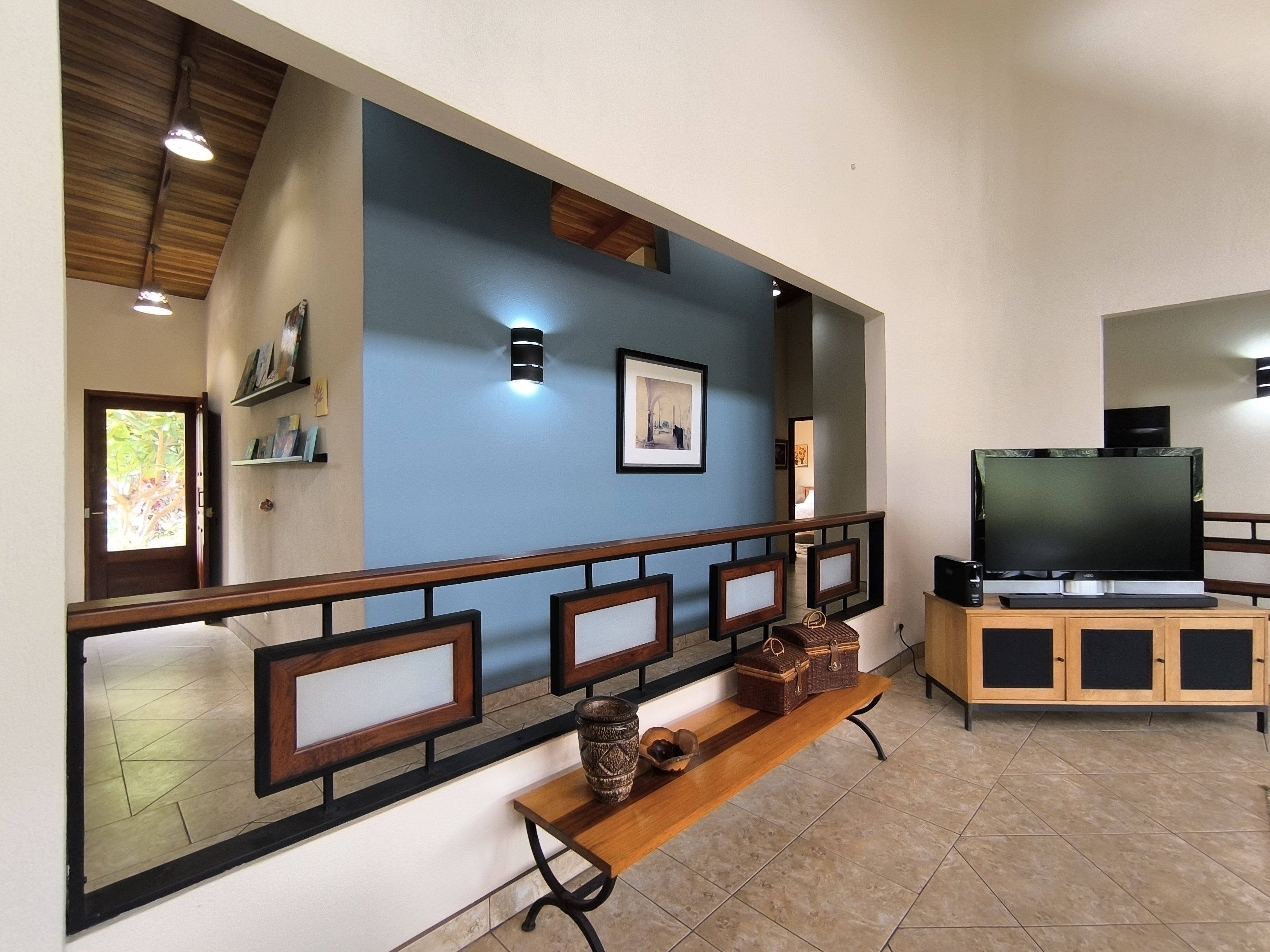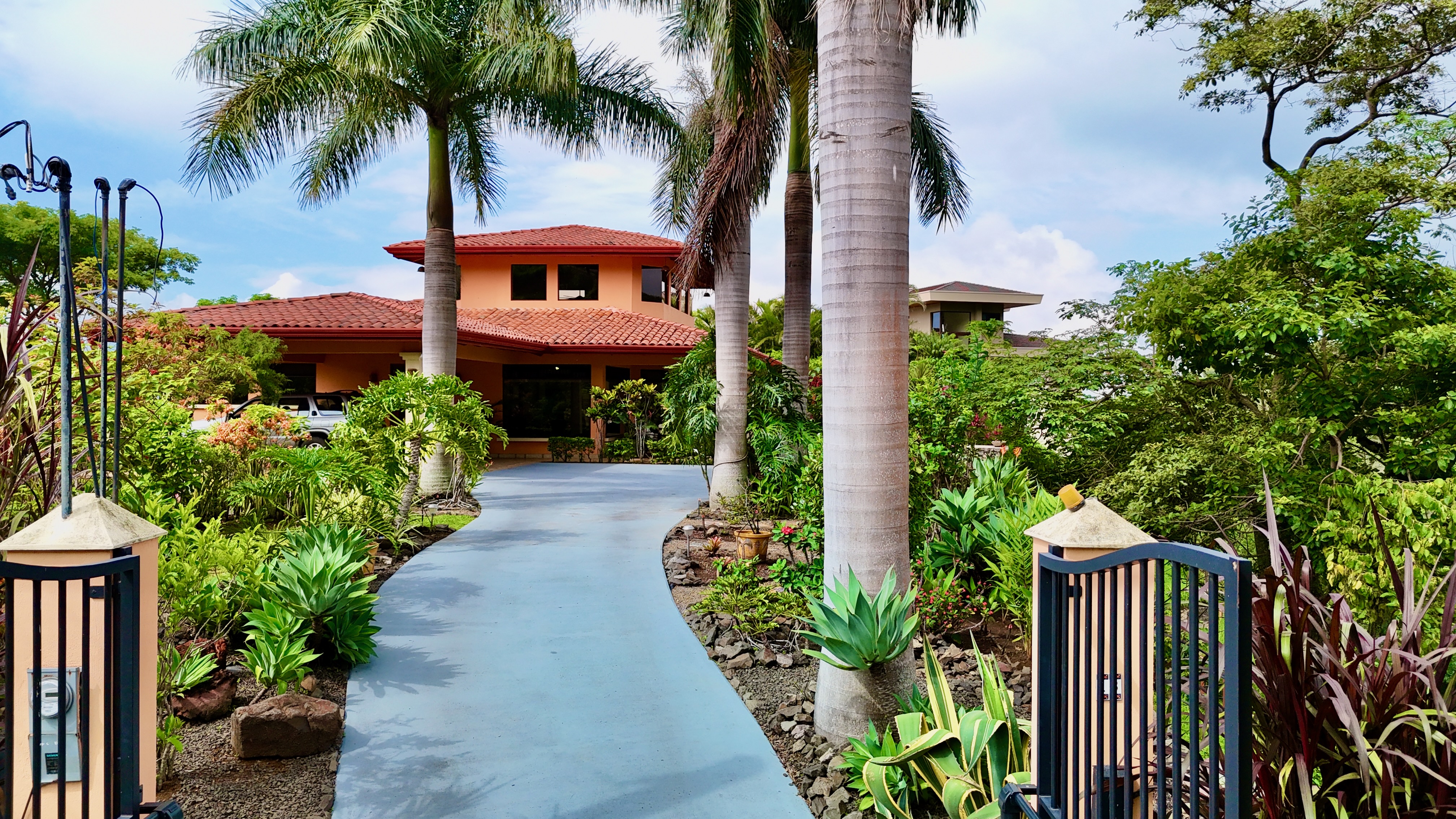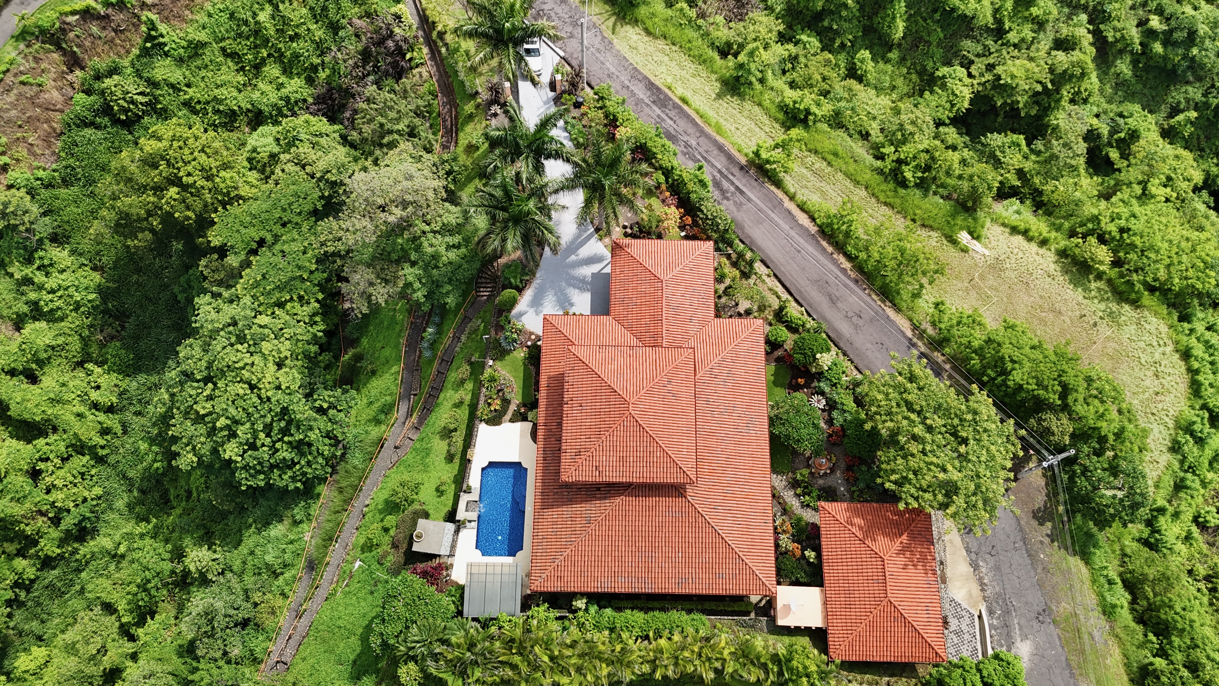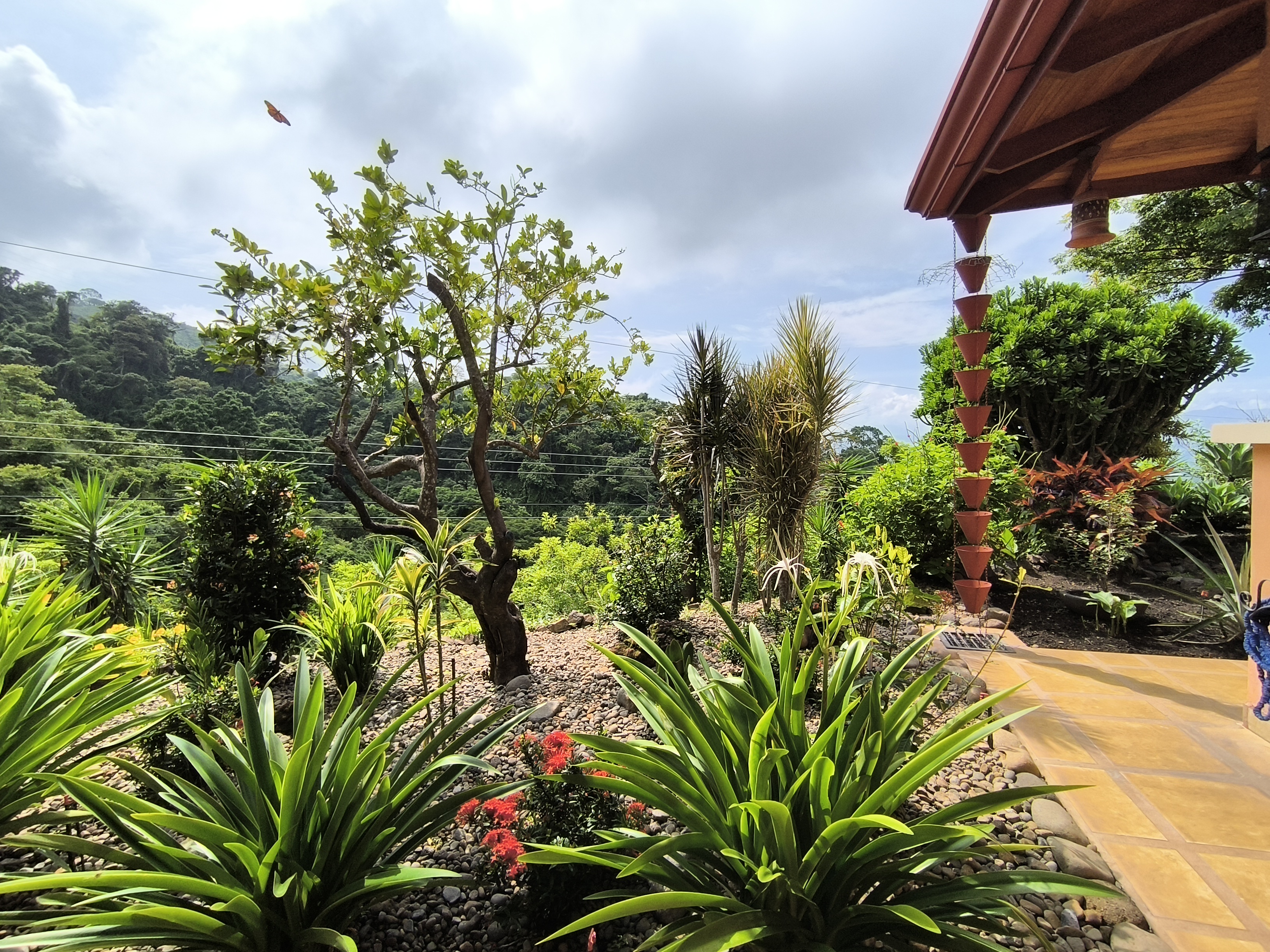 Impeccably maintained gardens adorned with mature plantings envelop the property, while a meandering walking path leads down to the lower area of the 2.25-acre lot, adorned with fruit trees such as avocado, lime, water apple, grapefruit, and jocote.