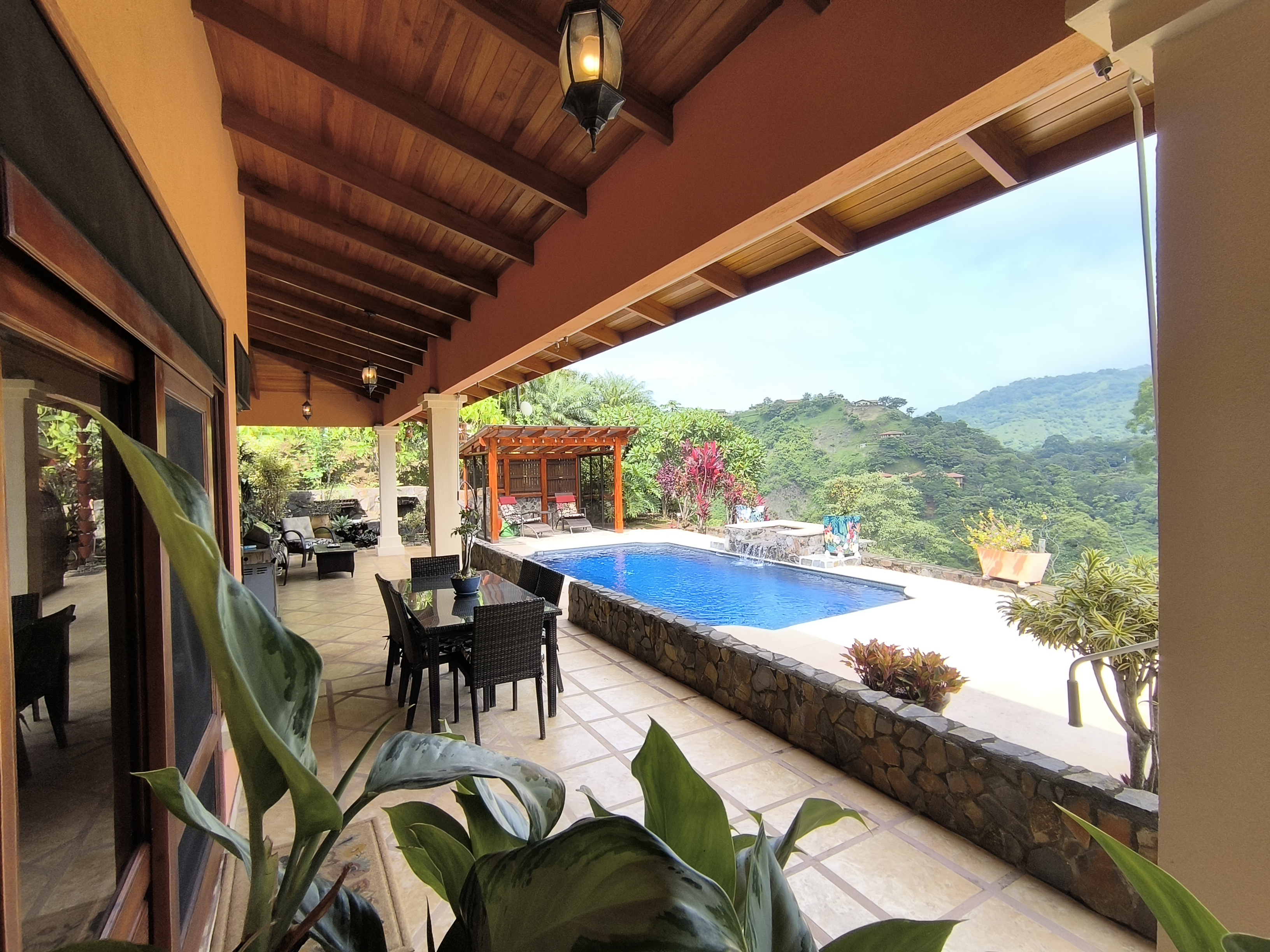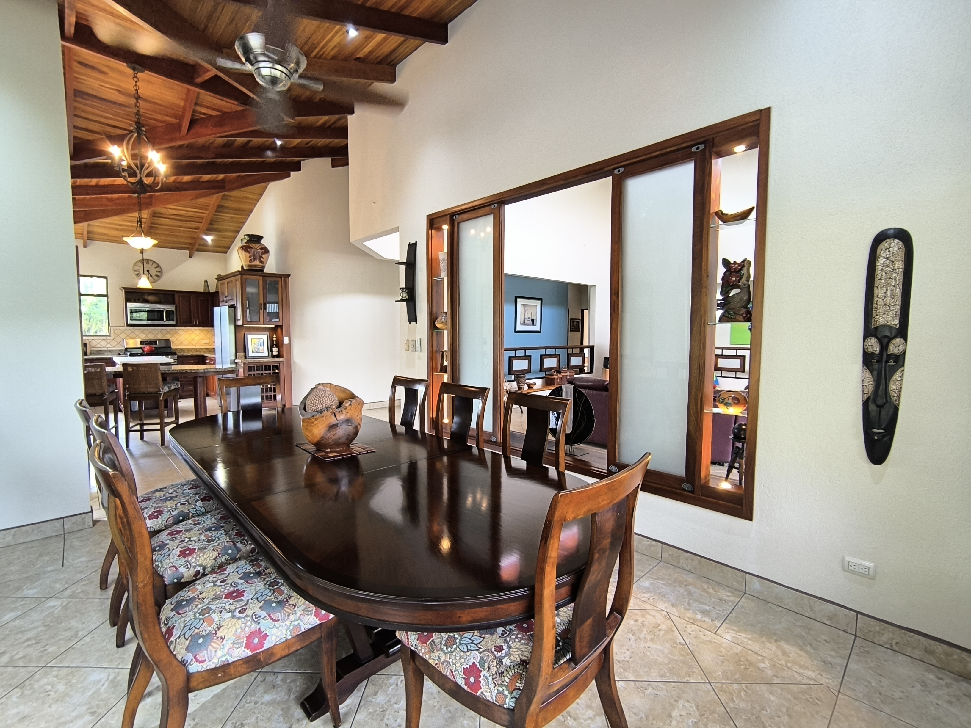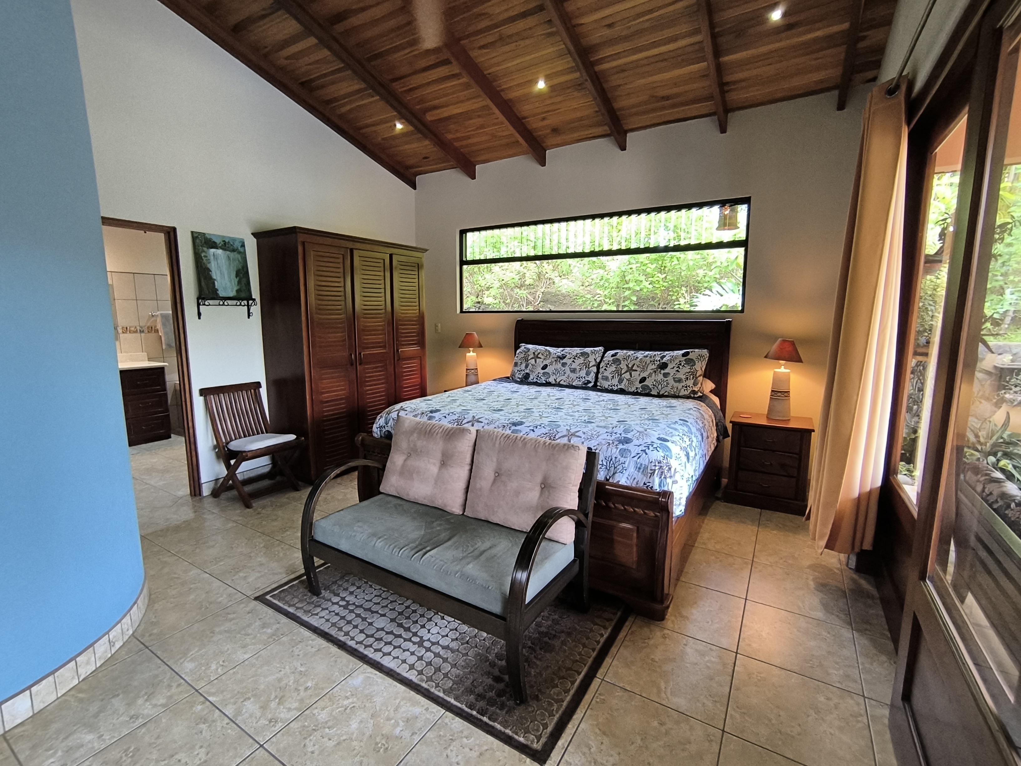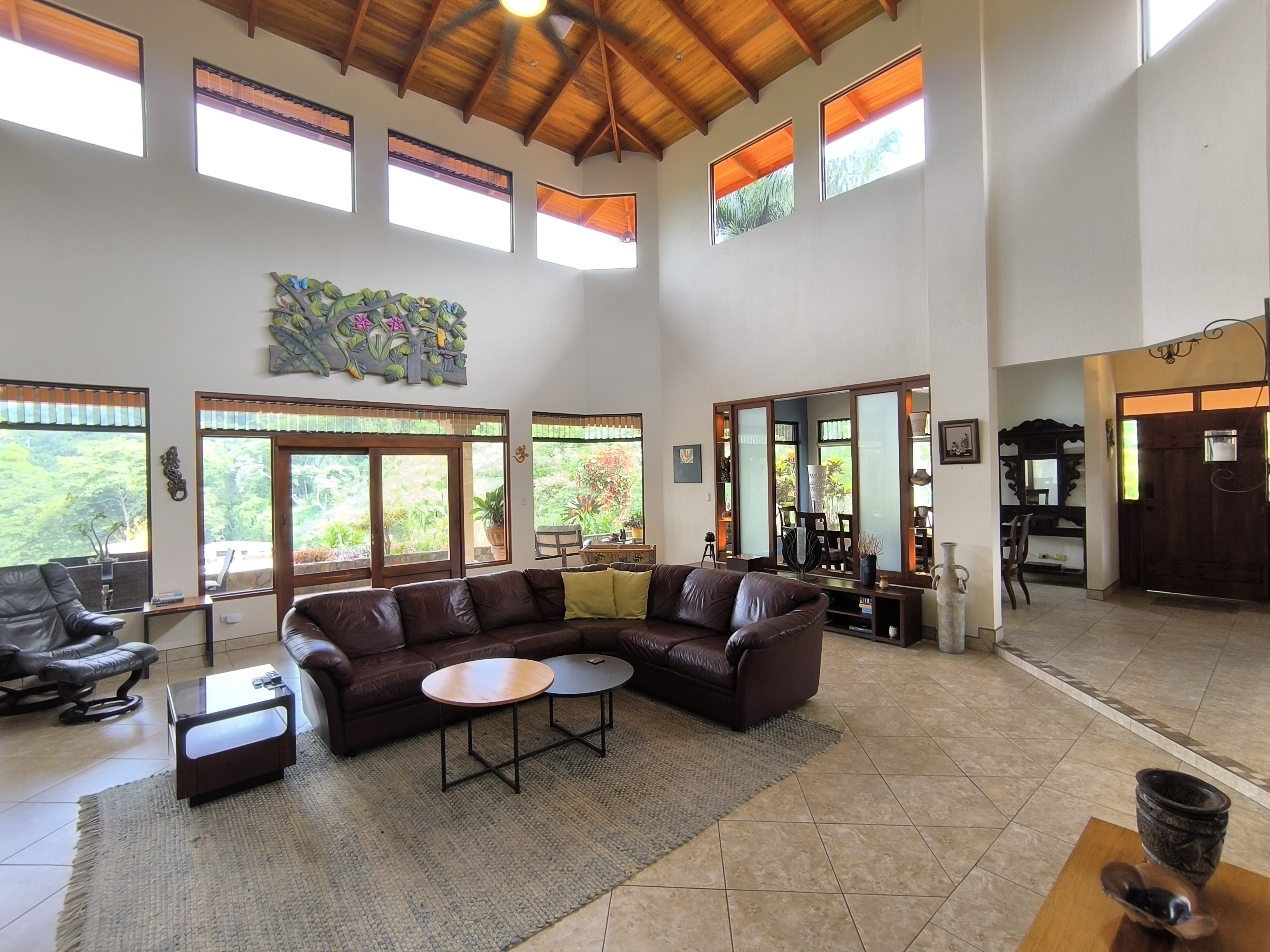 Comprising 3 bedrooms and 2.5 bathrooms, the primary residence embodies a harmonious fusion of classic design elements and distinctive Costa Rican architectural touches, including soaring vaulted wood ceilings, expansive wall-to-wall windows, and sliding glass doors, seamlessly blending indoor and outdoor living spaces.
