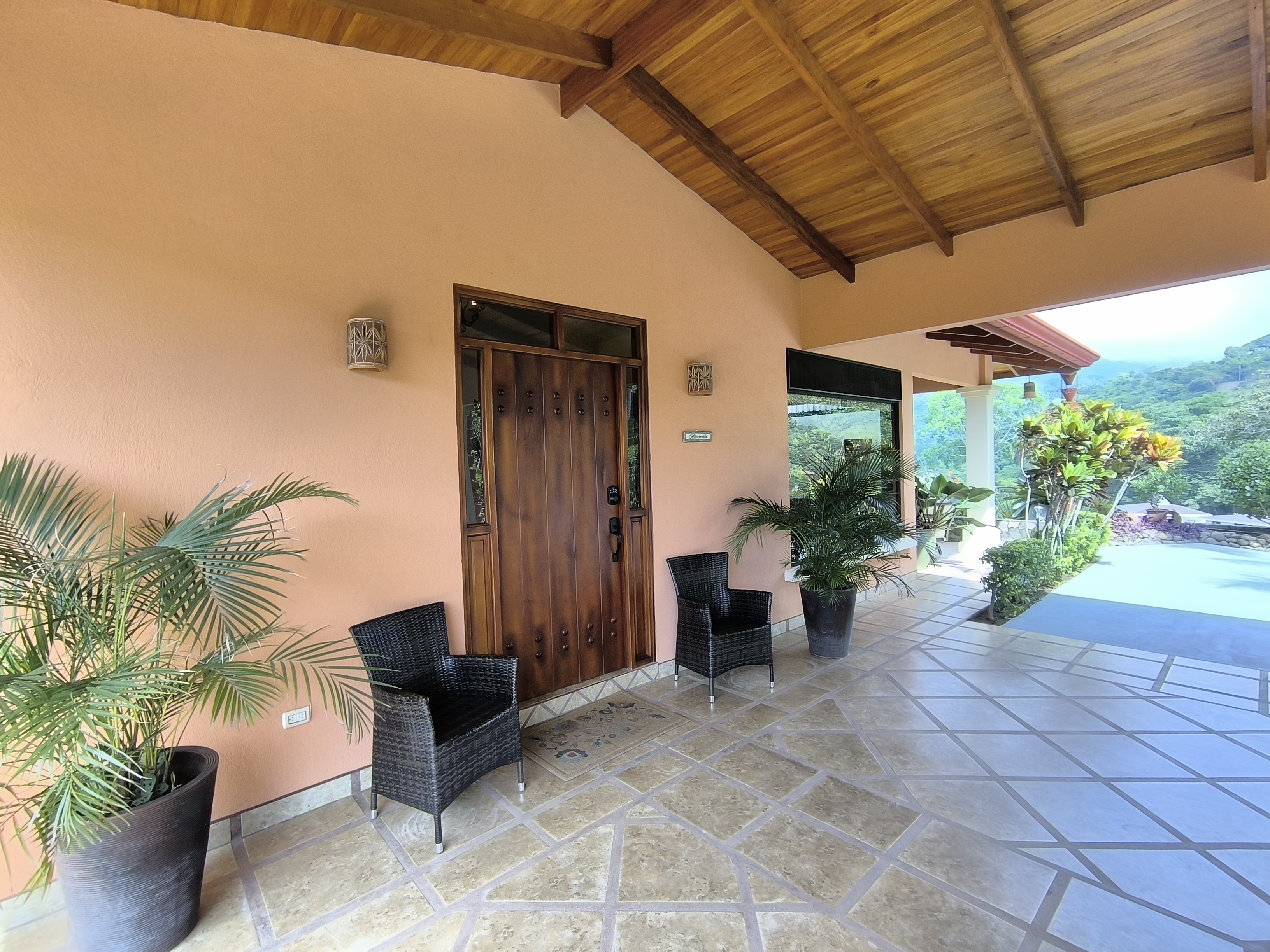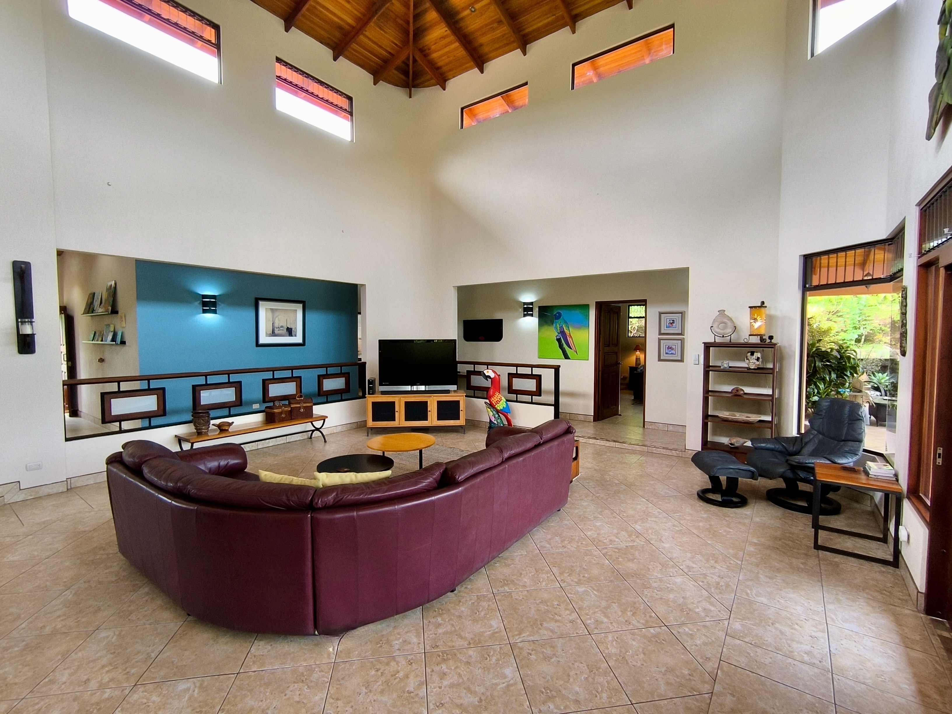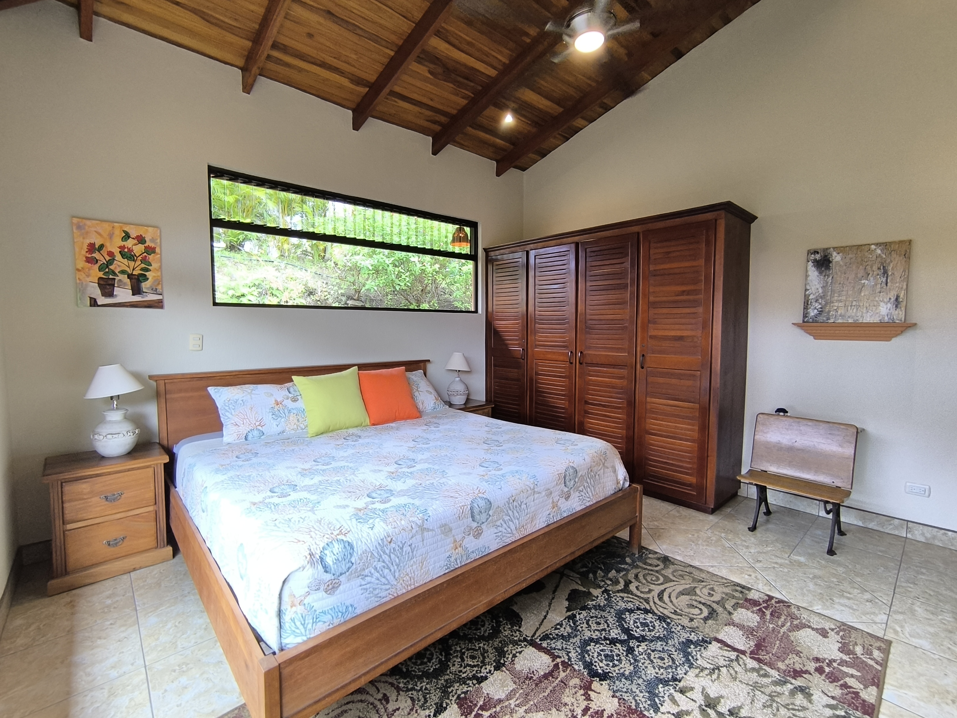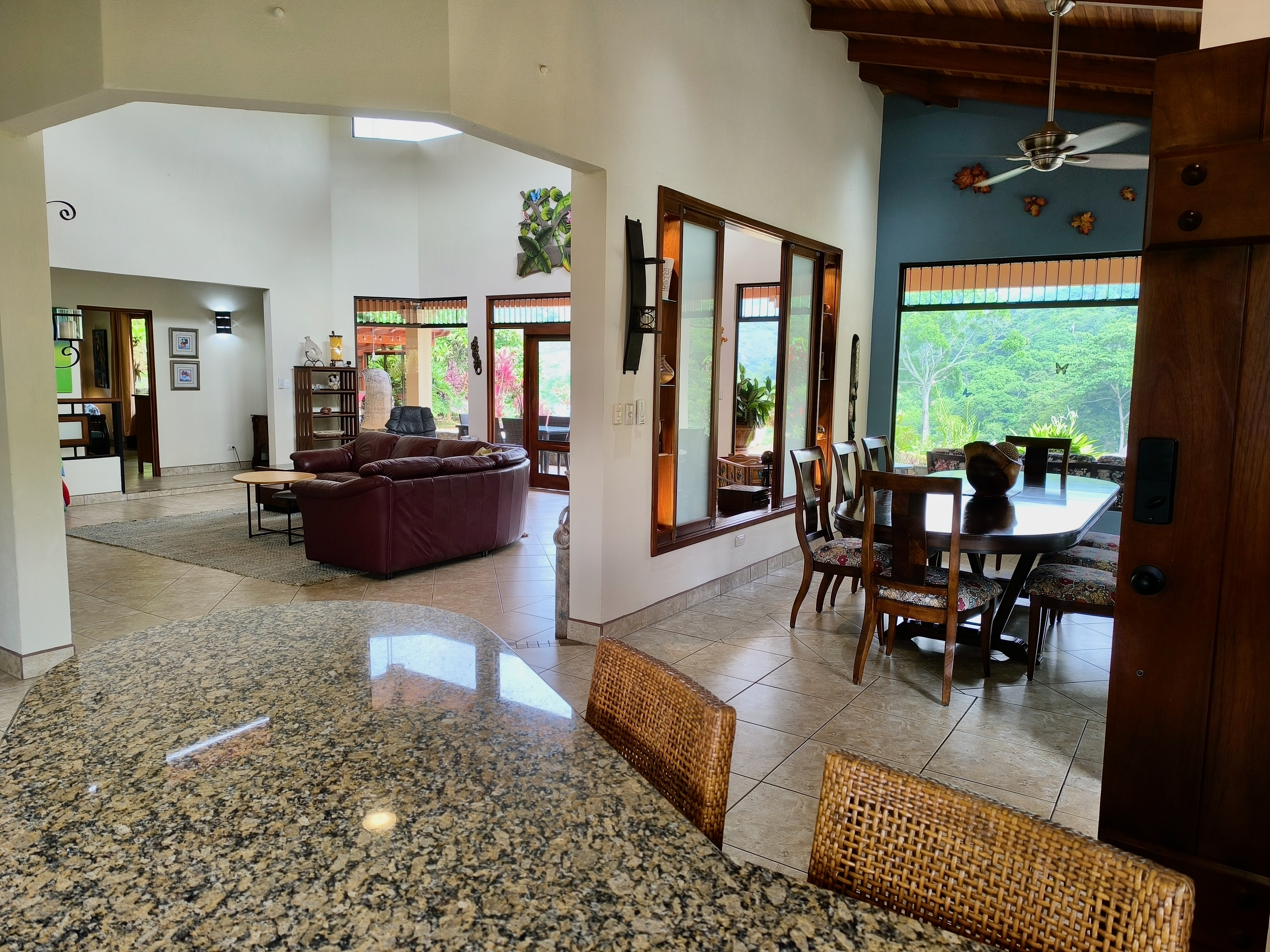 Comprising 3 bedrooms and 2.5 bathrooms, the primary residence embodies a harmonious fusion of classic design elements and distinctive Costa Rican architectural touches, including soaring vaulted wood ceilings, expansive wall-to-wall windows, and sliding glass doors, seamlessly blending indoor and outdoor living spaces.