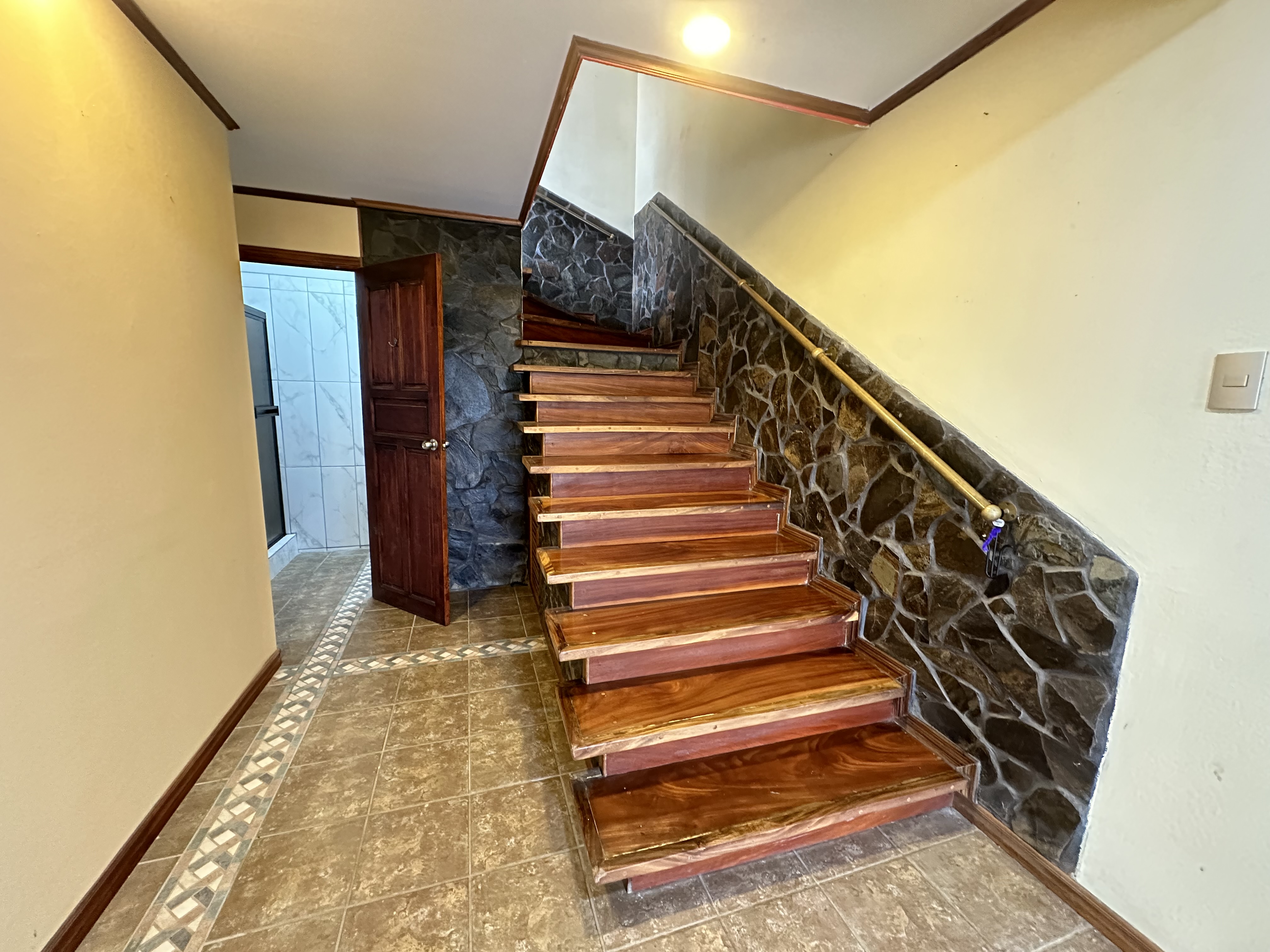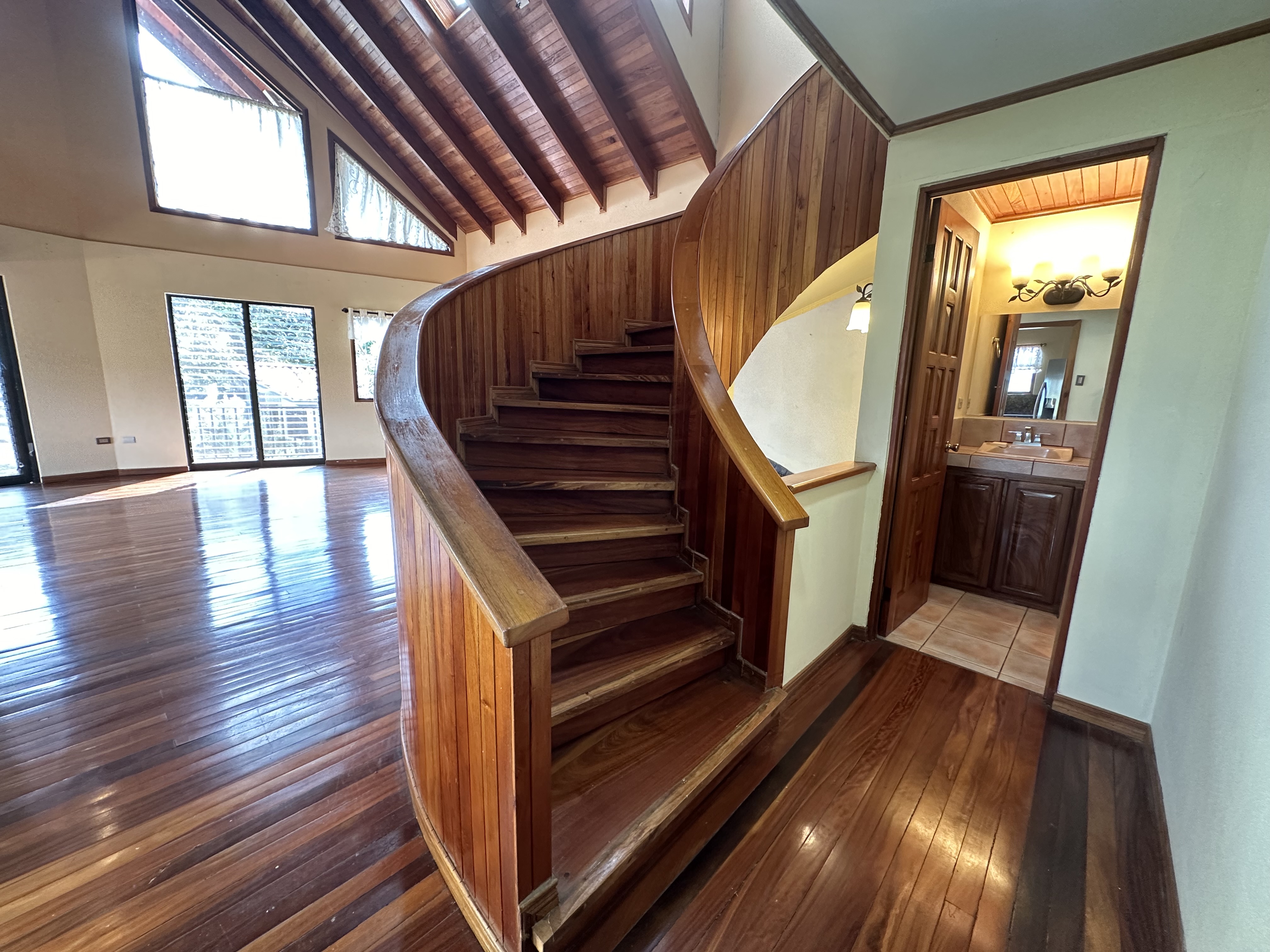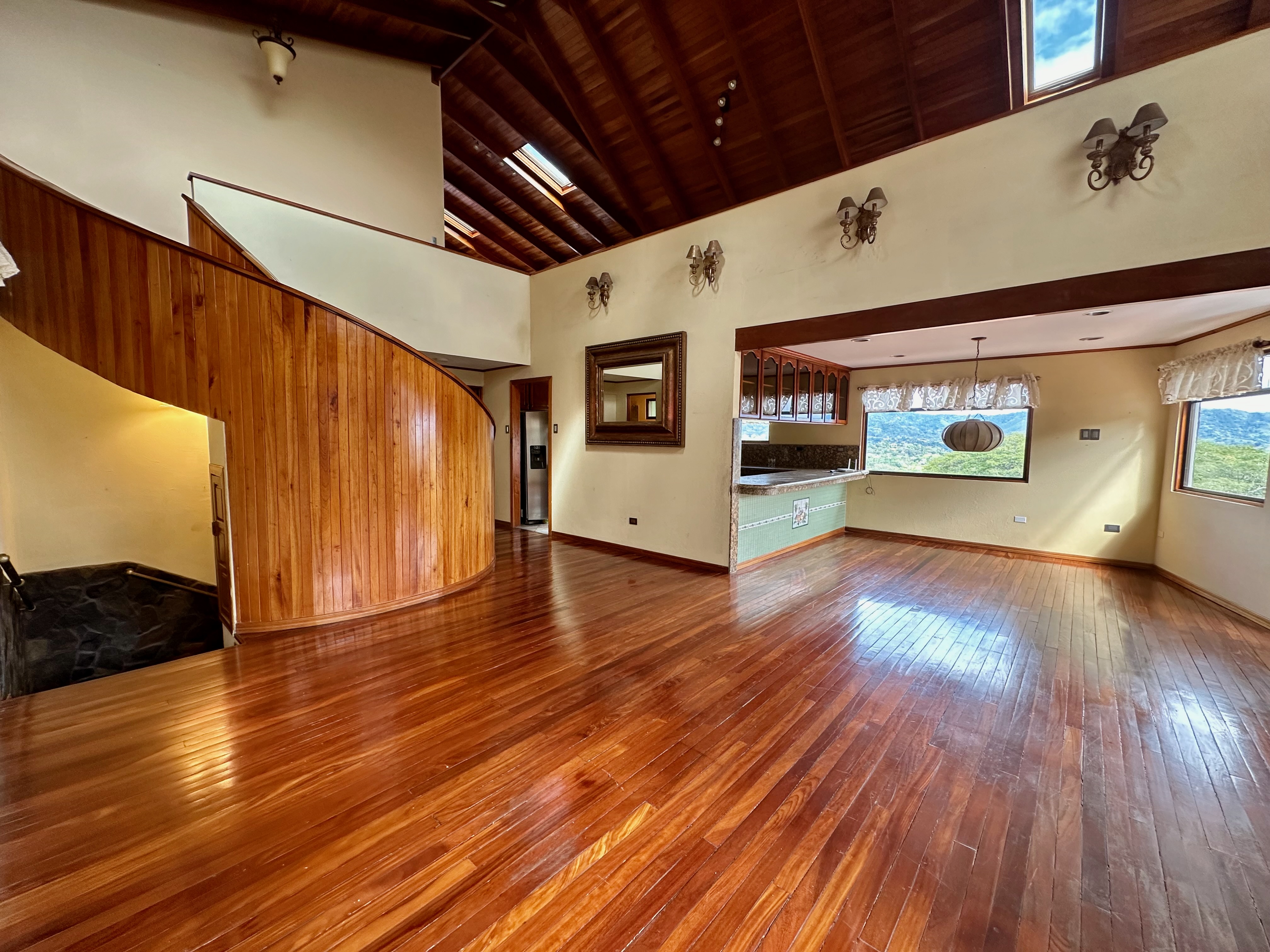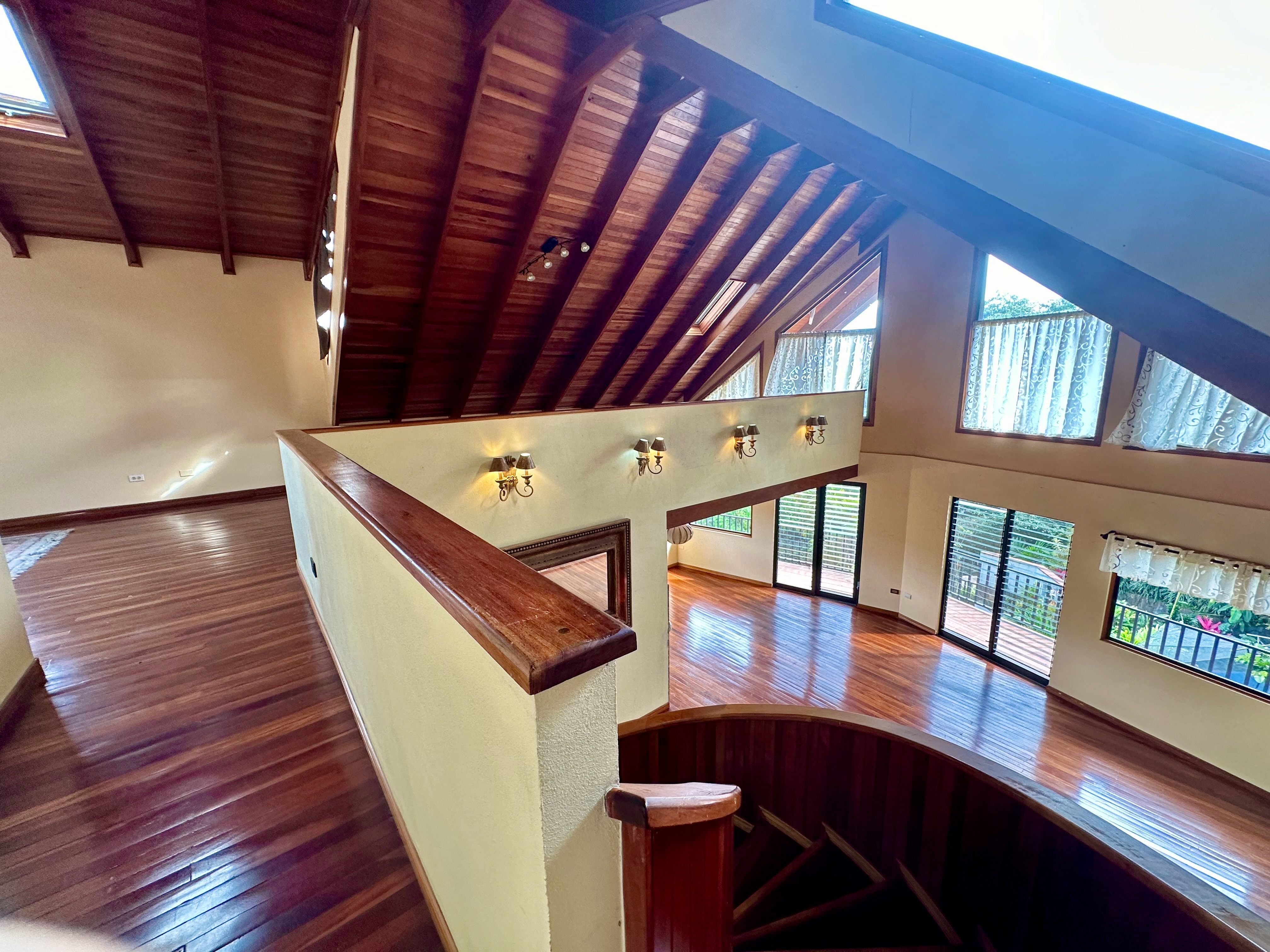 Second Floor: A stunning spiral staircase with fine wooden steps leads to the top level, where the master suite awaits. This luxurious space includes a private bathroom, a walk-in closet, and breathtaking panoramic views—you can even spot multiple volcanoes on clear days! Additionally, there’s a spacious area that can serve as an office, studio, or anything you can imagine.
