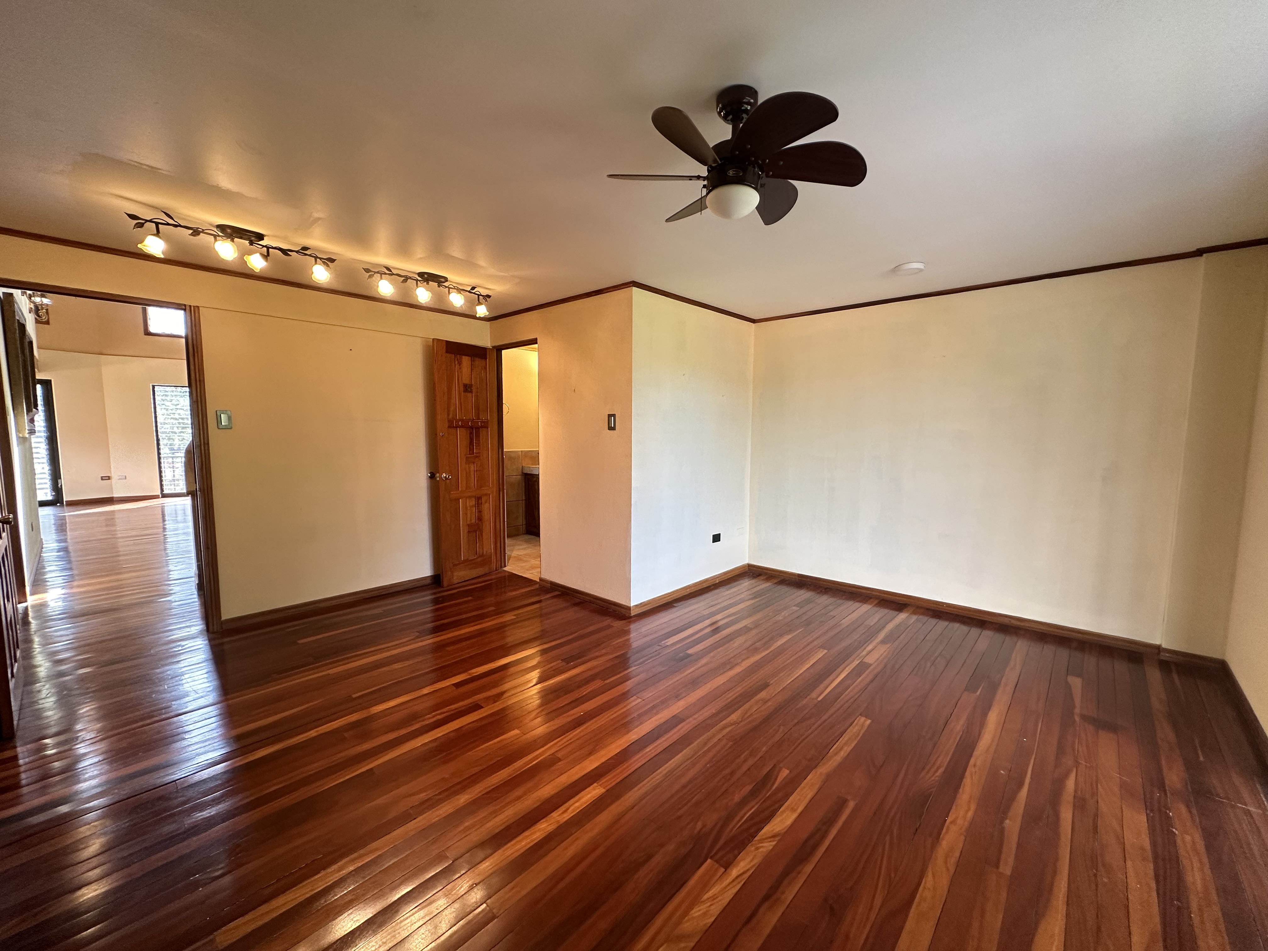 There’s also a bathroom, a generously sized bedroom with a walk-in closet, and a unique home theater room, complete with a white projection screen and an optional projector. The floors, crafted from tropical hardwood, are in excellent condition and add a warm, natural touch.