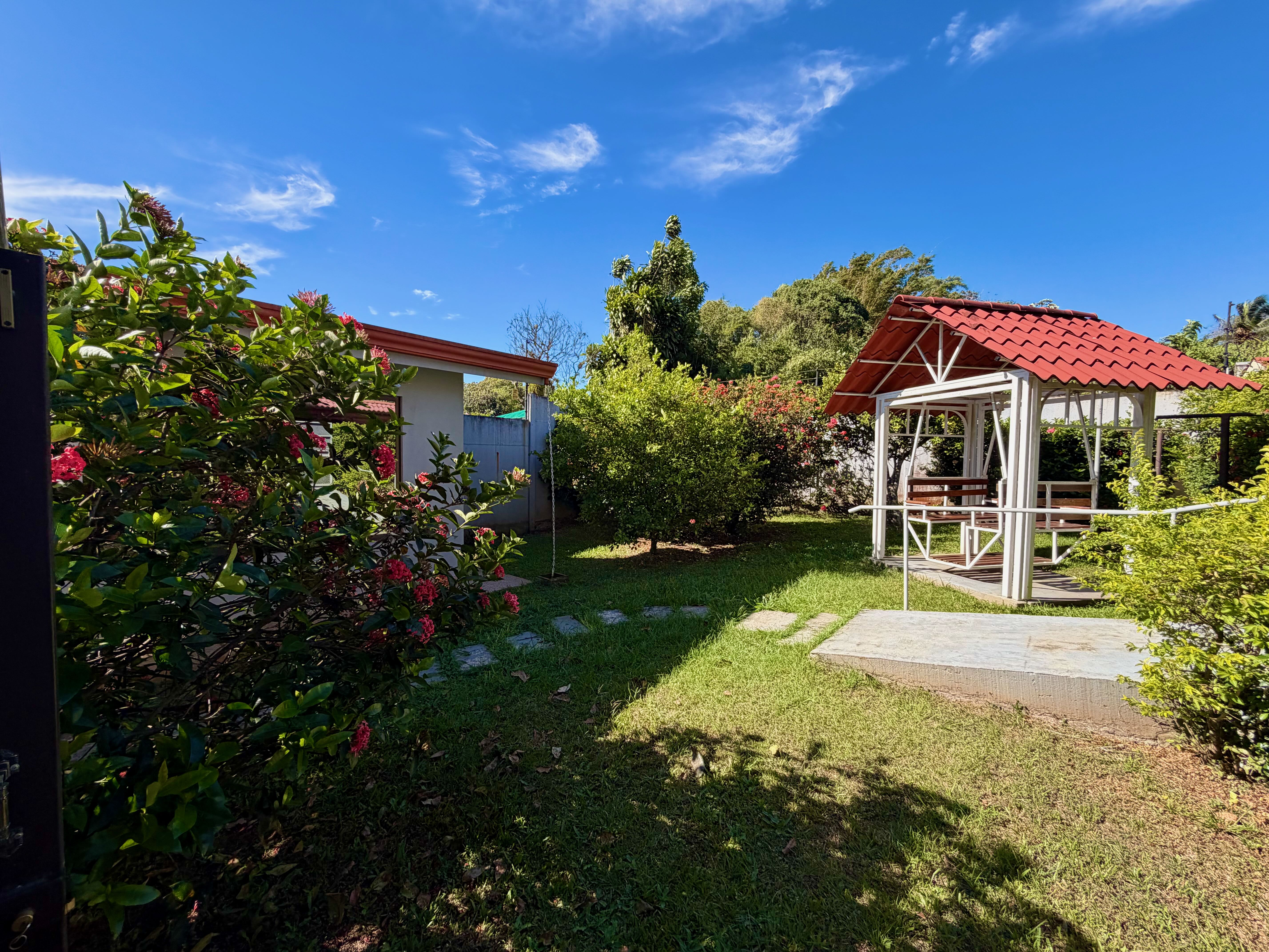 The laundry room is located in a separate small building. At the back of the property, a lovely garden with plants and fruit trees creates a pleasant outdoor space, with enough room to add a swimming pool. A covered carport for two vehicles and a water reserve with pump add convenience and peace of mind.