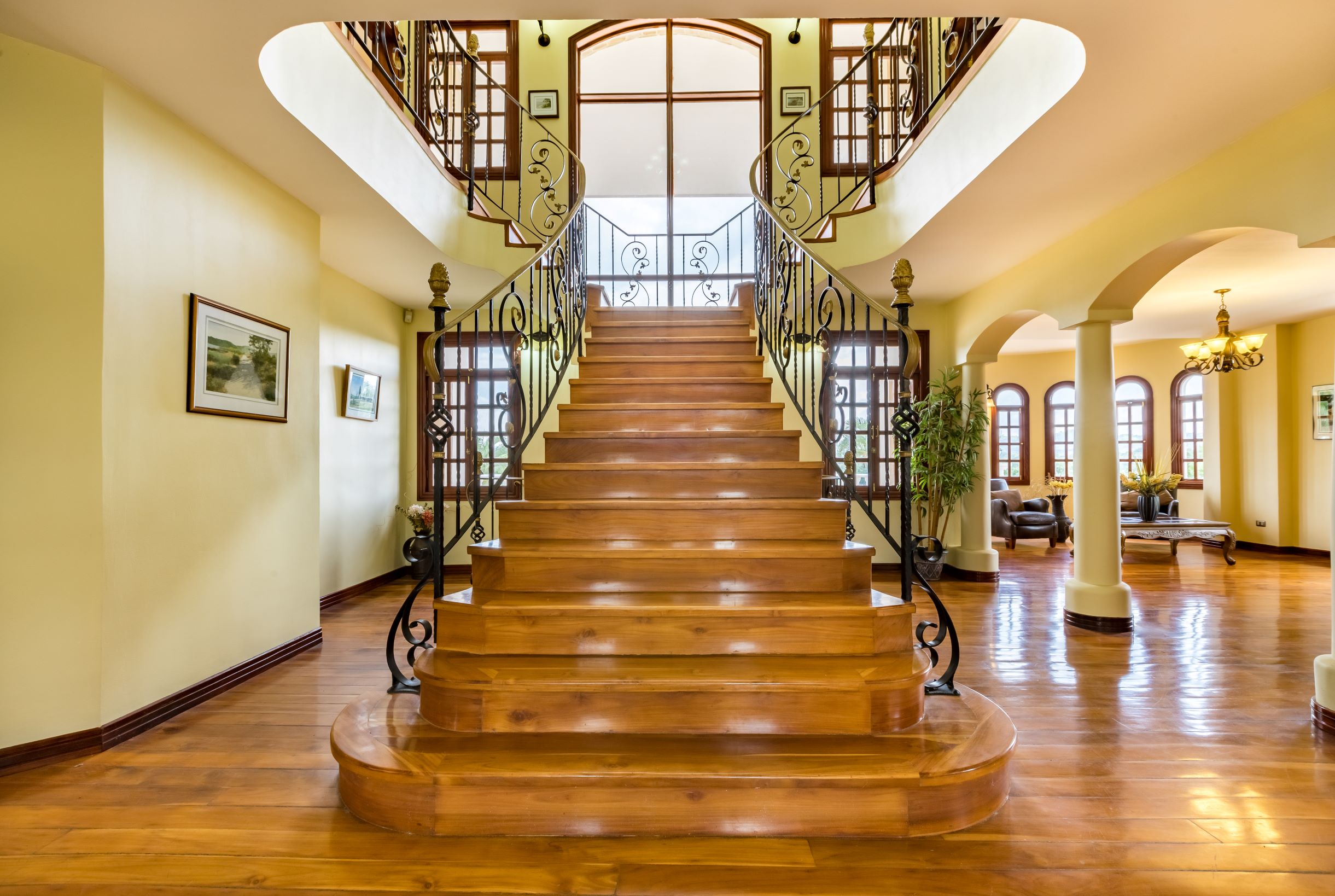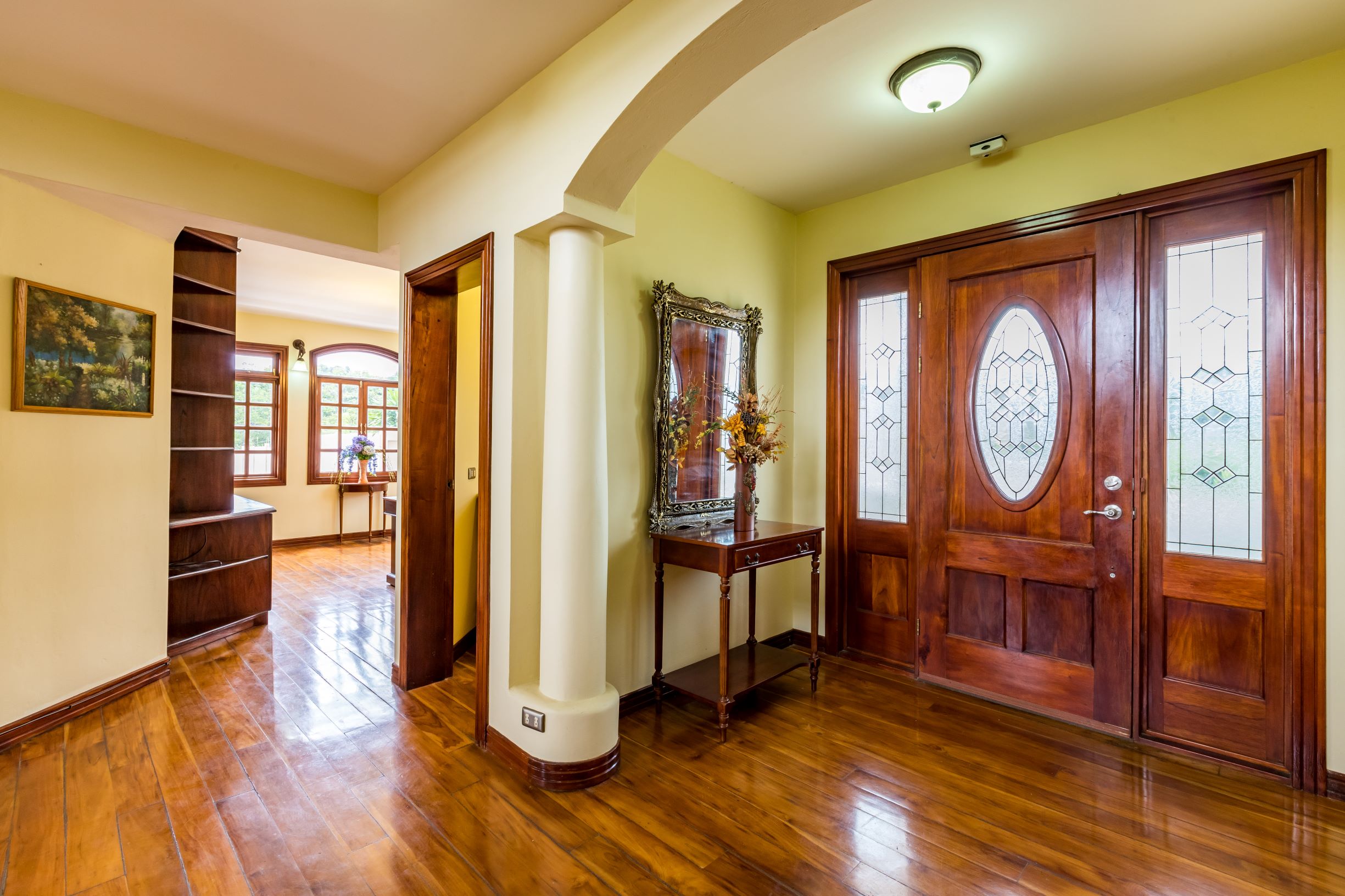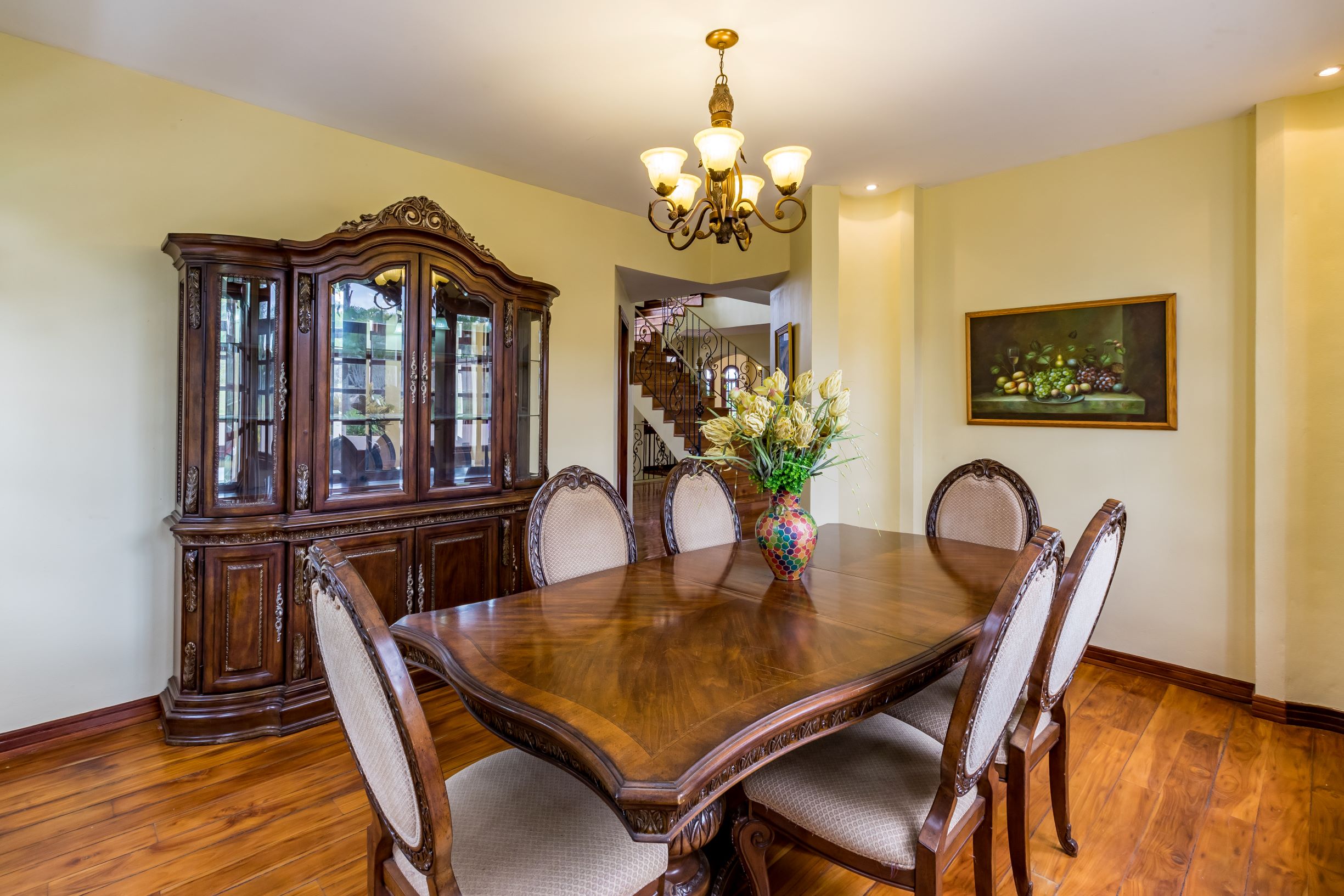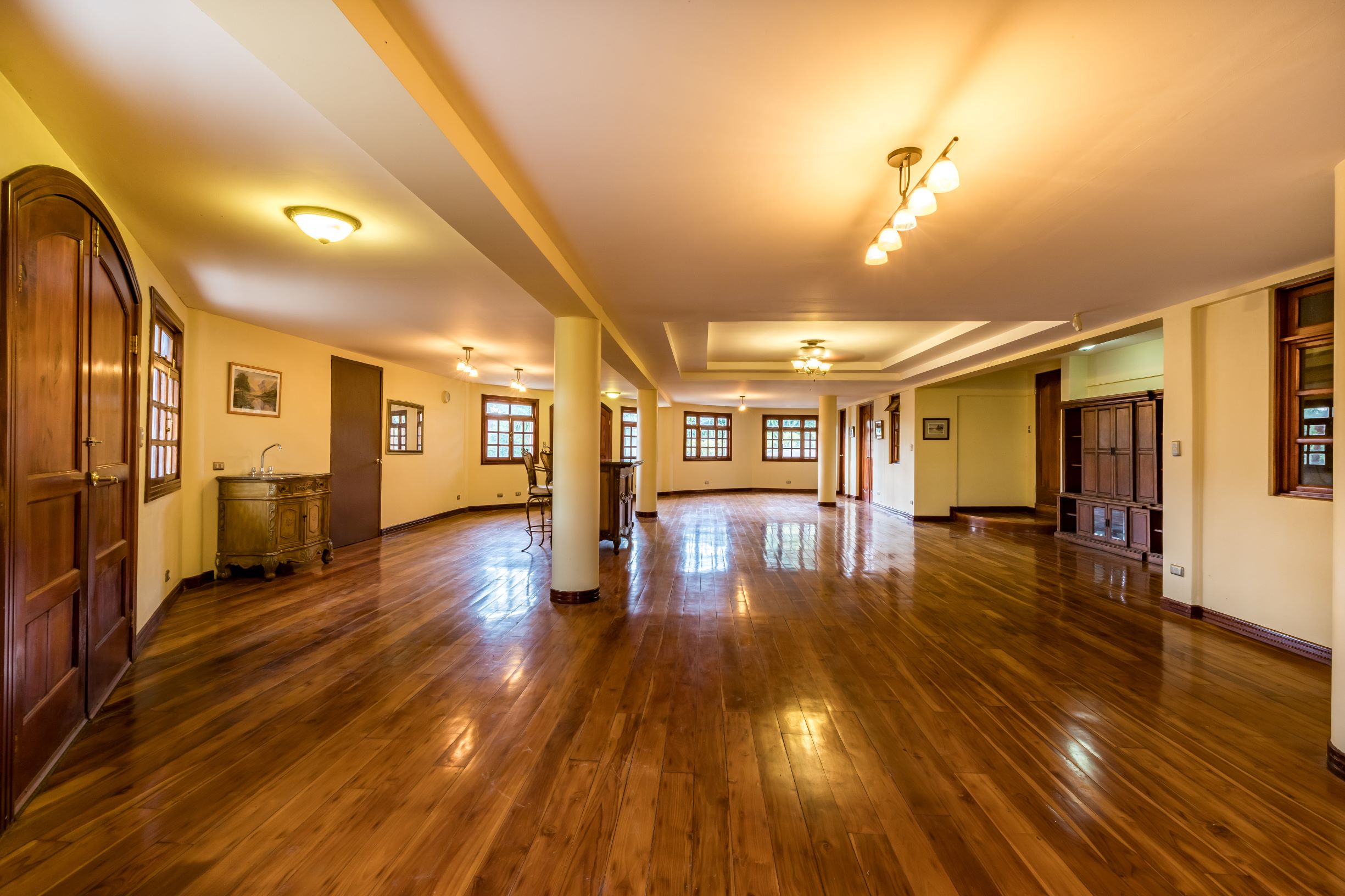 La casa principal tiene una gran sensación de "Viejo Mundo" con una elegante escalera dividida adornada con hermosos detalles de metal al entrar en la casa; así como, pisos de madera y las muchas columnas, arcos y balcones. En el nivel principal se encuentra un vestíbulo formal, gran sala formal con acceso a la terraza con vistas a la piscina, una oficina o biblioteca, comedor formal y muy amplia, cocina de diseño con sobres de granito y un area de comedor que también tiene acceso a la terraza.