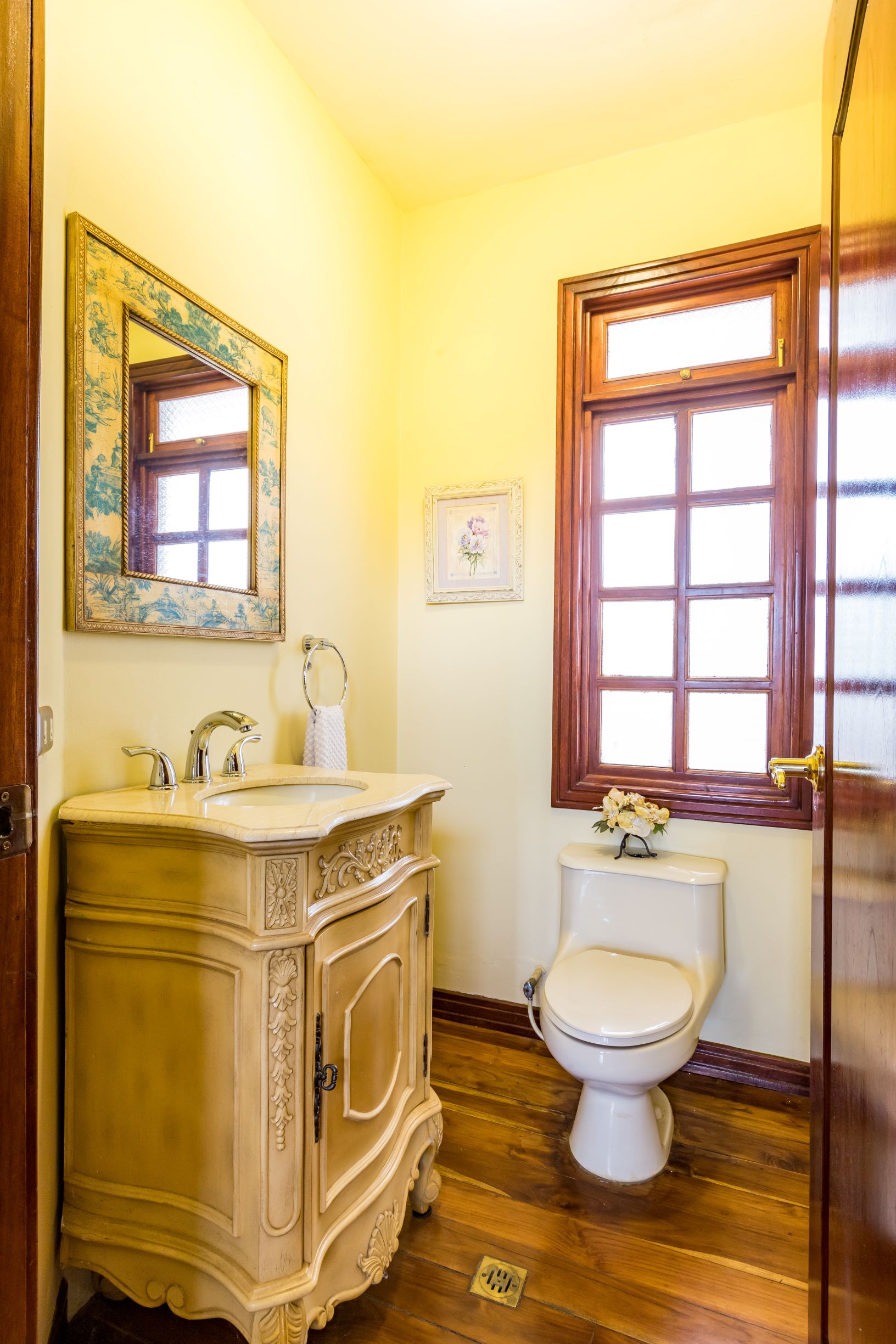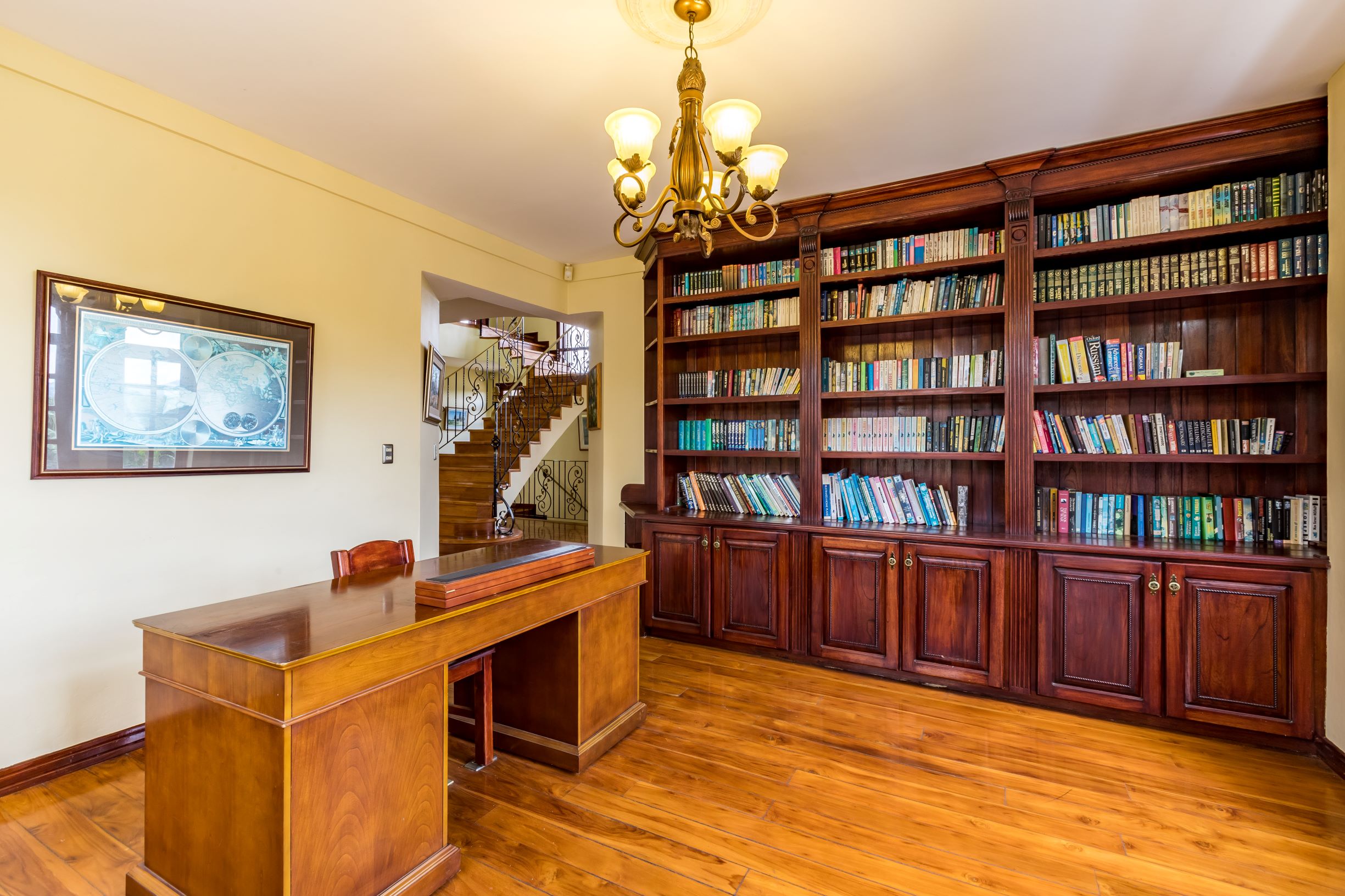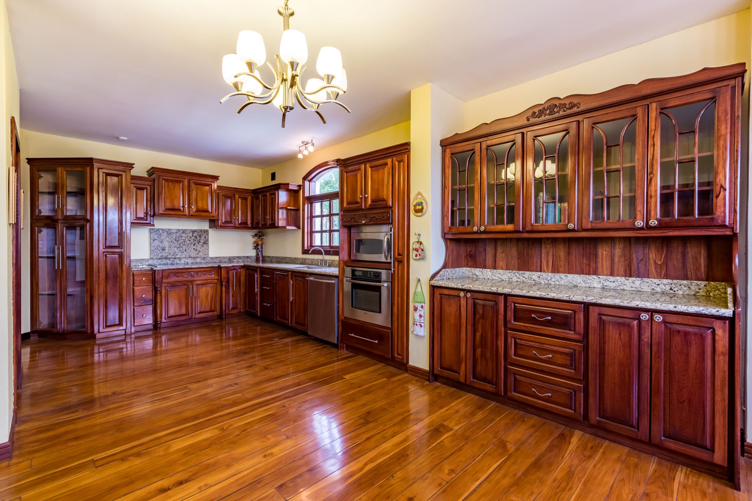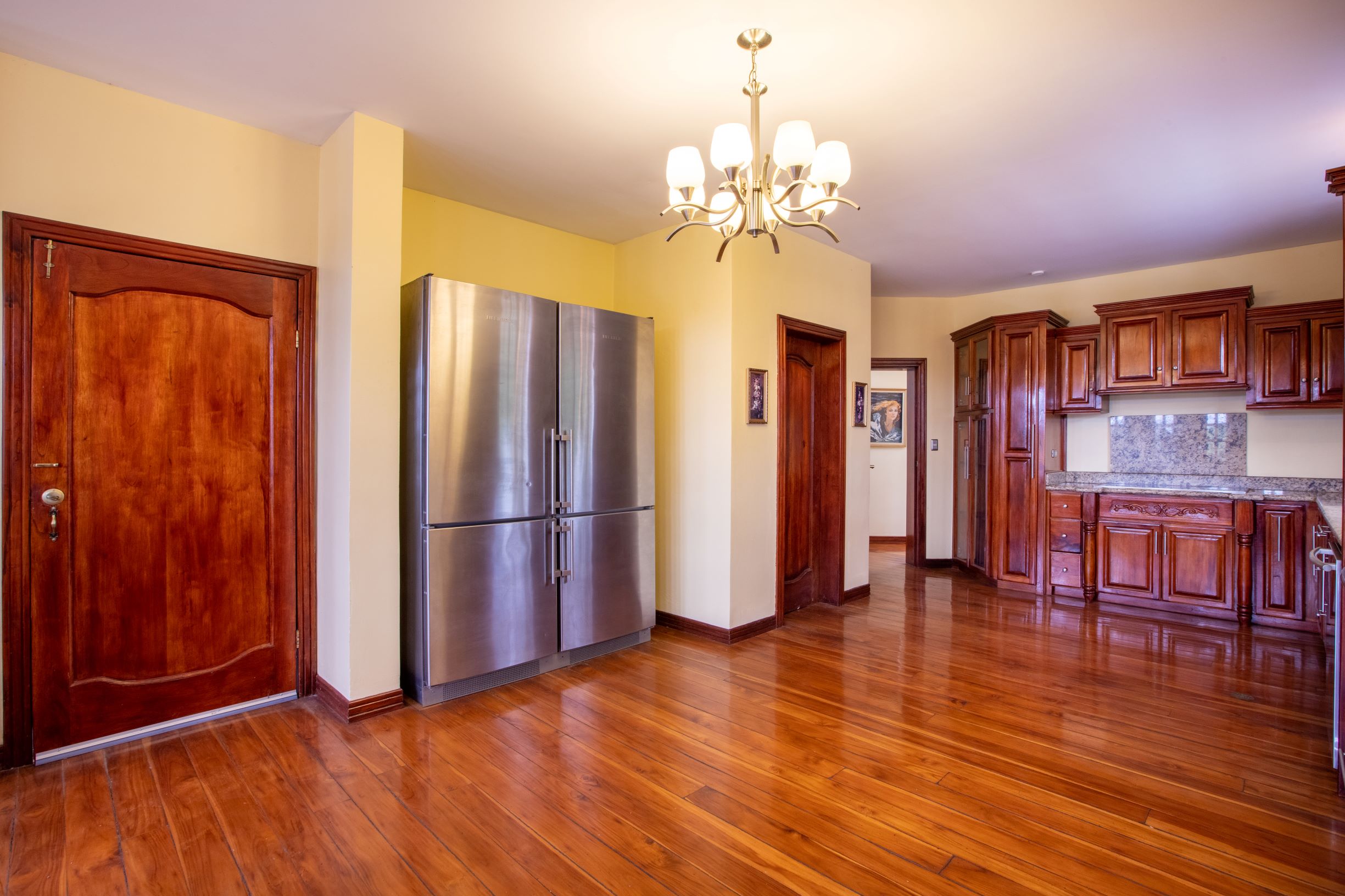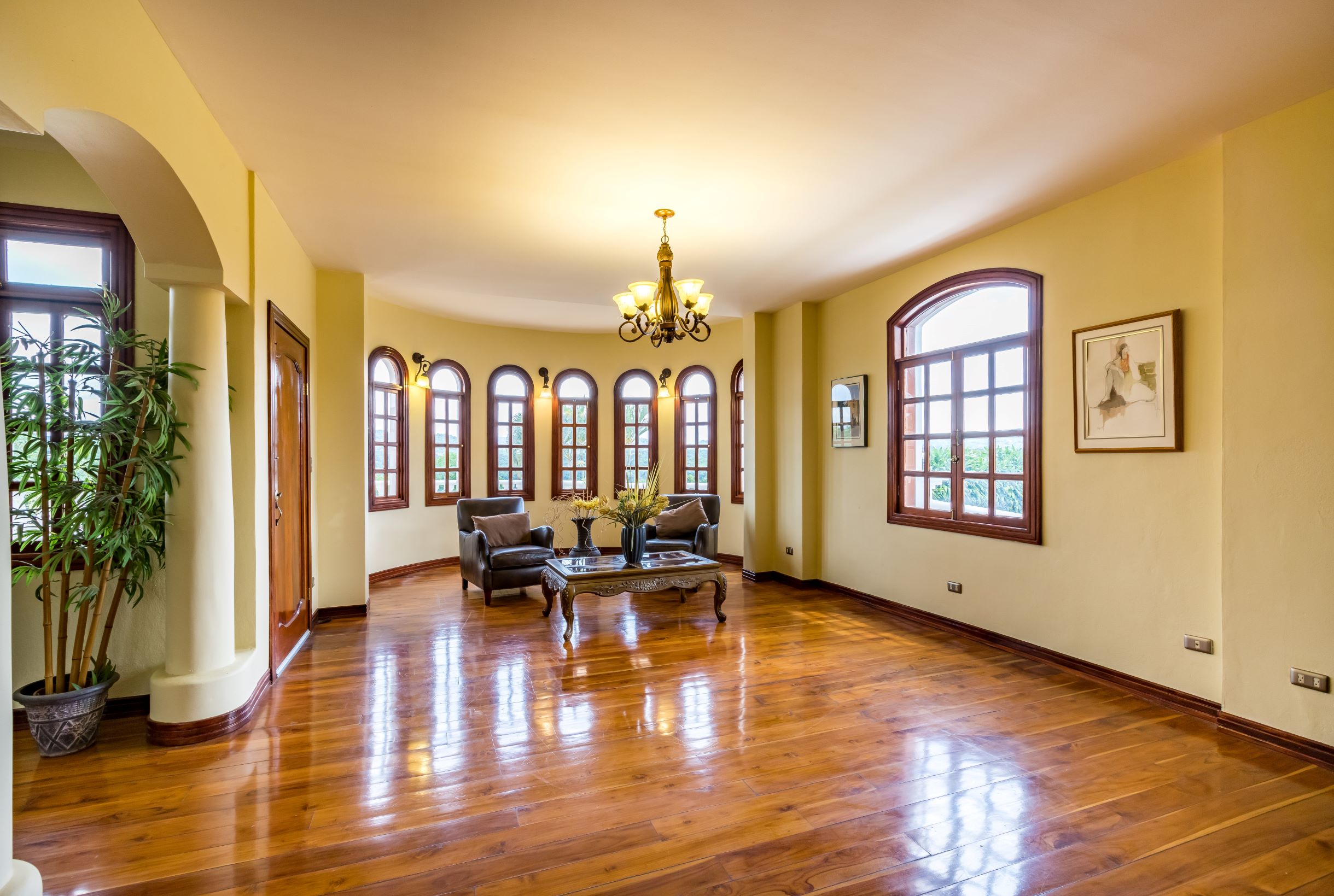 La casa principal tiene una gran sensación de "Viejo Mundo" con una elegante escalera dividida adornada con hermosos detalles de metal al entrar en la casa; así como, pisos de madera y las muchas columnas, arcos y balcones. En el nivel principal se encuentra un vestíbulo formal, gran sala formal con acceso a la terraza con vistas a la piscina, una oficina o biblioteca, comedor formal y muy amplia, cocina de diseño con sobres de granito y un area de comedor que también tiene acceso a la terraza.