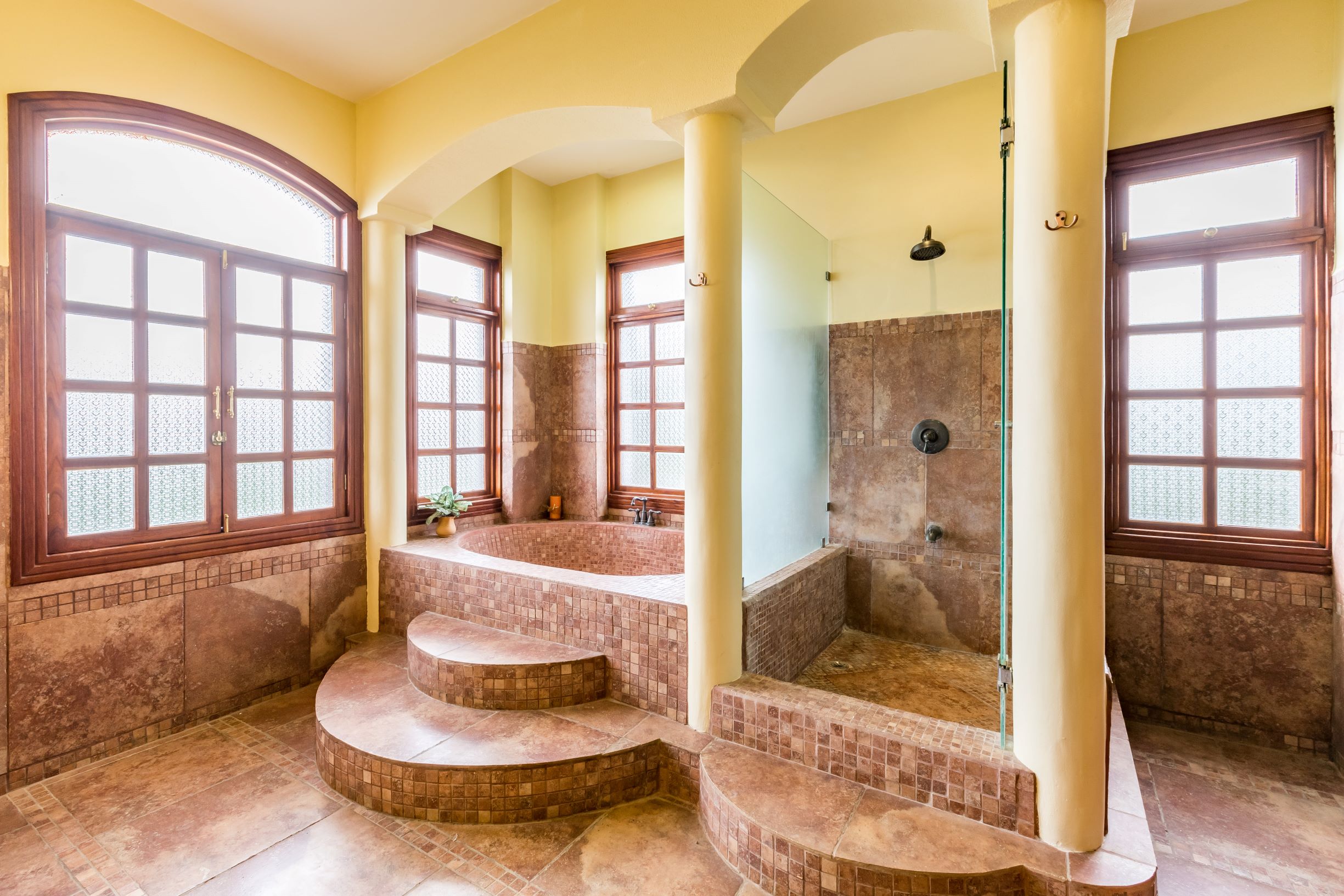 The main home has a grand, “Old World” feel with an elegant, split stairway embellished with beautiful metal details as you enter the home; as well as, hardwood floors and the many columns, arches, and balconies. On the main level, you’ll find a formal vestibule, a large formal living room with access to the terrace that overlooks the pool, an office or library, a formal dining room, and very spacious, designer kitchen with granite countertops and an eating area that also accesses the terrace.