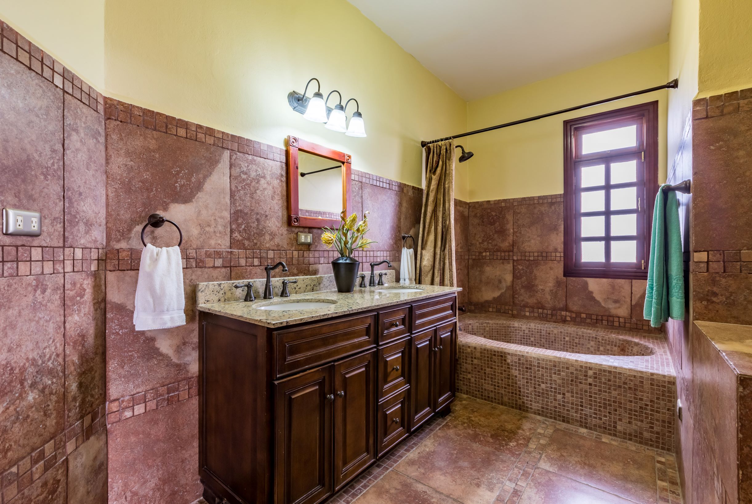 El dormitorio principal en un lado de la planta superior cuenta con un area de visita, un gran cuarto de baño con doble lavabo, una gran tina, ducha y walk-in closet. Hay dos dormitorios adicionales que comparten un gran cuarto de baño completo y zona de lavandería. Tanto la suite principal como otro dormitorio tienen acceso a balcones con vistas a la piscina y a las montañas.