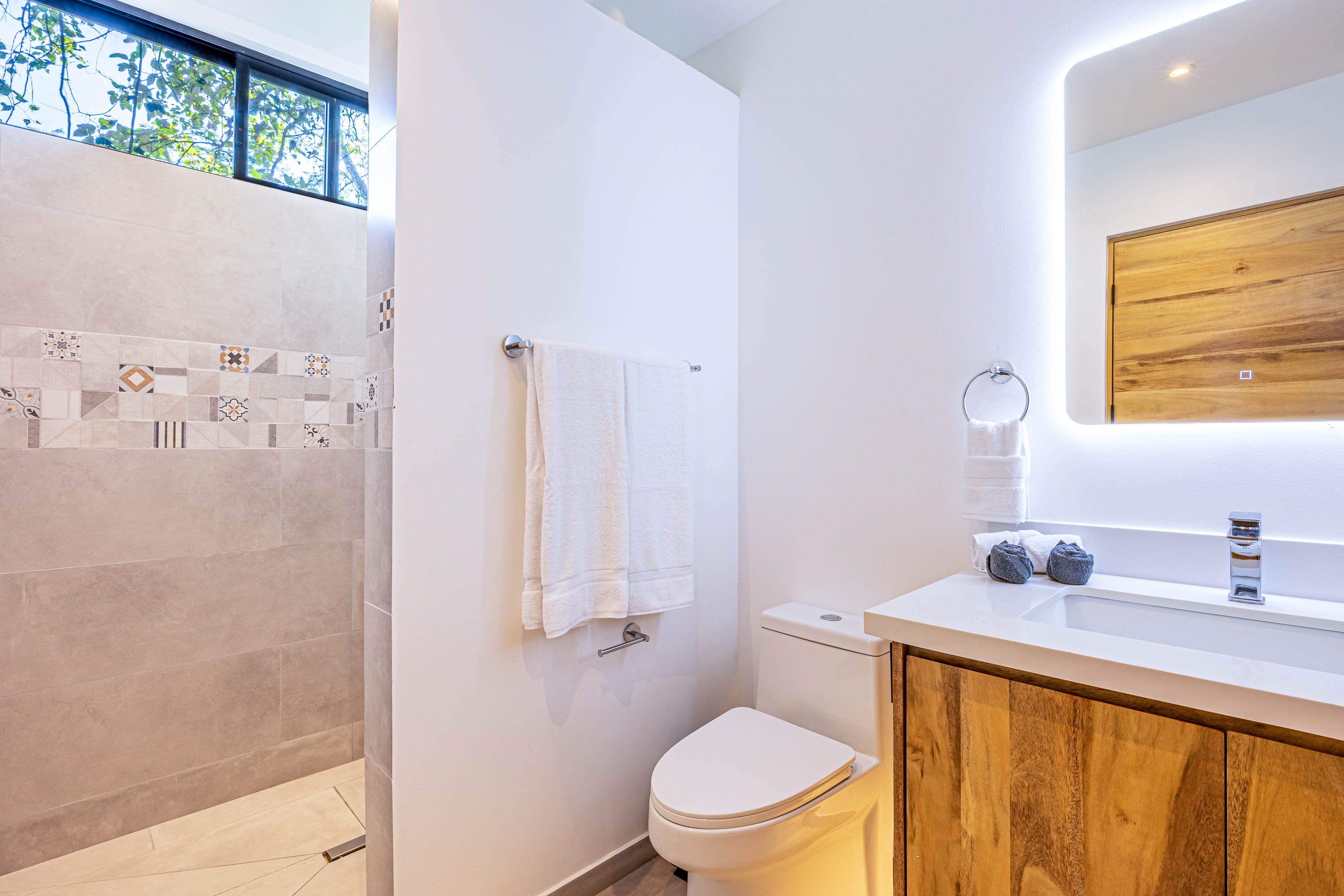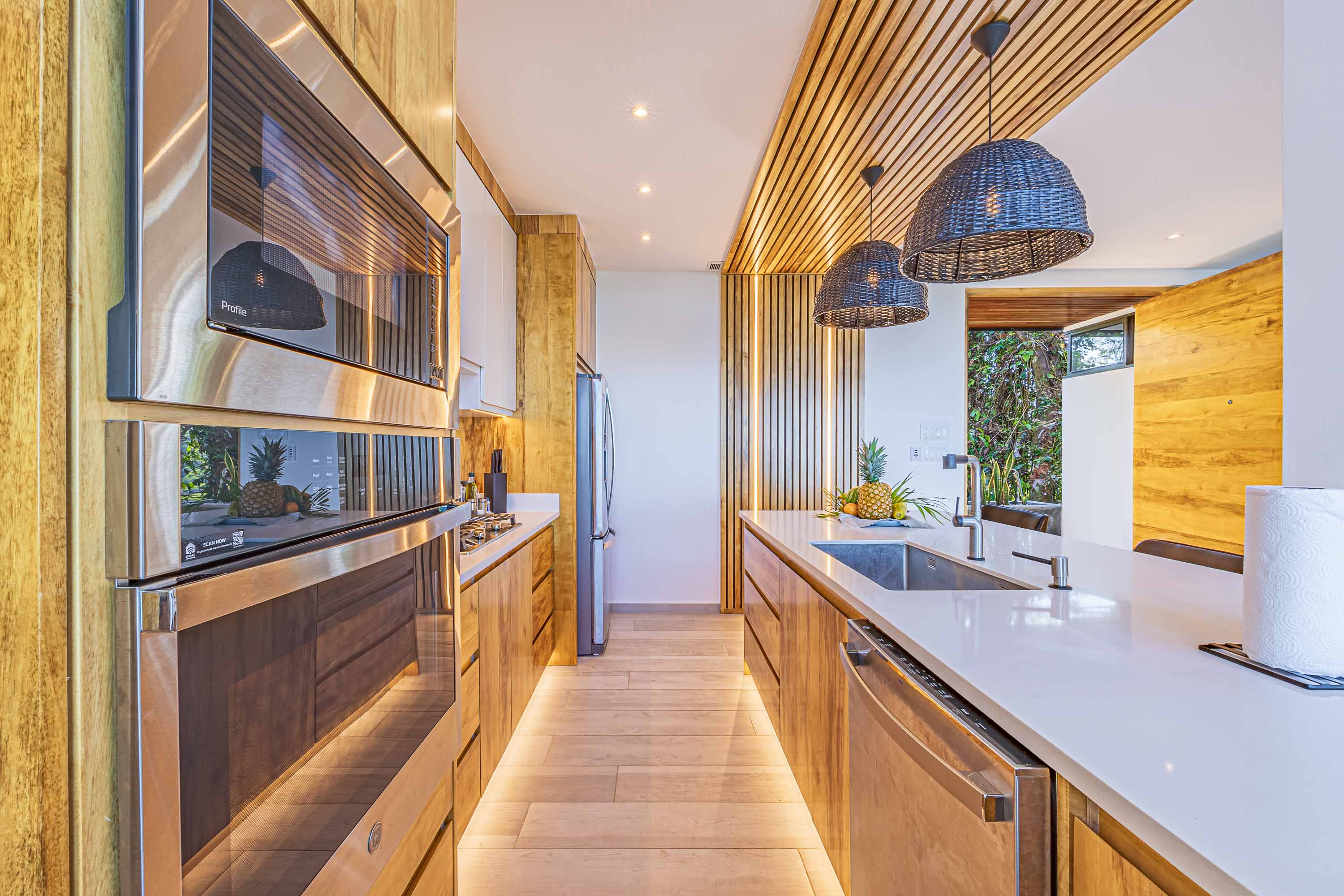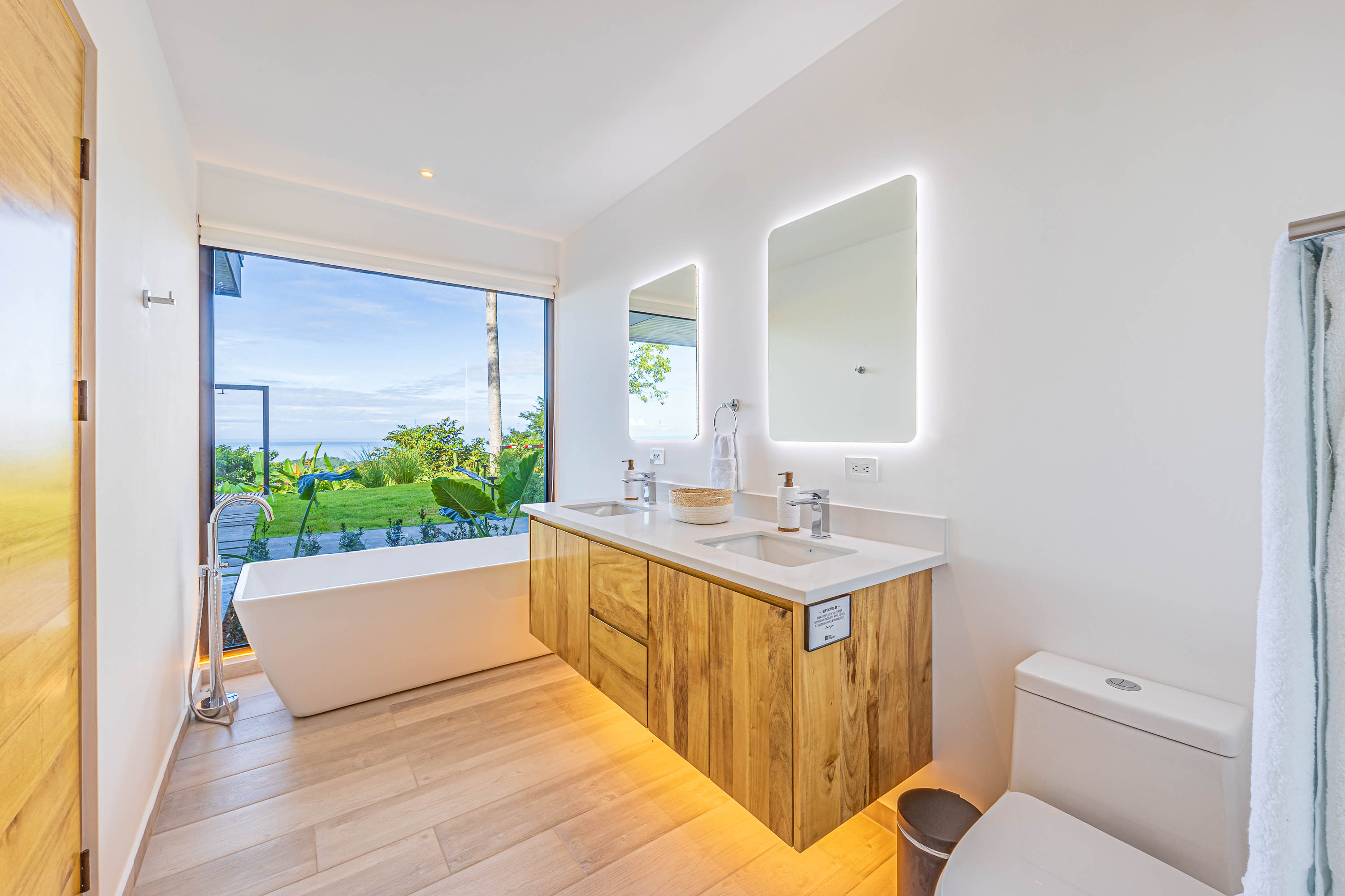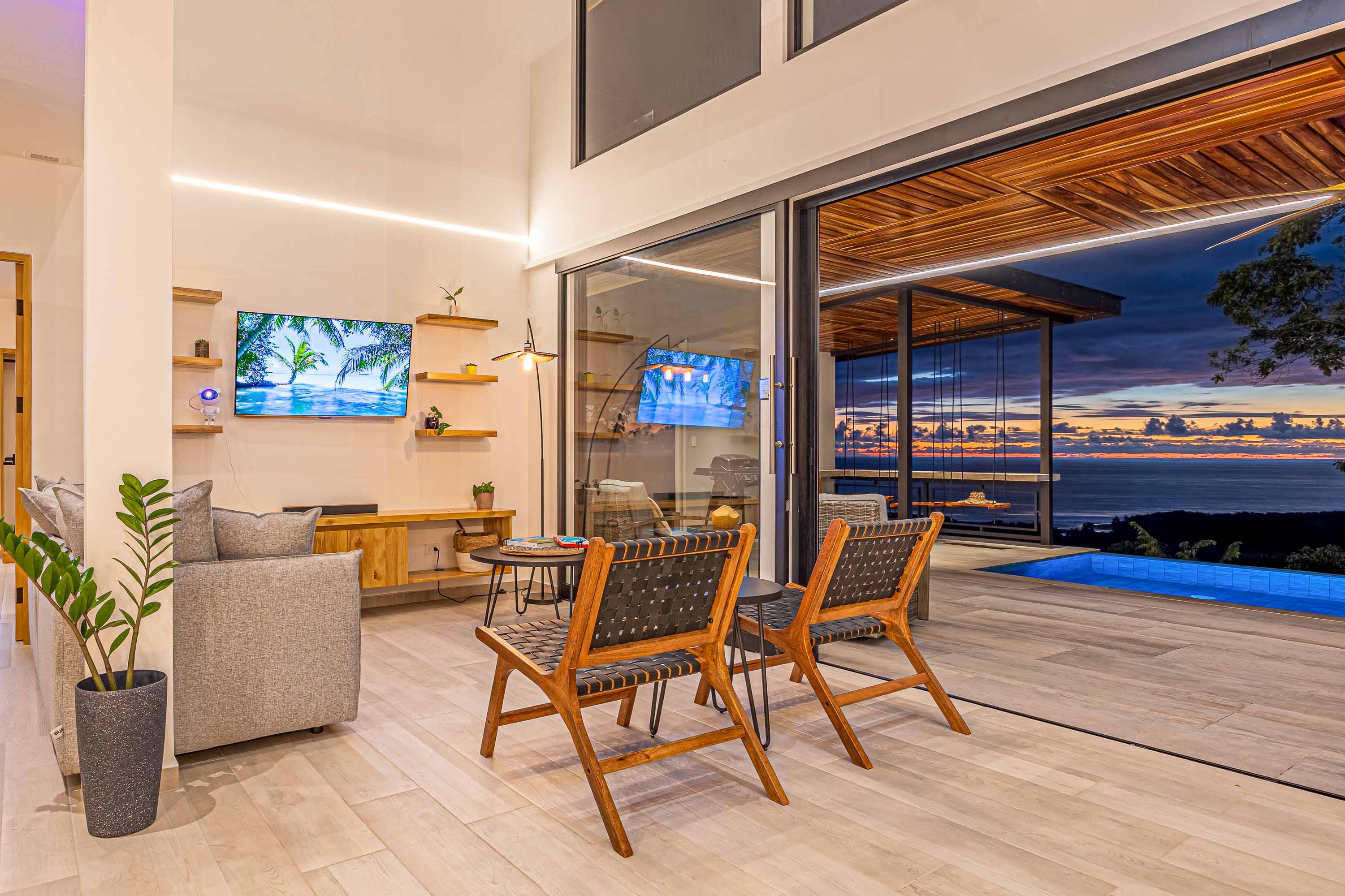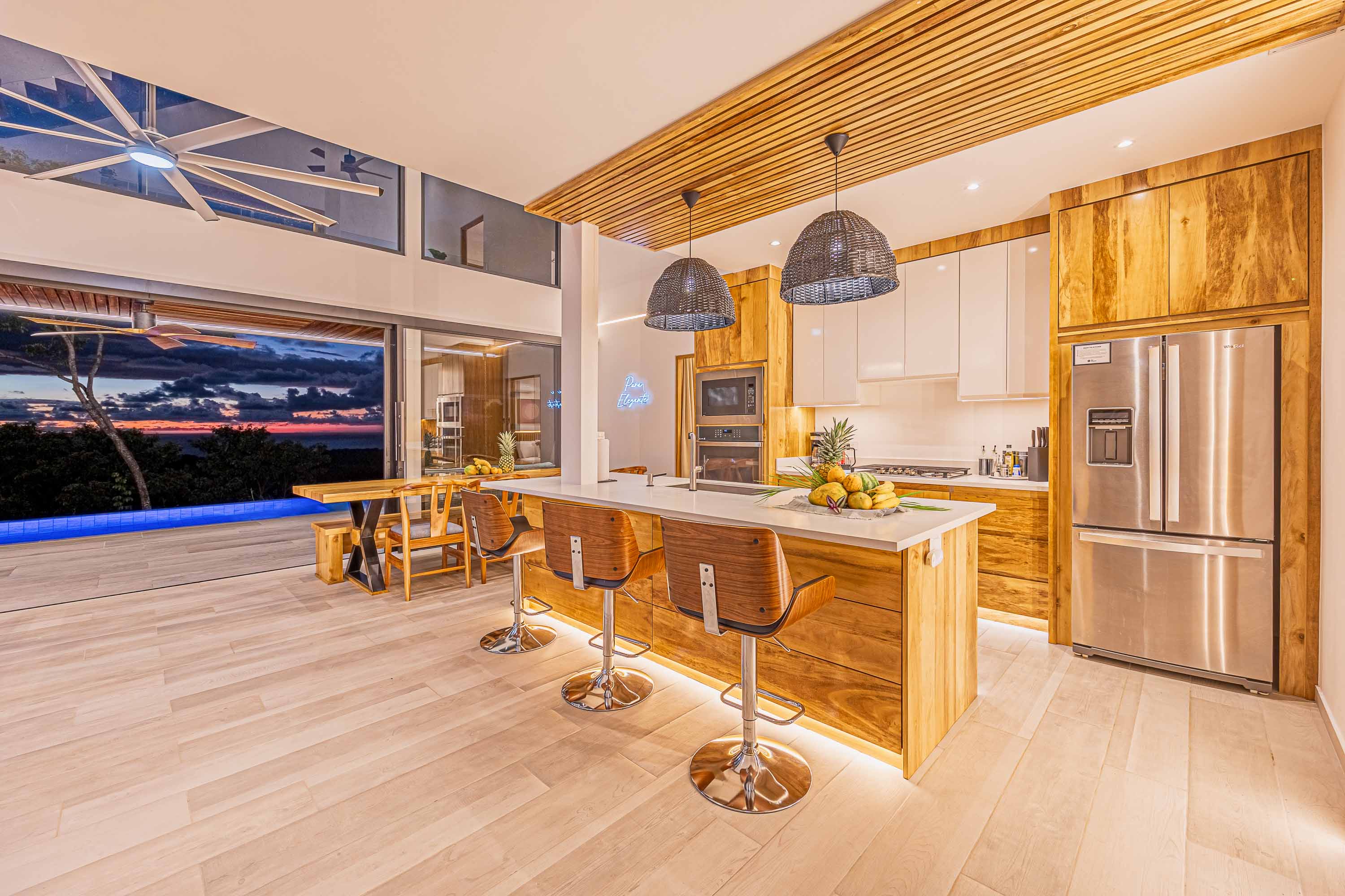 The villa is equipped with fiber-optic high-speed internet and Starlink for redundancy, a Bluetooth sound system, and a fully stocked designer kitchen with stainless steel appliances. Eco-conscious features include low-flow toilets, energy-efficient lighting and appliances, natural solar pool heating, and rainwater system compatibility—supporting a sustainable lifestyle without sacrificing comfort.
