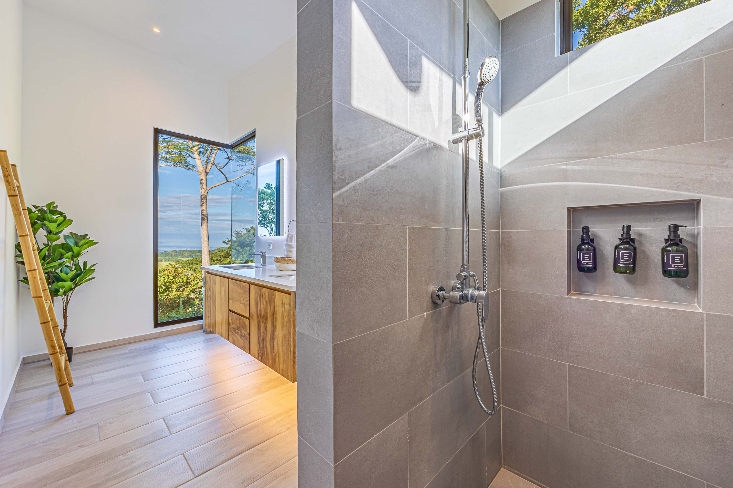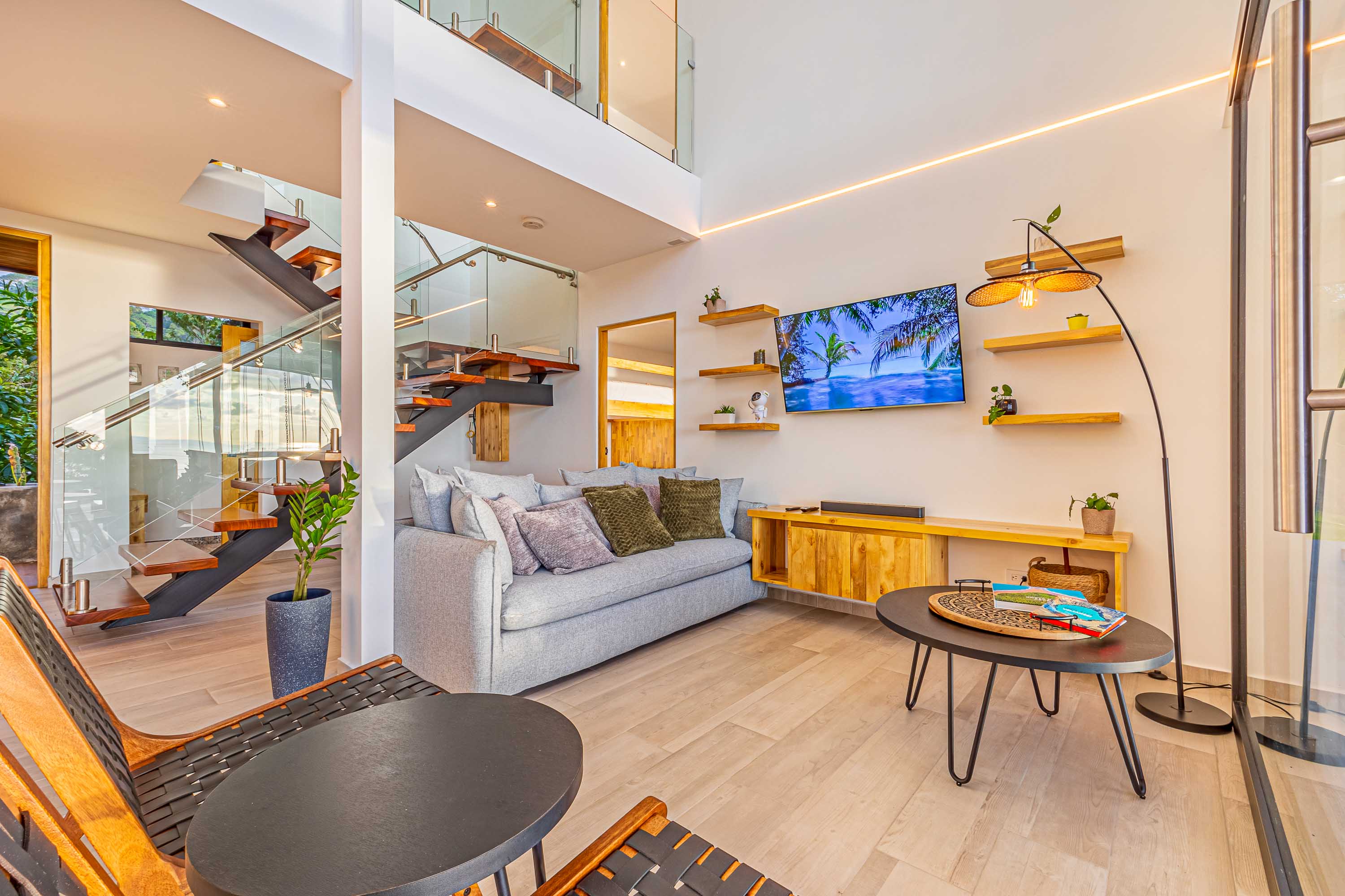 The villa offers approximately 5,200 square feet of living space, highlighted by vaulted ceilings and expansive glass that capture ocean and jungle views from nearly every angle. Carefully selected finishes include imported tile, custom woodwork, and globally sourced design details, with every element intentionally chosen to balance aesthetics, comfort, and durability.