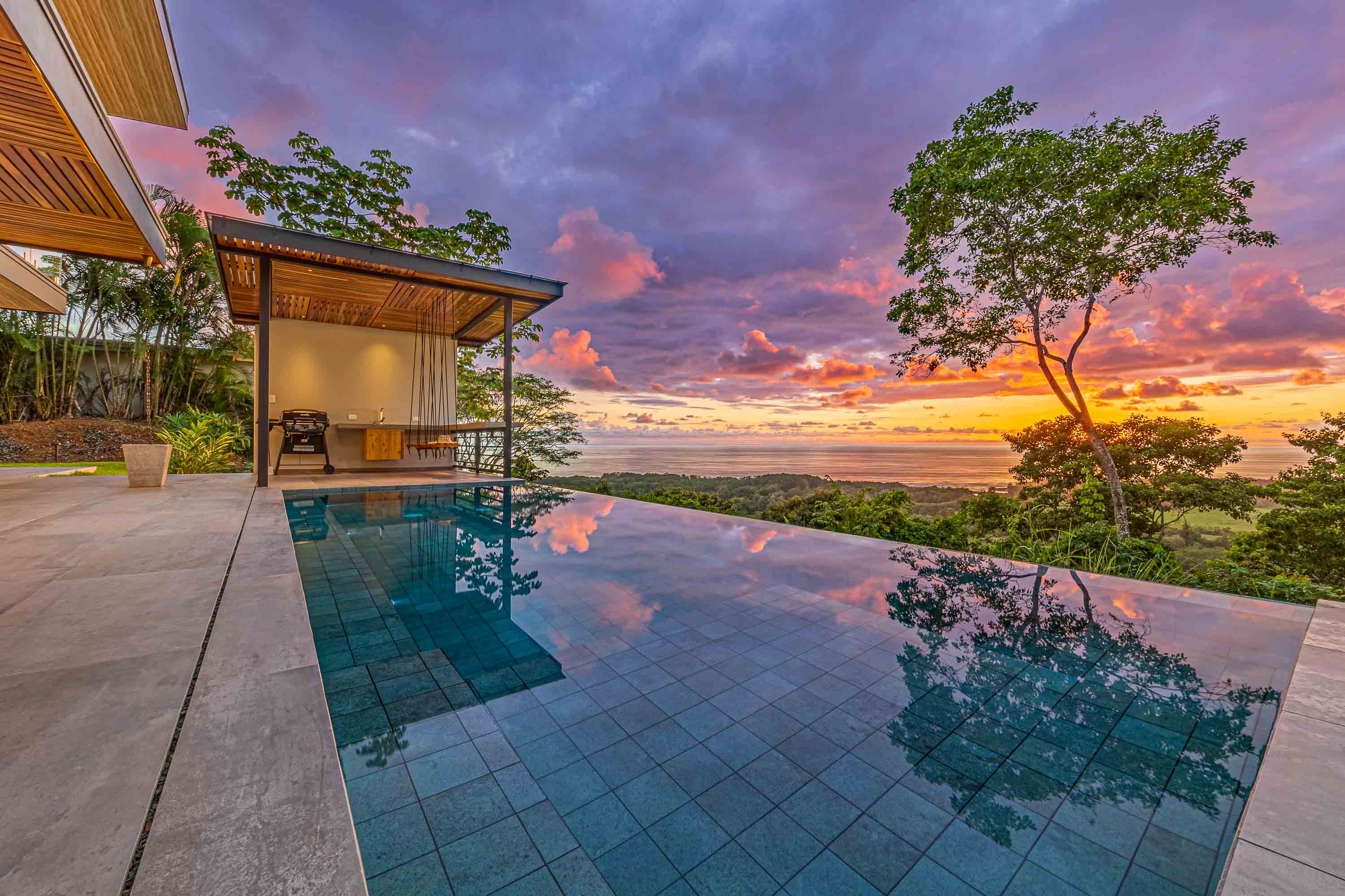 Outdoor living is a defining feature of the home. The Bali-inspired infinity-edge pool features Java-stone finishes, sun ledges, and panoramic ocean and mountain views—ideal for sunrise swims or sunset gatherings. A palapa-style outdoor kitchen and bar includes a BBQ, rope swing bar seating, and a sunset-facing counter where toucans are frequent visitors.