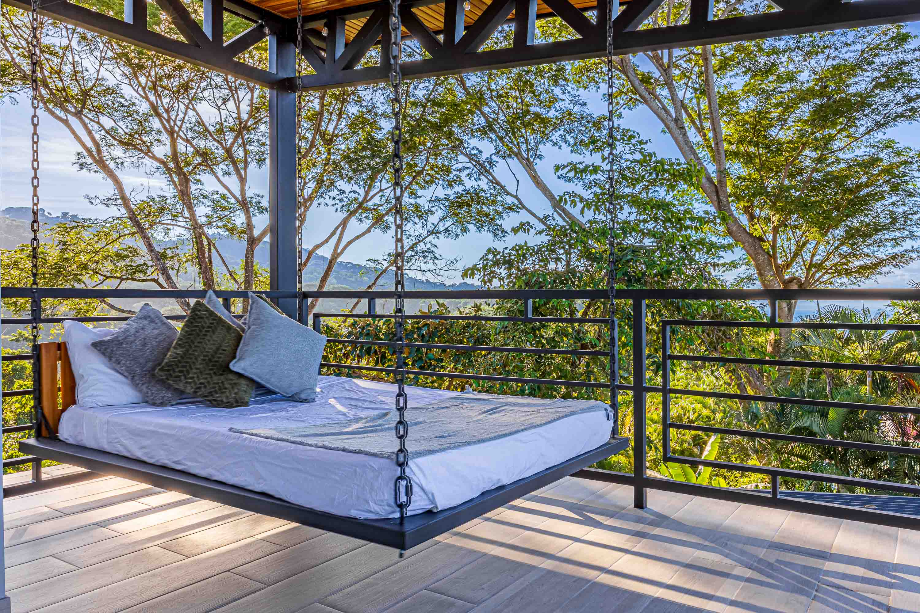 An 800-square-foot rooftop sky deck crowns the home, offering 360-degree views of the coastline and mountains. With a hanging daybed and generous open space, it is perfectly suited for entertaining, yoga sessions, or retreat-style gatherings.