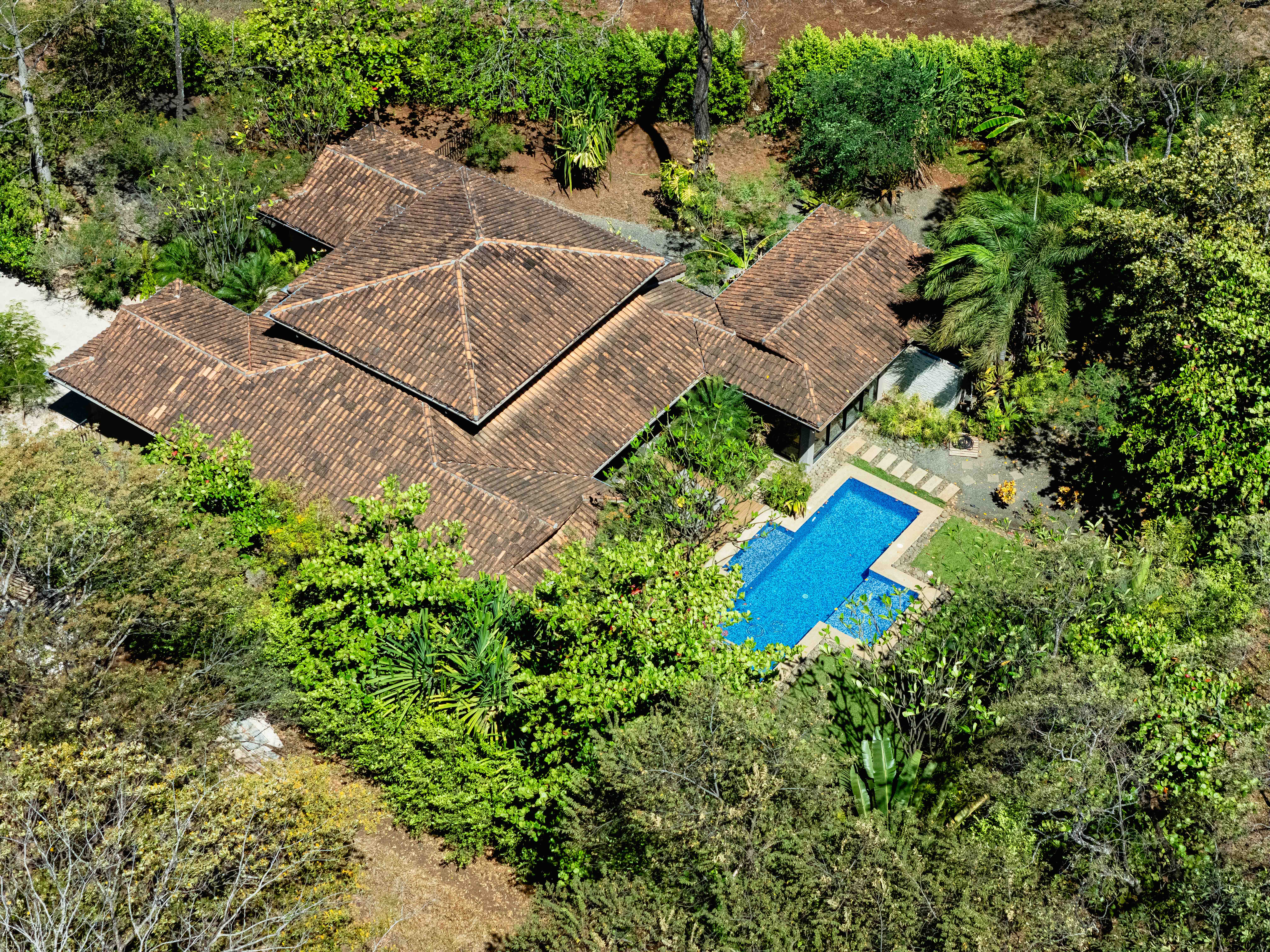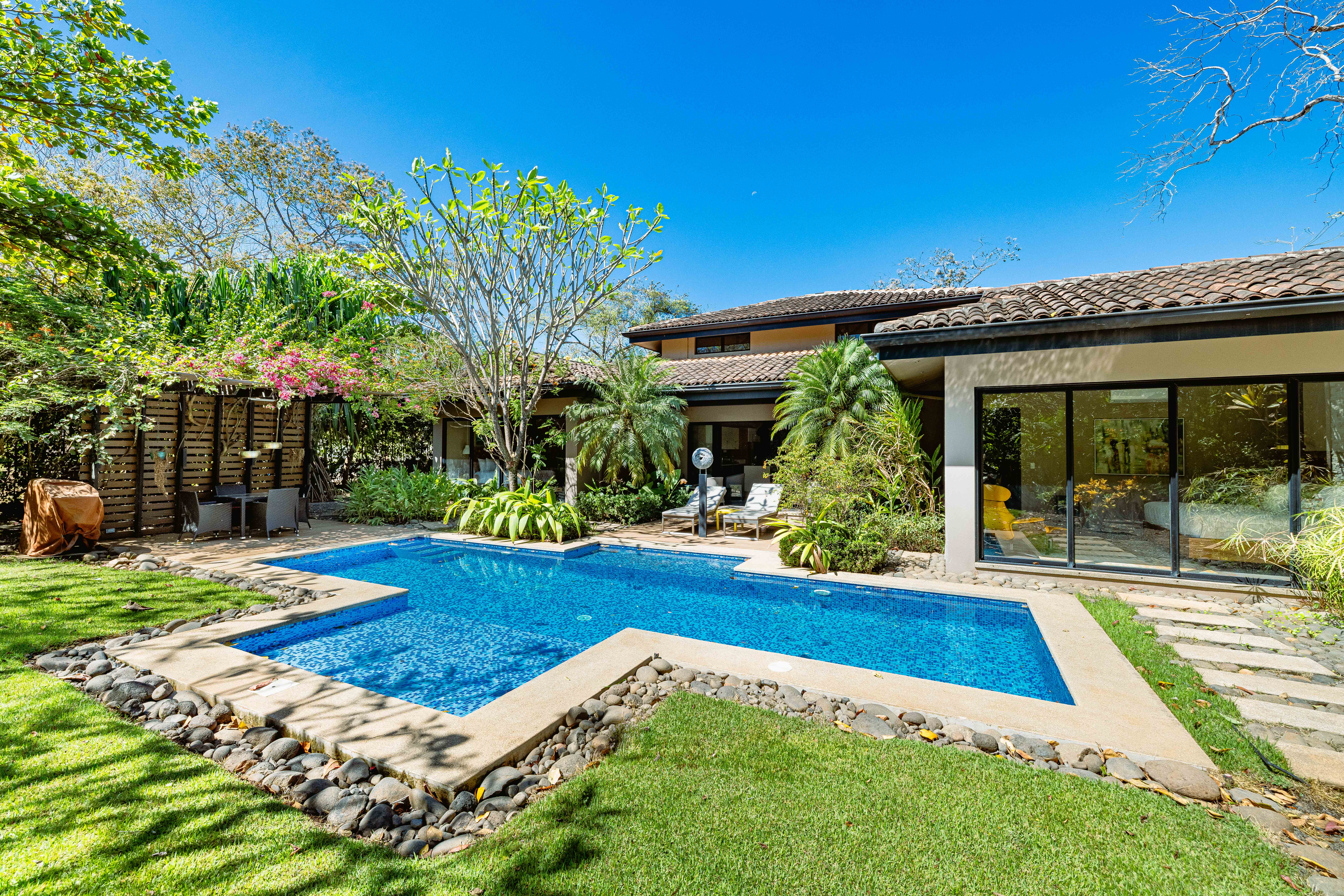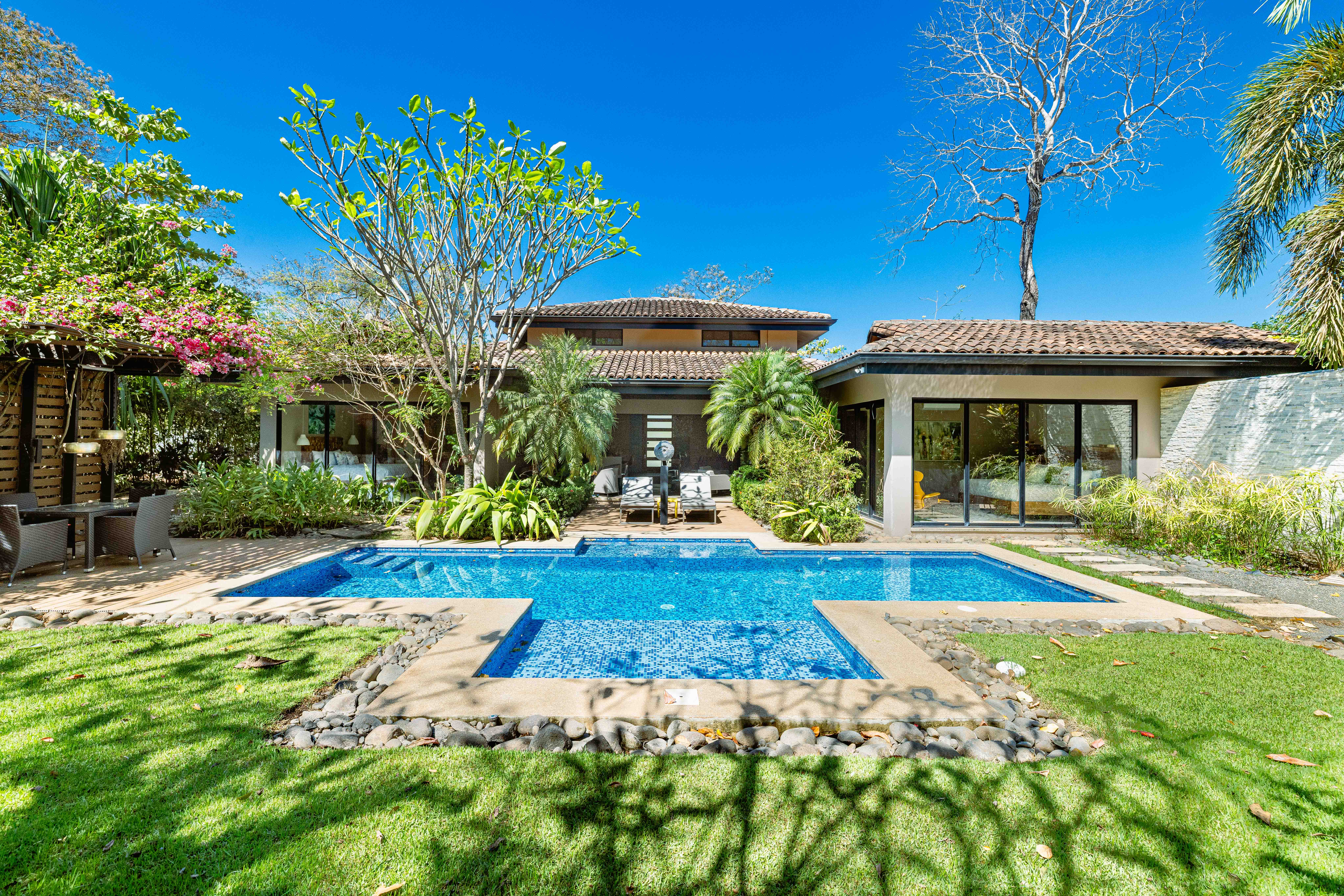 Introducing Casa Milagro, a stunning 4-bedroom, 4-bathroom designer home that redefines tropical elegance. Nestled within the prestigious beach resort of Hacienda Pinilla, this exquisite residence sits on a generous 2,000 m² lot and offers 300 m² of refined construction. Surrounded by mature trees and lush greenery, the home blends perfectly with Guanacaste’s natural beauty, creating a private sanctuary where comfort meets sophistication.