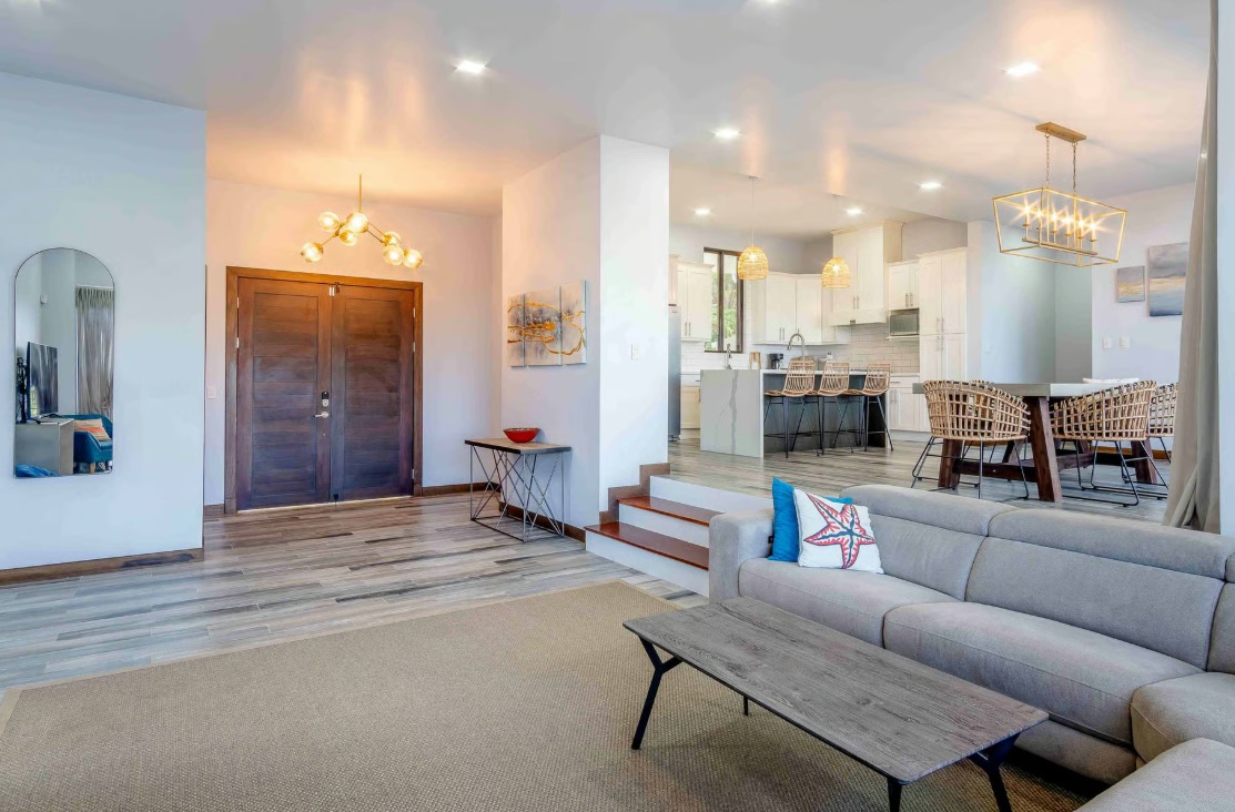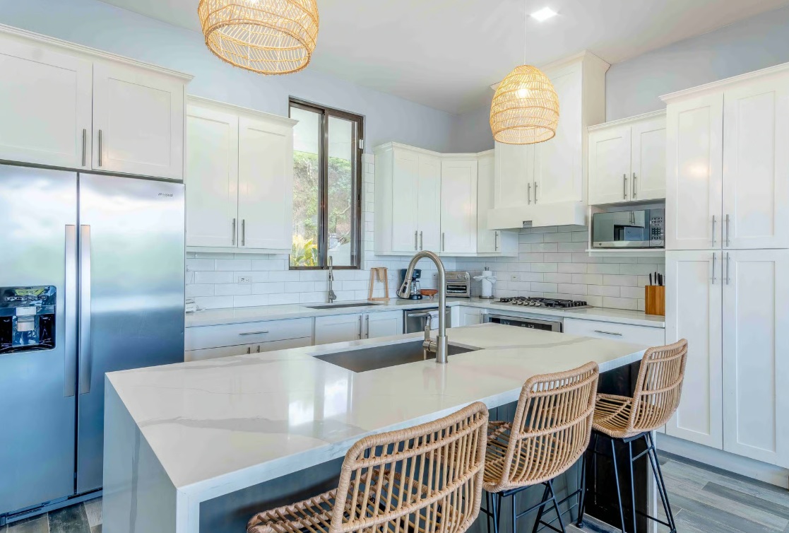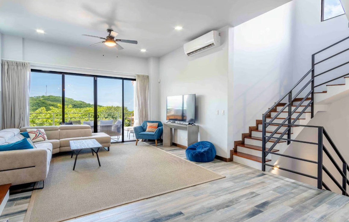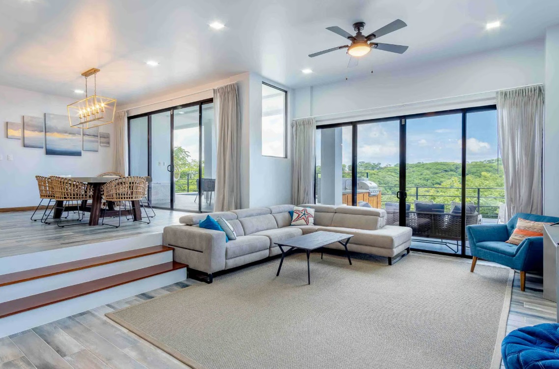 Recently built within the last three years, the home blends modern design with warm Costa Rican charm. The open-concept first floor features a spacious living room, dining area, and sleek kitchen, all flowing seamlessly to an expansive outdoor patio through large glass doors.