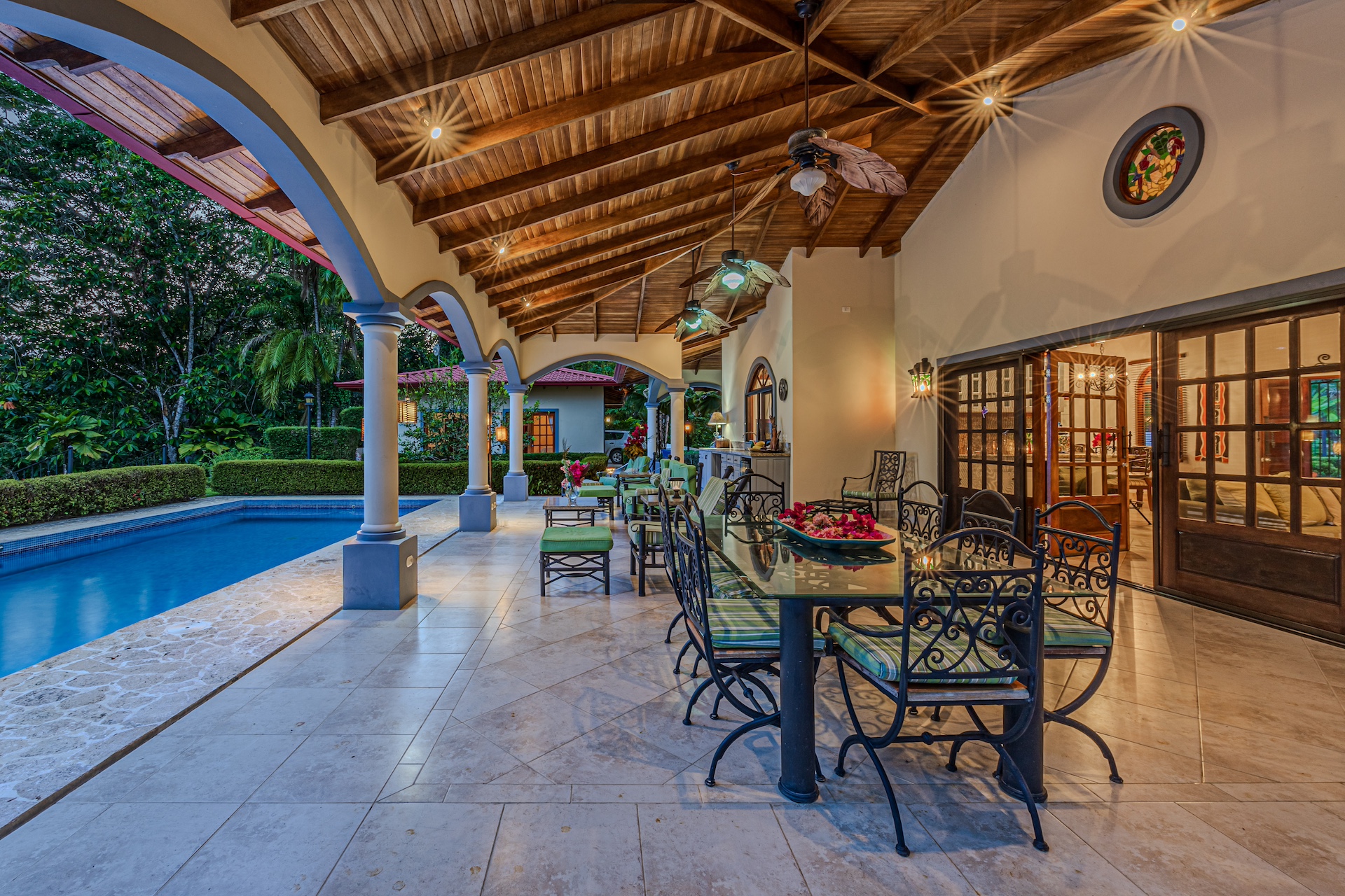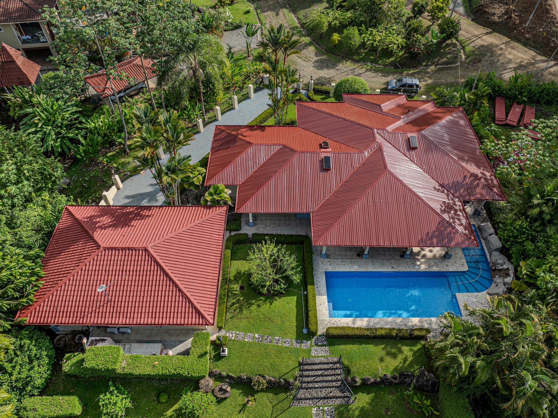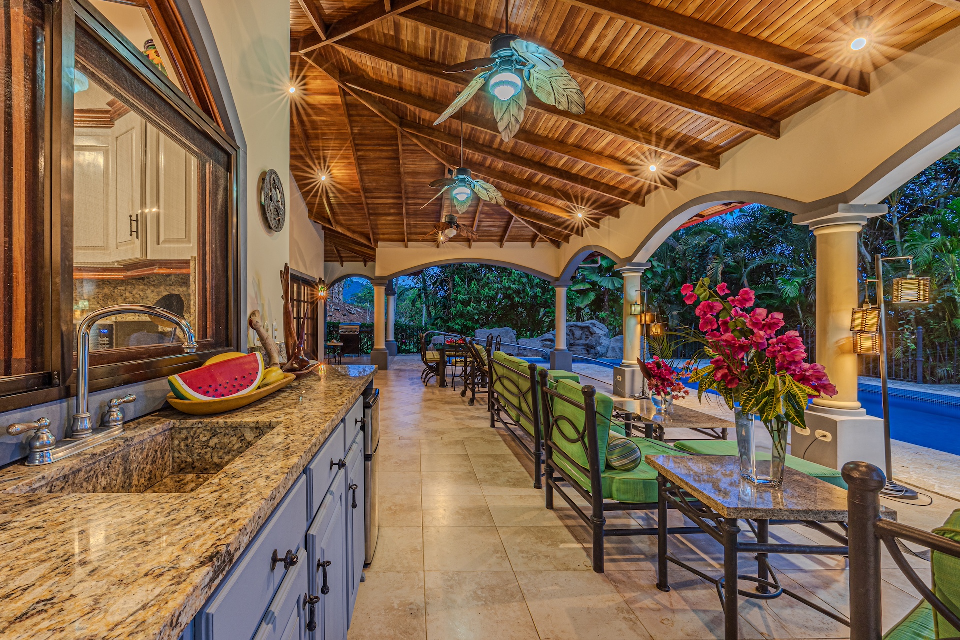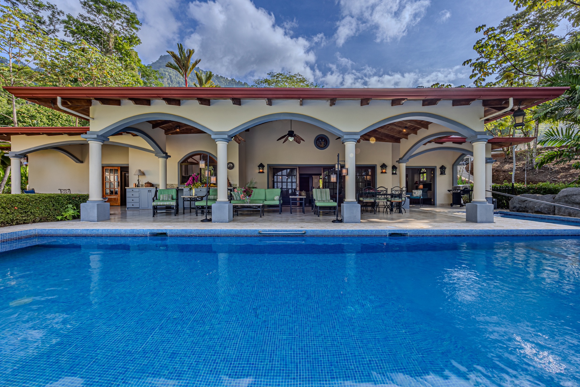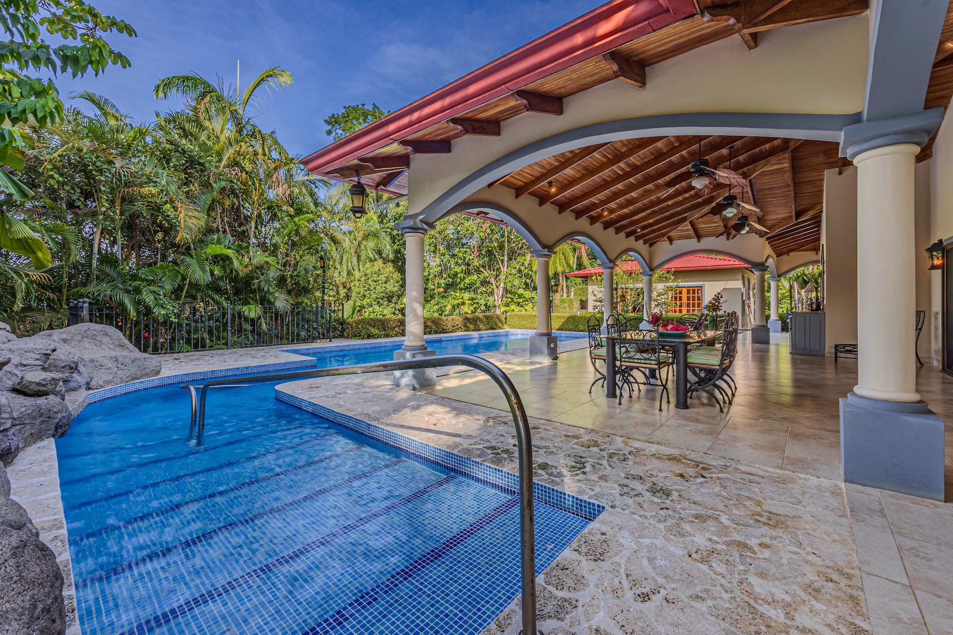 Your guests will be welcomed with the very large covered seating and dining area outside. After all, Costa Rica is about enjoying nature and everything that surrounds you. The sounds of the river that line the property are a perfect backdrop for peaceful serenity. The half bath off the handicapped equipped lap pool is fantastic use of space as is the expansive outdoor kitchen. Everything is there for your enjoyment.