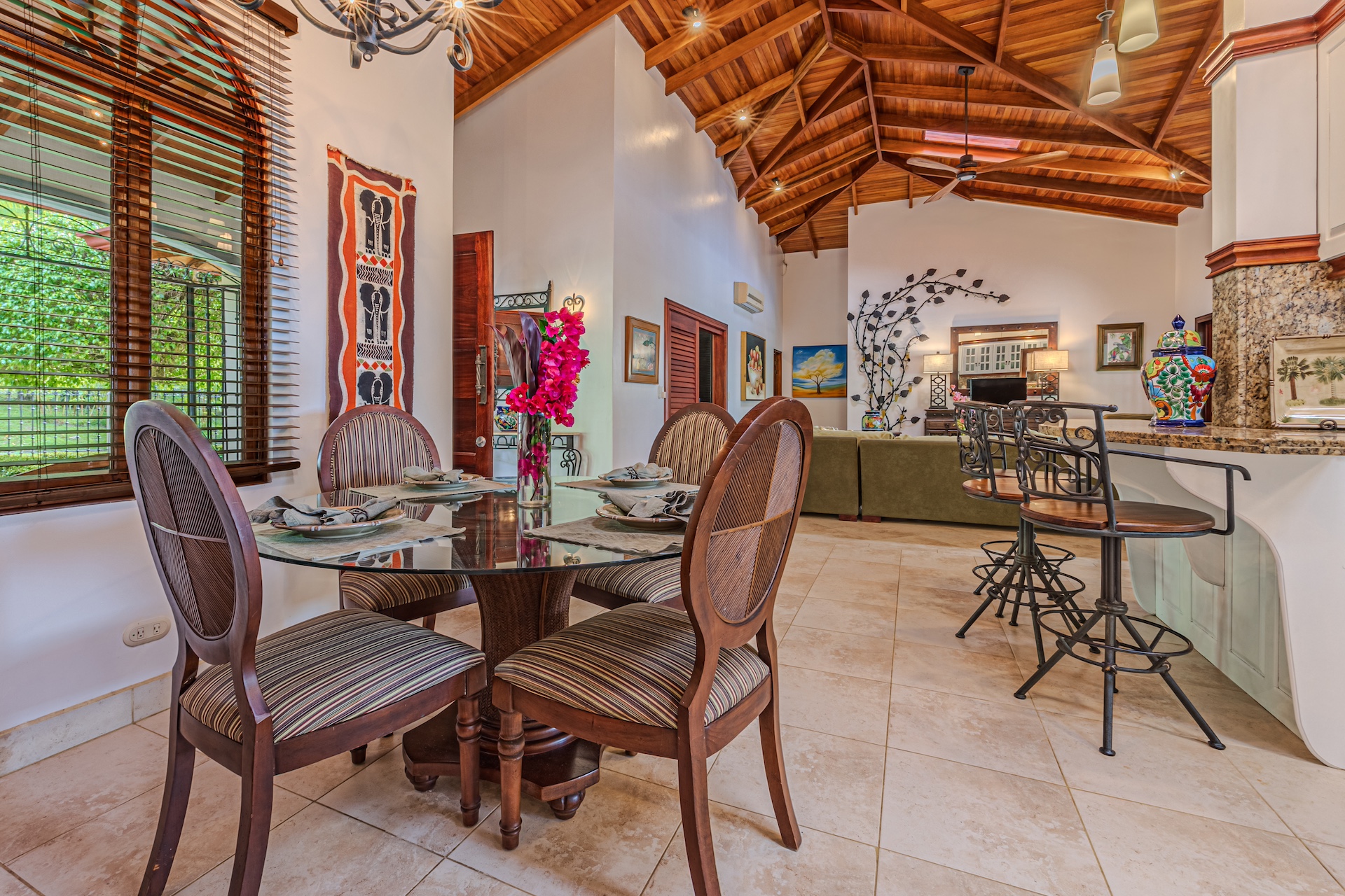The main home boats high ceilings donning local woods. A large open concept living area with bar is perfect for those that like to entertain. A chefs kitchen with granite countertops and plenty of cupboard space is perfectly situated to overlook the spacious yard as you prepare your favourite local fare. Another small dining area is just off the kitchen and, for those that love areas to “get away” step into the reading nook and enjoy the breeze and the mountains as you settle in.