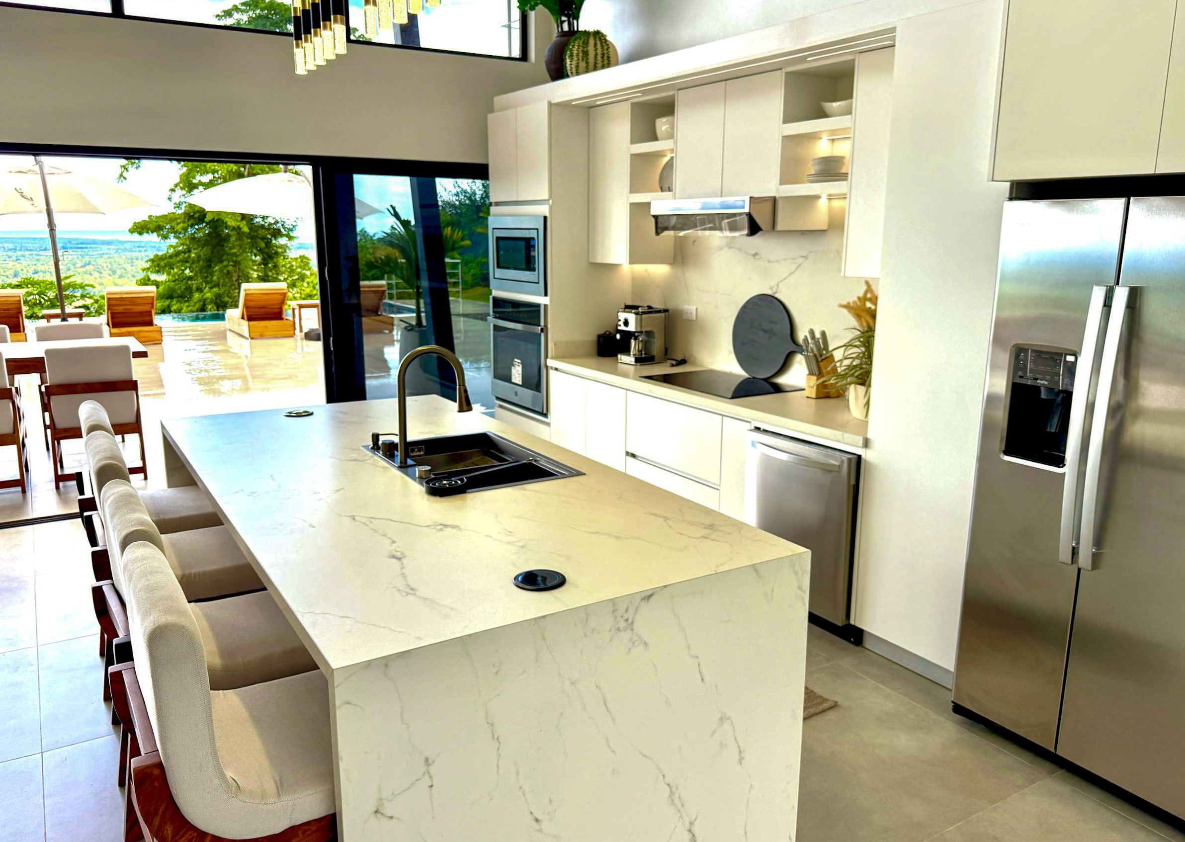The air-conditioned great room, with its lofty ceilings and modern aesthetic, seamlessly connects to the outdoor living space through a wall of oversized glass sliding doors, creating an ideal environment for entertaining and taking advantage of the indoor/outdoor living we prize so much here. The new, modern kitchen is a chef’s delight, boasting extensive cabinetry, ample marble countertops, and upgraded appliances, including a sleek electric cooktop, separate oven, and dishwasher. A thoughtful built-in power center at the adjacent breakfast bar ensures all your modern gadgets stay charged. Relax and enjoy incredible ocean views from the airy living room, complete with a big-screen TV and a comfortable family-friendly couch.