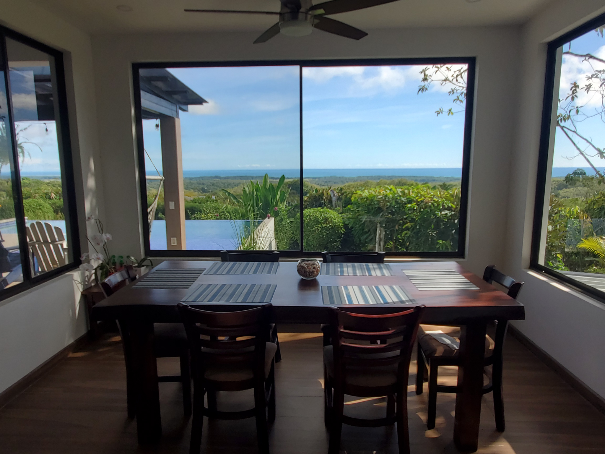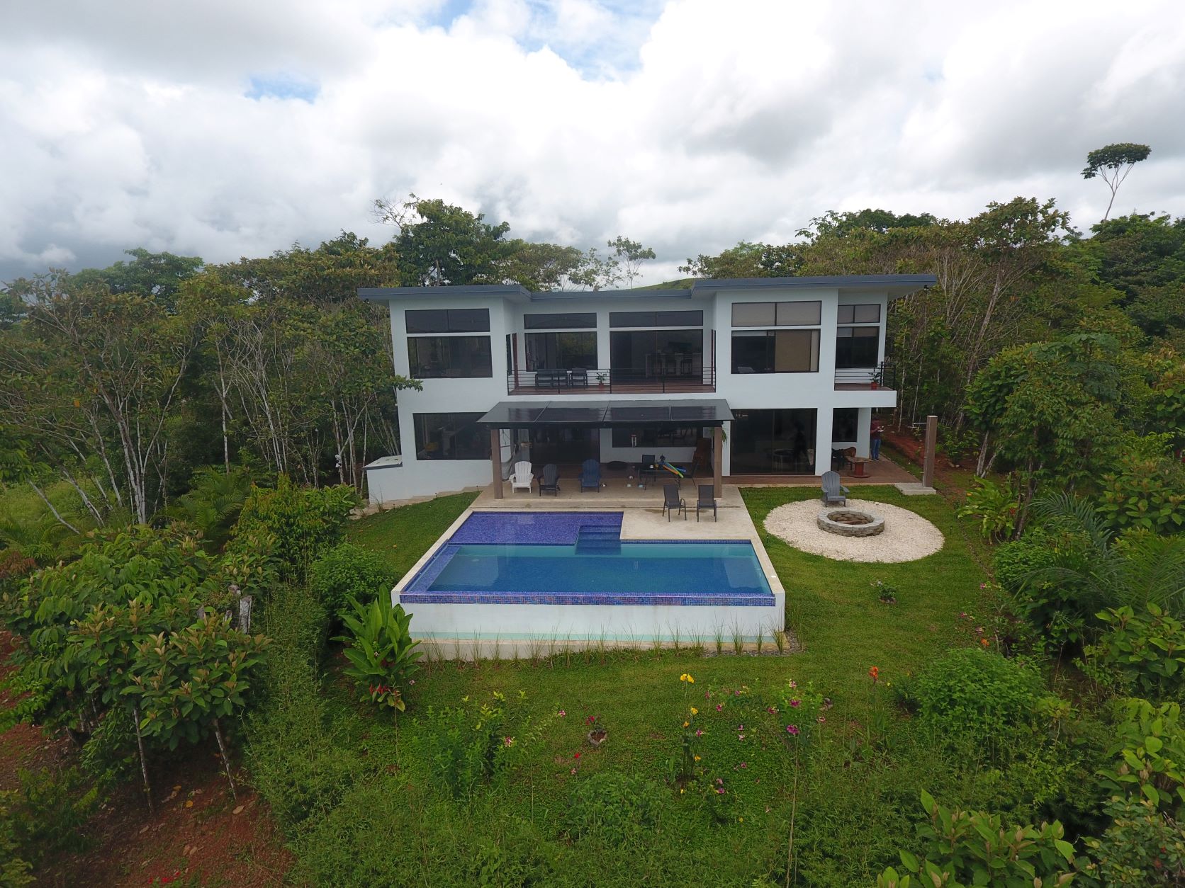 This stunning brand new modern home features breathtaking 180 degree ocean views from every room! Overlooking the magnificent Central Pacific coast in Costa Rica, this beautiful home features three master bedroom suites, each with huge walk in closet and beautiful en suite bathroom. It also has two additional half bathrooms, a large entertainment wet bar, laundry room, 2 car carport, infinity edge pool, fire pit, electronic gate, open concept kitchen with quartz countertops and separate guest house for guests or caretaker.