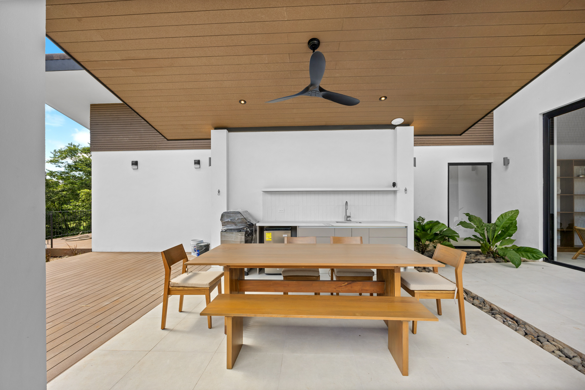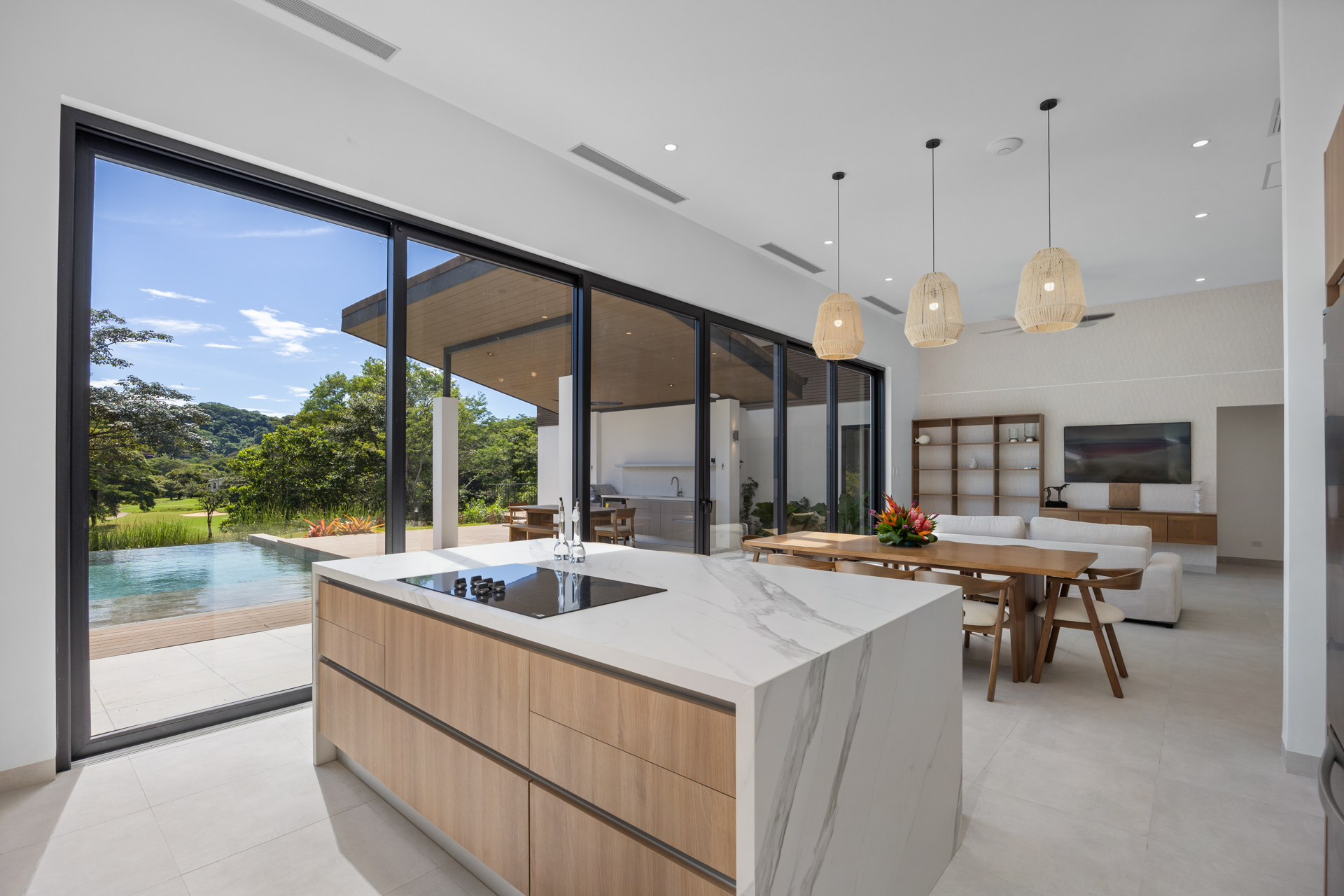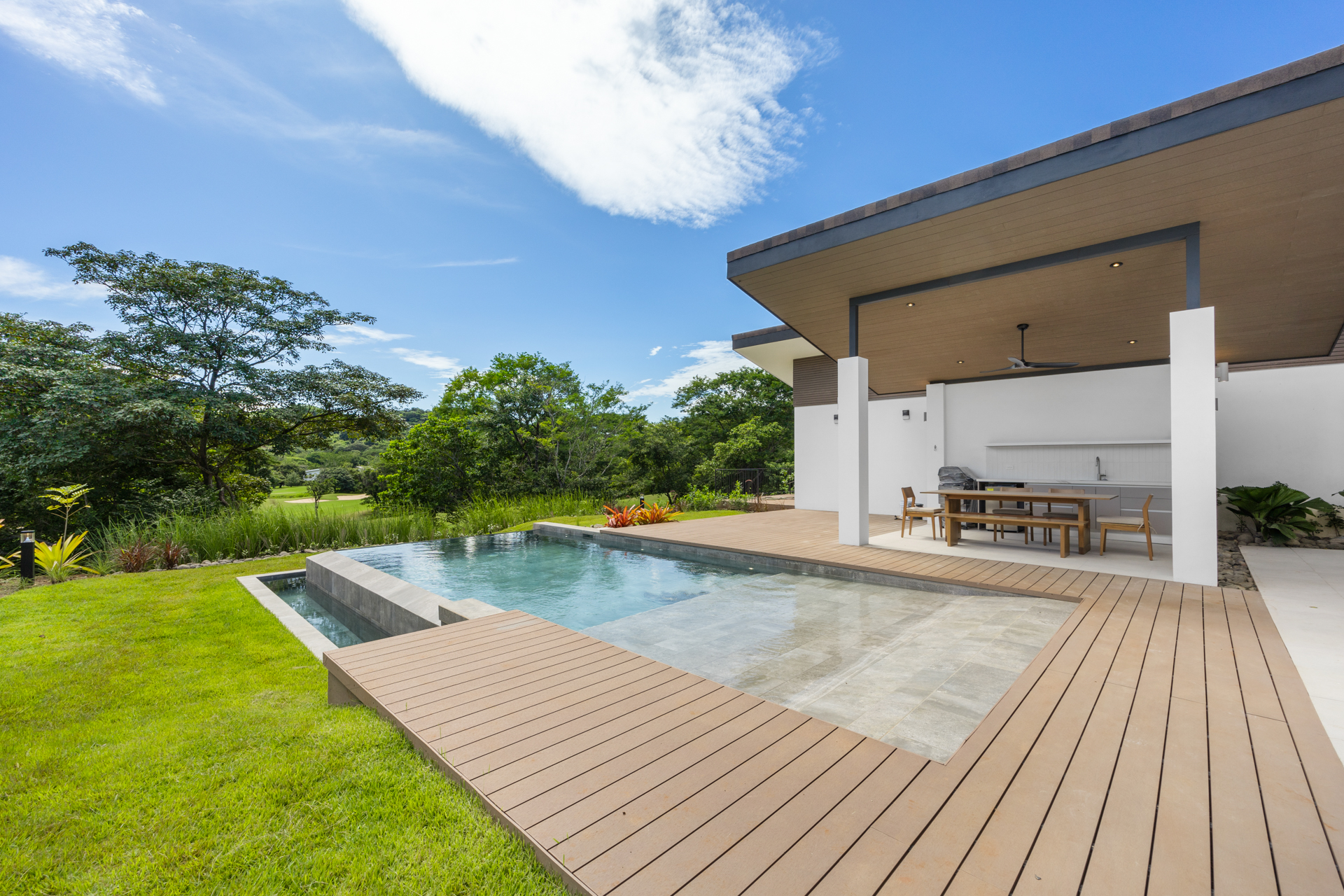 The home's outdoor area is designed for ultimate relaxation, with a stunning infinity pool that overlooks the golf course, a large covered kitchen, BBQ and dining area for outdoor dining, and a modern kitchen with granite countertops and wood cabinetry. It's only a 5-minute walk from the Beach Club and the famous white sands of Playa Conchal beach, making it the perfect place for beach lovers.