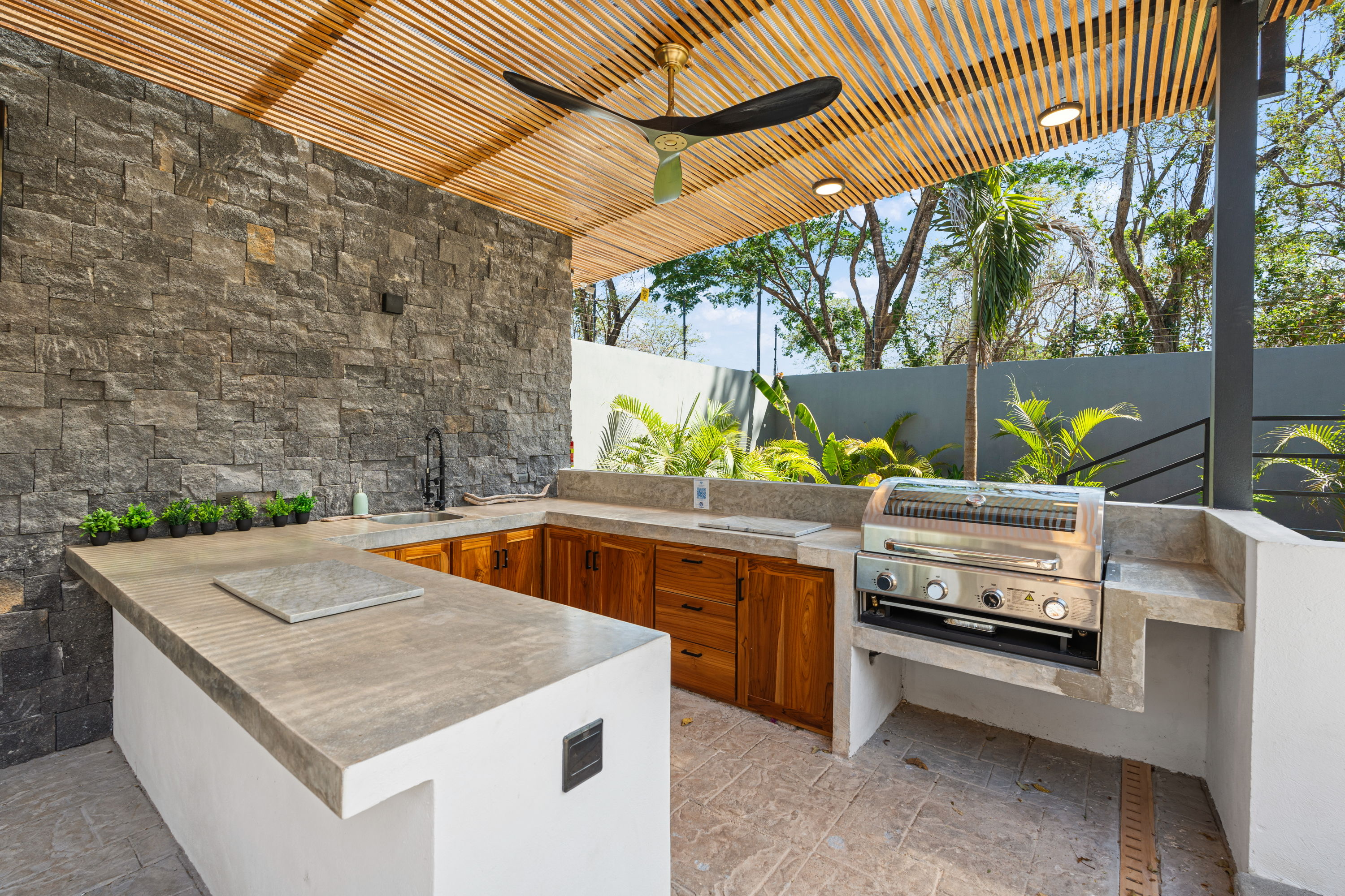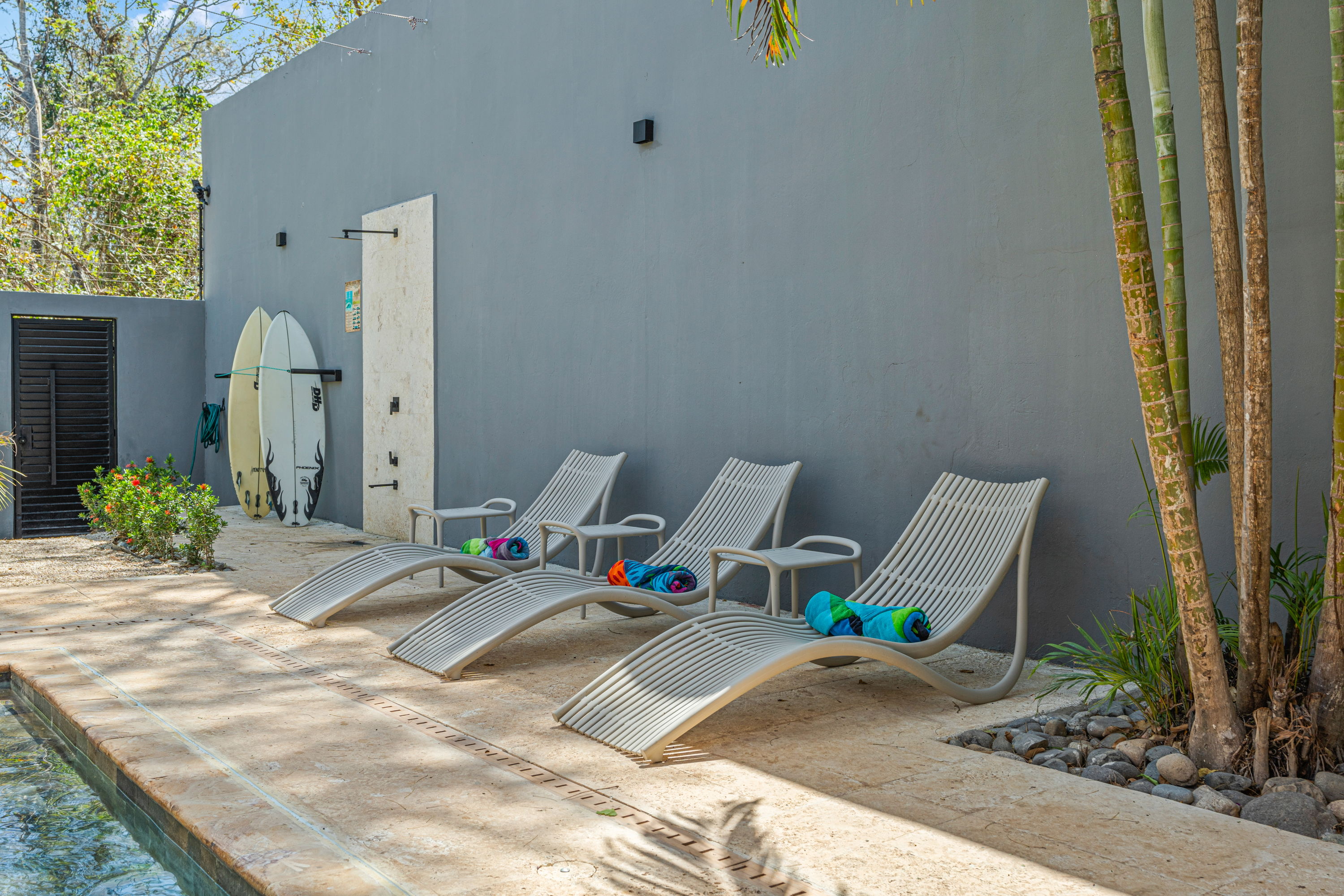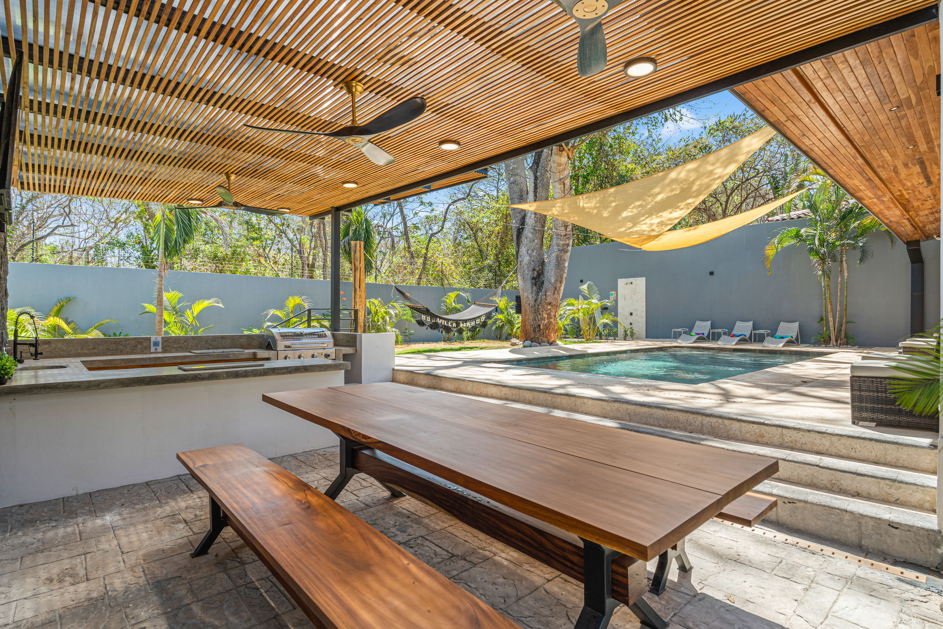 The outdoor living area is the true centerpiece of the home, featuring a large private swimming pool with both shallow and deep sections, an outdoor BBQ and yoga area, a pergola with seating, two outdoor showers, and a lush tropical garden. Abundant natural light and airflow enhance the connection between indoor spaces and the outdoors, creating a relaxed and inviting atmosphere.