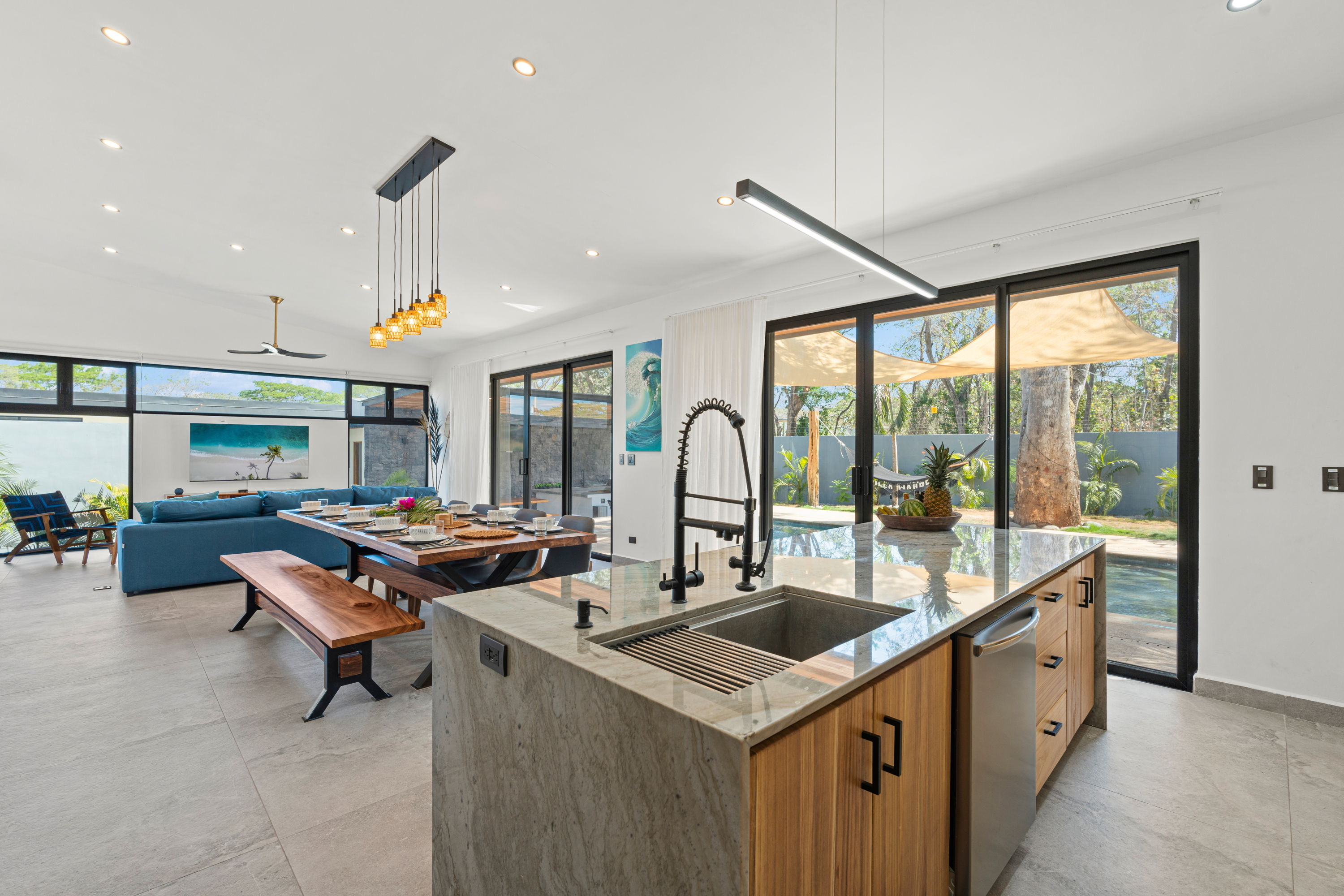 The villa offers four bedrooms and four bathrooms, including three spacious master suites with king beds, walk-in closets, private bathrooms, and work desks. A fourth bedroom with two bunk beds (four single beds) is perfect for families or groups, allowing the home to comfortably accommodate 10+ guests.