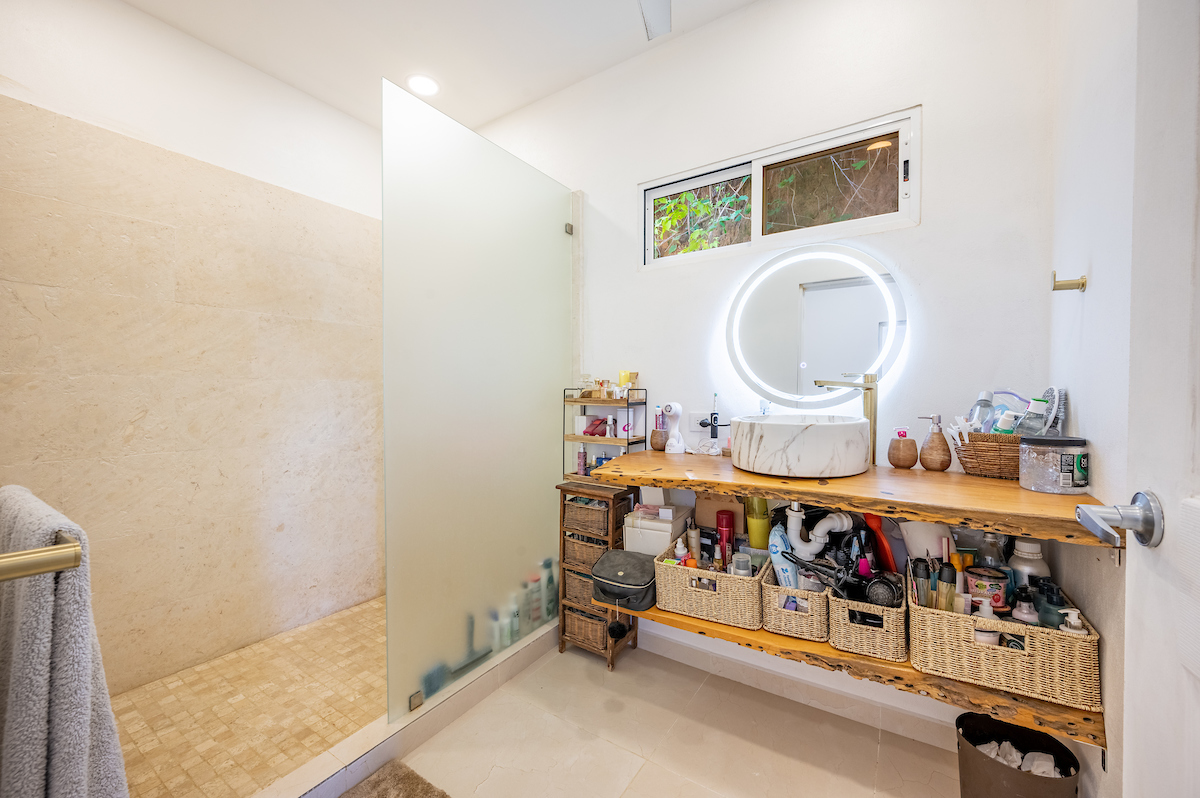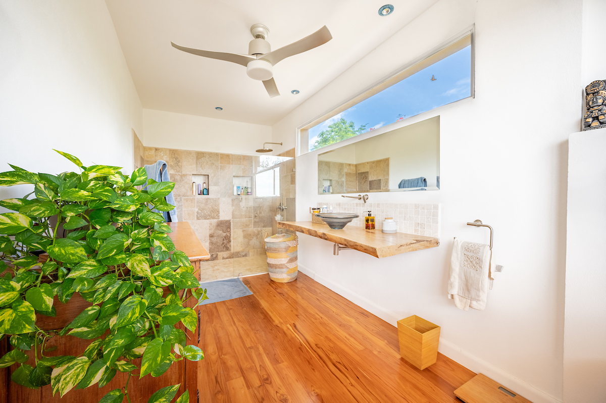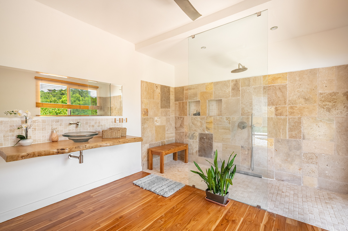 Spa-inspired bathrooms with travertine marble showers and mango wood countertops