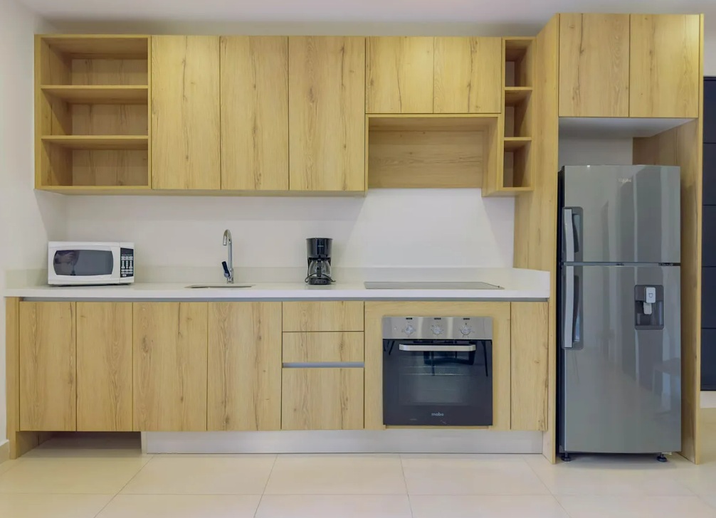 Second Floor – 1 Bedroom, 1 Bathroom: This level has a separate entrance and features a cozy living and kitchen area fully equipped with modern appliances, quartz countertops, and MDF cabinets. Large windows allow natural light, and a small balcony provides a private outdoor retreat.