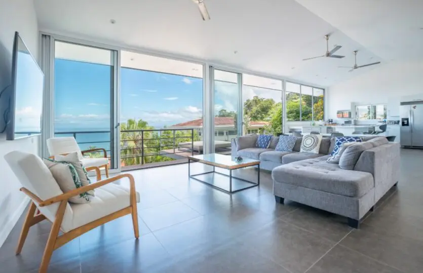 Spread across two spacious floors and 200m2, this contemporary gem features high ceilings and an open floor plan bathed in natural light, thanks to its floor-to-ceiling windows. The stylish kitchen flows seamlessly into the living and dining areas, making it perfect for entertaining. Two master suites with private bathrooms, along with two additional bedrooms sharing a bath, provide ample space for family and guests. Nearly every room offers breathtaking ocean vistas. The property is sold fully furnished, including all appliances, ensuring a move-in-ready experience.