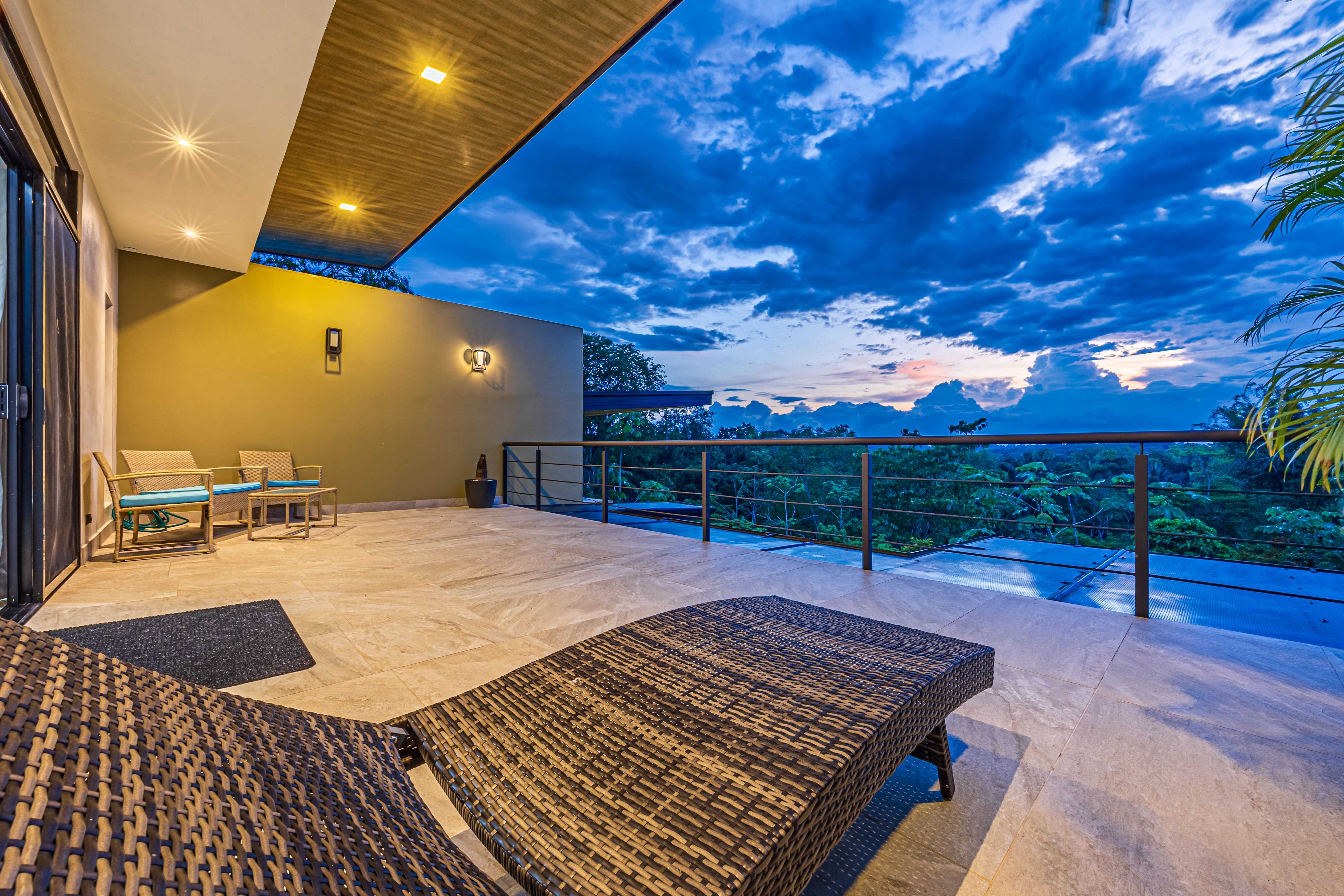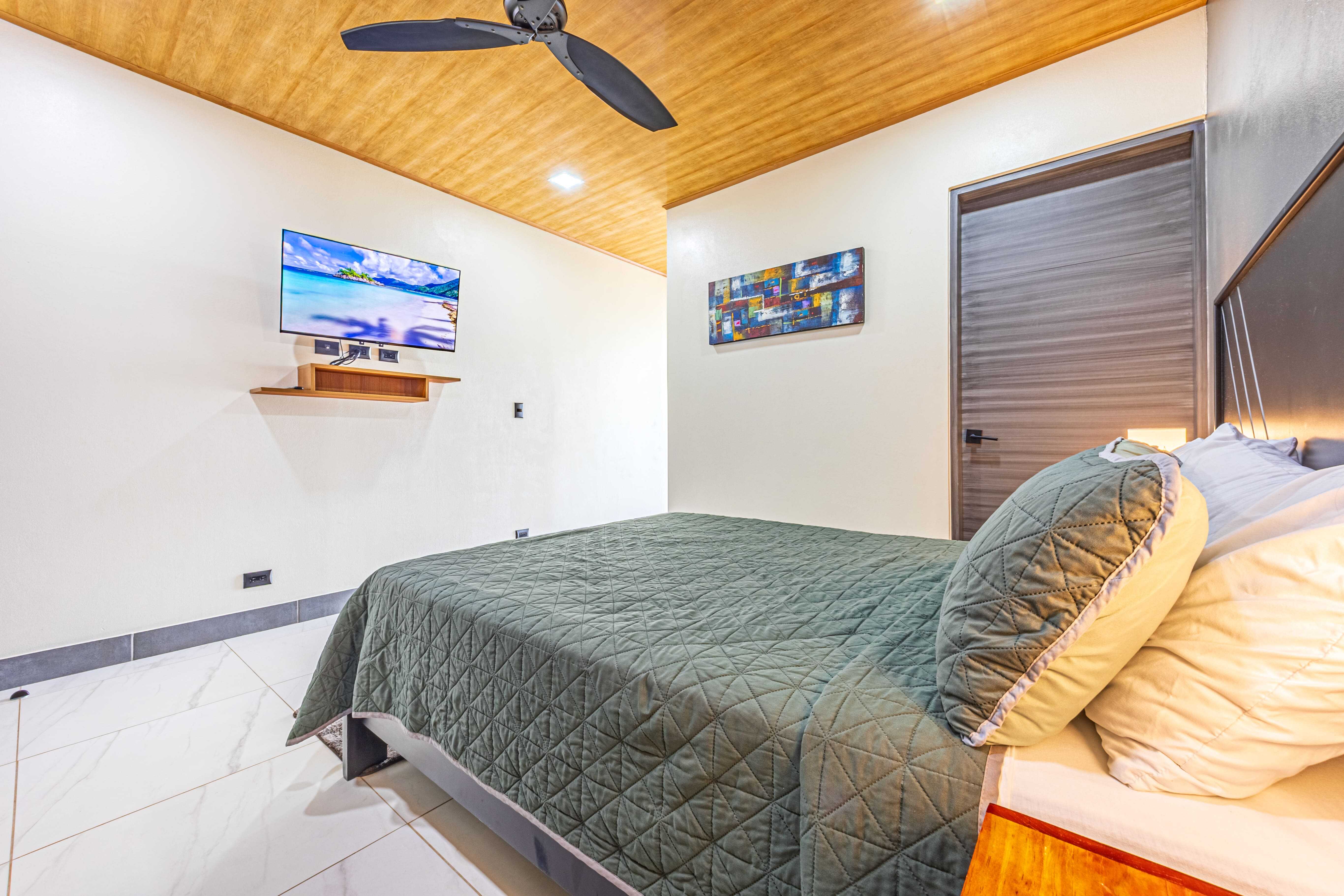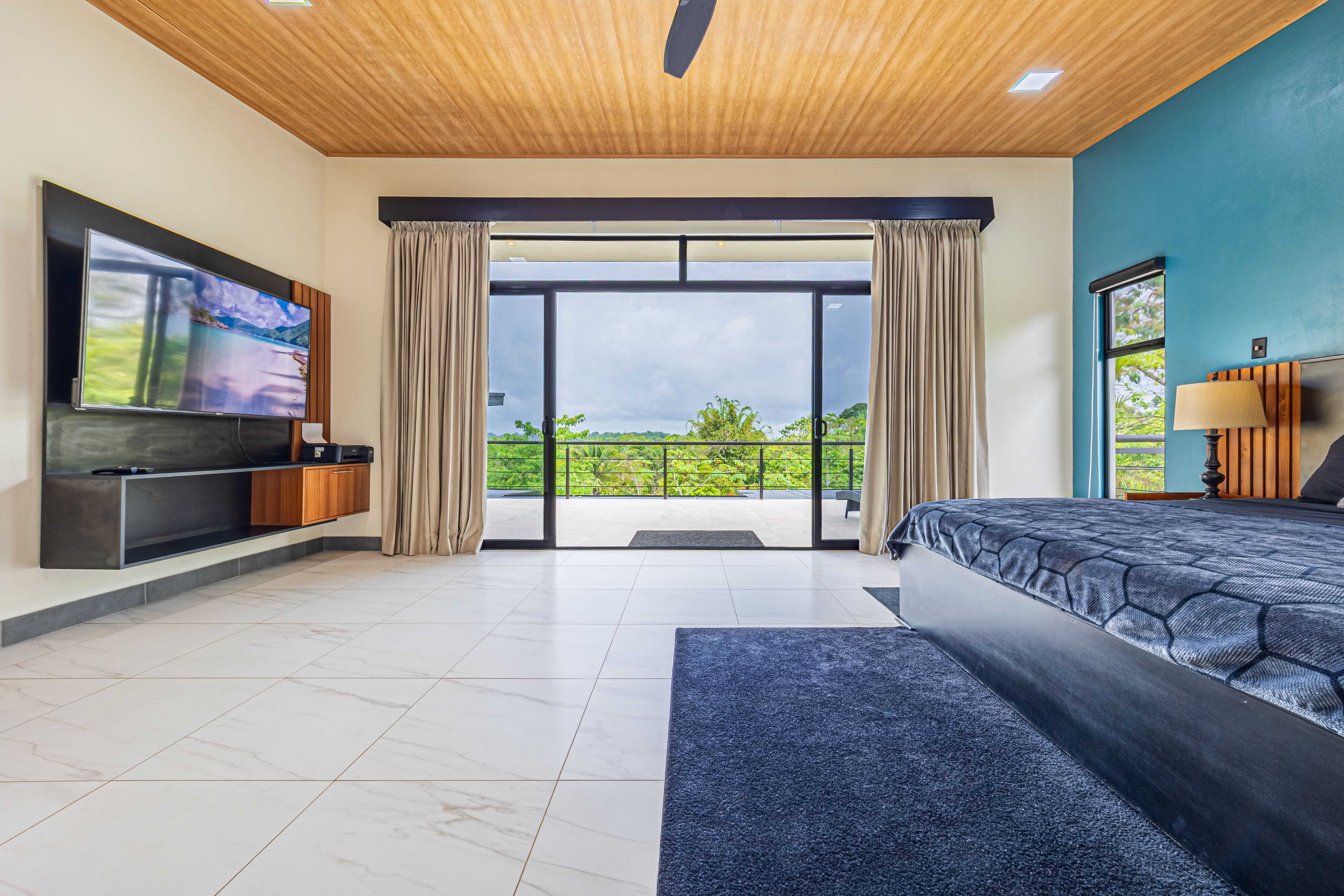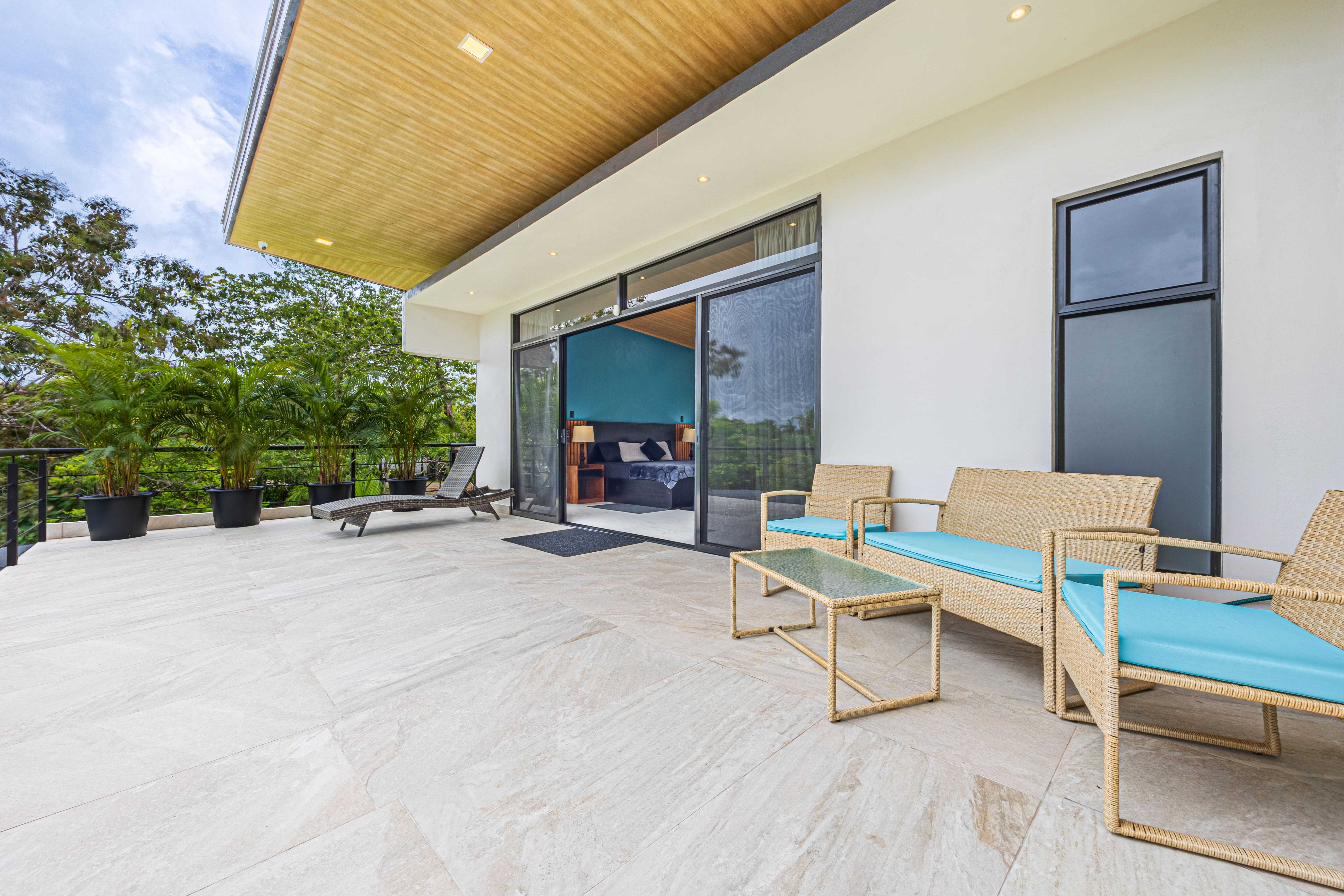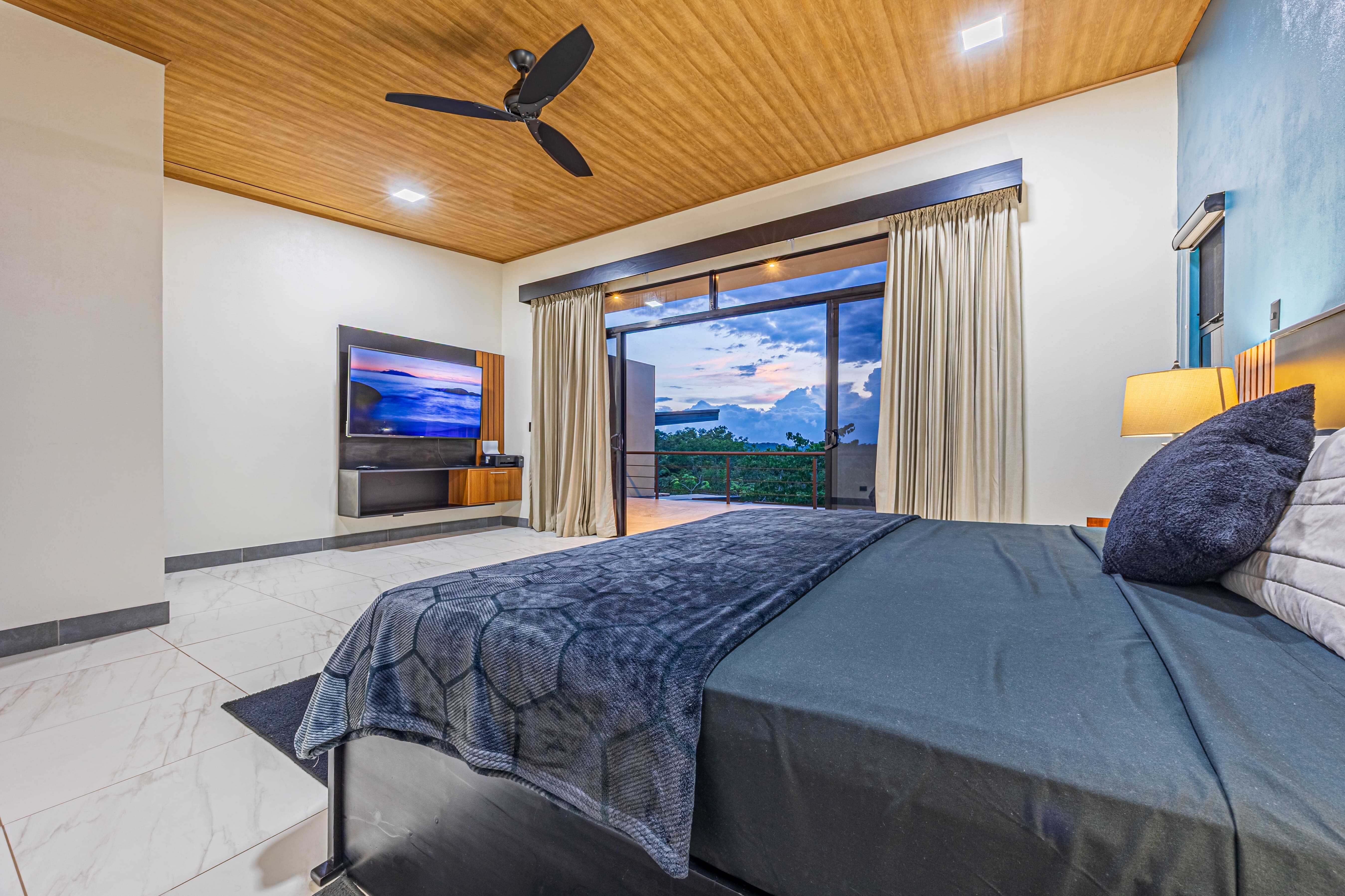 The upstairs Master Suite features a private bathroom, walk-in closet, and a large terrace overlooking the mountains and evening sunsets. The two additional bedrooms on the lower level each include their own bathroom, air conditioning, and access to the poolside terrace with a lush jungle backdrop and relaxing bird sounds—an unforgettable guest experience.