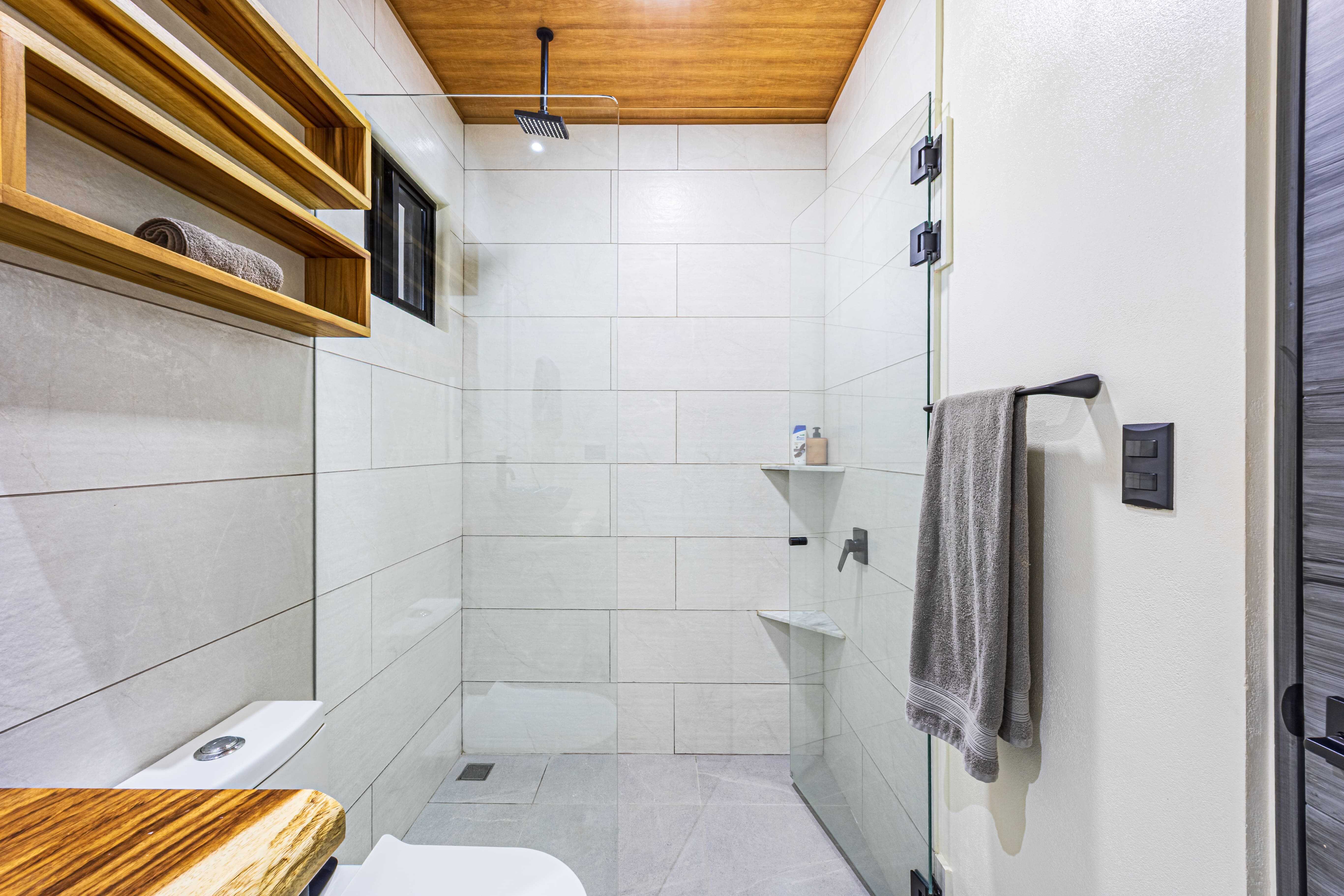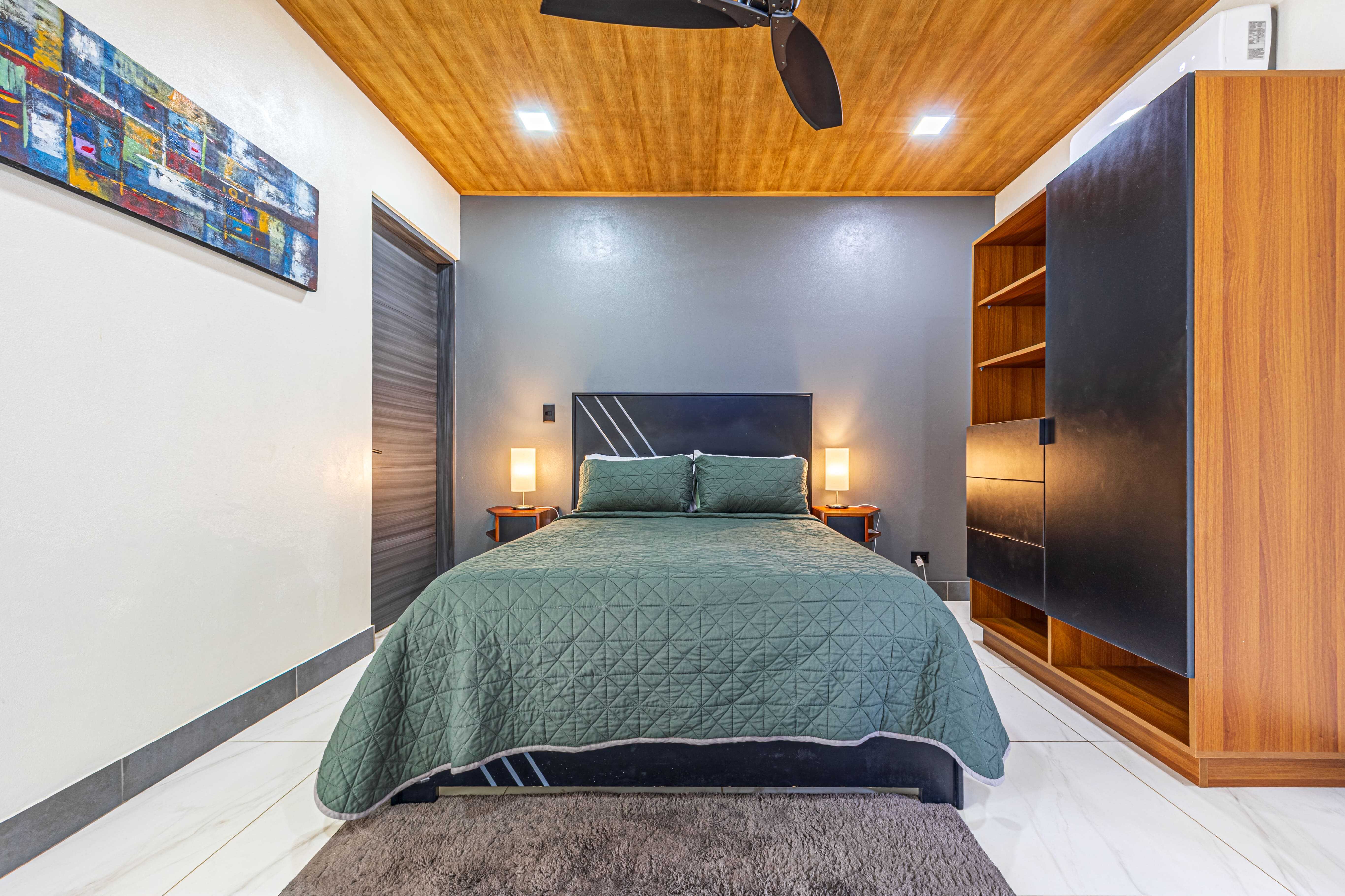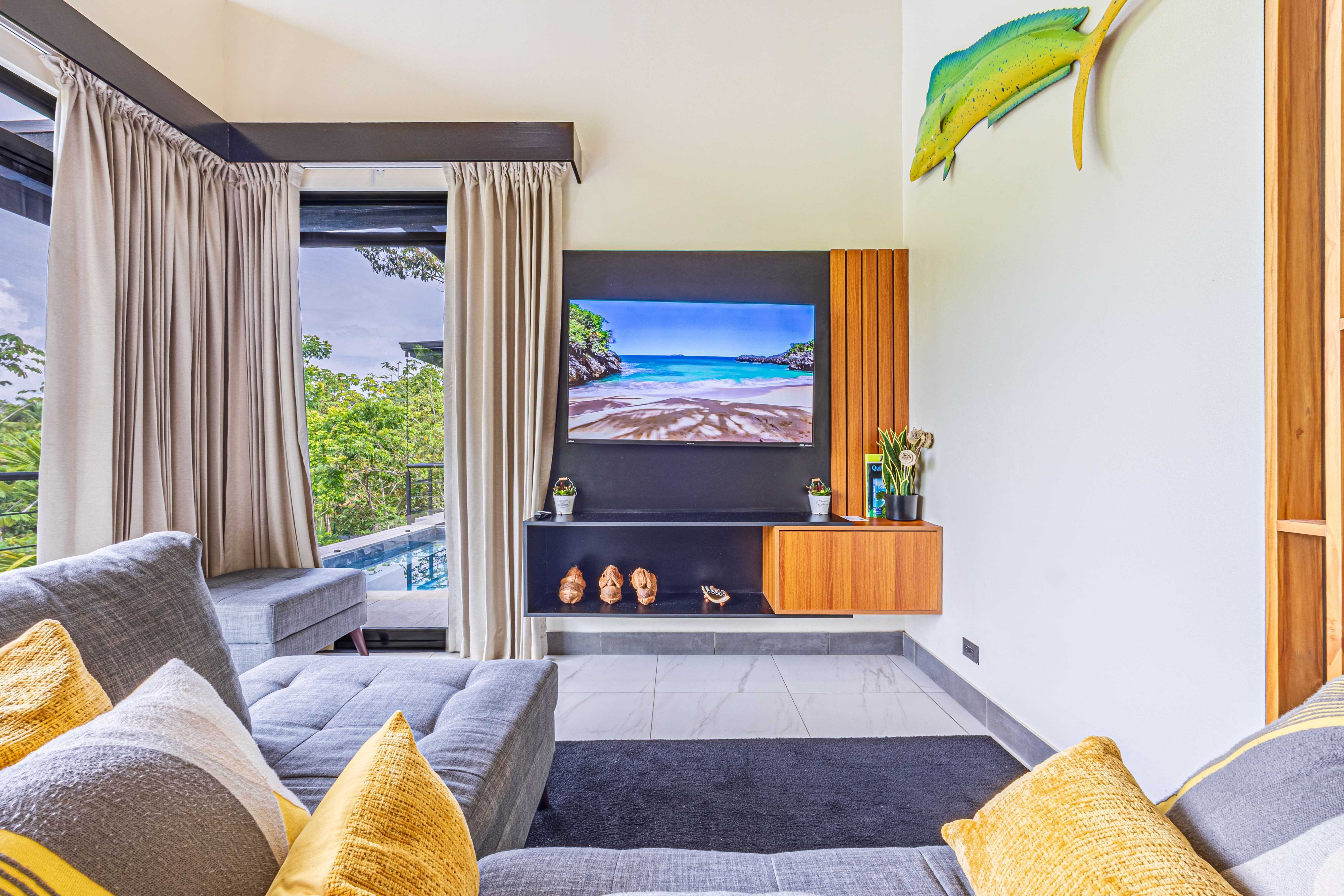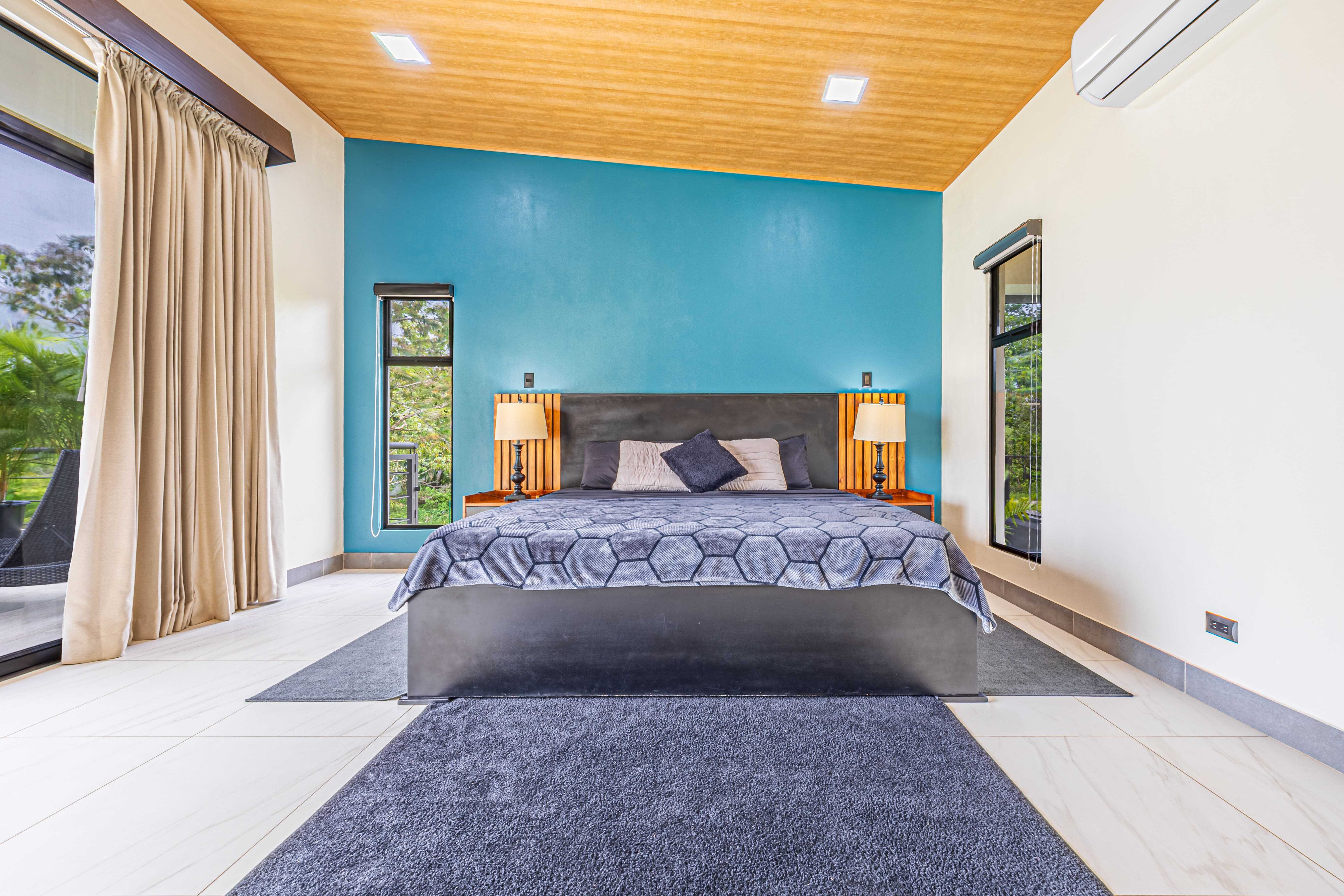 The upstairs Master Suite features a private bathroom, walk-in closet, and a large terrace overlooking the mountains and evening sunsets. The two additional bedrooms on the lower level each include their own bathroom, air conditioning, and access to the poolside terrace with a lush jungle backdrop and relaxing bird sounds—an unforgettable guest experience.