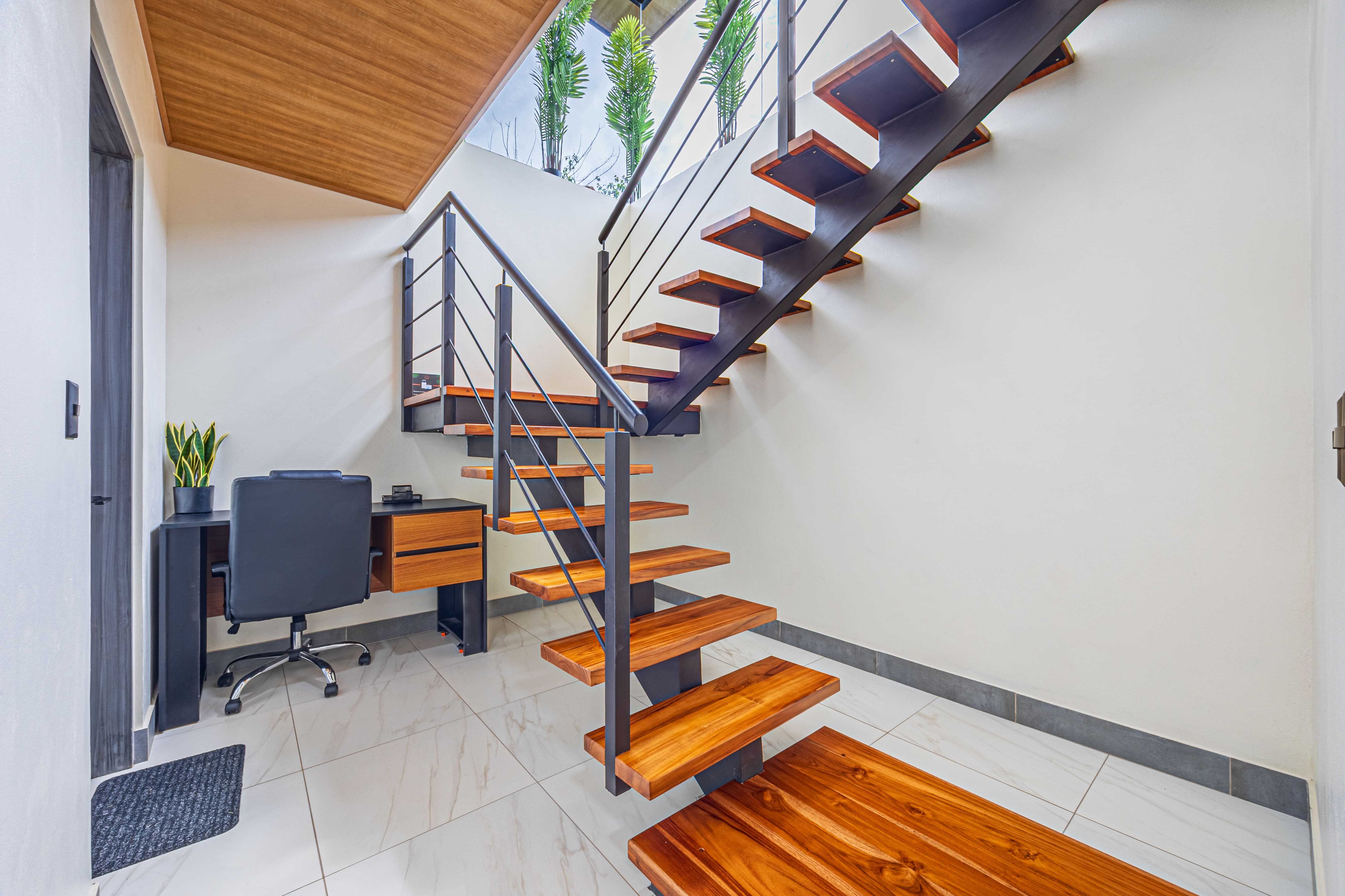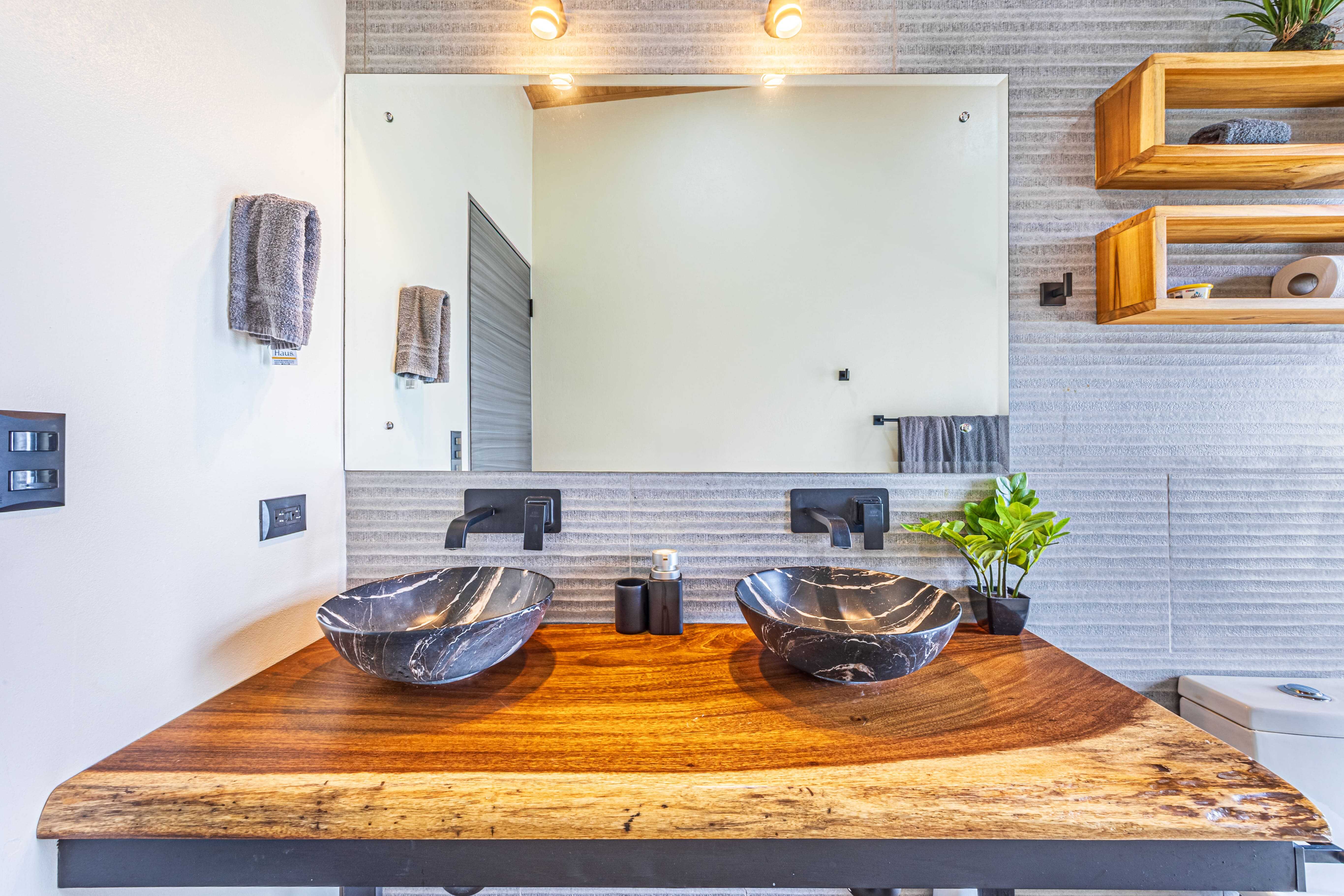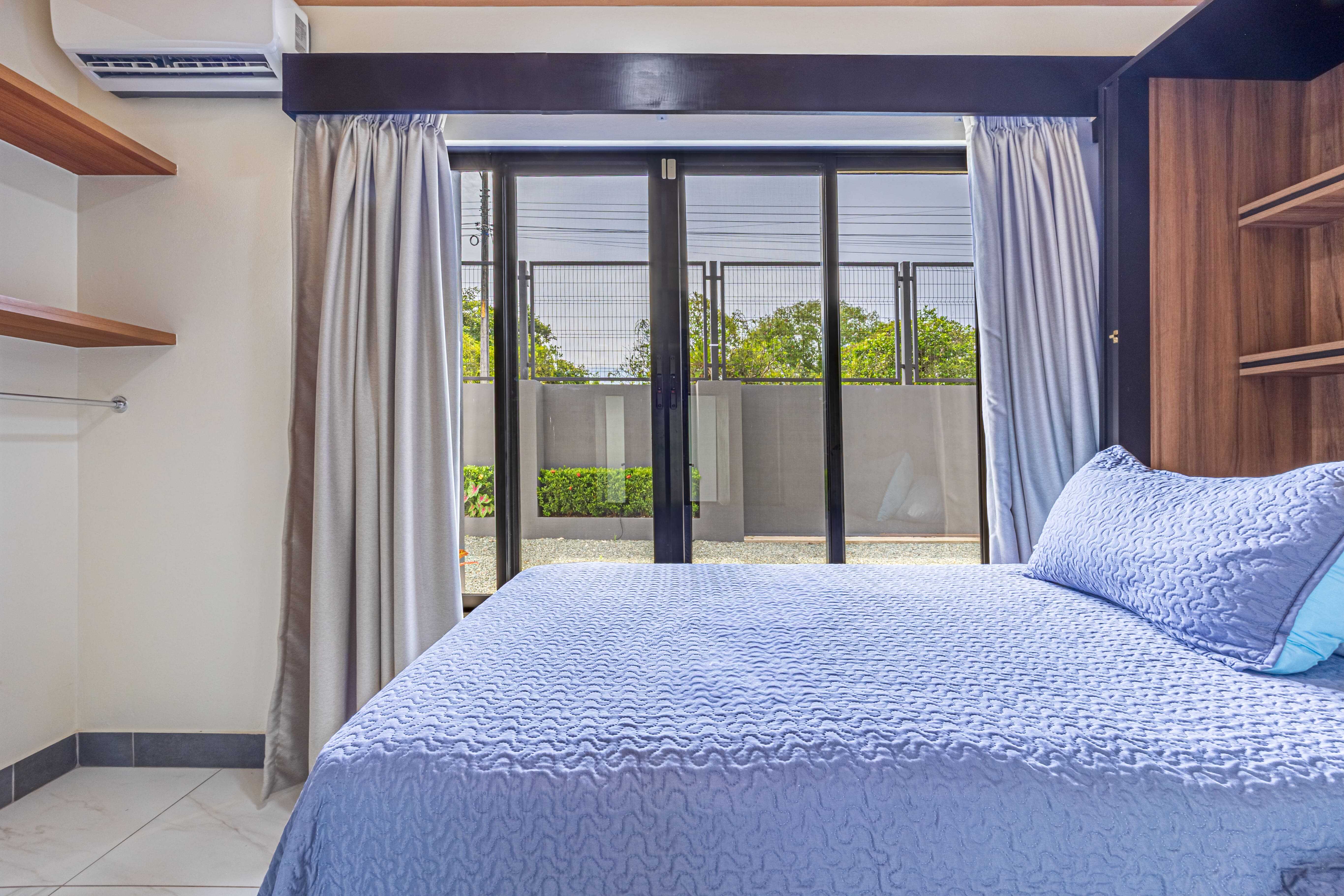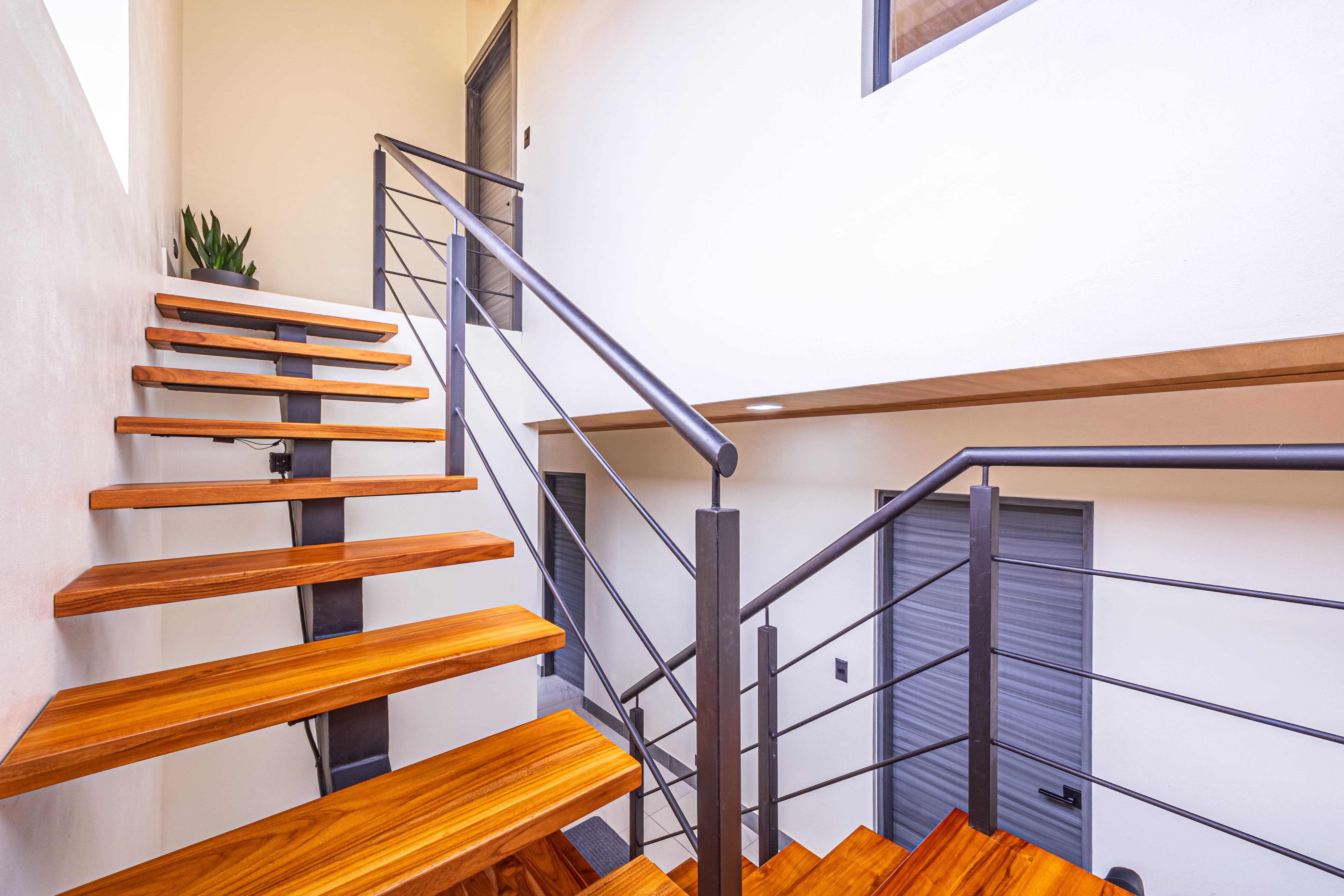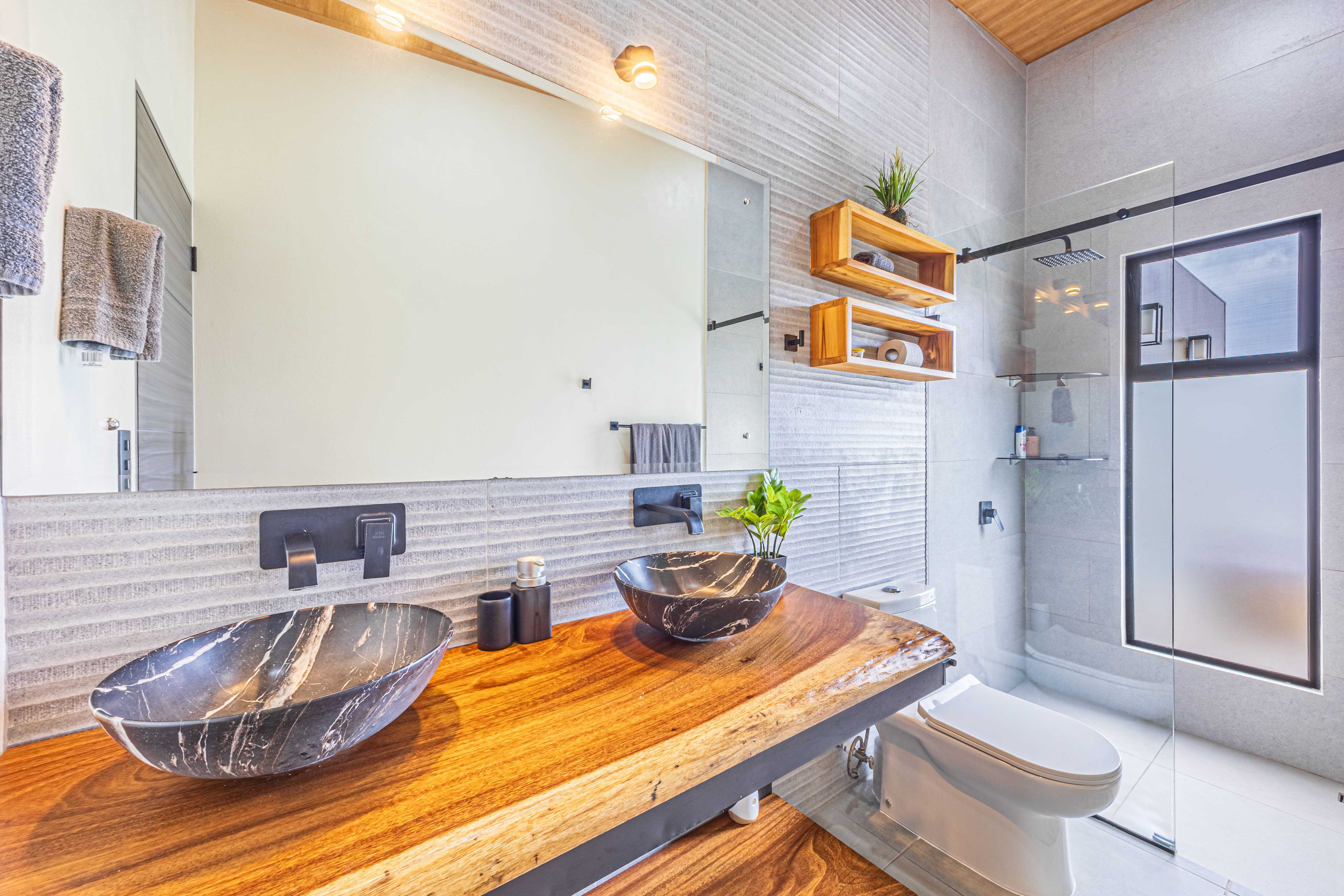 The upstairs Master Suite features a private bathroom, walk-in closet, and a large terrace overlooking the mountains and evening sunsets. The two additional bedrooms on the lower level each include their own bathroom, air conditioning, and access to the poolside terrace with a lush jungle backdrop and relaxing bird sounds—an unforgettable guest experience.