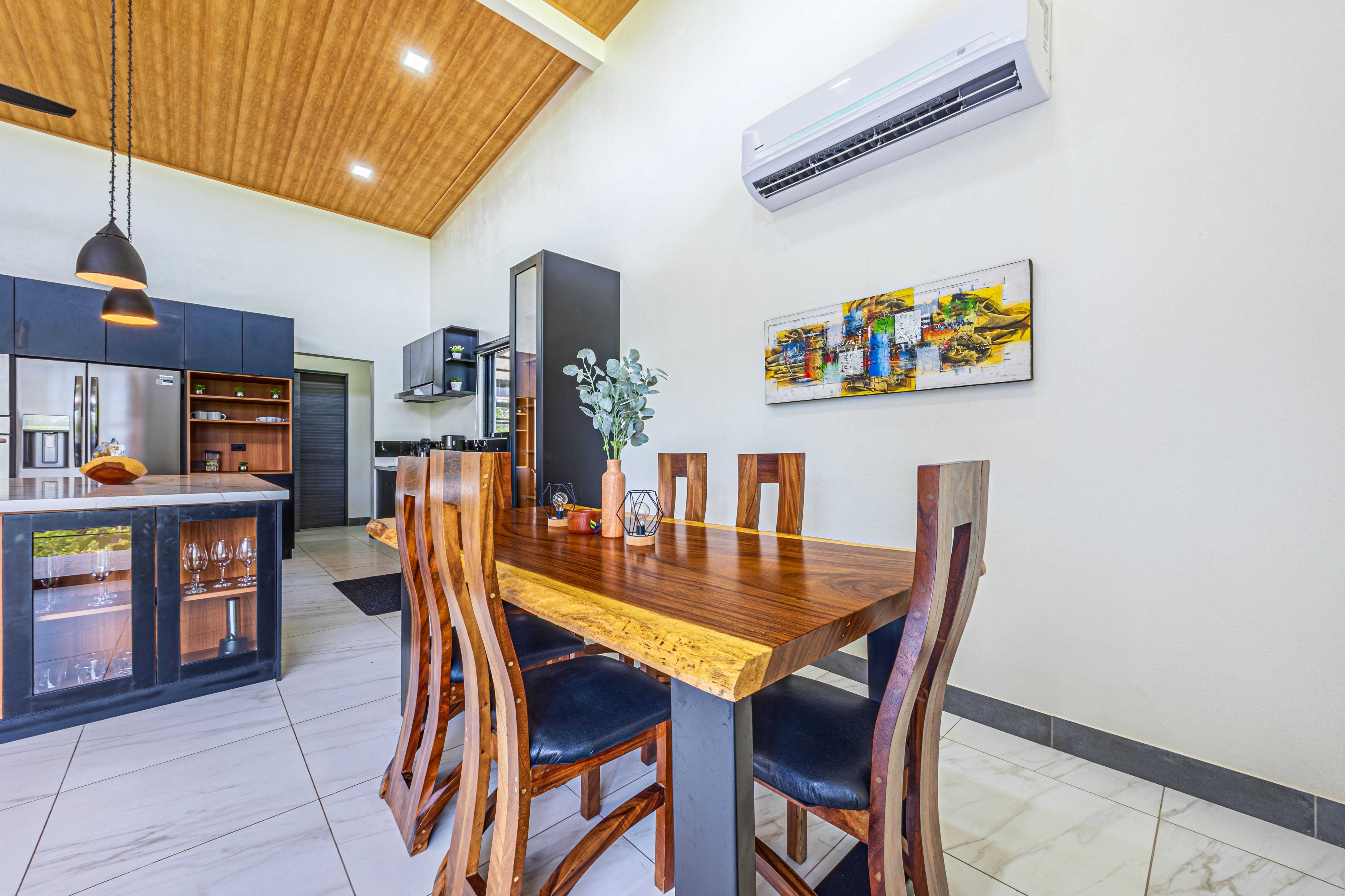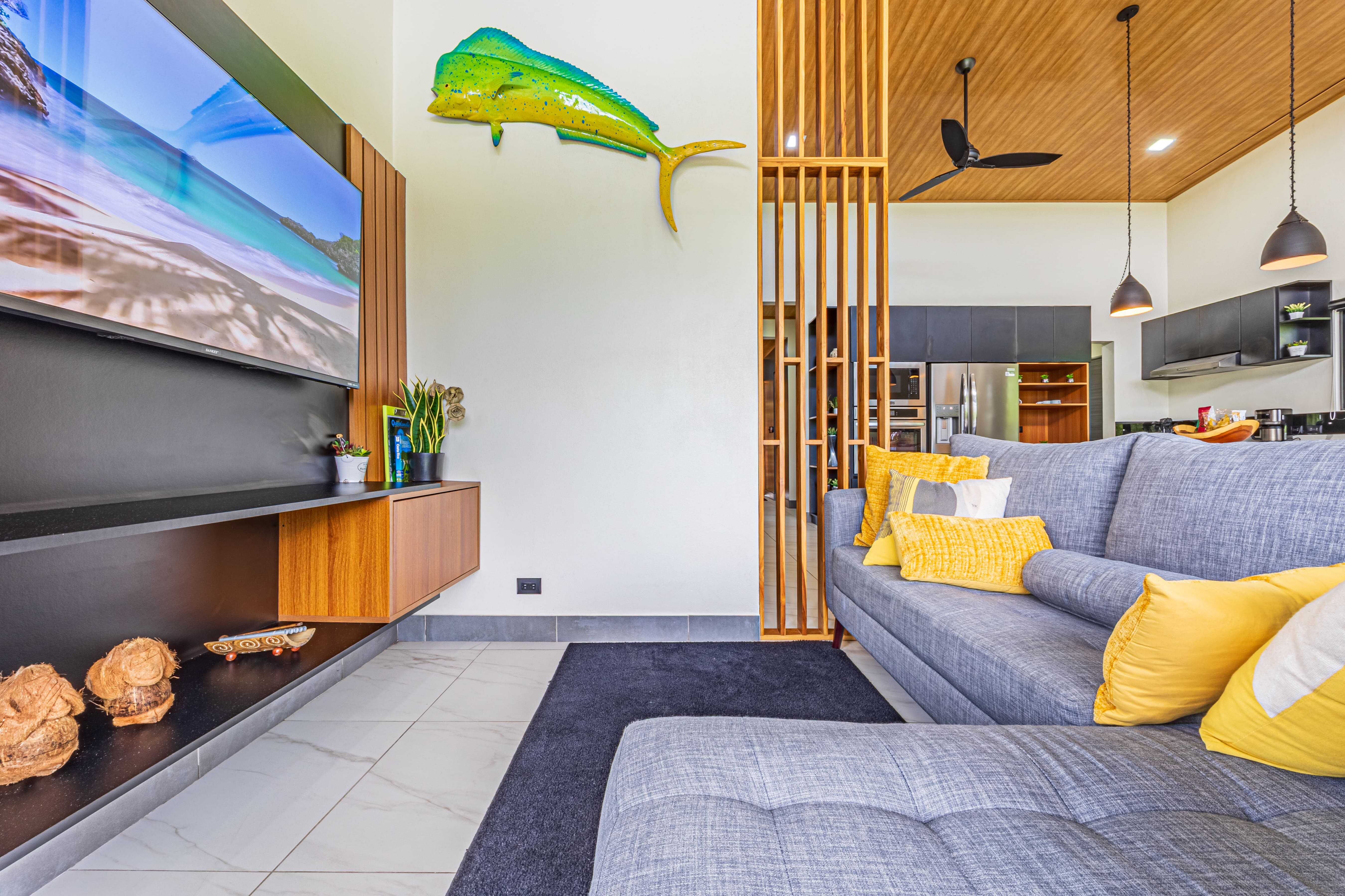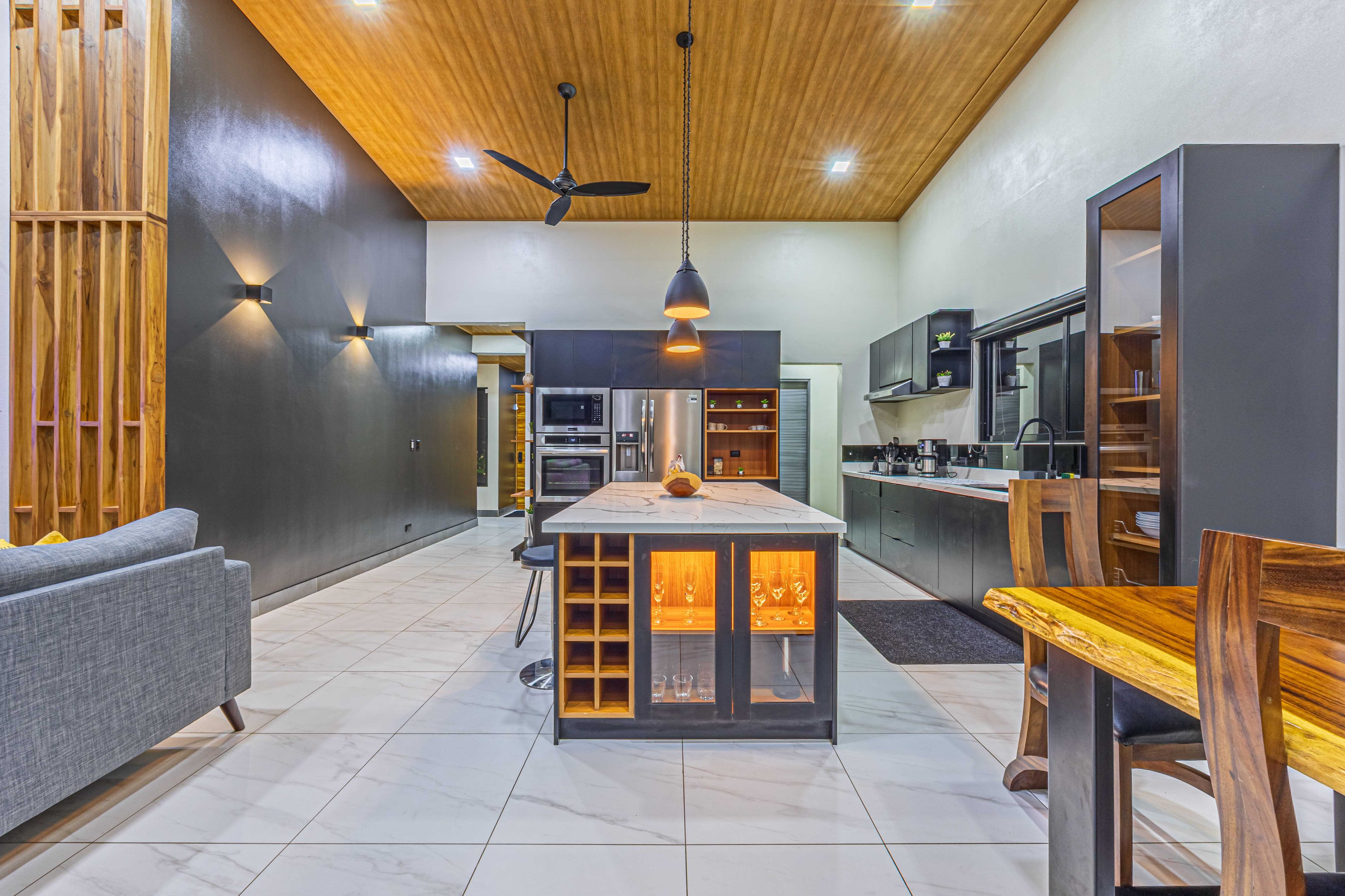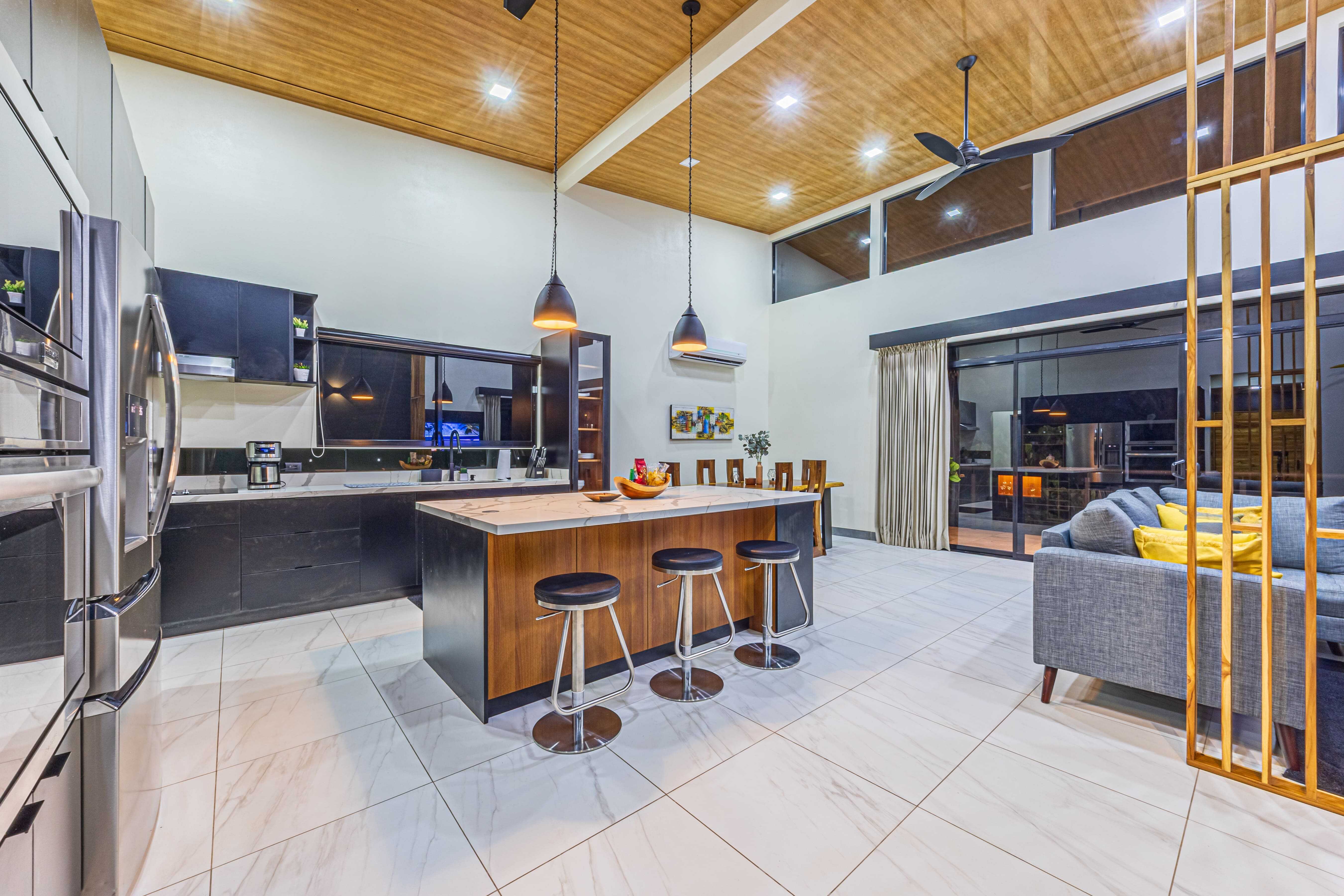 Inside, you’ll find an open-concept layout with soaring wood-accented ceilings, a spacious living and dining area, and a fully equipped kitchen with custom cabinetry, a large island, stainless steel appliances, and quartz countertops—perfect for hosting family or guests.