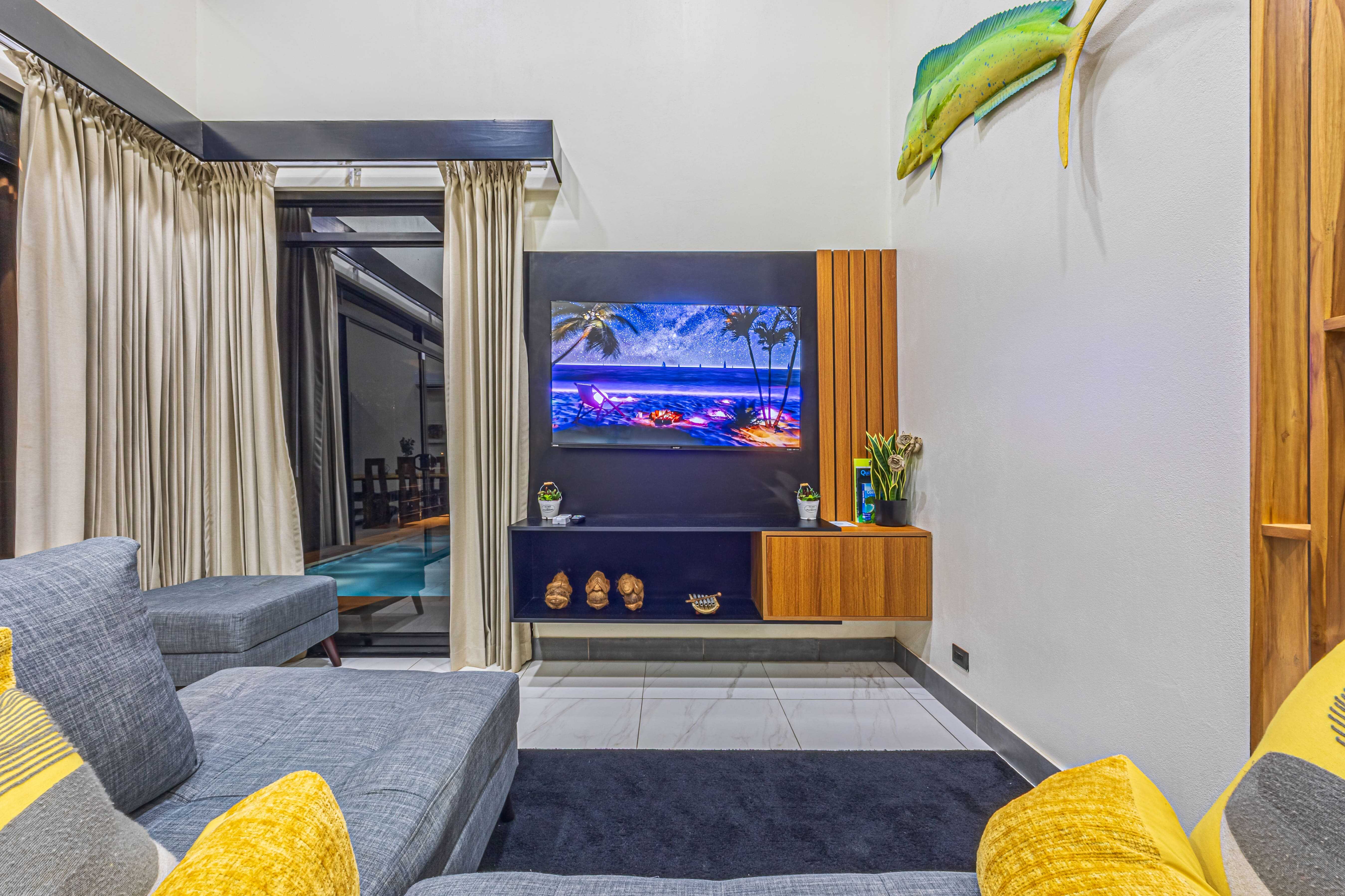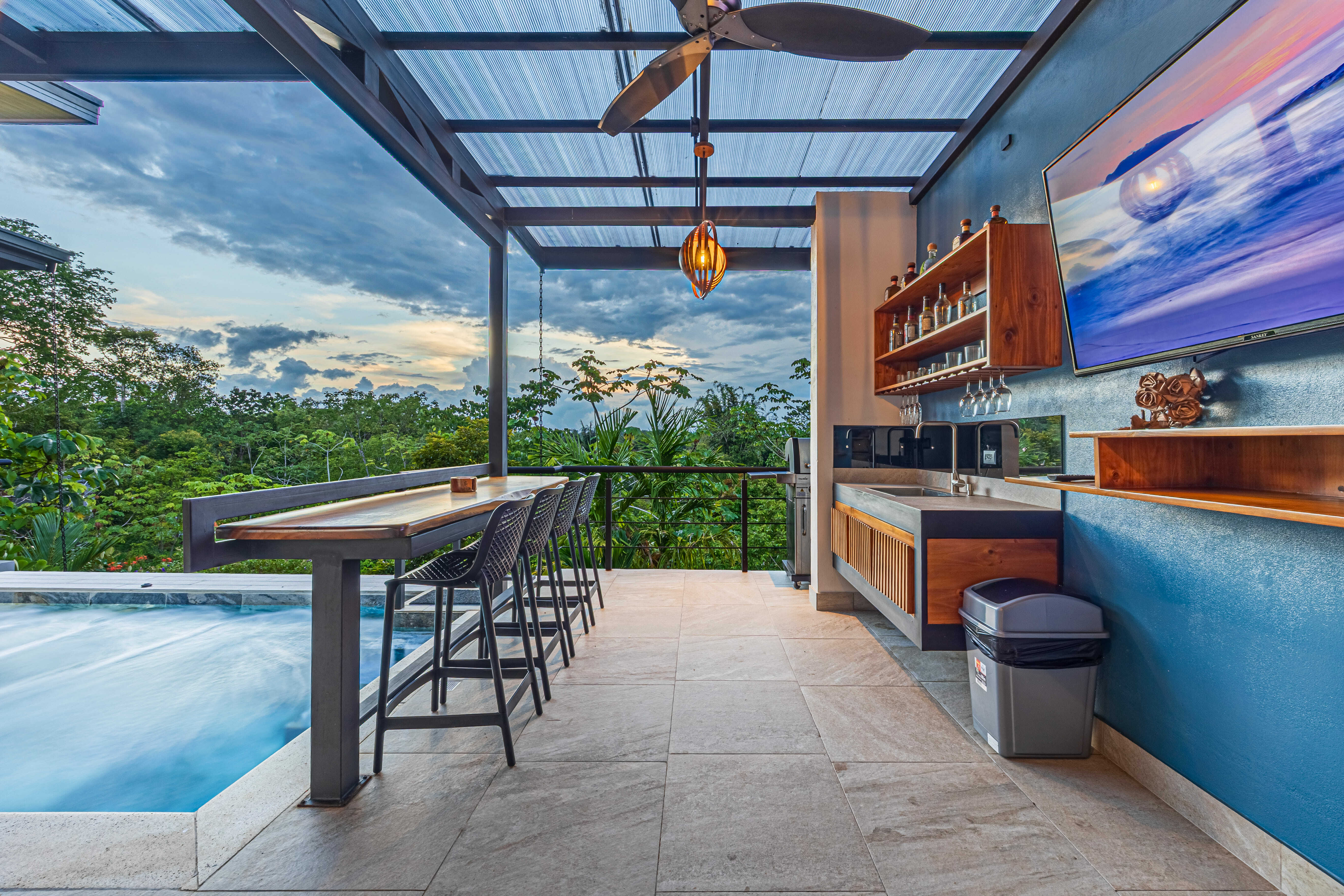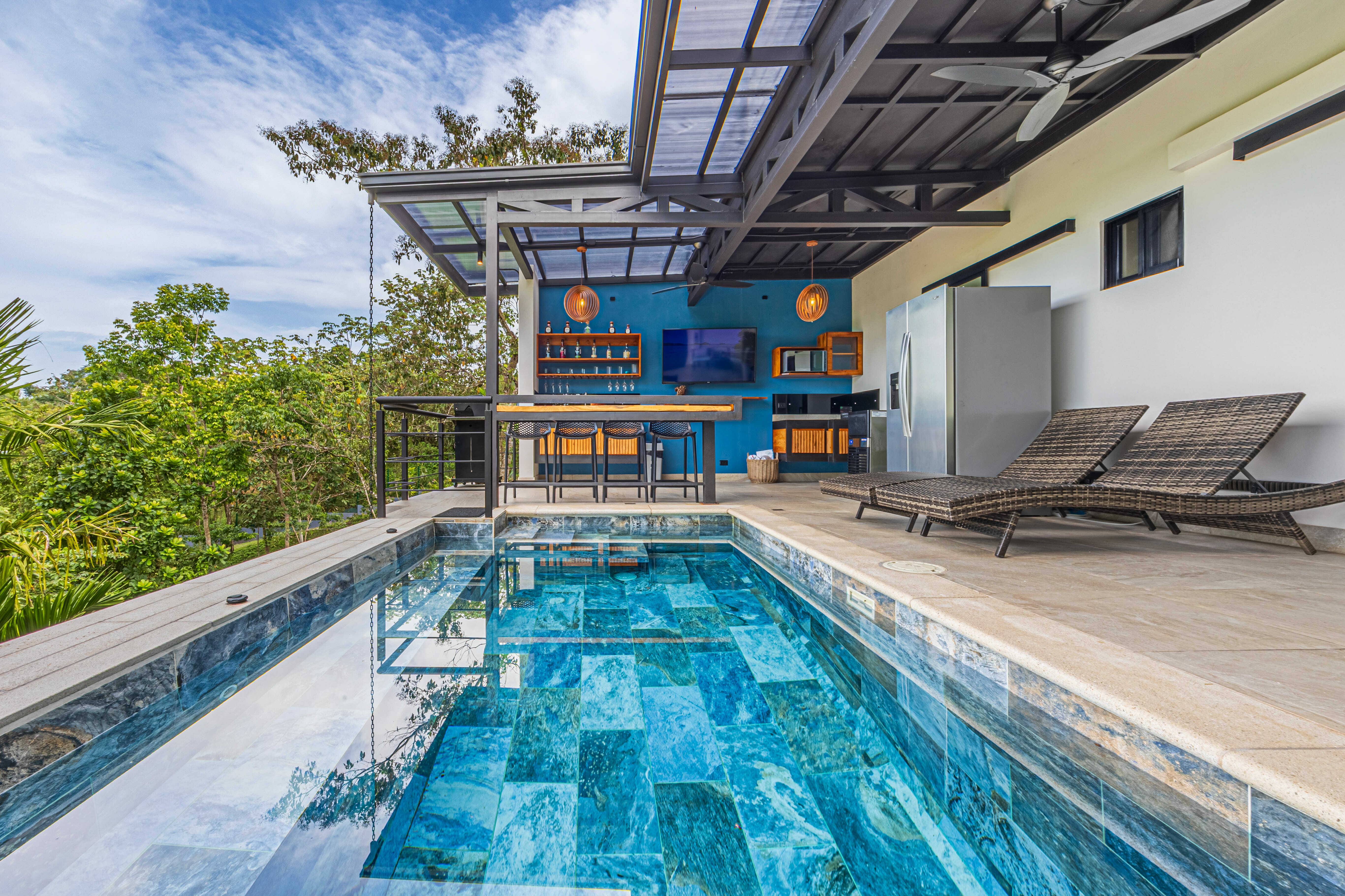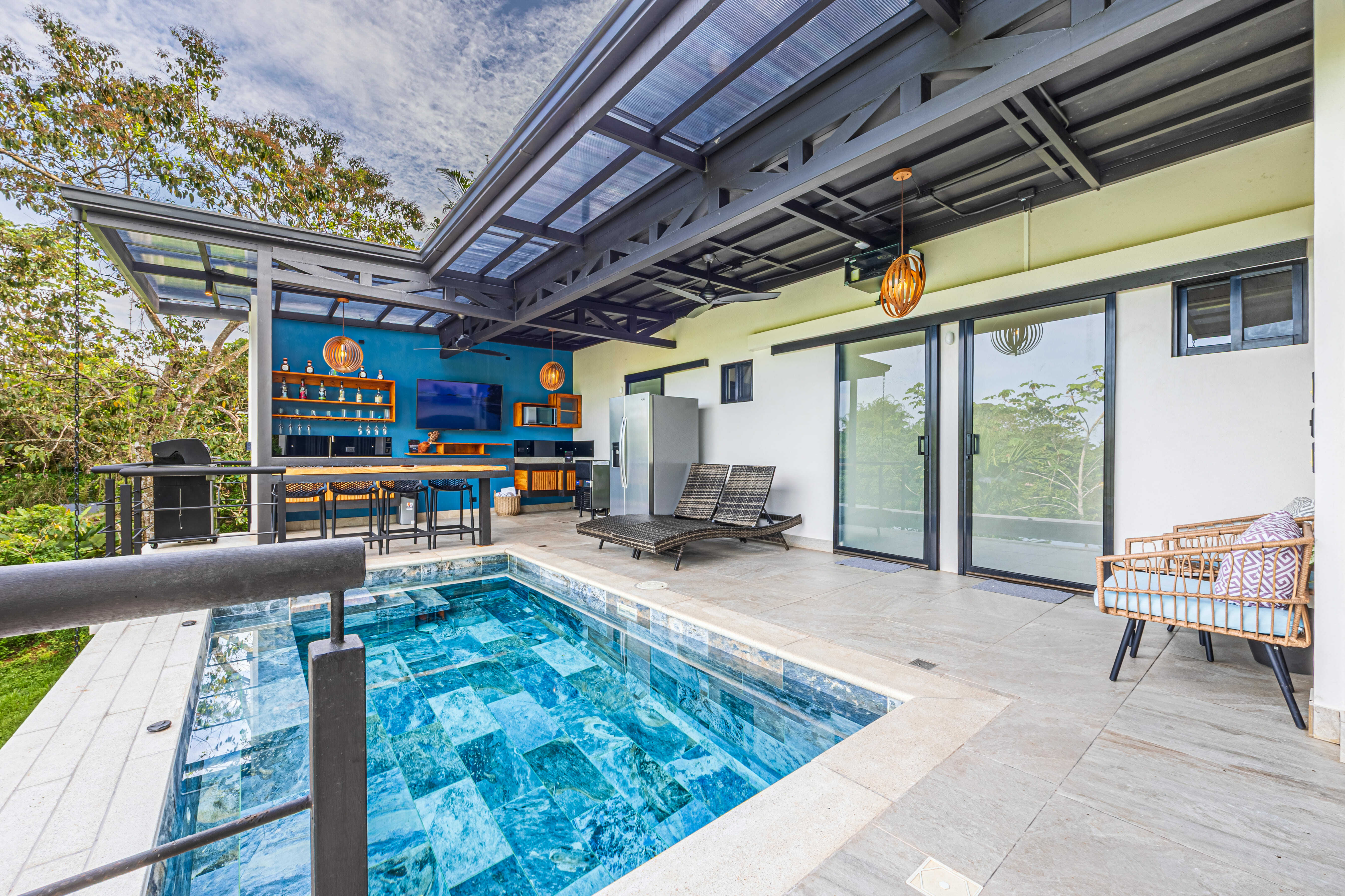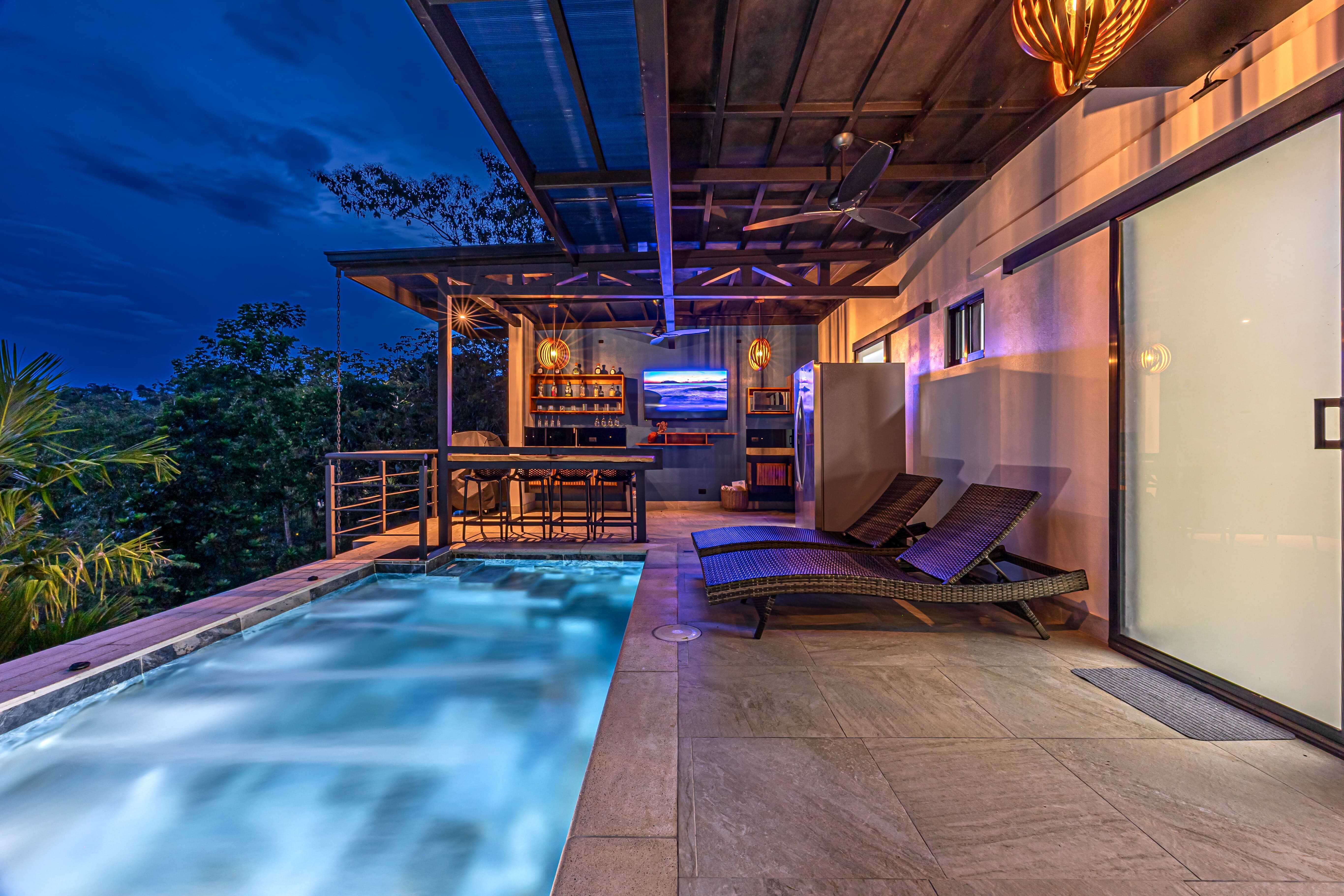 Step outside to your private oasis: a large pool, covered terrace, BBQ/bar area, full bathroom, fans, and ambient lighting—everything you need for entertaining or relaxing after a day at the beach.