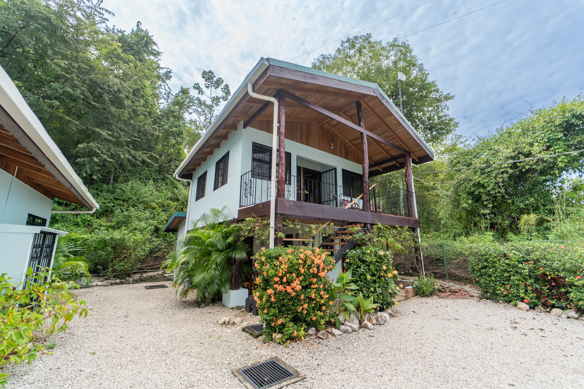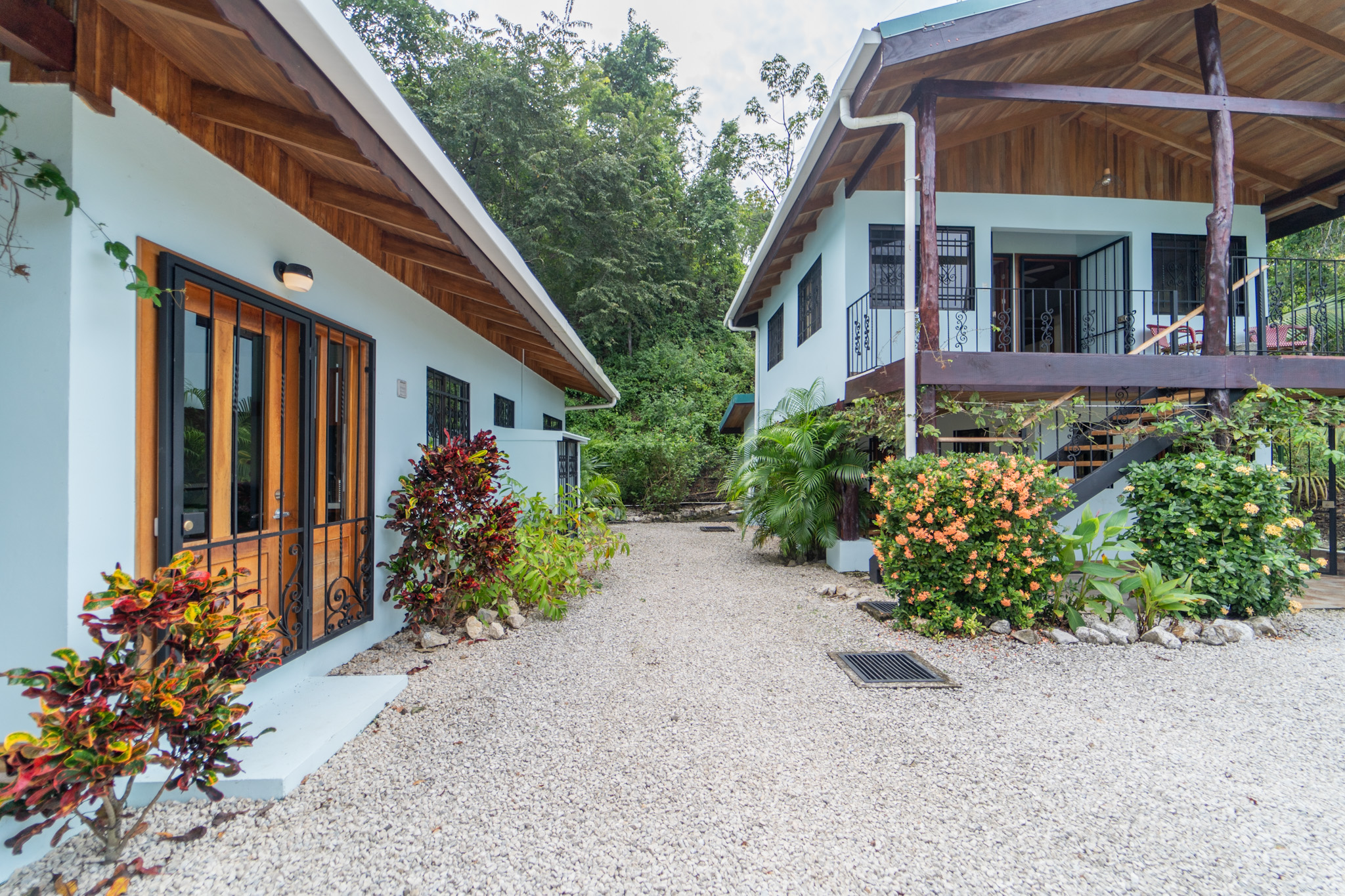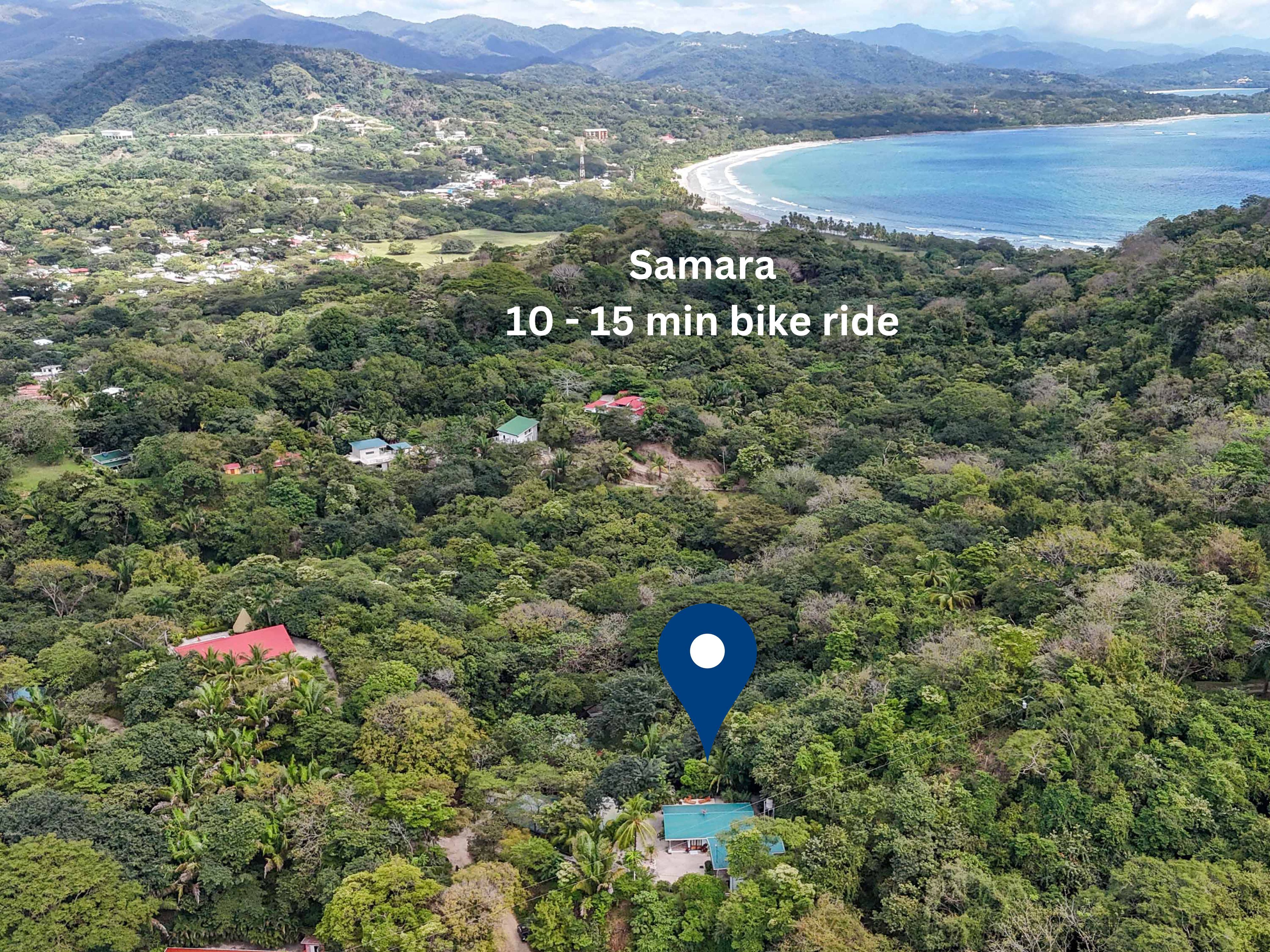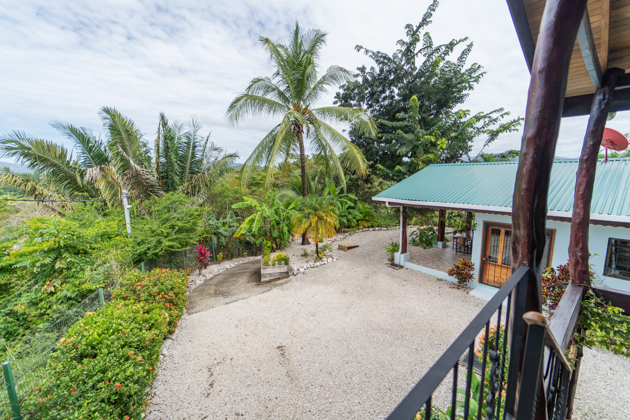 This property is nestled between Playa Sámara and Playa Buena Vista and is just a short walk from Izquierda Beach and nearby trails. The homes sit on a small and private hilltop surrounded by lush gardens with views of the mountains and valey below. The property features a private, gated entrance with an electric gate and a paved driveway.