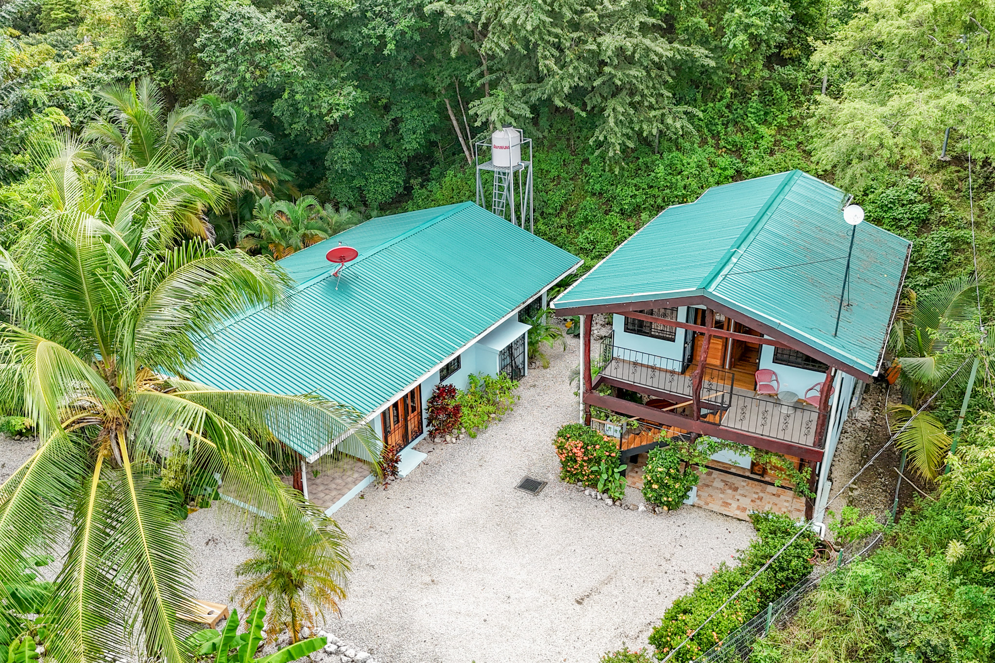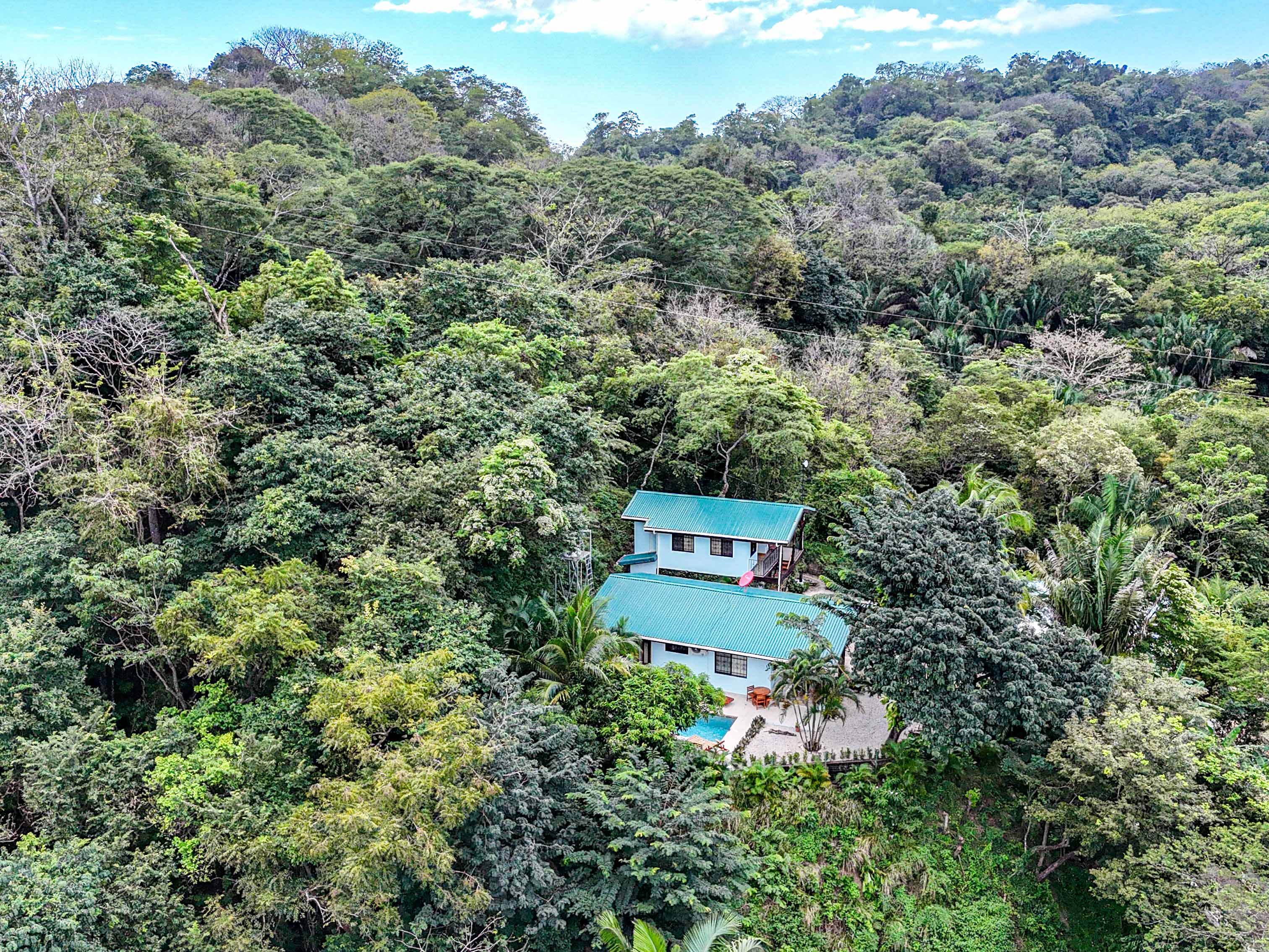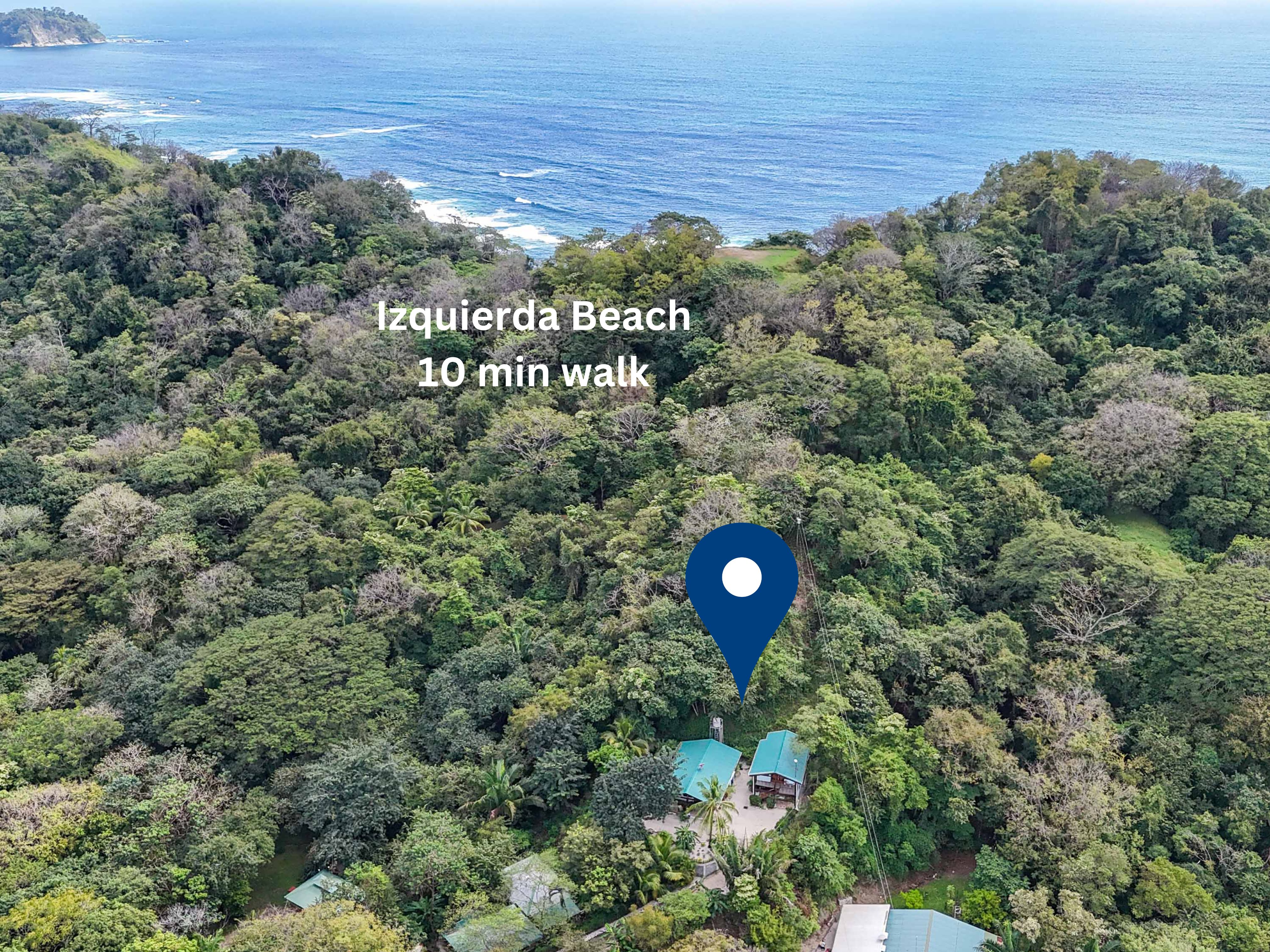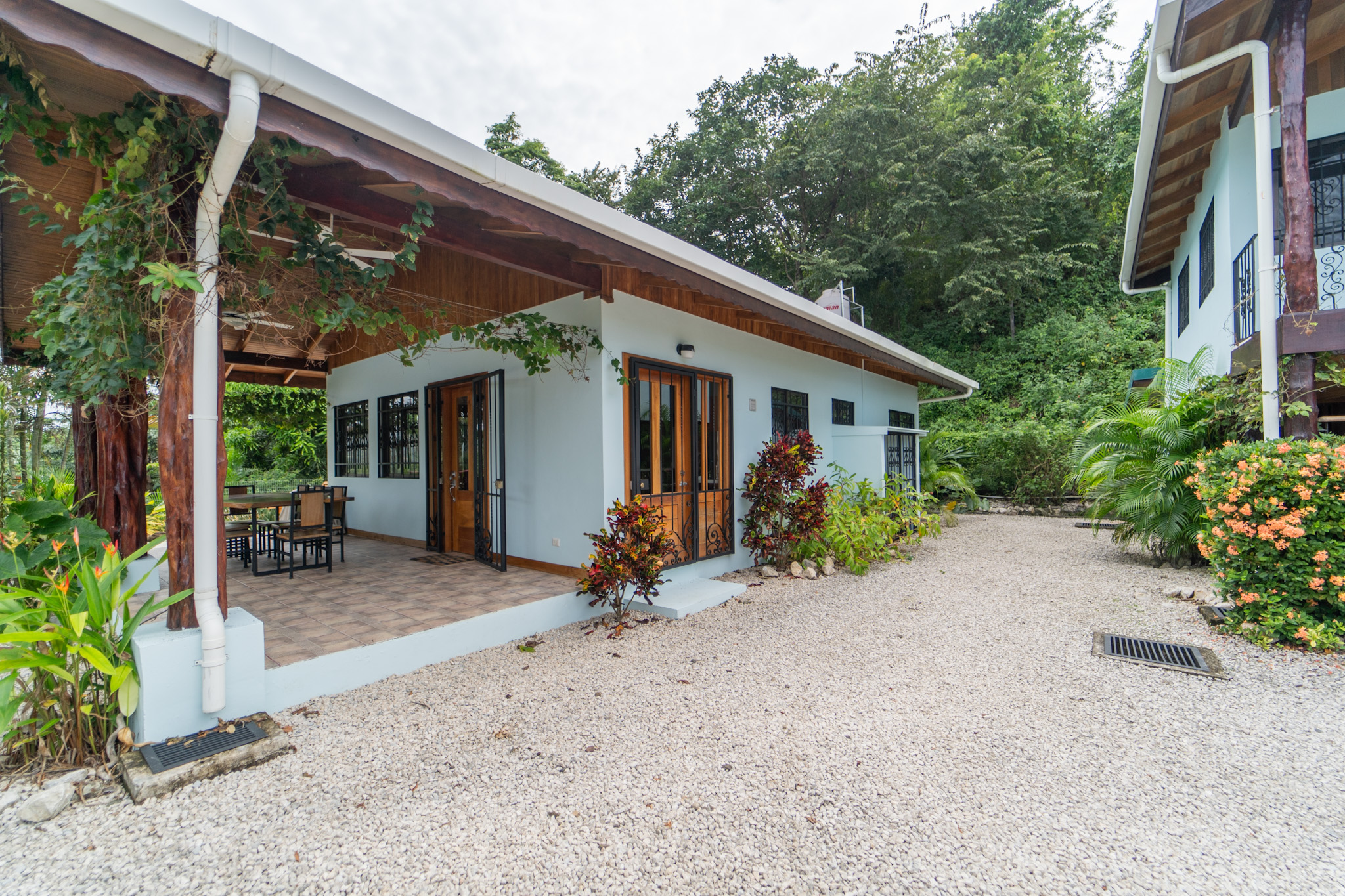 This property is nestled between Playa Sámara and Playa Buena Vista and is just a short walk from Izquierda Beach and nearby trails. The homes sit on a small and private hilltop surrounded by lush gardens with views of the mountains and valey below. The property features a private, gated entrance with an electric gate and a paved driveway.