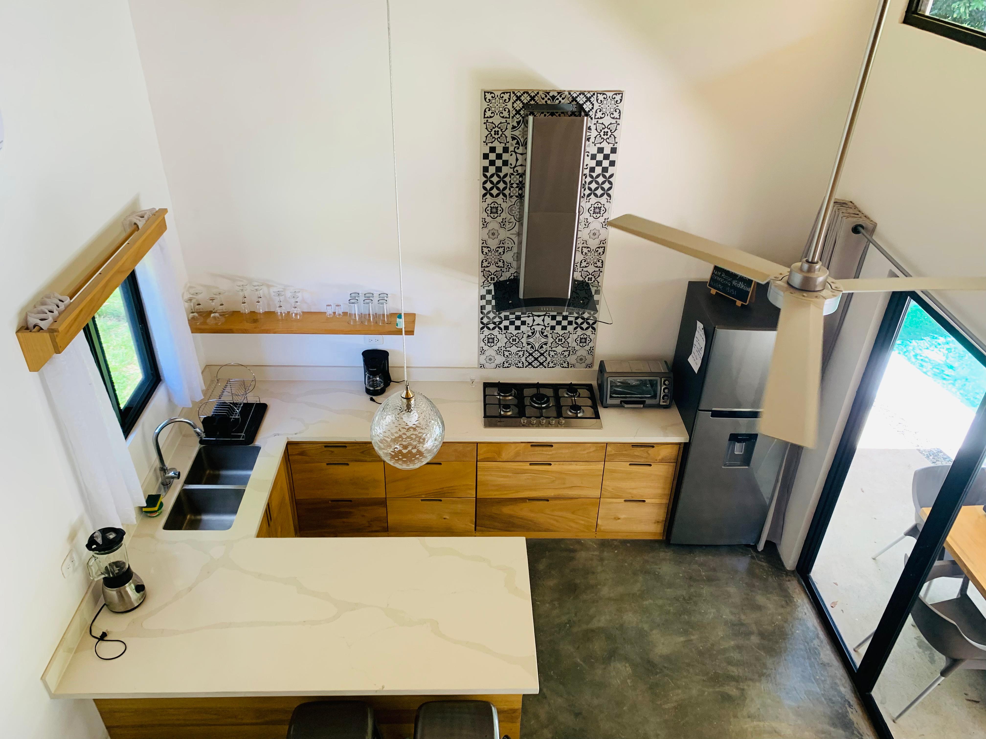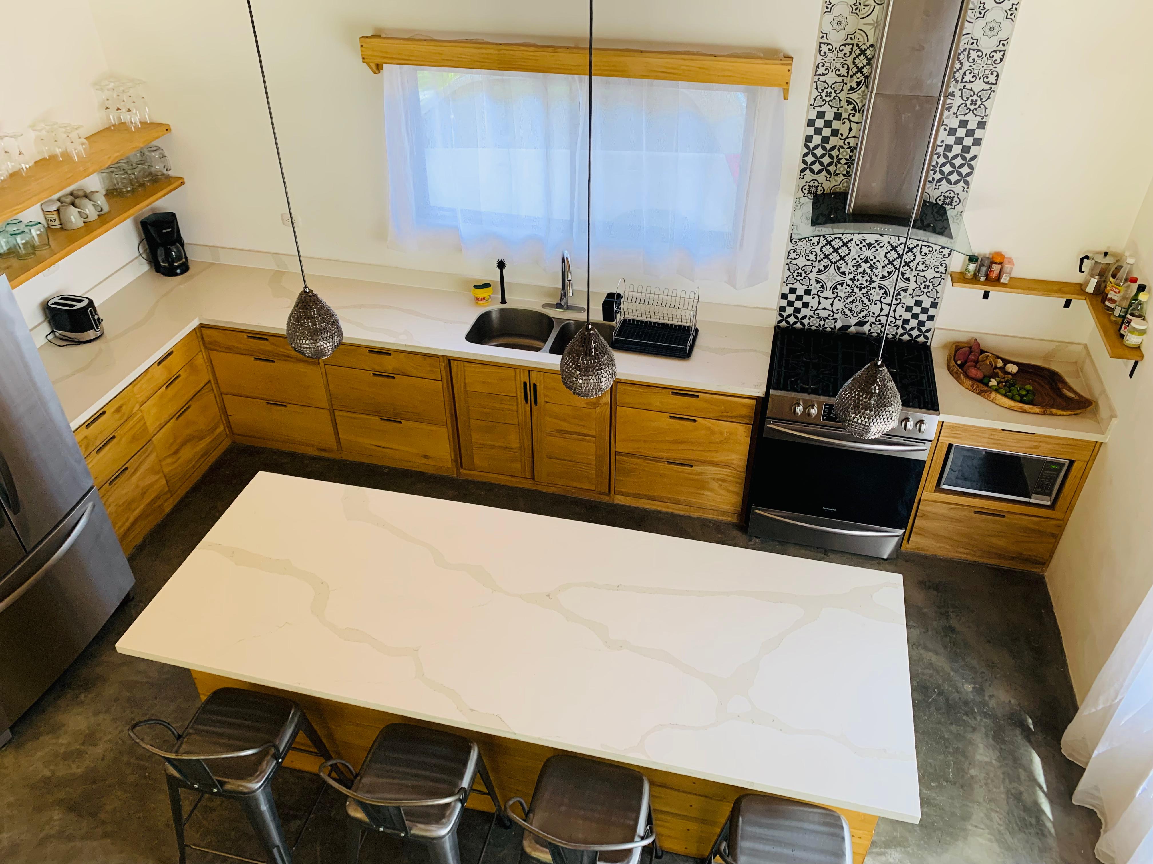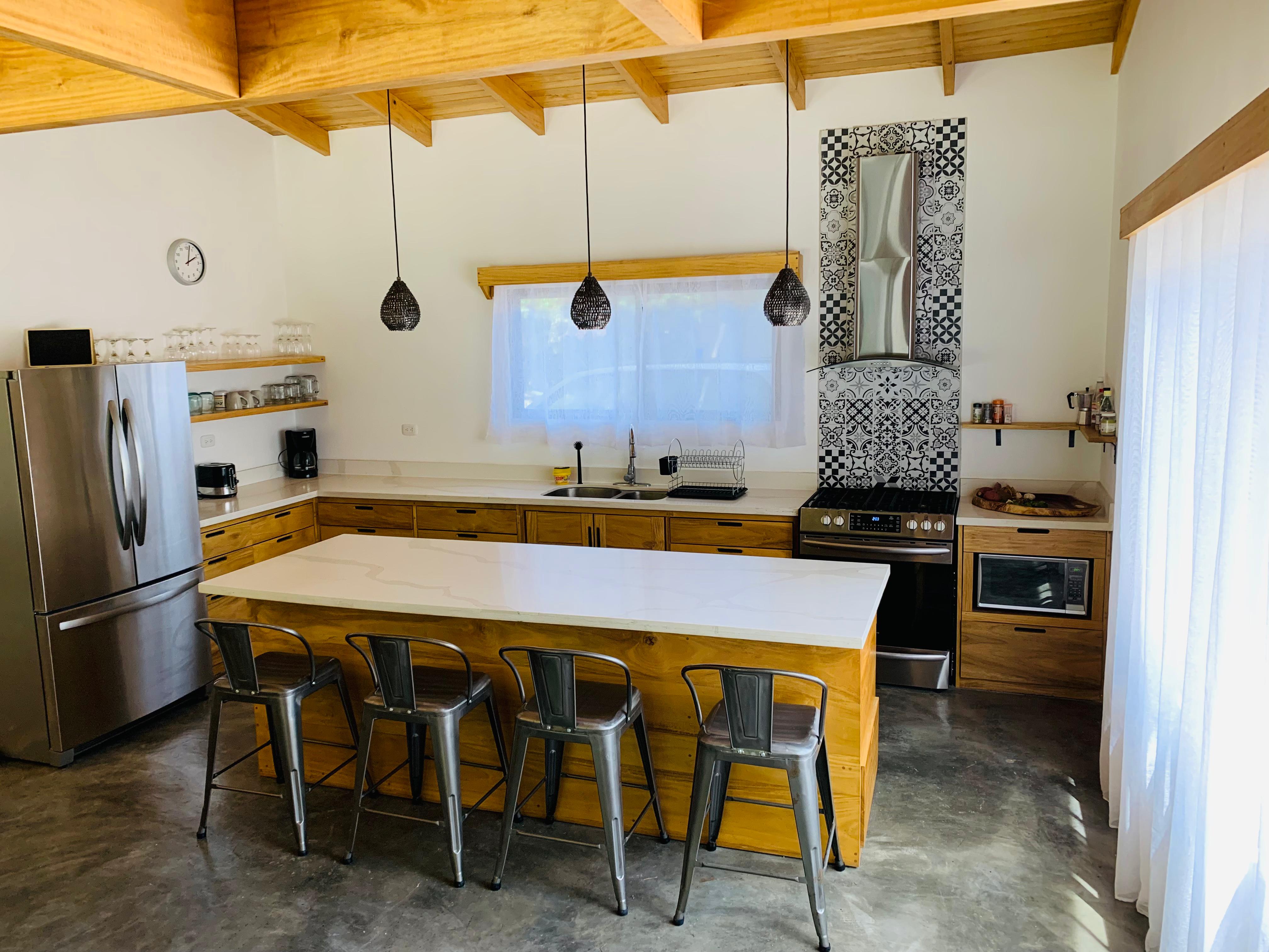 The main house welcomes you with two spacious bedrooms, each with its own sleek bathroom, while a cozy guest loft offers extra space for friends or a quiet hideaway. The kitchen—a cook’s delight—boasts clean lines, top-tier appliances, and an island made for gatherings.