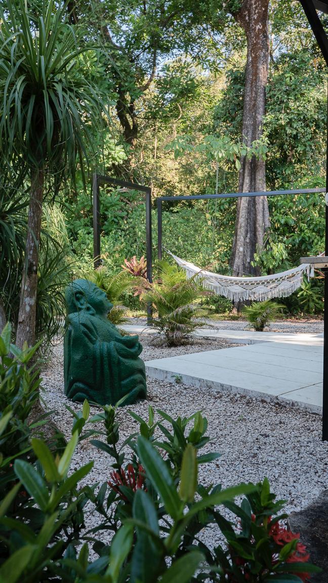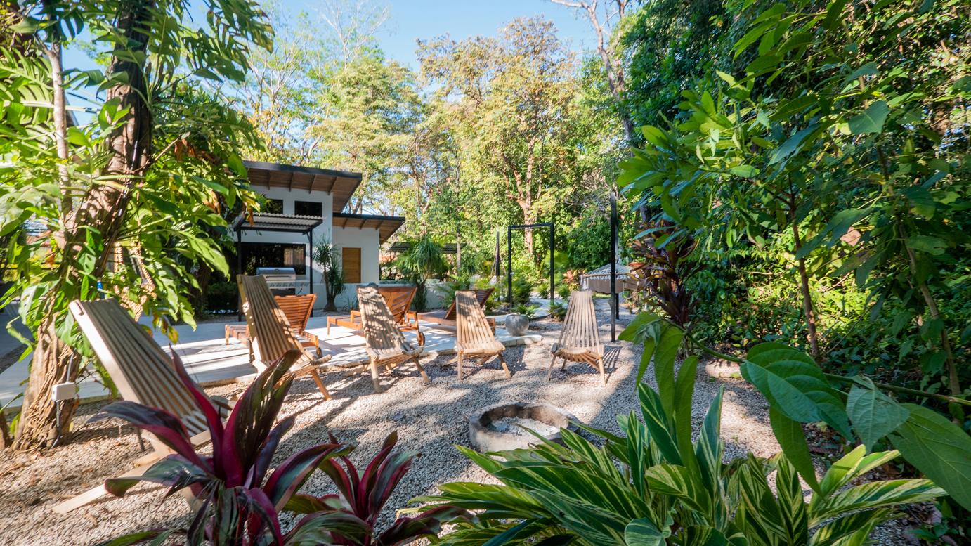 Outside, the real adventure begins. A winding garden path leads past a shimmering pool, a crackling fire pit, and hidden spots to lounge under the trees. The river murmurs at the edge of the property, keeping the world at bay while monkeys and parrots provide the morning show.