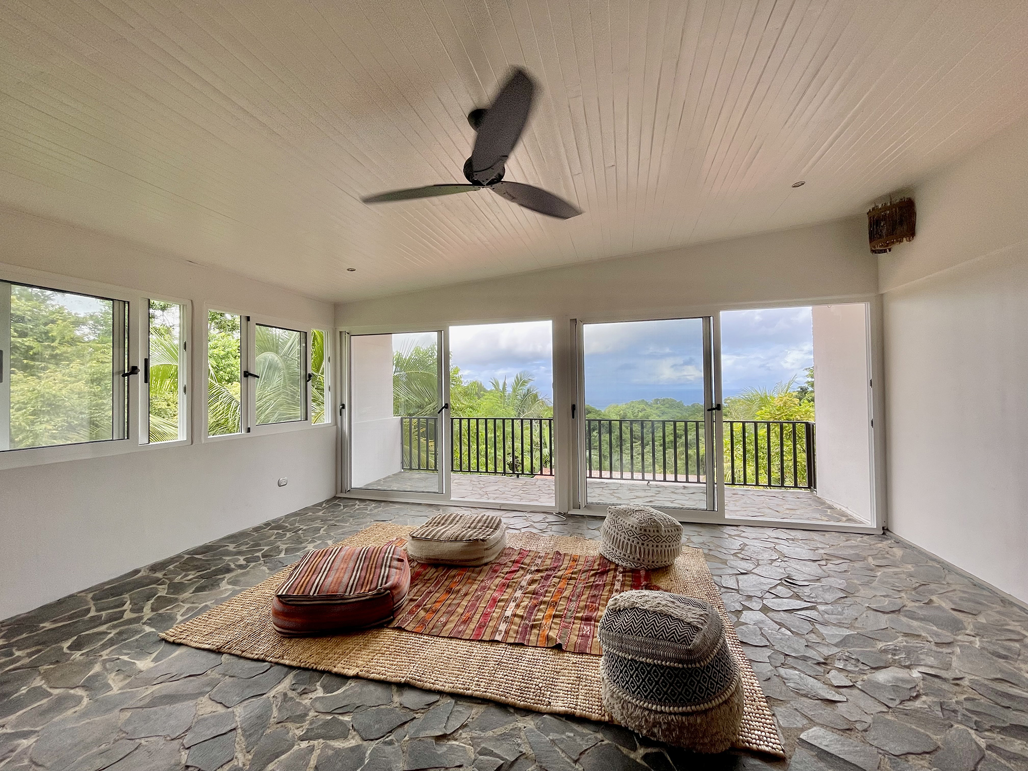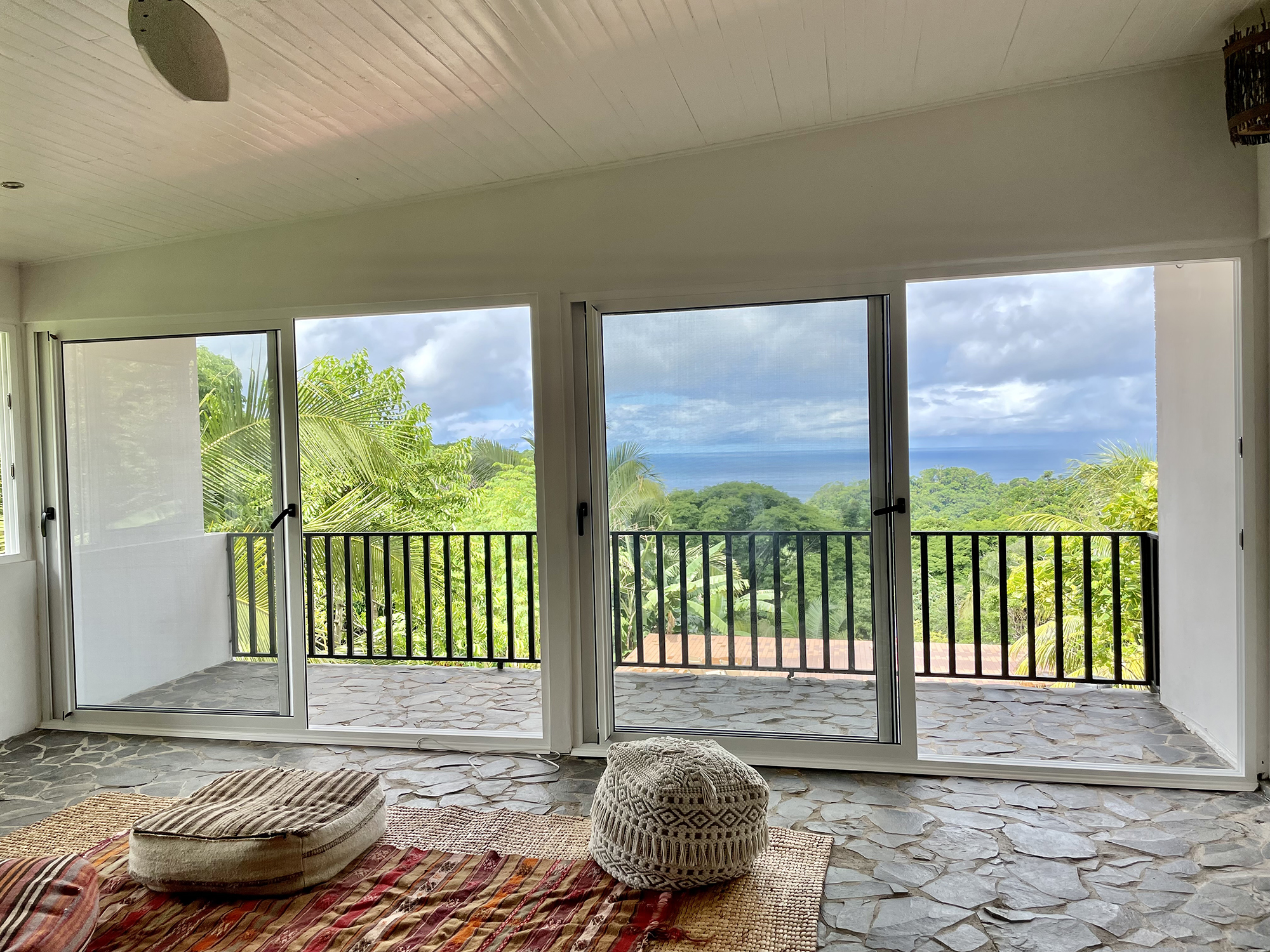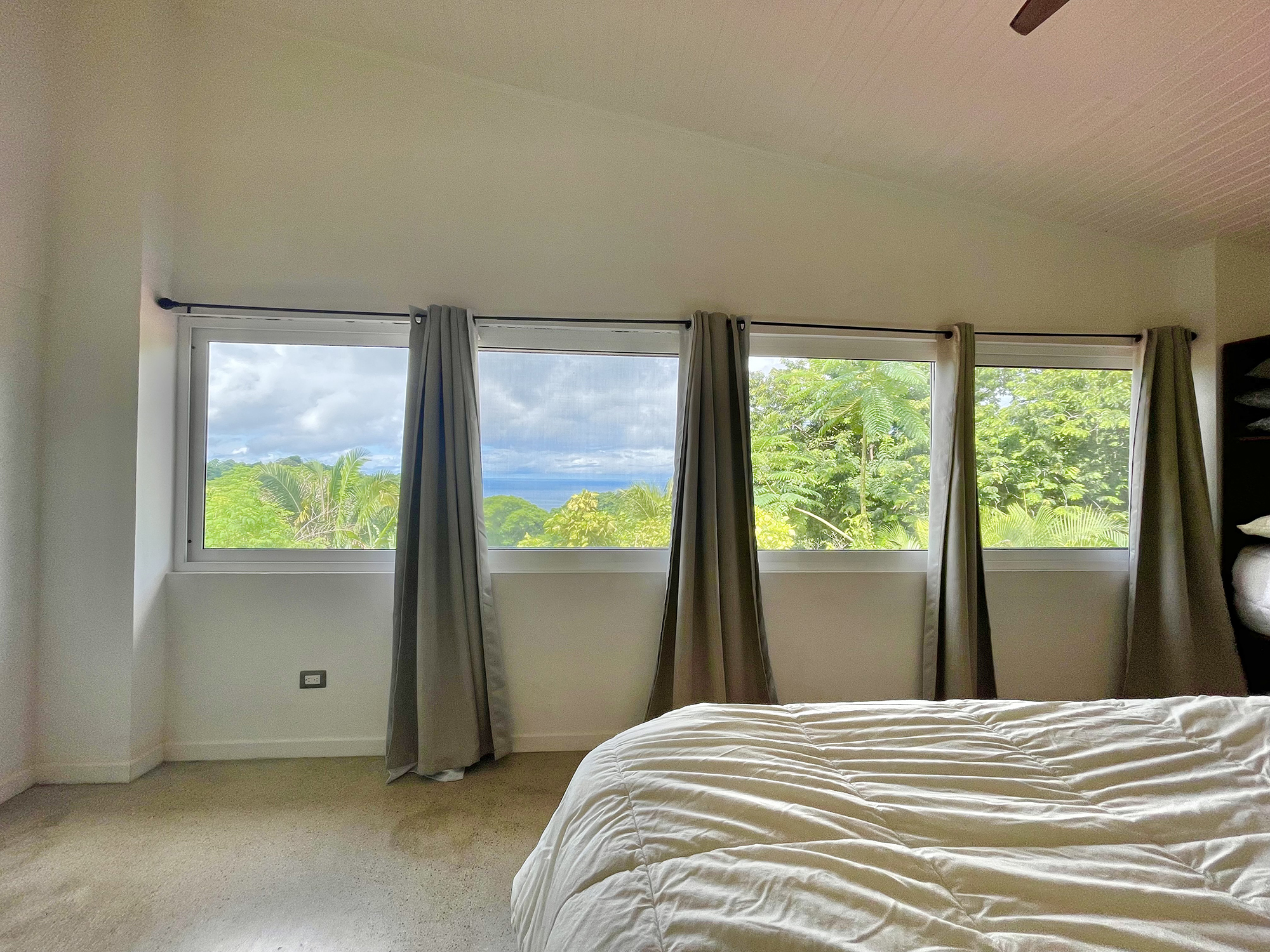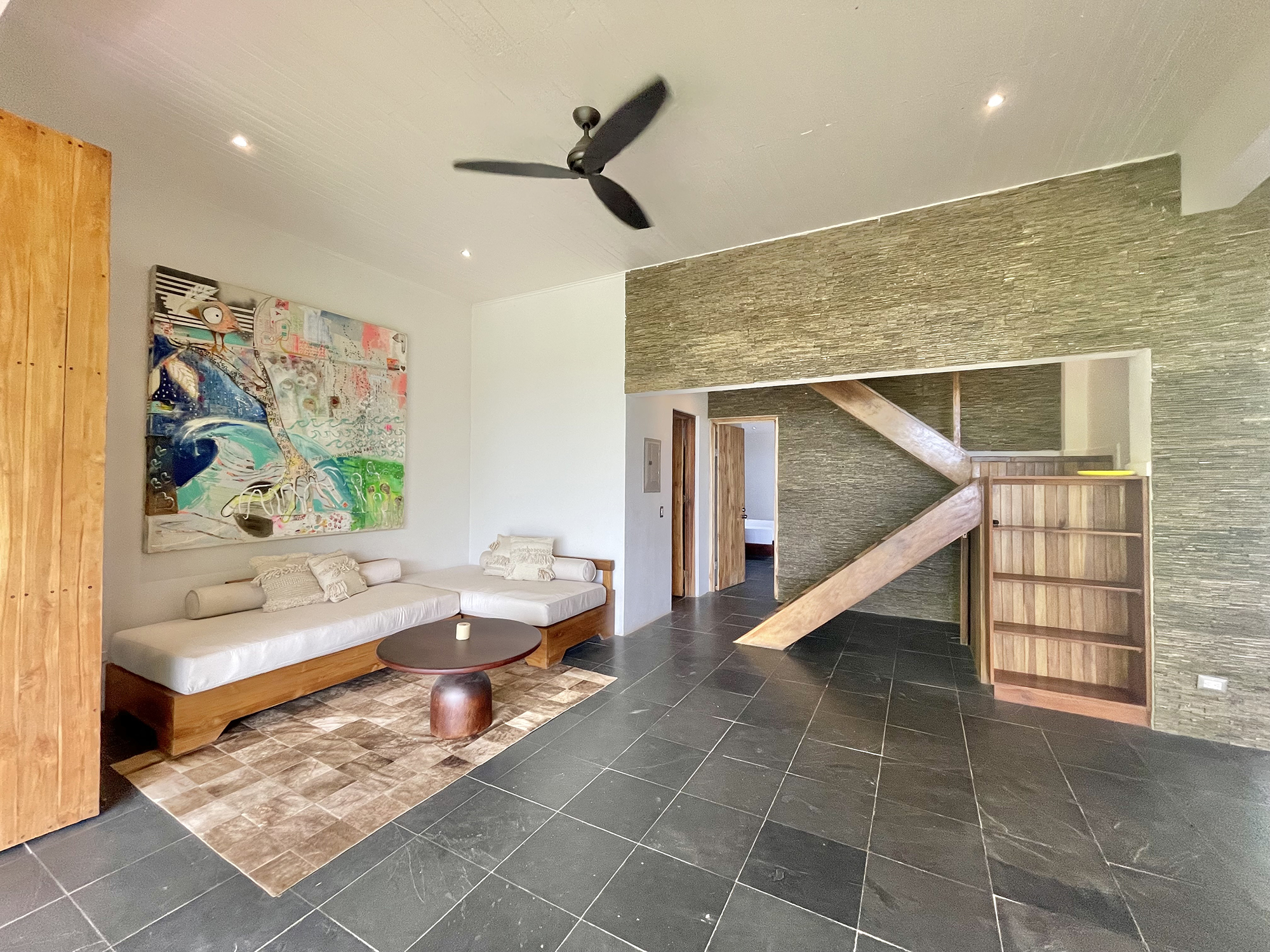 The house has a large deck downstairs with a dining table and could fit an outdoor living area set of furniture, inside there is an open floor plan with a chef's kitchen, living area and full bathroom. There is one large room downstairs facing an interior patio and garden. Up the beautiful wooden staircase is a second bedroom with large windows facing the forest, along with the second bathroom. All the way up the stairs are two large ocean view rooms, one of them has a balcony. The upstairs rooms are ideal for a couple with small kids or one of them could be a stunning home office.