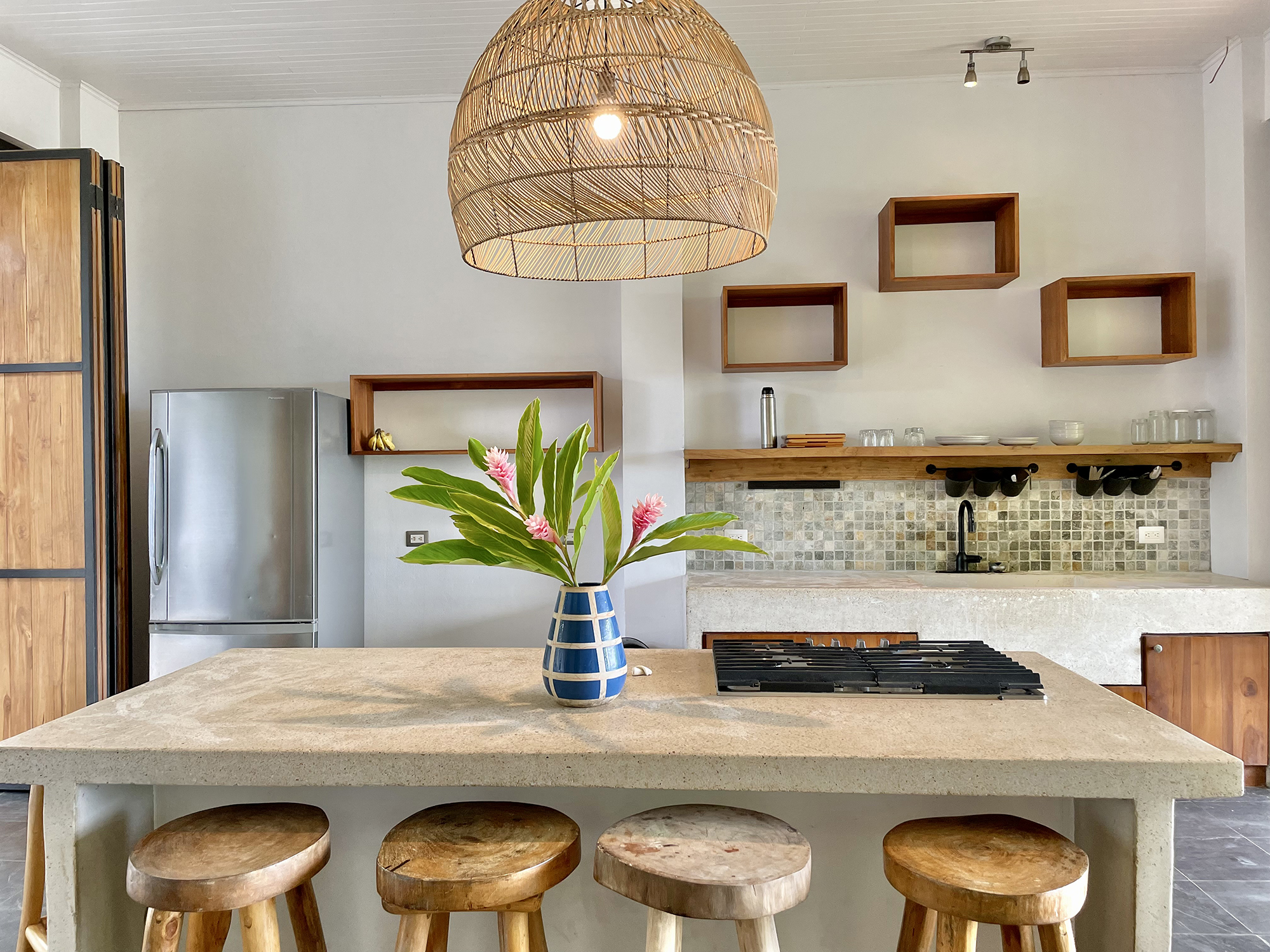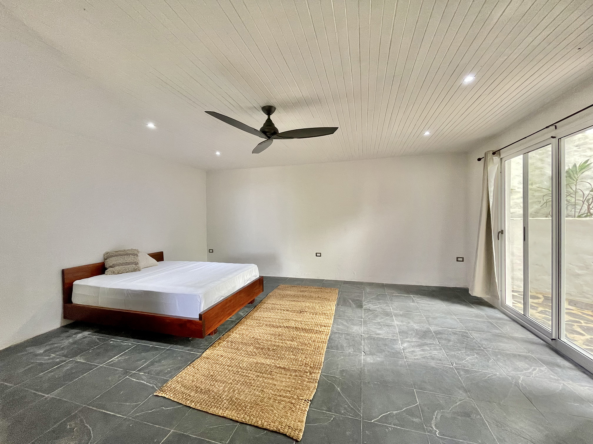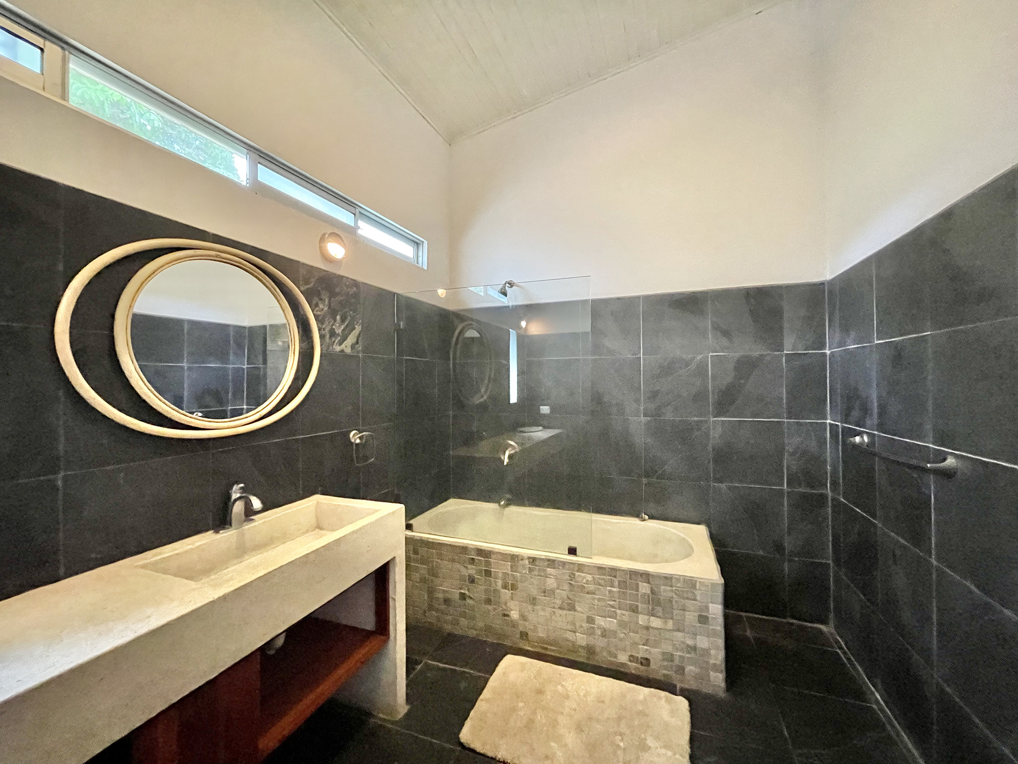 The house has a large deck downstairs with a dining table and could fit an outdoor living area set of furniture, inside there is an open floor plan with a chef's kitchen, living area and full bathroom. There is one large room downstairs facing an interior patio and garden. Up the beautiful wooden staircase is a second bedroom with large windows facing the forest, along with the second bathroom. All the way up the stairs are two large ocean view rooms, one of them has a balcony. The upstairs rooms are ideal for a couple with small kids or one of them could be a stunning home office.