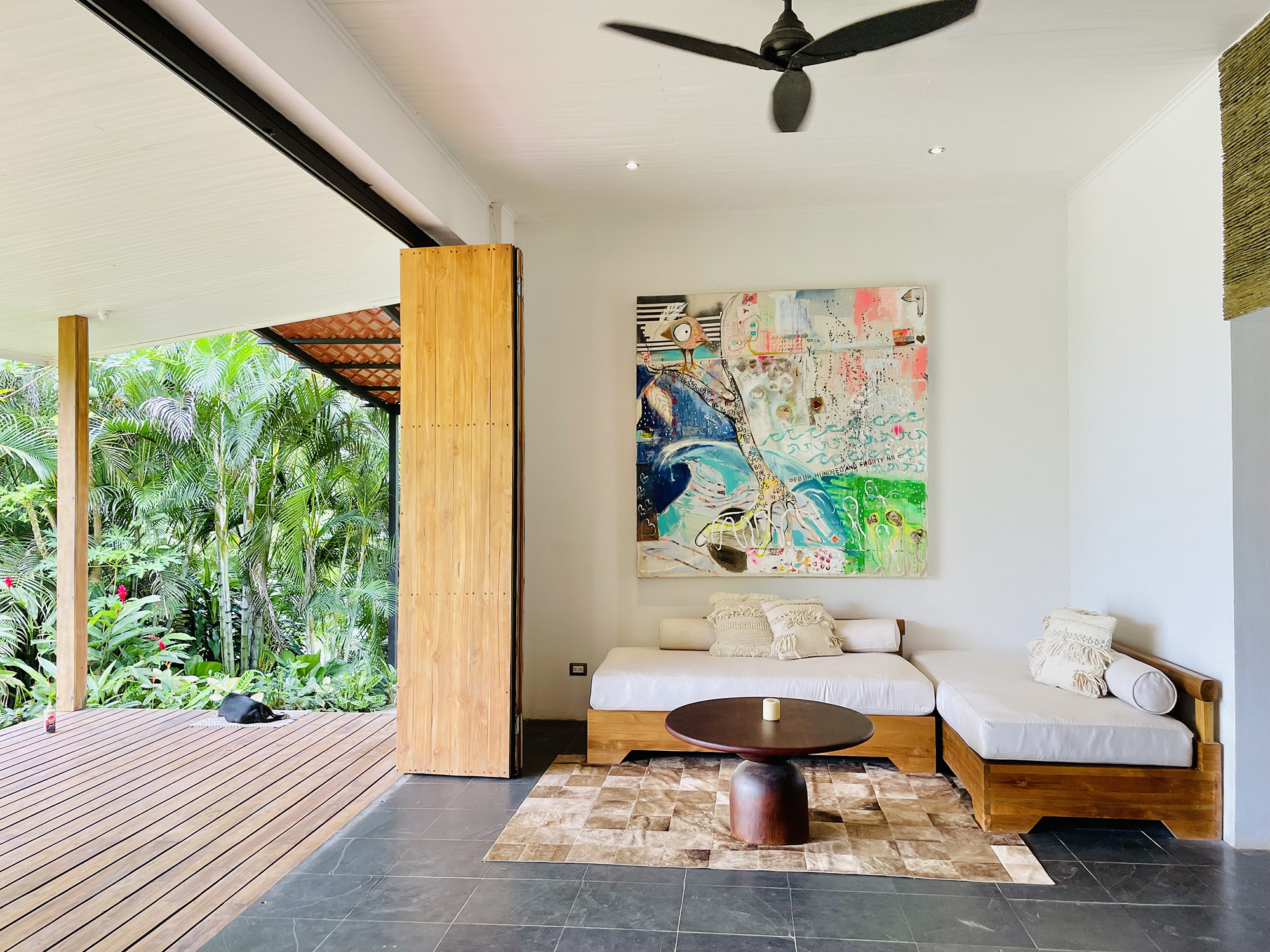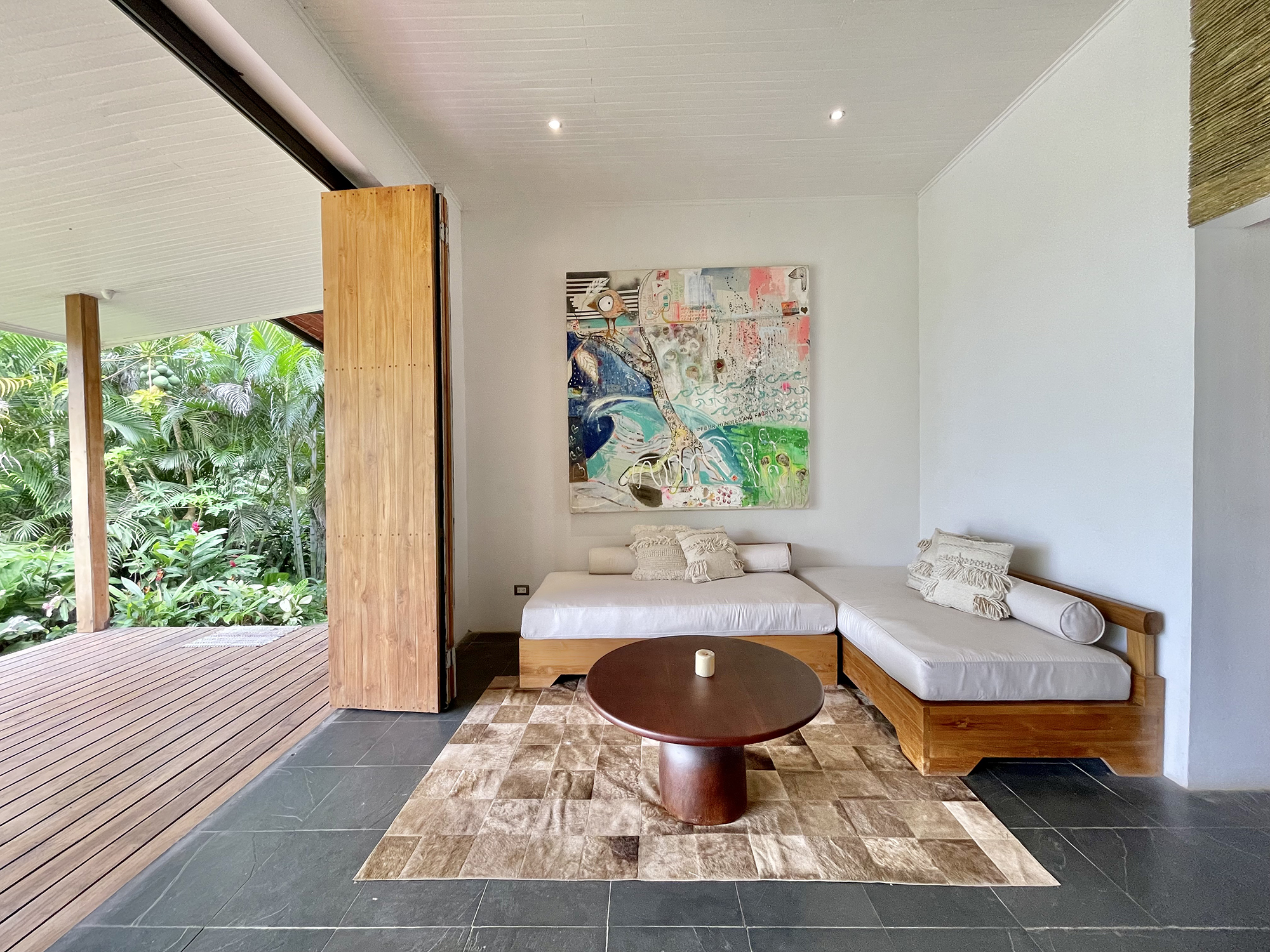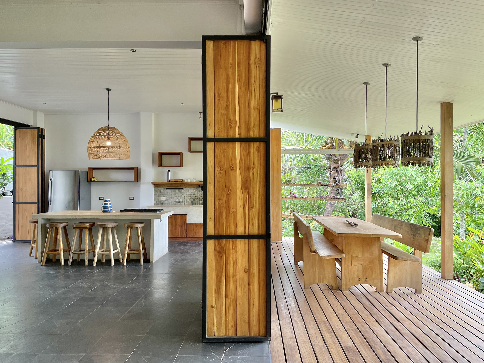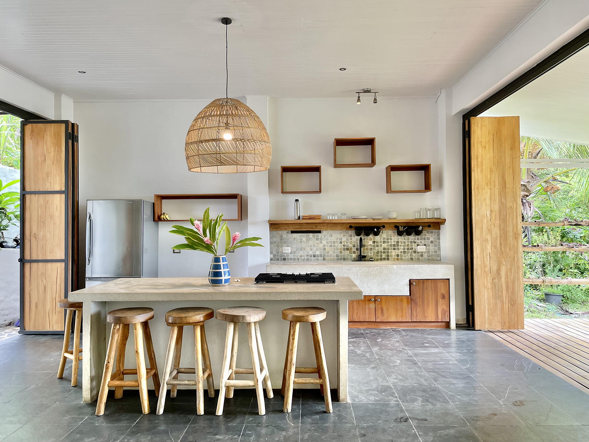 The house has a large deck downstairs with a dining table and could fit an outdoor living area set of furniture, inside there is an open floor plan with a chef's kitchen, living area and full bathroom. There is one large room downstairs facing an interior patio and garden. Up the beautiful wooden staircase is a second bedroom with large windows facing the forest, along with the second bathroom. All the way up the stairs are two large ocean view rooms, one of them has a balcony. The upstairs rooms are ideal for a couple with small kids or one of them could be a stunning home office.