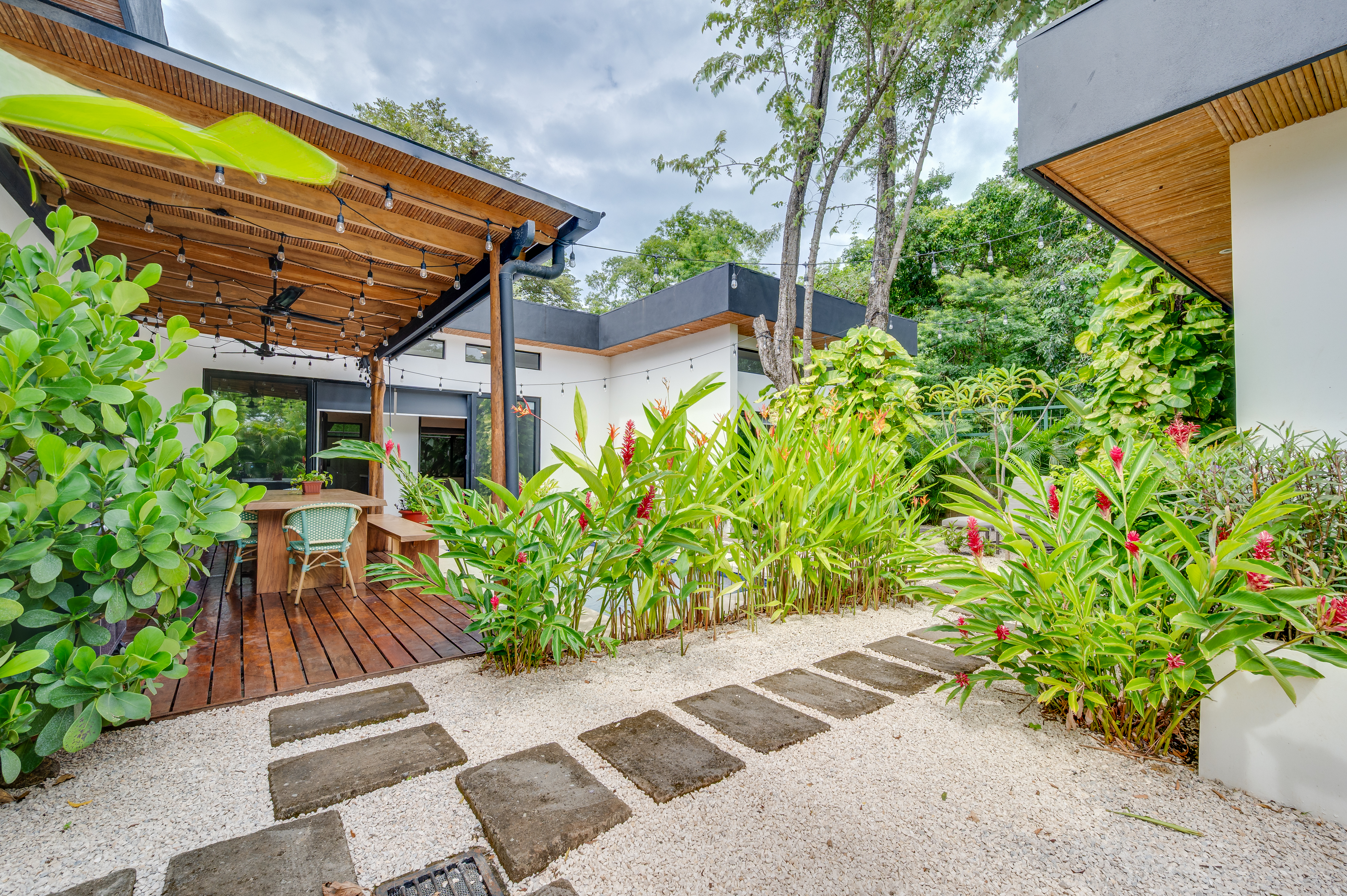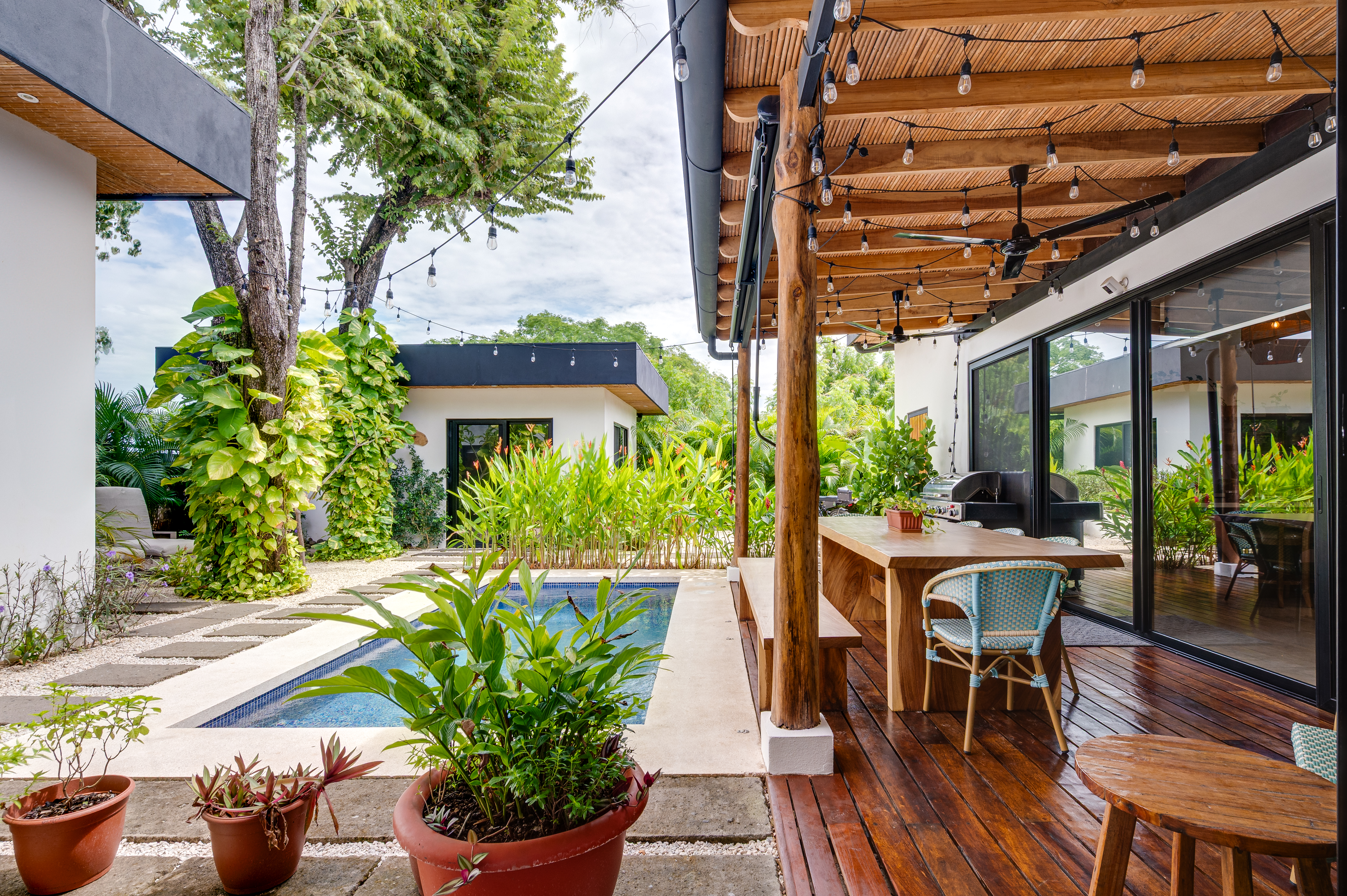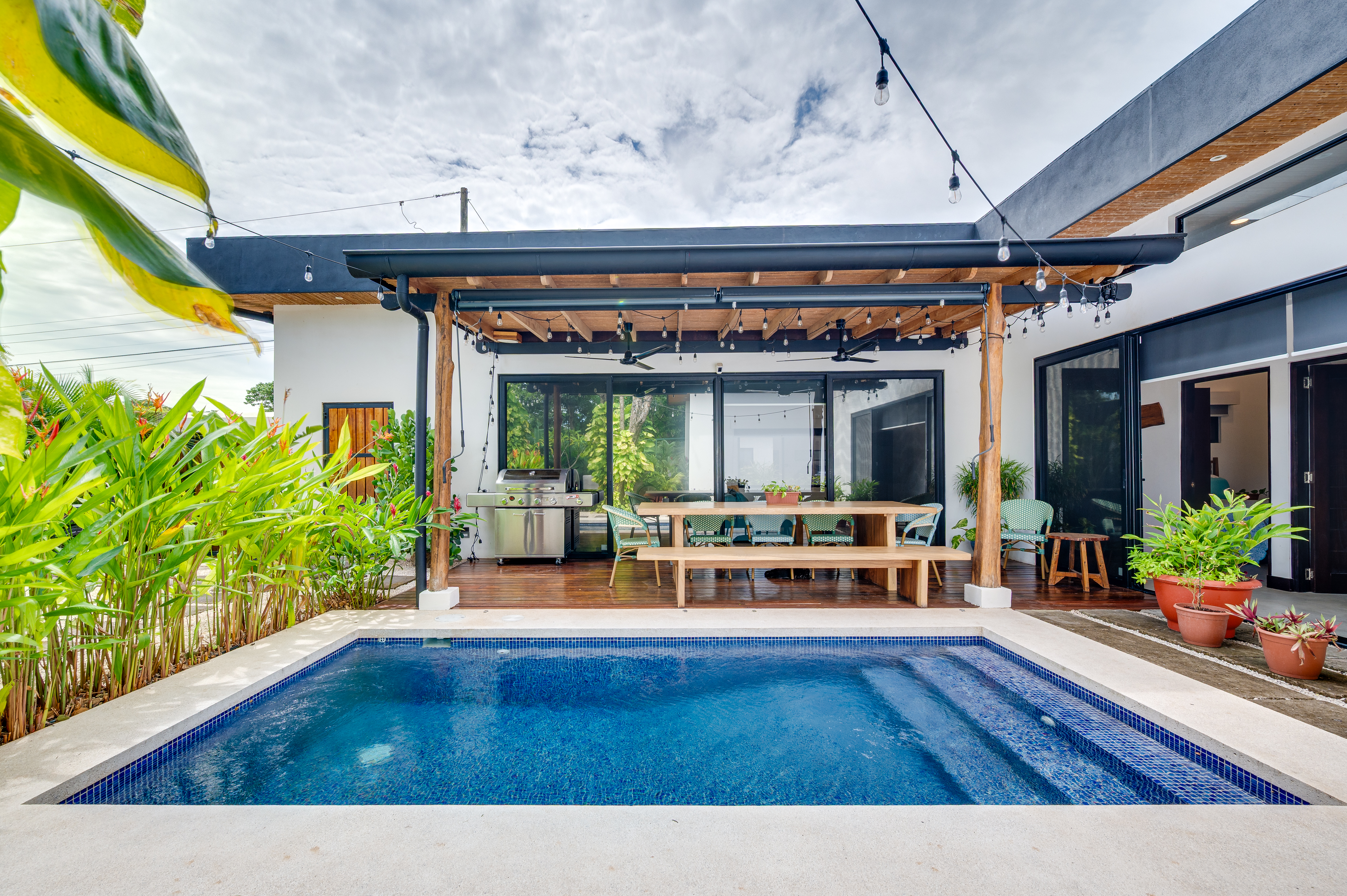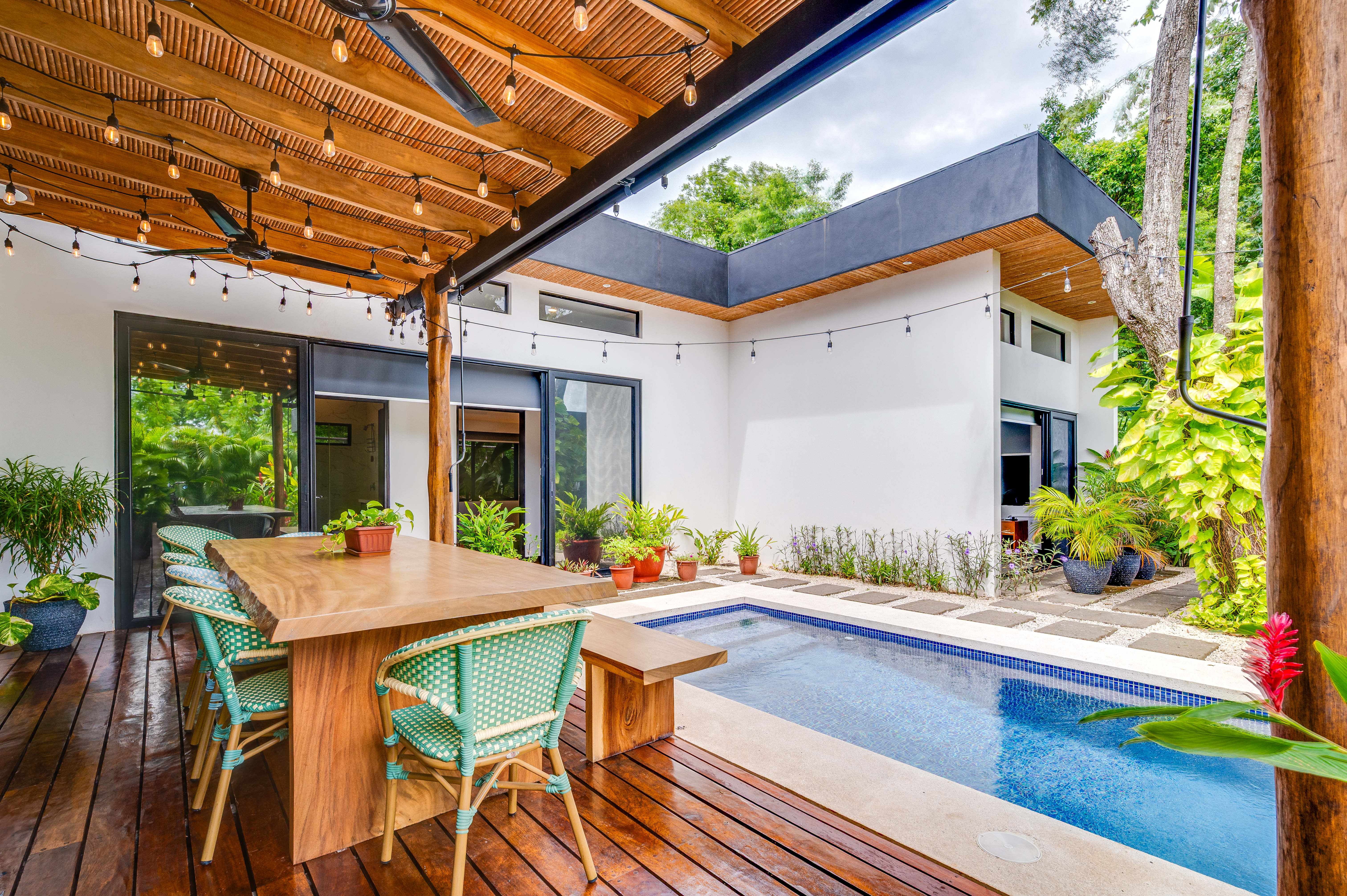This 3 year old home has been impeccably maintained and never rented out. The distribution is great, around a swimming pool with lush vegetation, and looking out over mature trees. The teak deck has been recently treated and is in great condition. The location is perfect- just far enough out from Tamarindo to be peaceful and surrounded by nature. But not forgetting that just a short car ride (or golf cart ride!) away are the beautiful sandy beaches of Tamarindo, and all the restaurants and shops. Owner financing available.