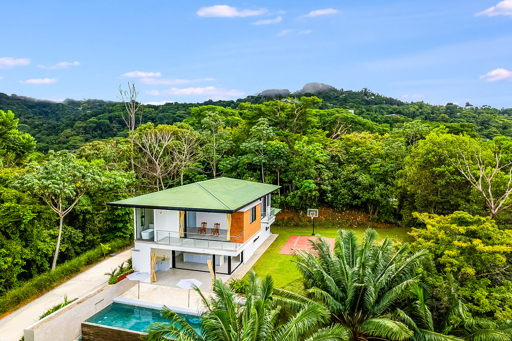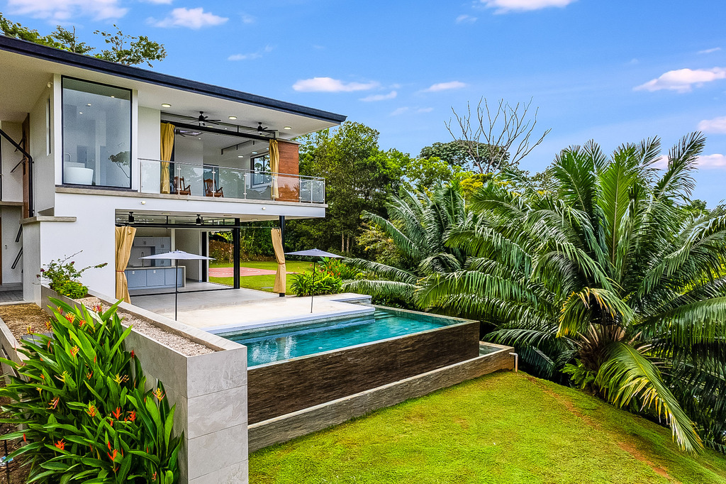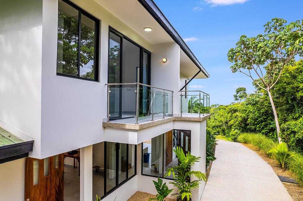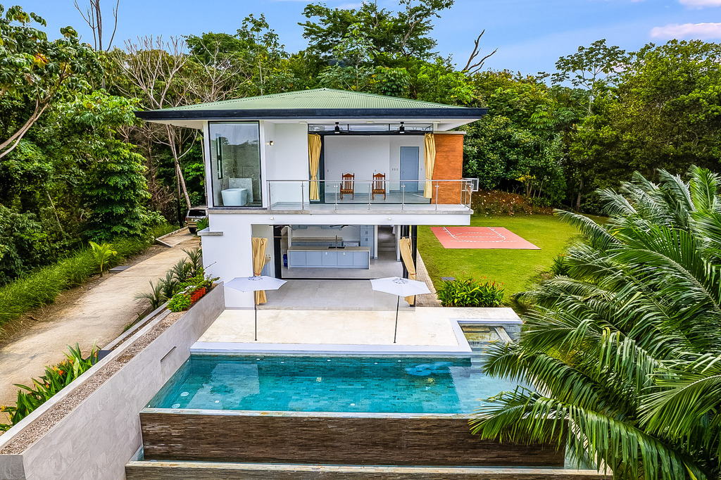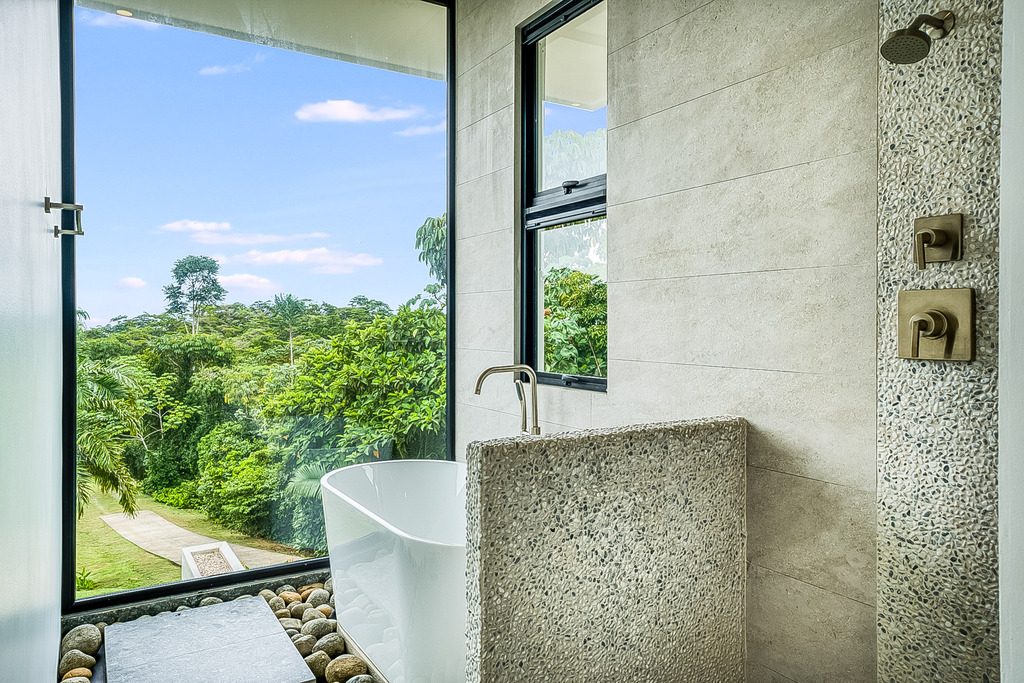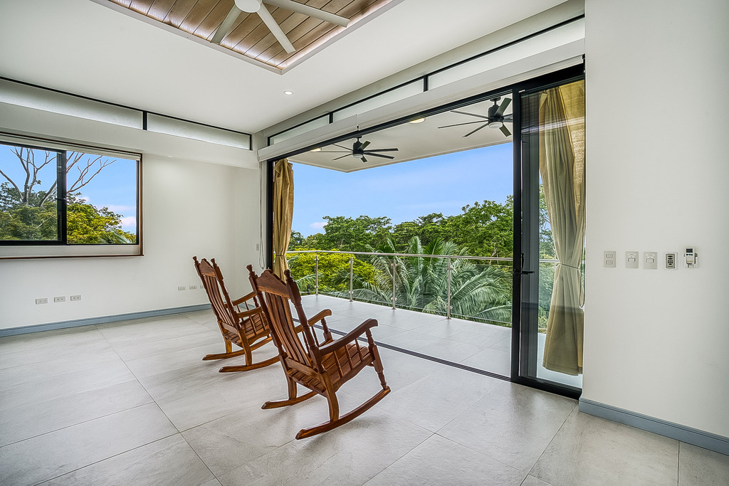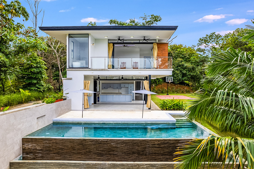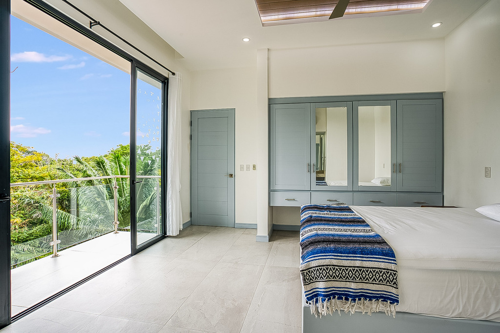 The main house, showcasing a modern design, includes four expansive bedrooms, each with its own en-suite bathroom and balcony, along with an additional half-bath, ensuring ample space and convenience for family and guests. Each room is thoughtfully crafted to maximize natural light featuring large windows with stunning ocean and mountain views. The interiors harmoniously blend fine materials like wood, marble, marble and glass, creating an inviting and refined atmosphere.