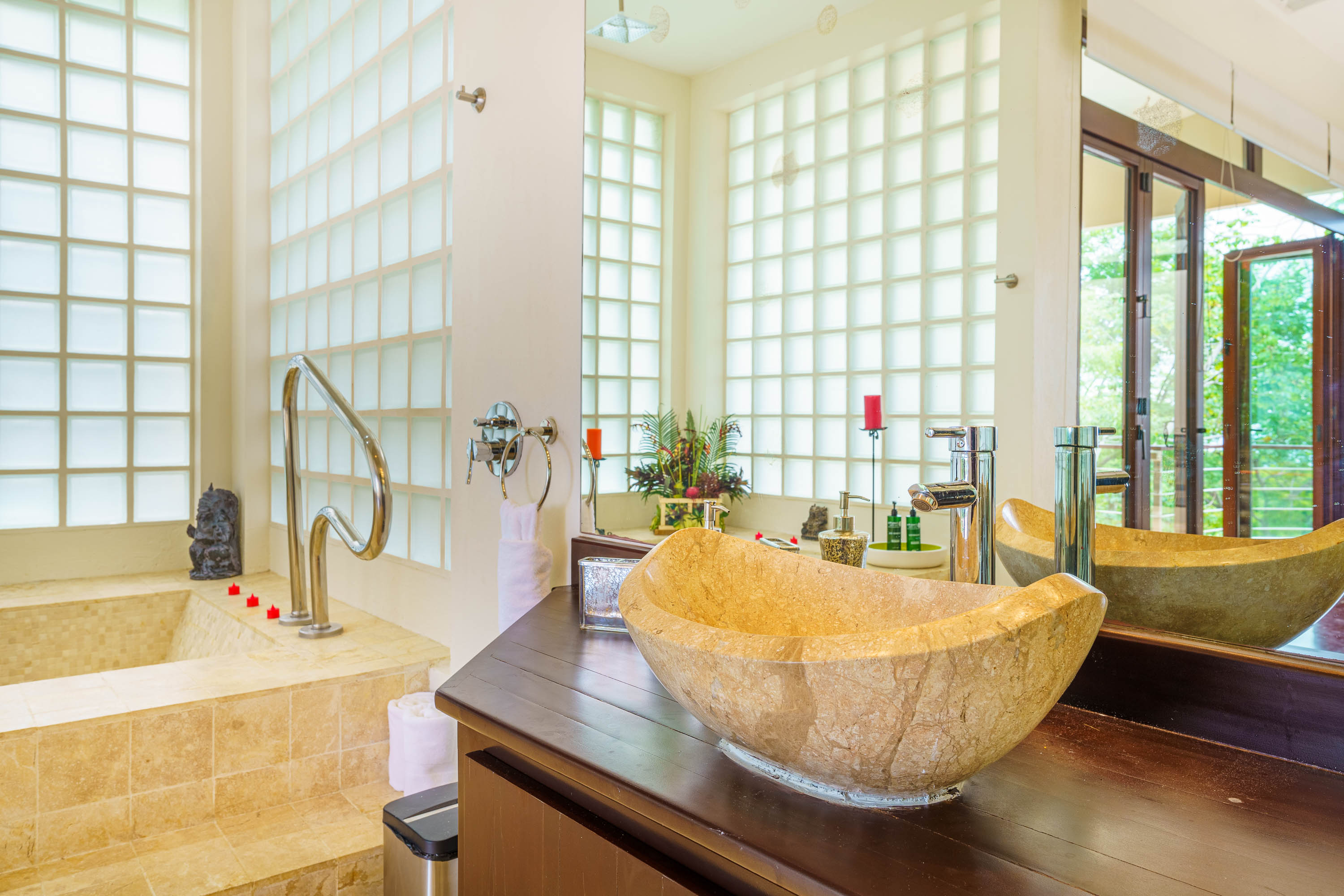 The master suite offers a king-size bed, large glass doors opening to a wraparound balcony, and a luxury bathroom with a bidet, spa-style bathtub, and rain shower. All linens and towels are of premium spa quality.