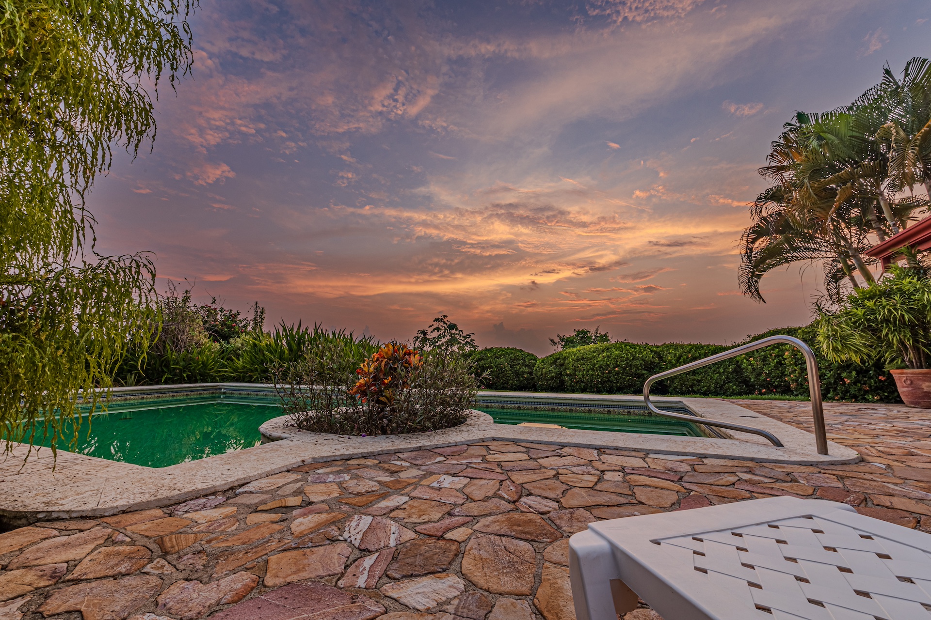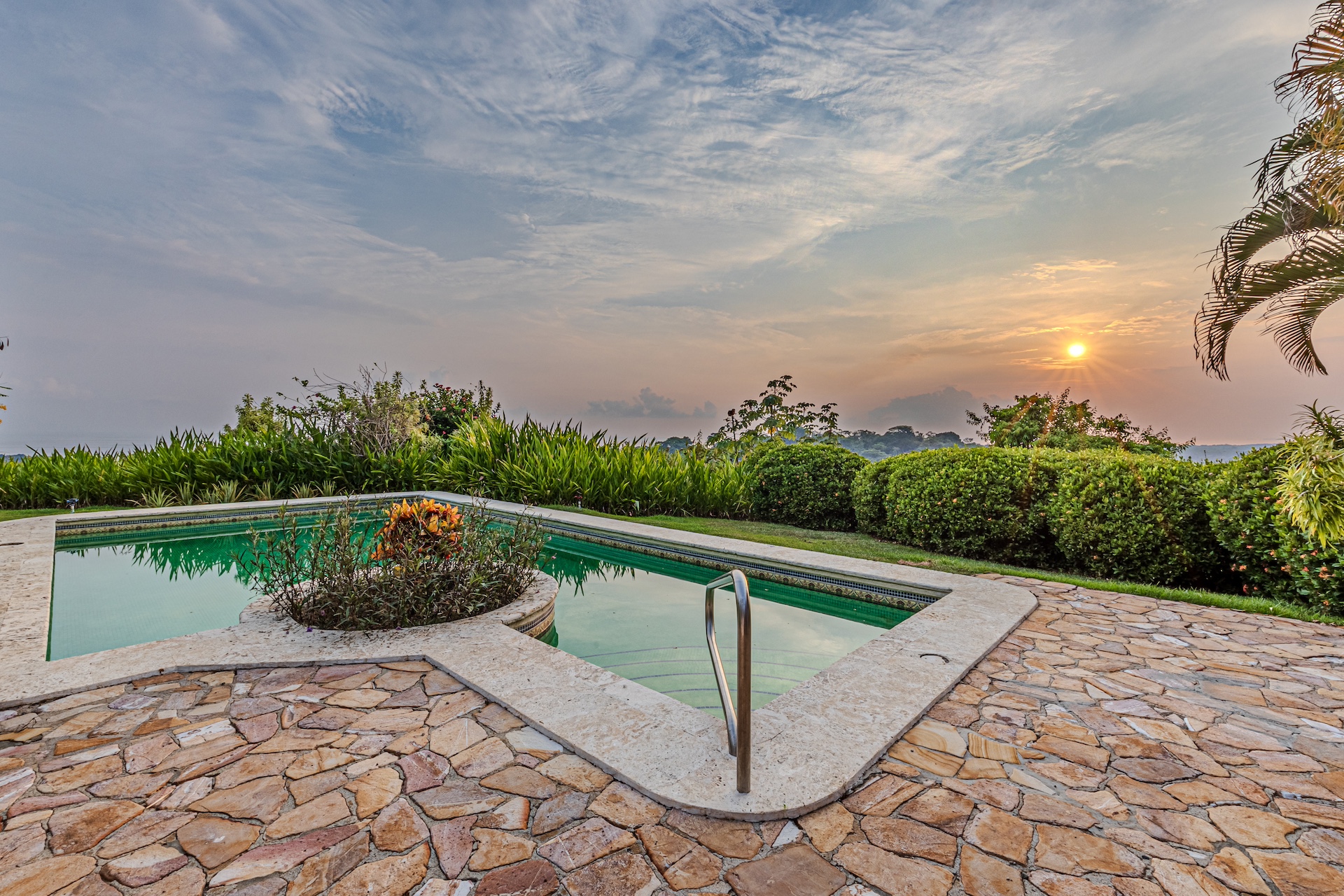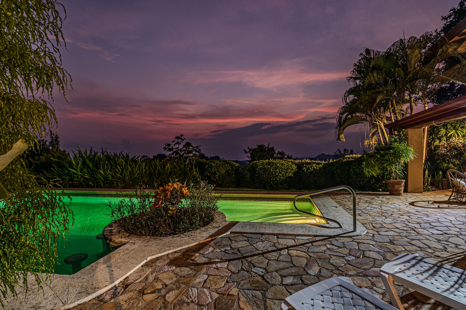 Venture outside to the awe-inspiring pool , where textured coralina tiles offer a stunning contrast to the sparkling water. The pool deck and rancho showcase the expansive Pacific Ocean's kaleidoscopic sunsets that transform the sky into an artist's canvas every evening. The emotional resonance of witnessing such a spectacle of nature from your private vantage point is immeasurable, serving as a daily reminder of the majestic beauty of life in the southern zone of Costa Rica.
