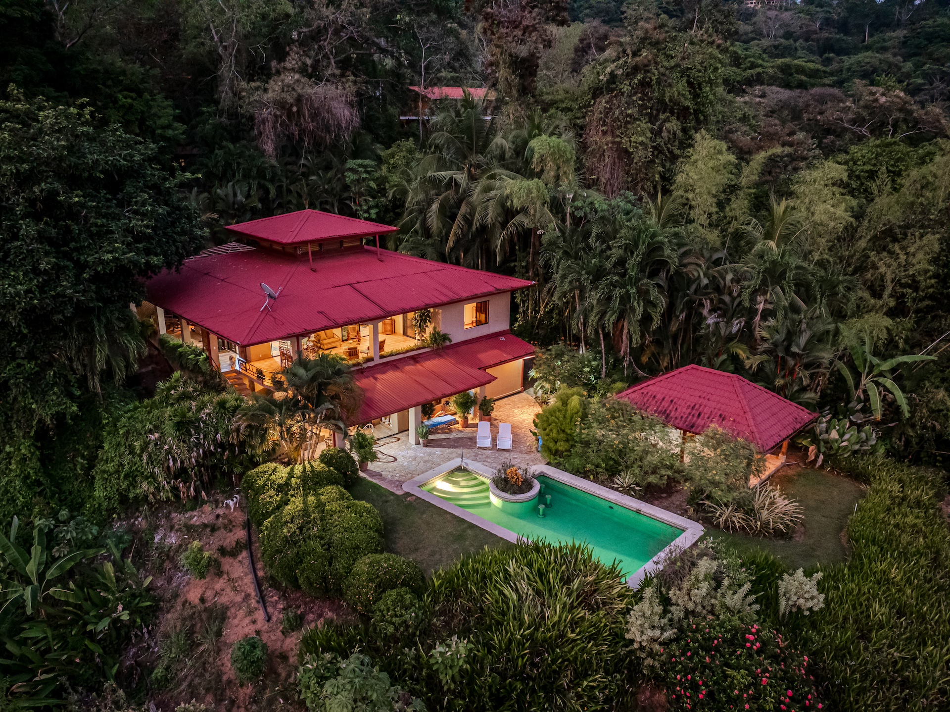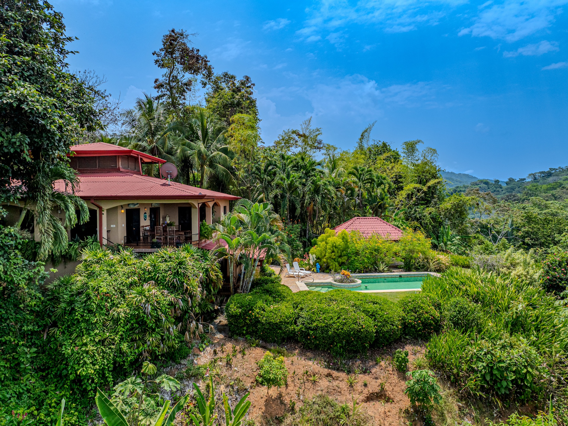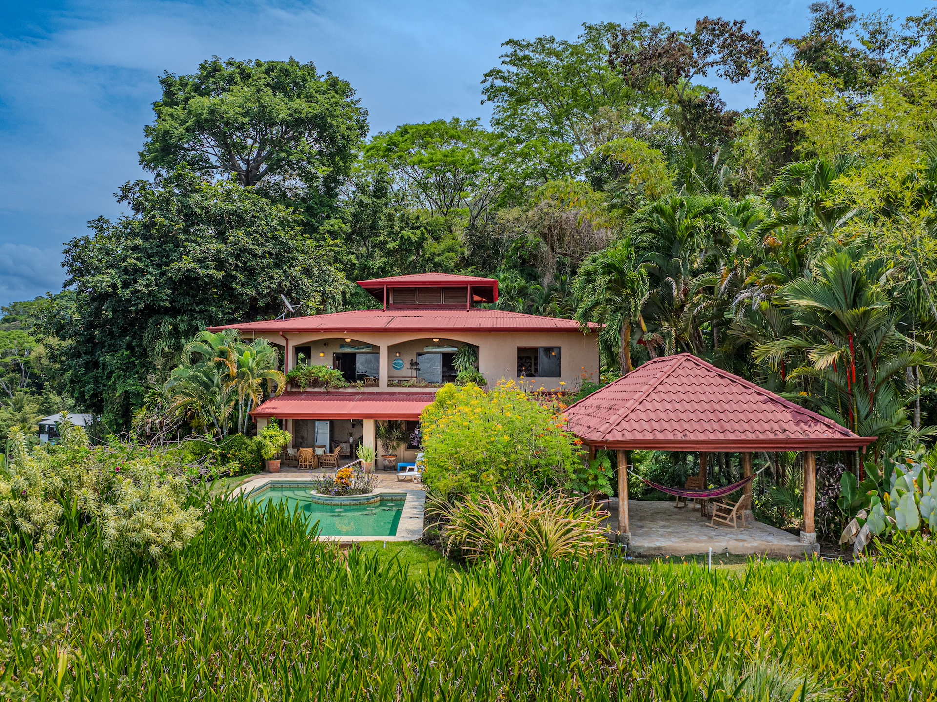 The property sprawls across a lush 6.3 acres, providing privacy and un interrupted views- Here, amid the verdant greenery, a delightful array of fruit trees burst with the vibrant flavors of Costa Rica—pipas, pineapple, mandarina acido, and papaya to name a few. The charming rancho invites one to savor these flavors while embraced by the tranquil sounds of the surrounding jungle, a celebrated white-faced monkey corridor that encapsulates Costa Rica's abundant wildlife.