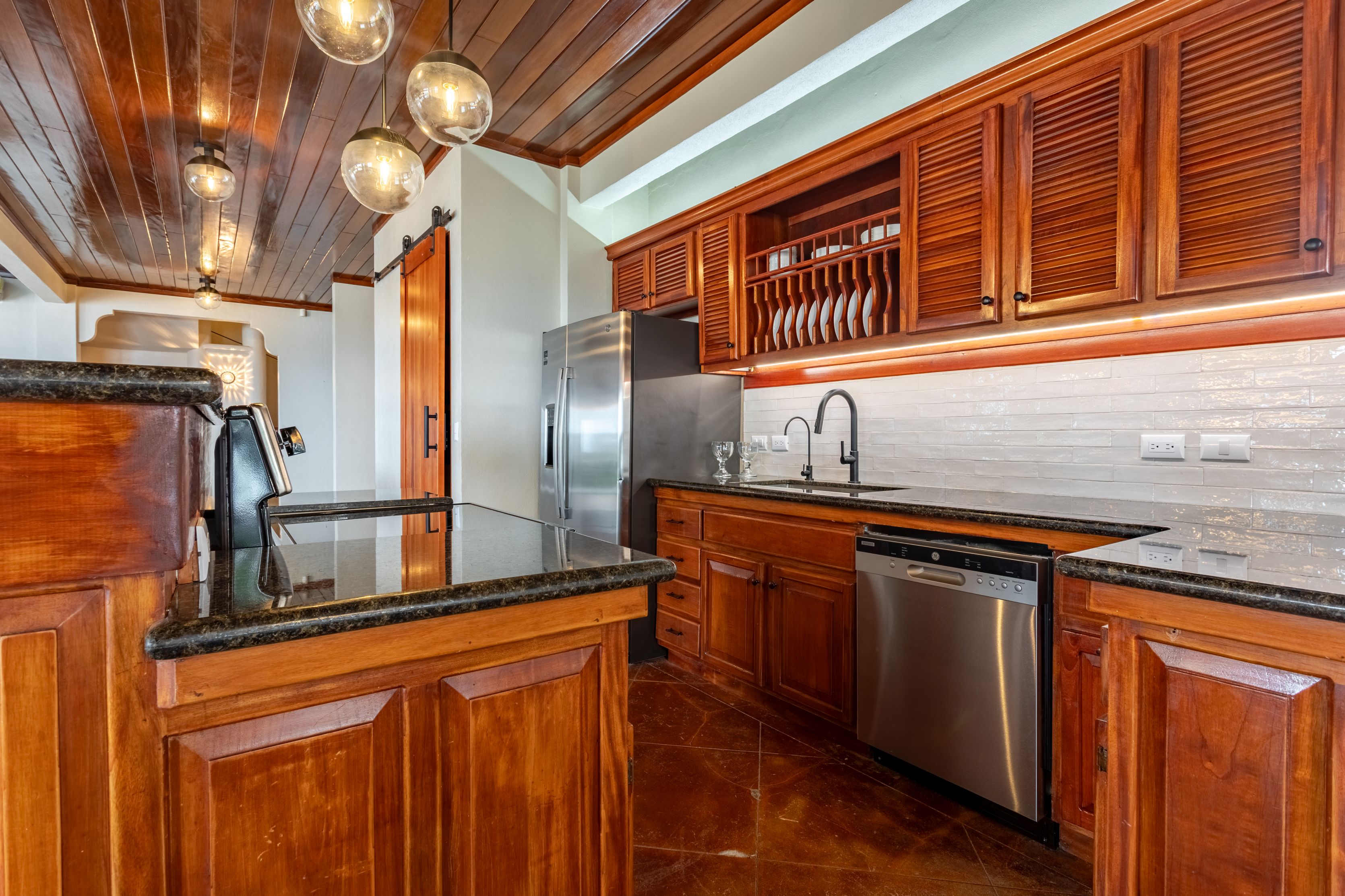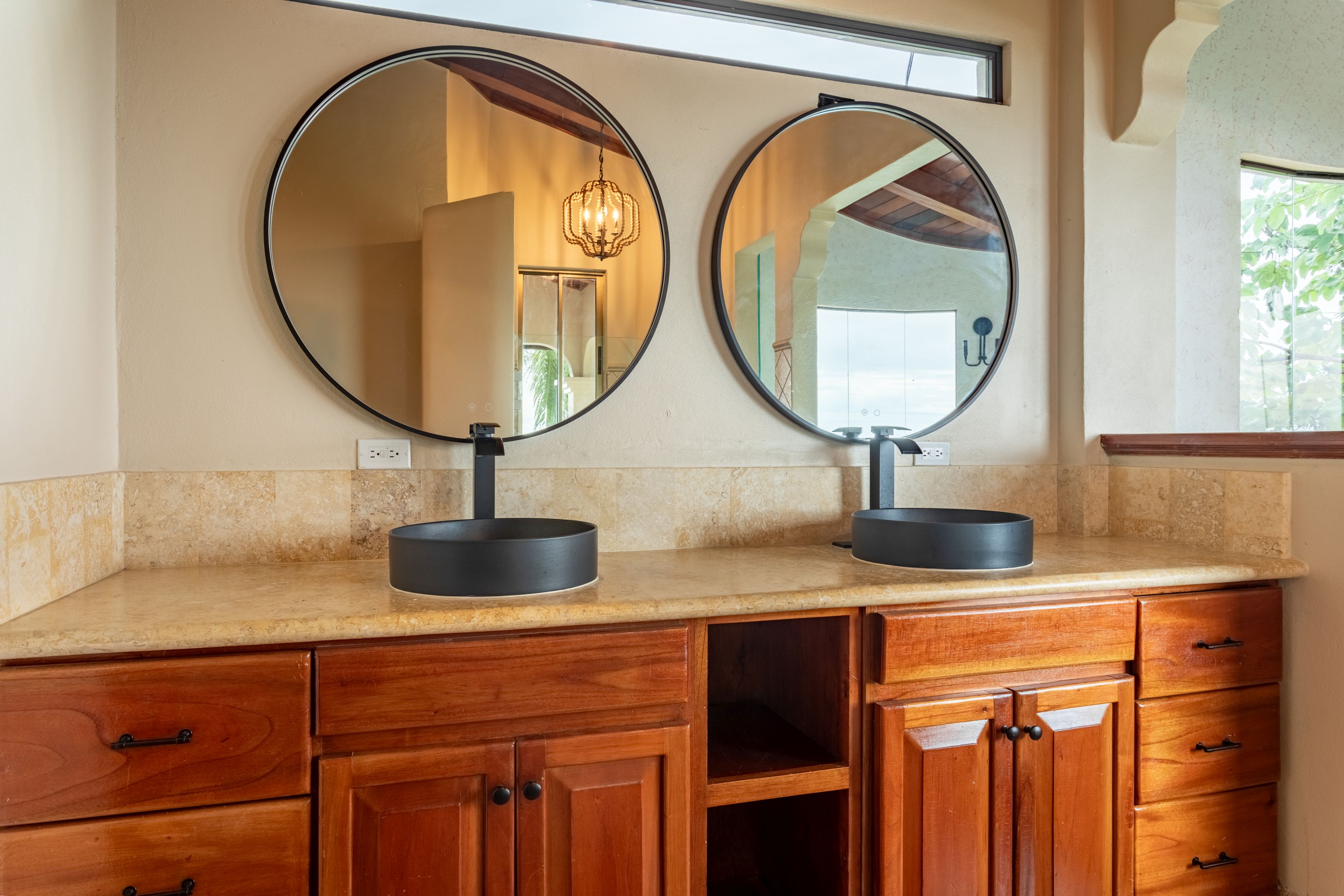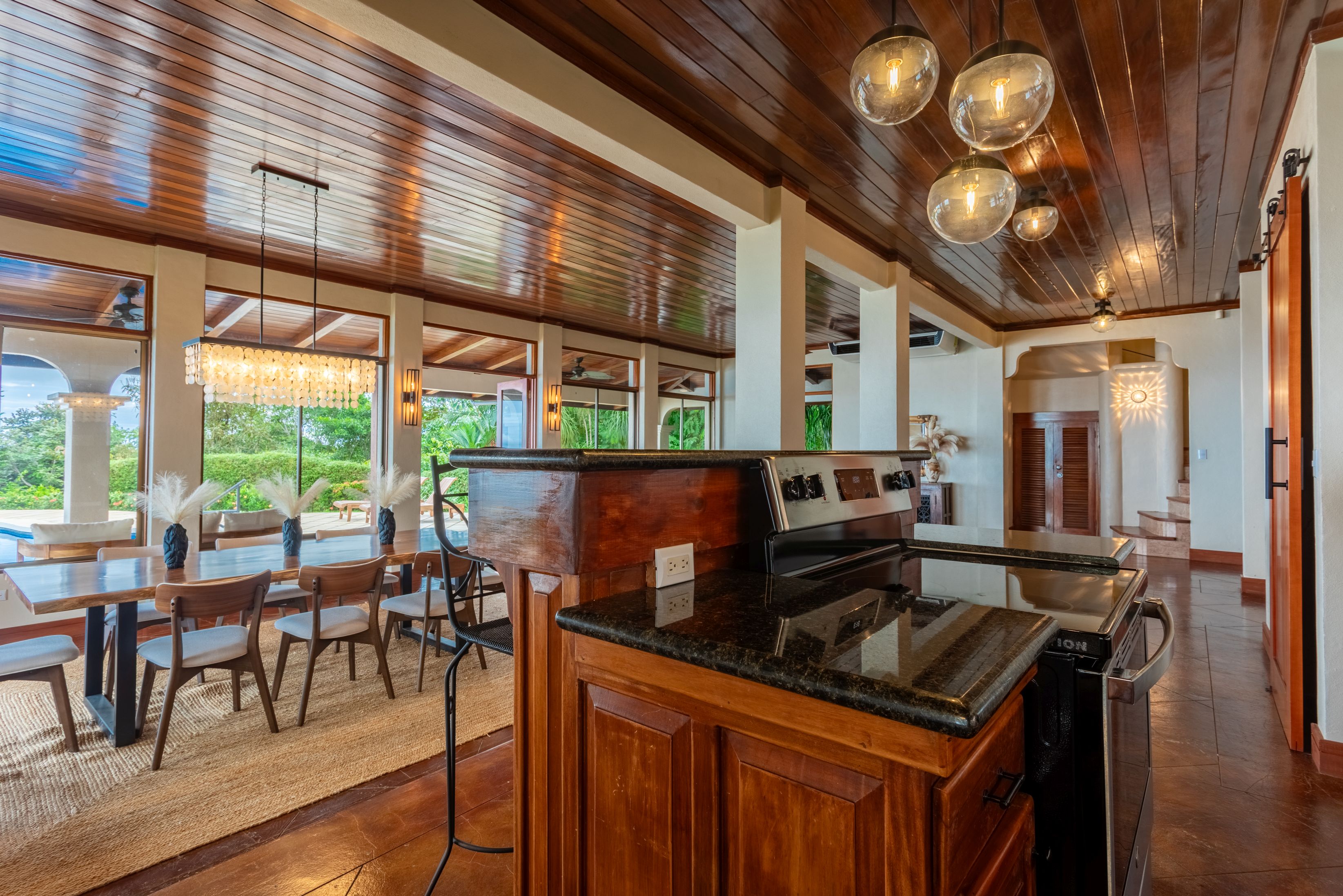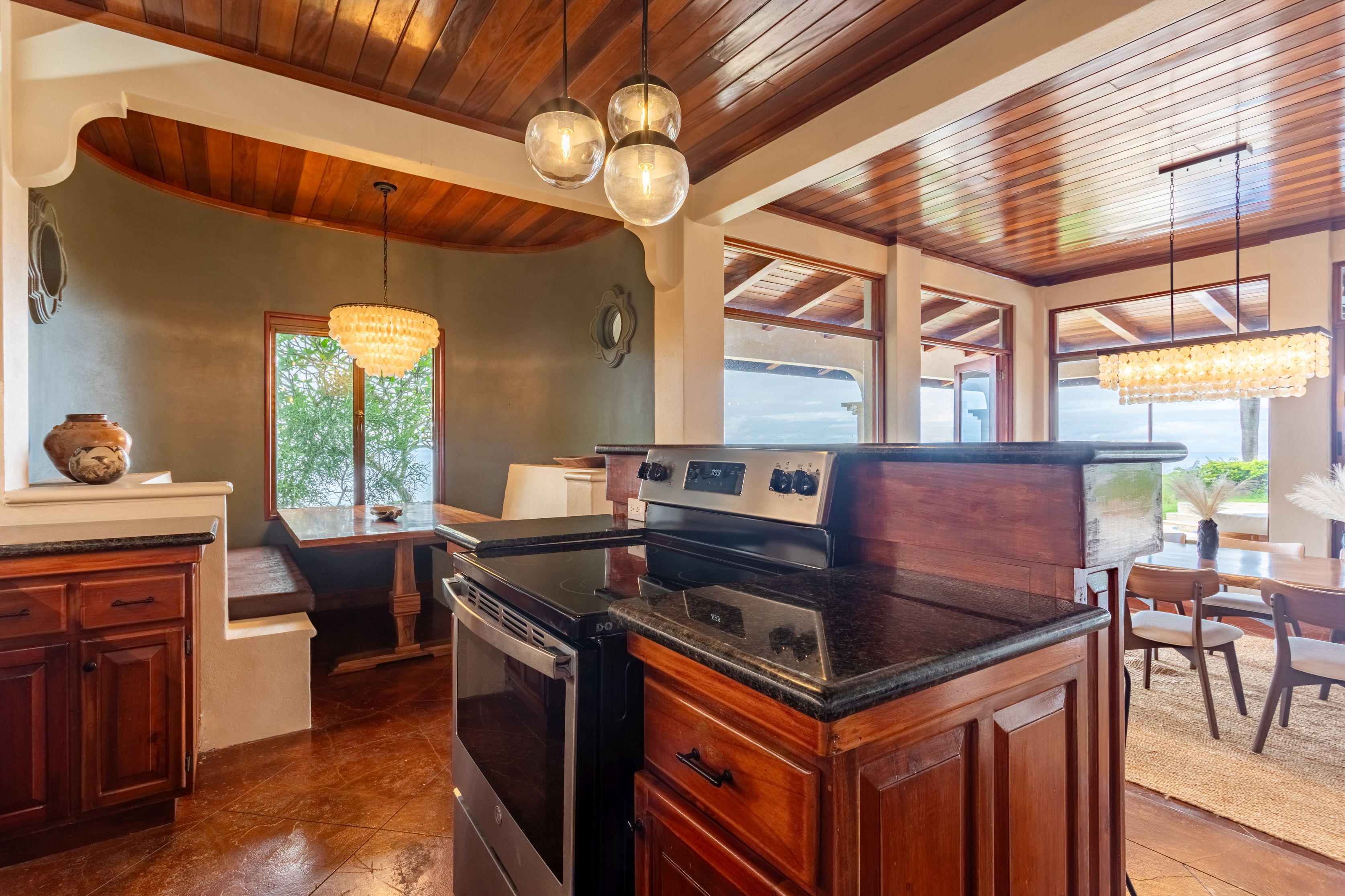 The main house exemplifies sophisticated living with its three generously sized bedrooms and four elegantly appointed bathrooms. Each bedroom is a retreat unto itself, complete with air conditioning and framed by sweeping ocean views. The airy dining area and state-of-the-art kitchen, highlighted by a chic cooking island, are designed for both everyday living and festive gatherings. The contemporary bathrooms are designed with refined fixtures, including a sumptuous double sink arrangement.