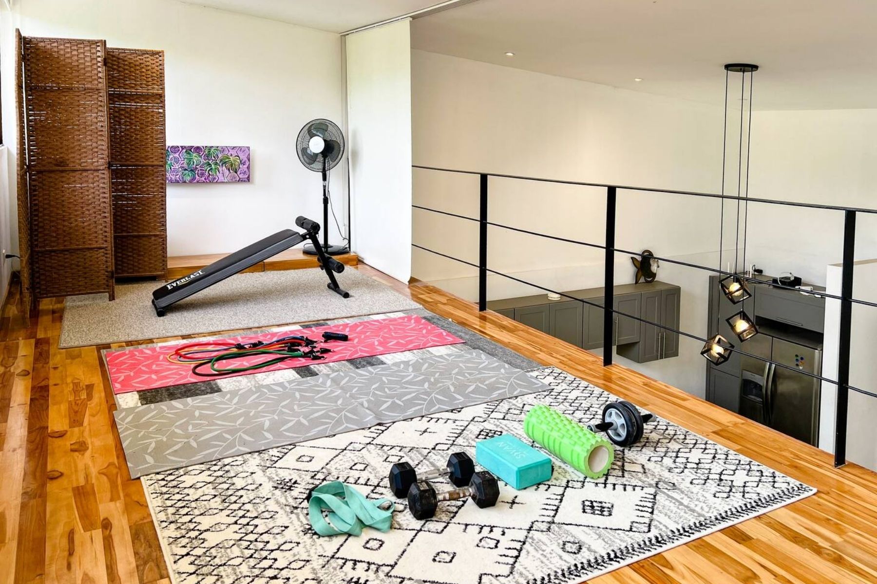 Upper-level loft for yoga, exercise, or additional sleeping